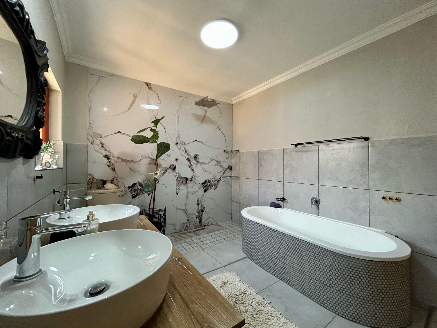 The home boasts four generously sized bedrooms. The master suite is a true retreat with a private balcony, walk-in closet, and a luxurious en-suite bathroom equipped with a large soaking tub, double vanities, and a frameless glass shower. Two of the additional bedrooms share a Jack-and-Jill bathroom, while the fourth bedroom has its own private en-suite—ideal for guests or older children. A guest powder room (half bathroom) is conveniently located on the ground floor.