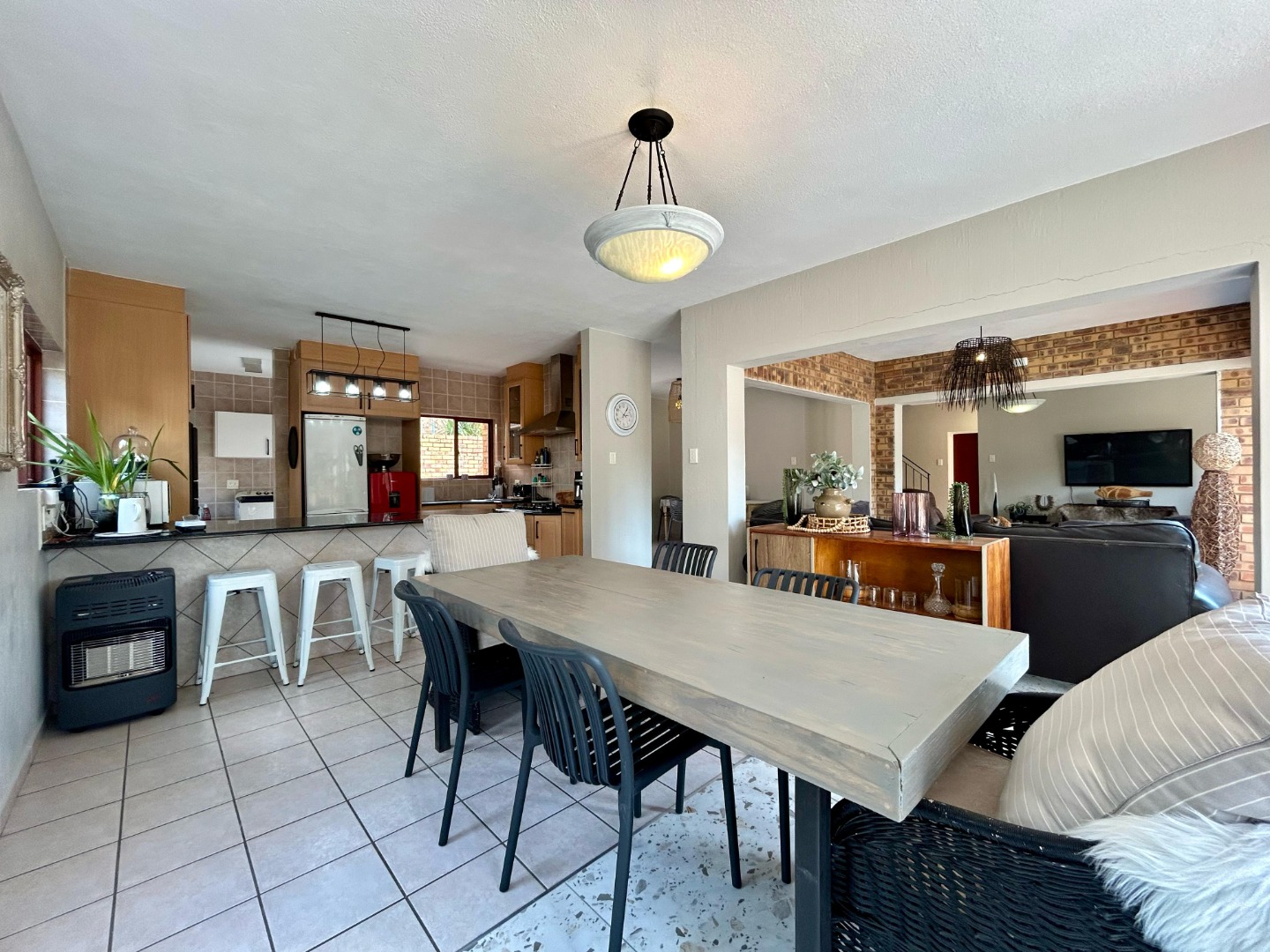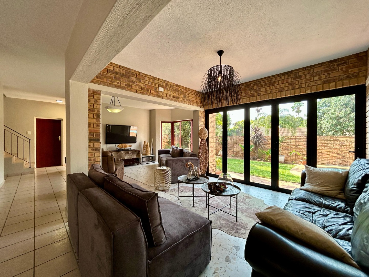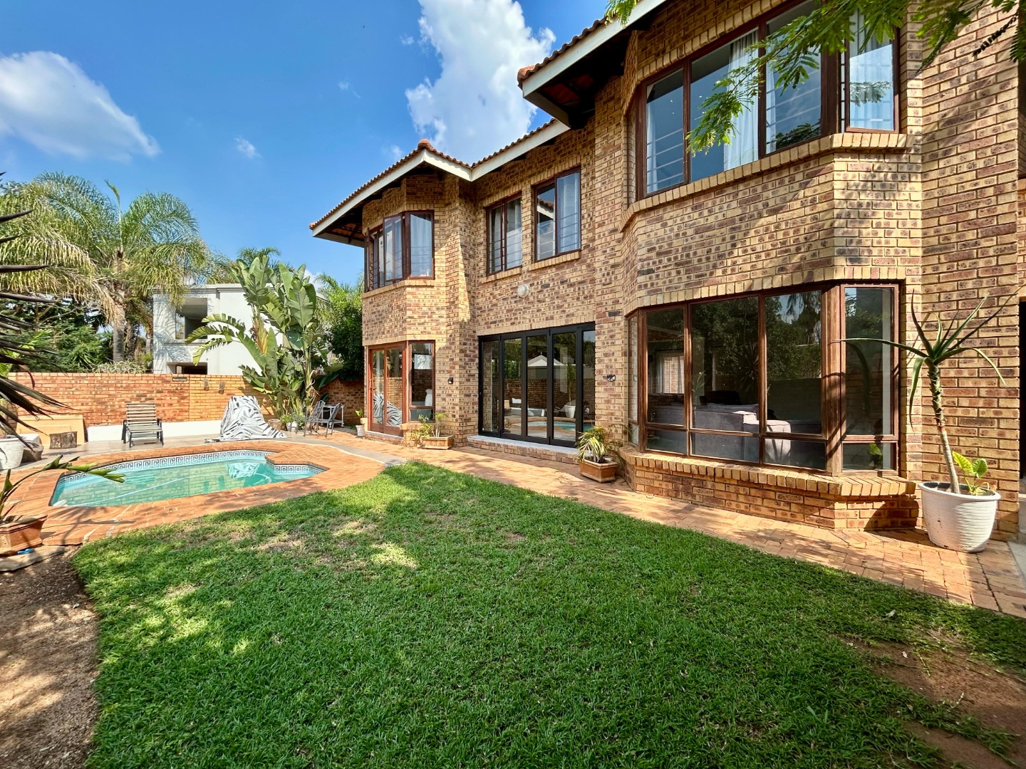 The outdoor area is a highlight of the home, designed for both entertaining and relaxation. The covered patio with a built-in braai overlooks the sparkling swimming pool and well-manicured garden—an idyllic setting for weekend gatherings or quiet family time. The garden offers ample space for children to play or for green-fingered homeowners to enjoy gardening.