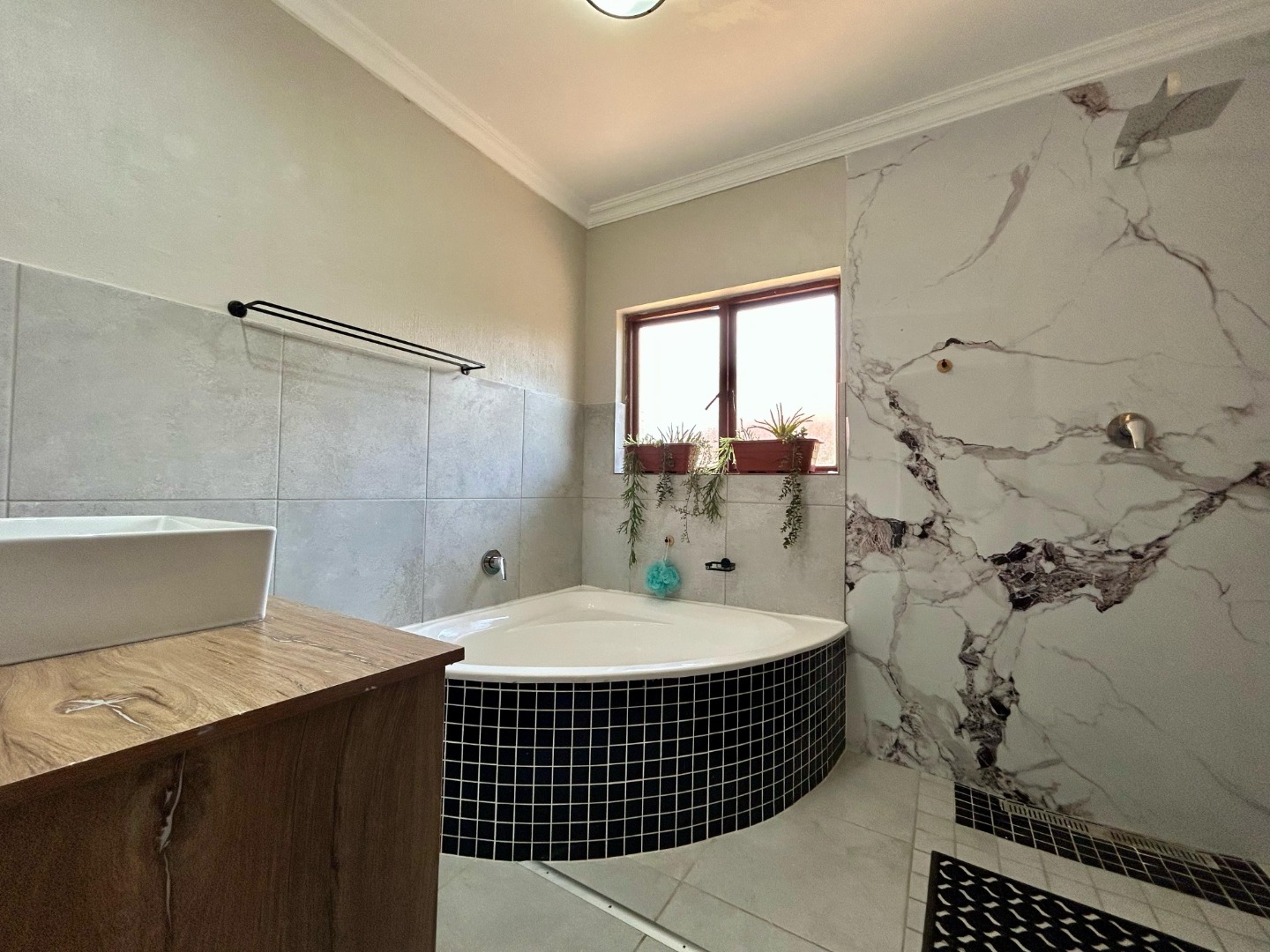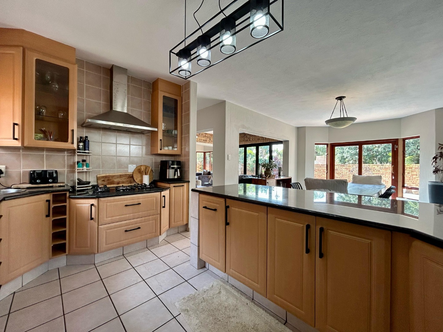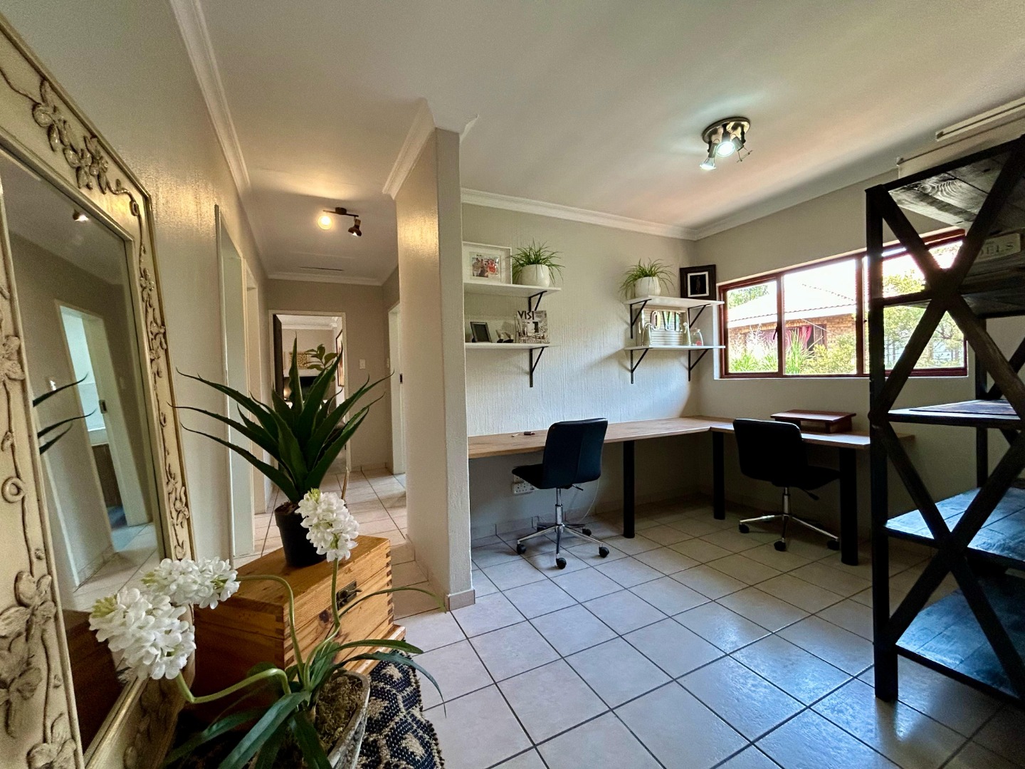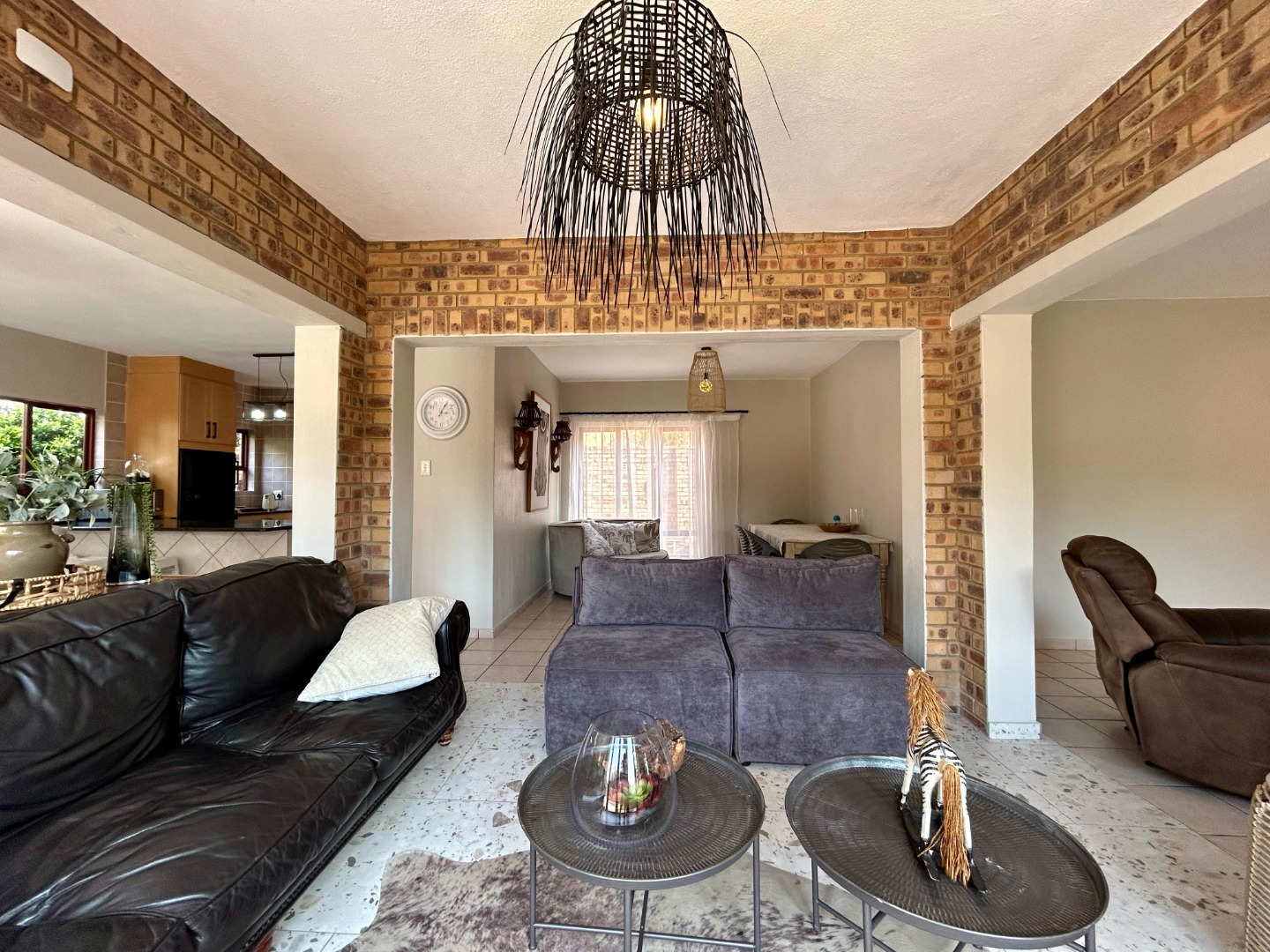 The outdoor area is a highlight of the home, designed for both entertaining and relaxation. The covered patio with a built-in braai overlooks the sparkling swimming pool and well-manicured garden—an idyllic setting for weekend gatherings or quiet family time. The garden offers ample space for children to play or for green-fingered homeowners to enjoy gardening.