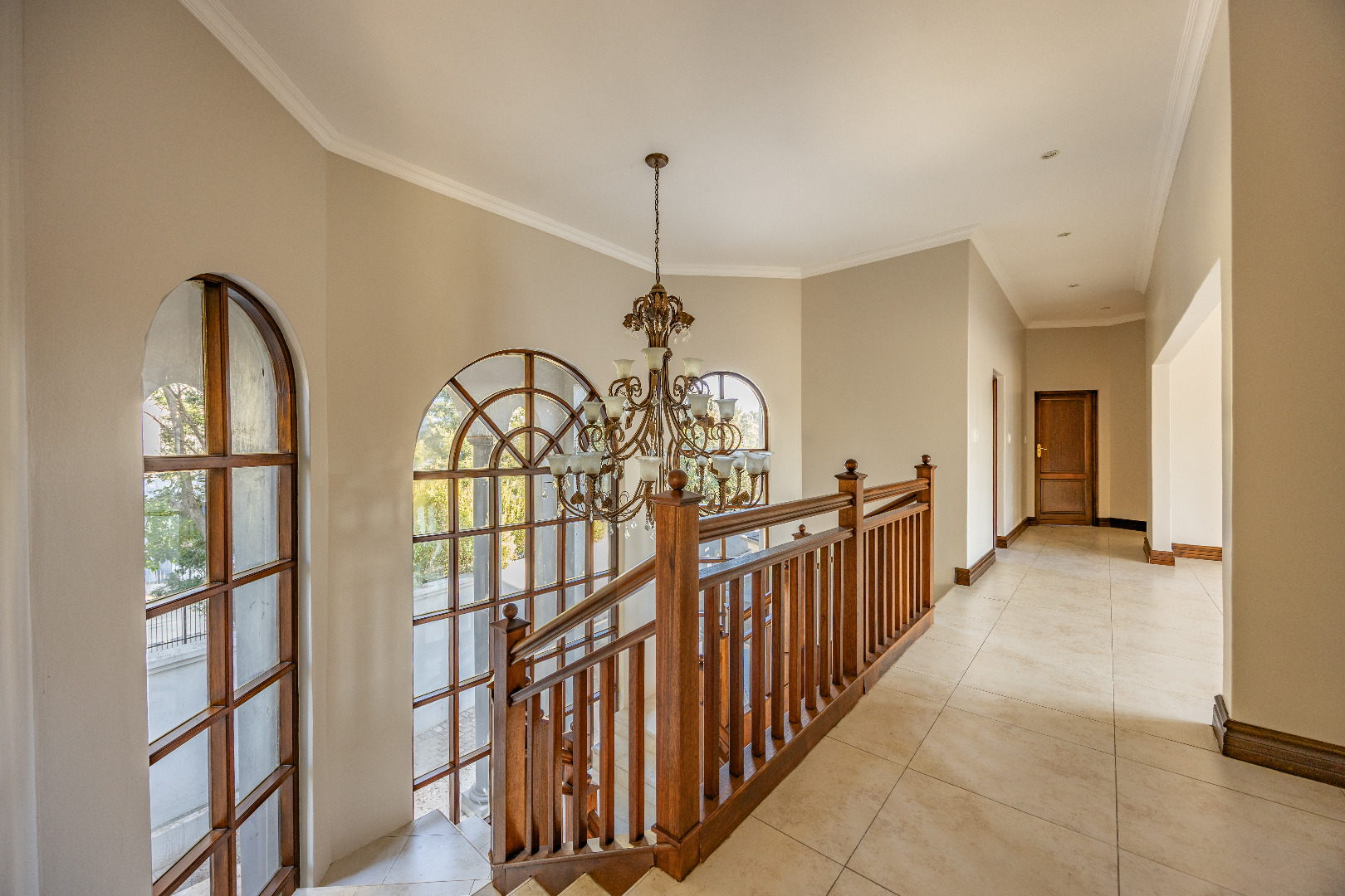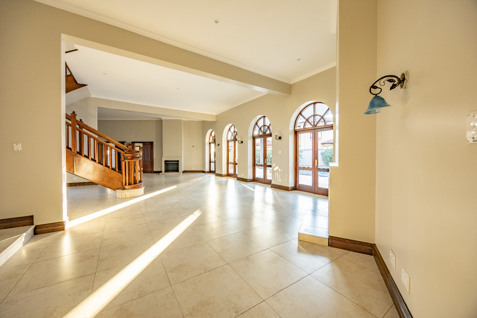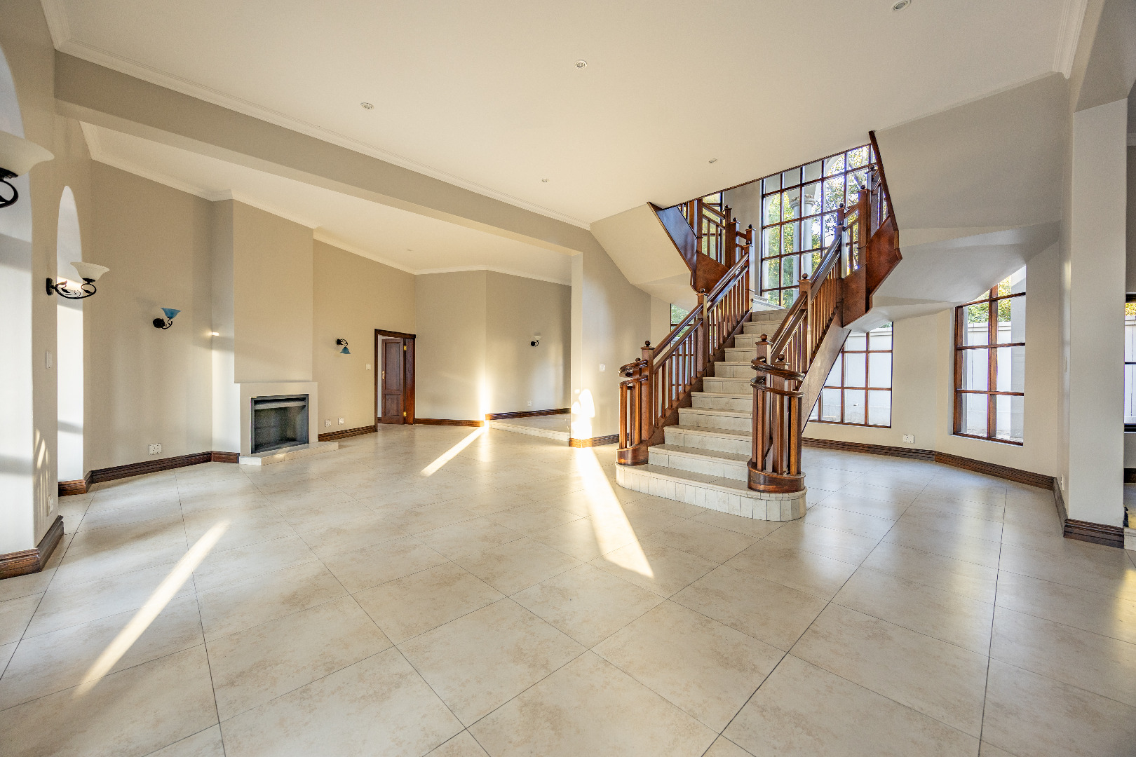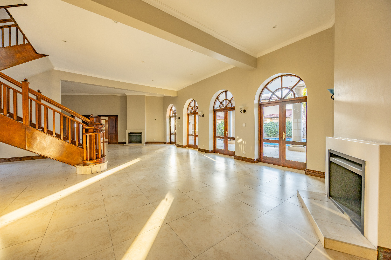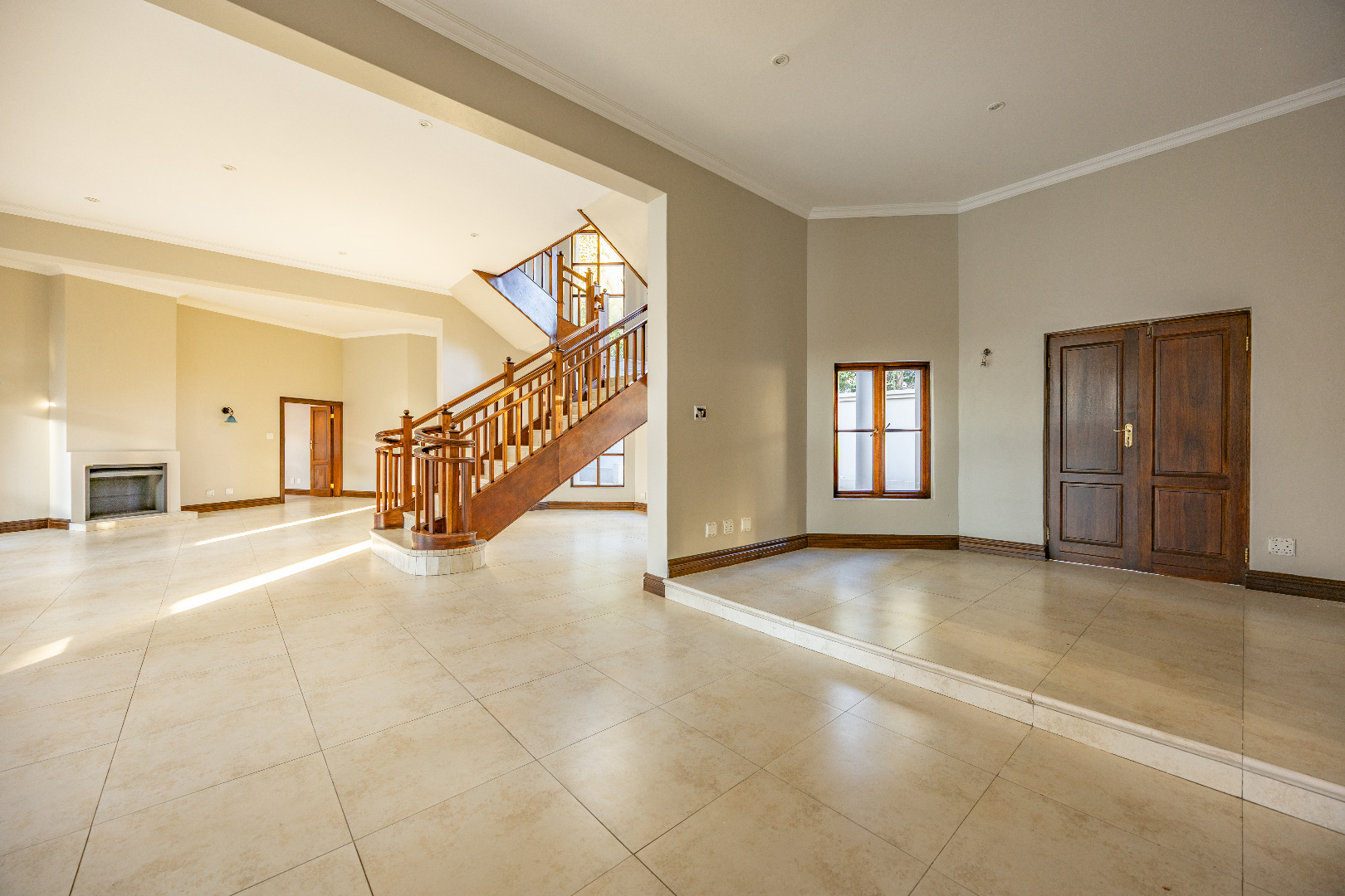 This expansive family home in the prestigious Silver Lakes Golf Estate offers luxurious living with ample space and top-tier finishes. The welcoming entrance hall flows into a versatile room that can serve as a first bedroom or study, followed by a generous dining area ideal for family meals and gatherings. The ground floor also features a stylish guest bathroom with a shower, a wine cellar, and a spacious living area with two fireplaces—creating a warm and inviting atmosphere. A large, well-equipped kitchen with a separate scullery caters to every culinary need, while a downstairs bedroom adds extra convenience.