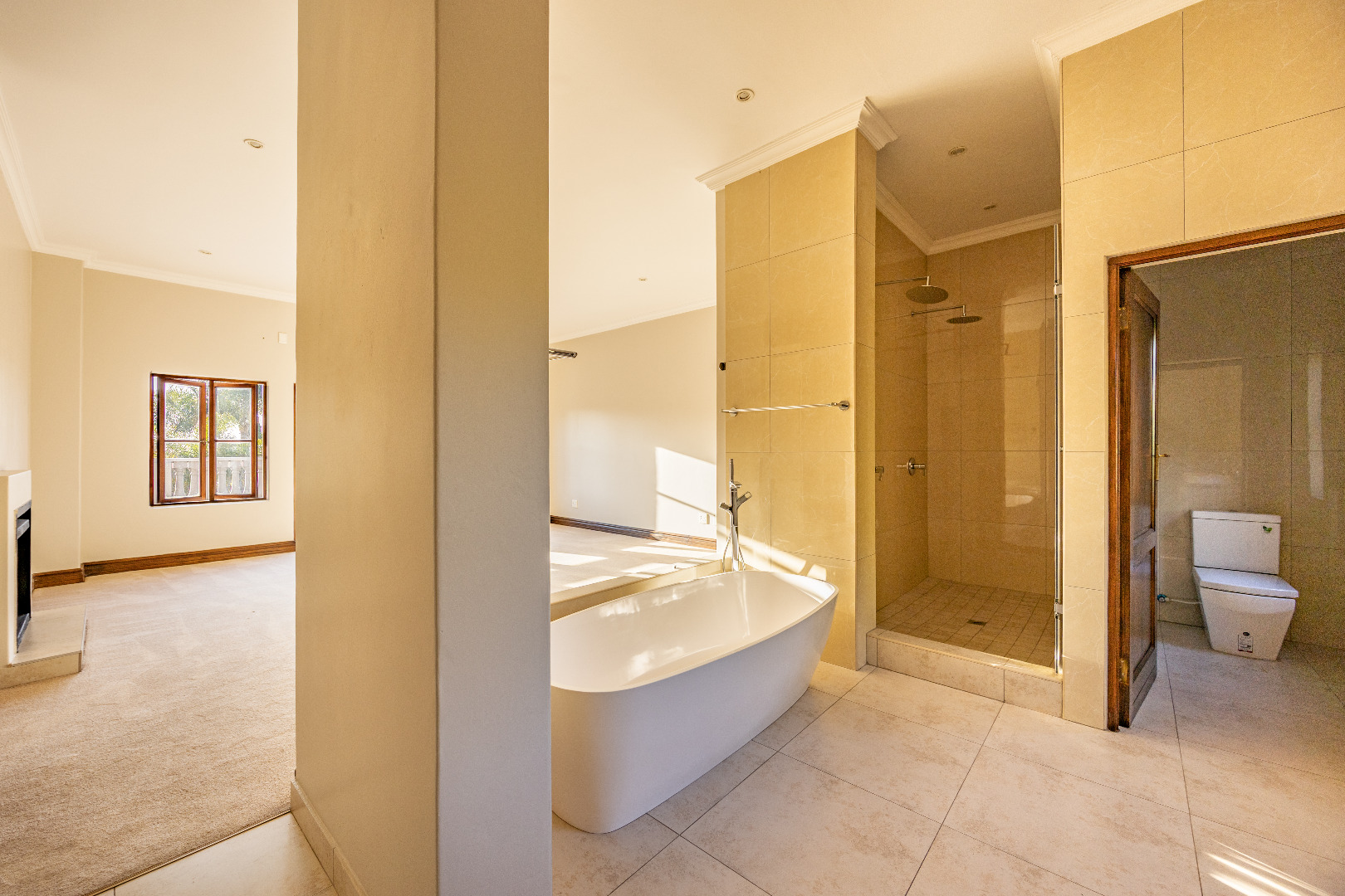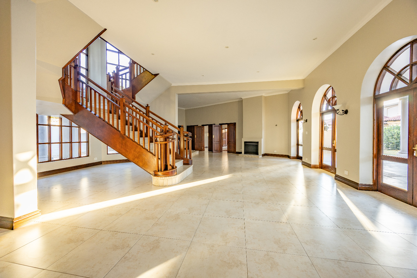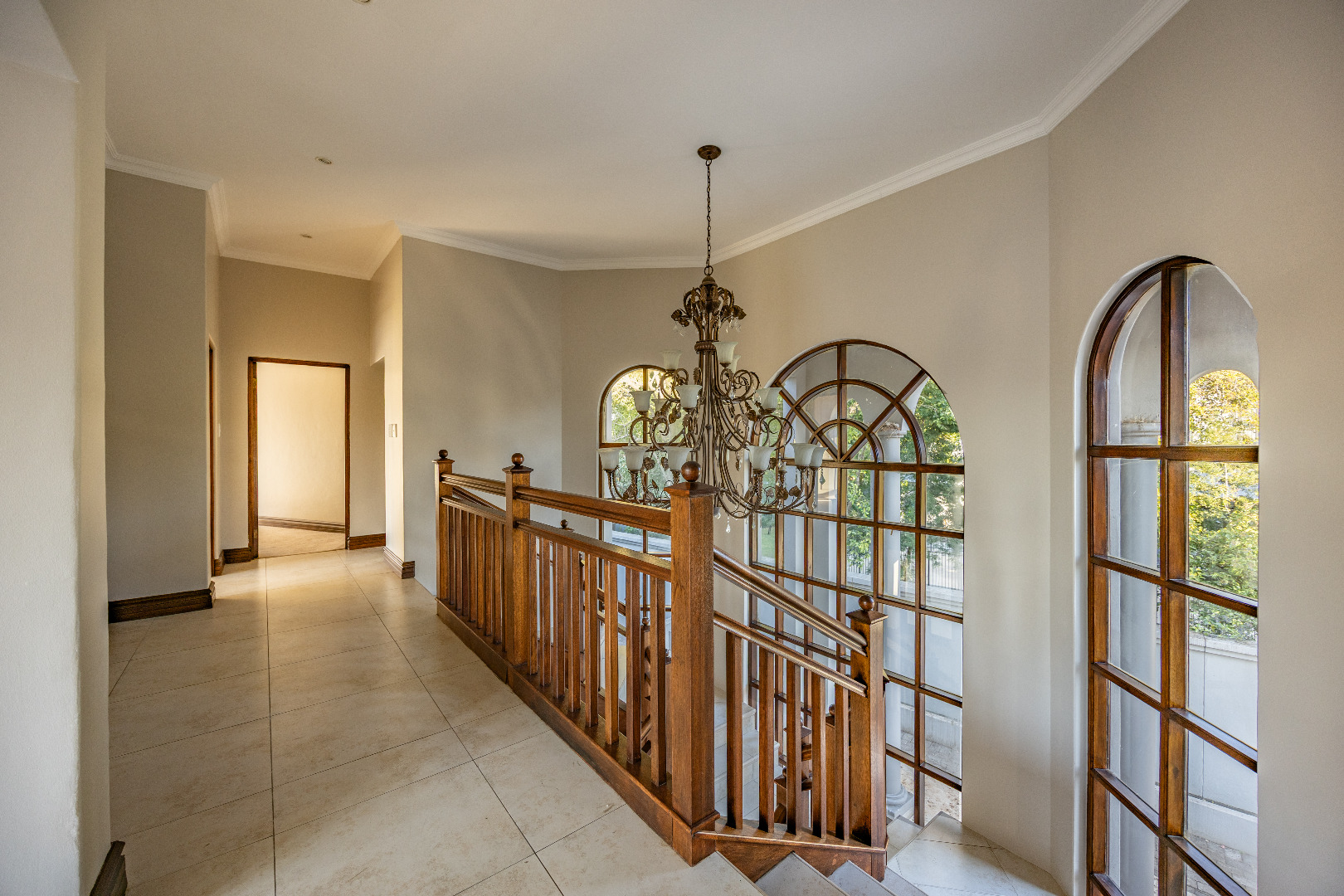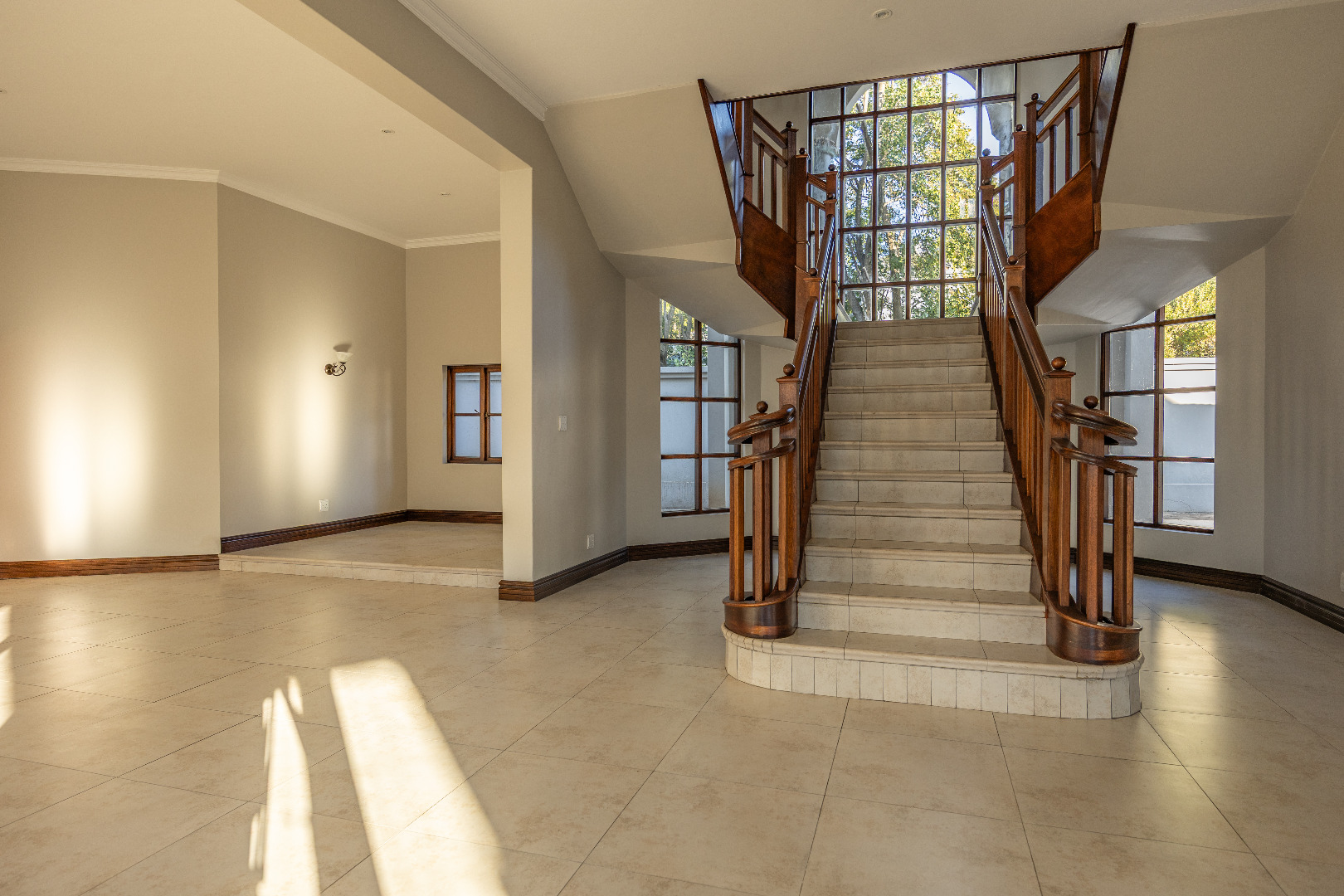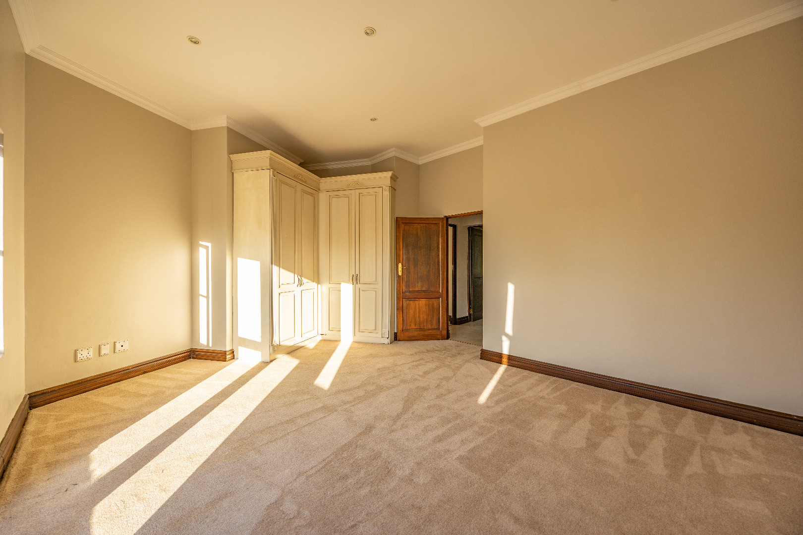 This expansive family home in the prestigious Silver Lakes Golf Estate offers luxurious living with ample space and top-tier finishes. The welcoming entrance hall flows into a versatile room that can serve as a first bedroom or study, followed by a generous dining area ideal for family meals and gatherings. The ground floor also features a stylish guest bathroom with a shower, a wine cellar, and a spacious living area with two fireplaces—creating a warm and inviting atmosphere. A large, well-equipped kitchen with a separate scullery caters to every culinary need, while a downstairs bedroom adds extra convenience.