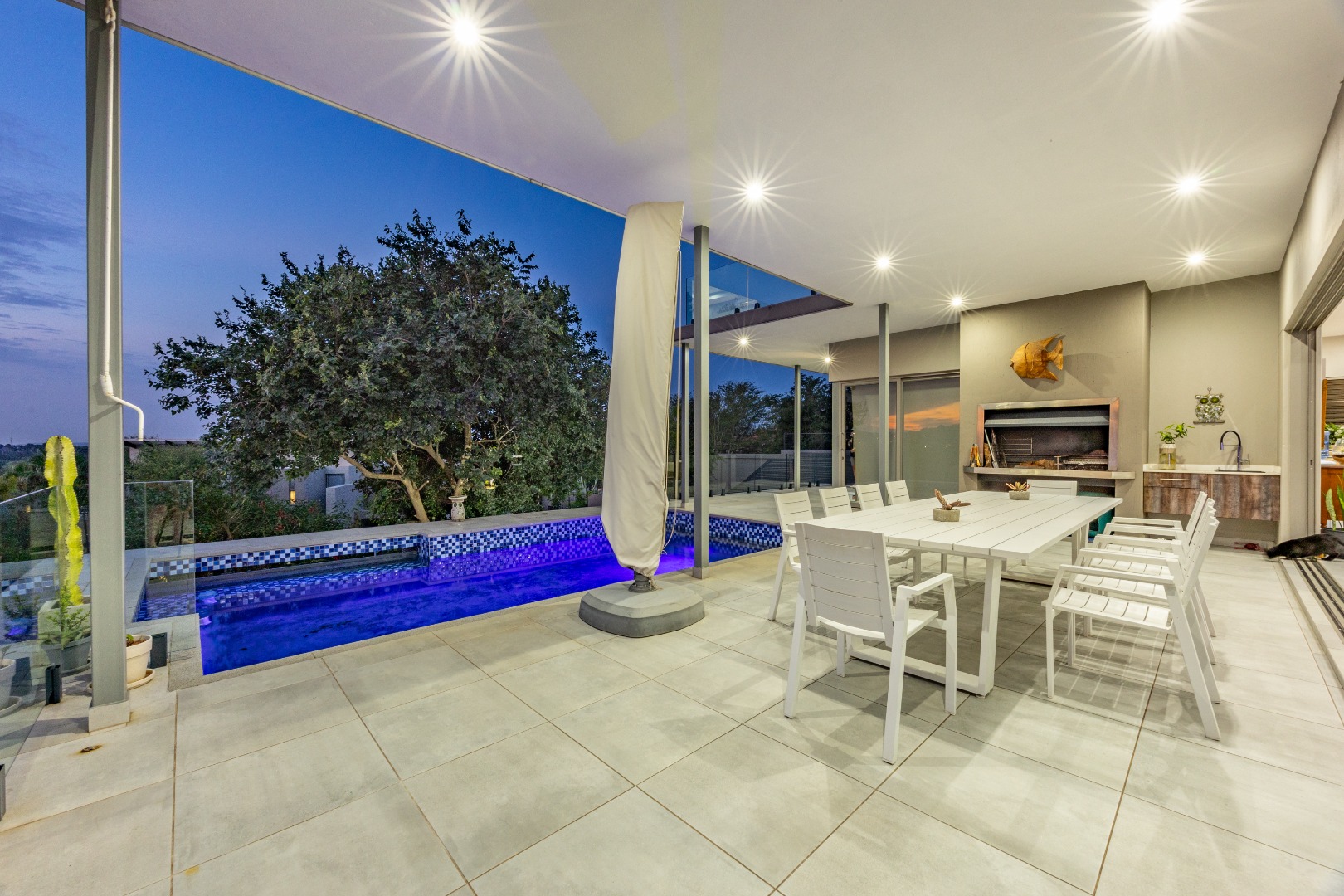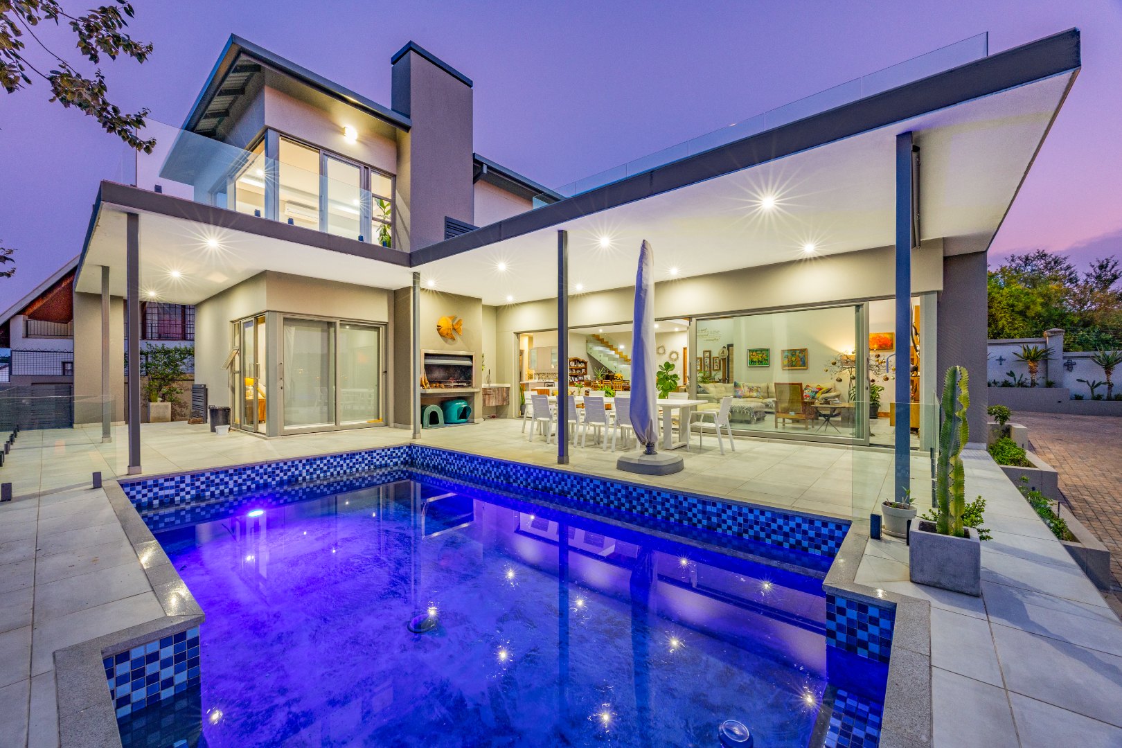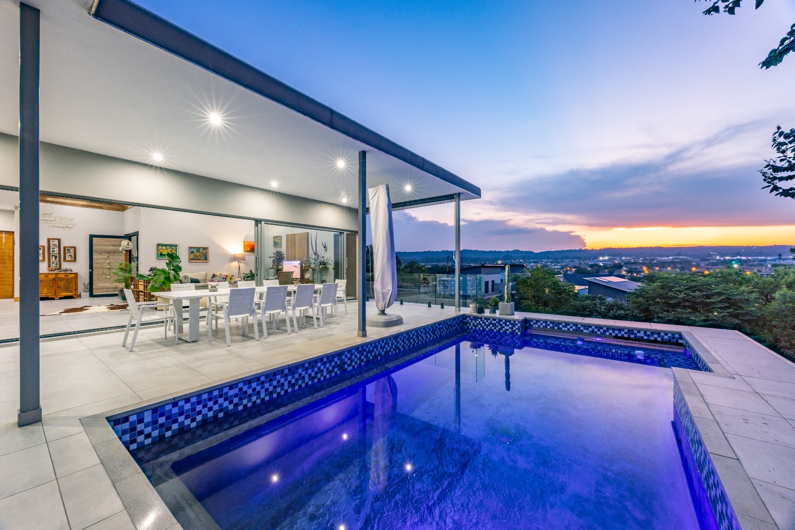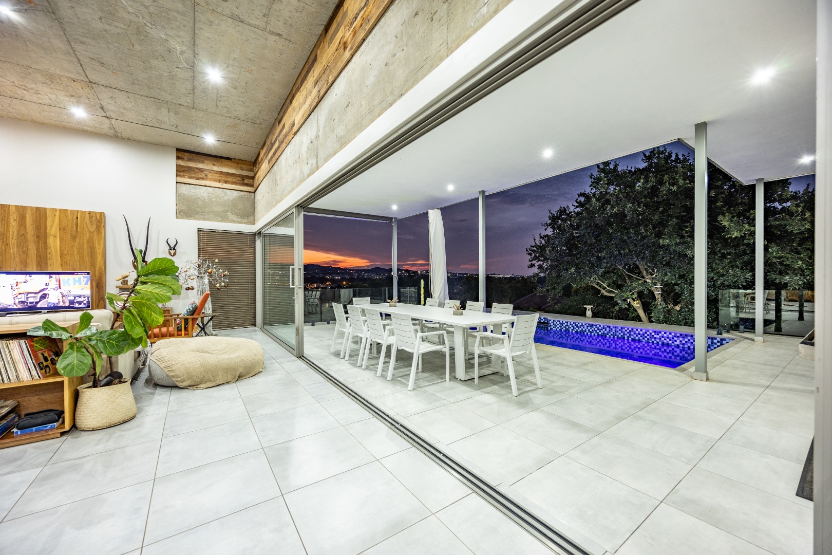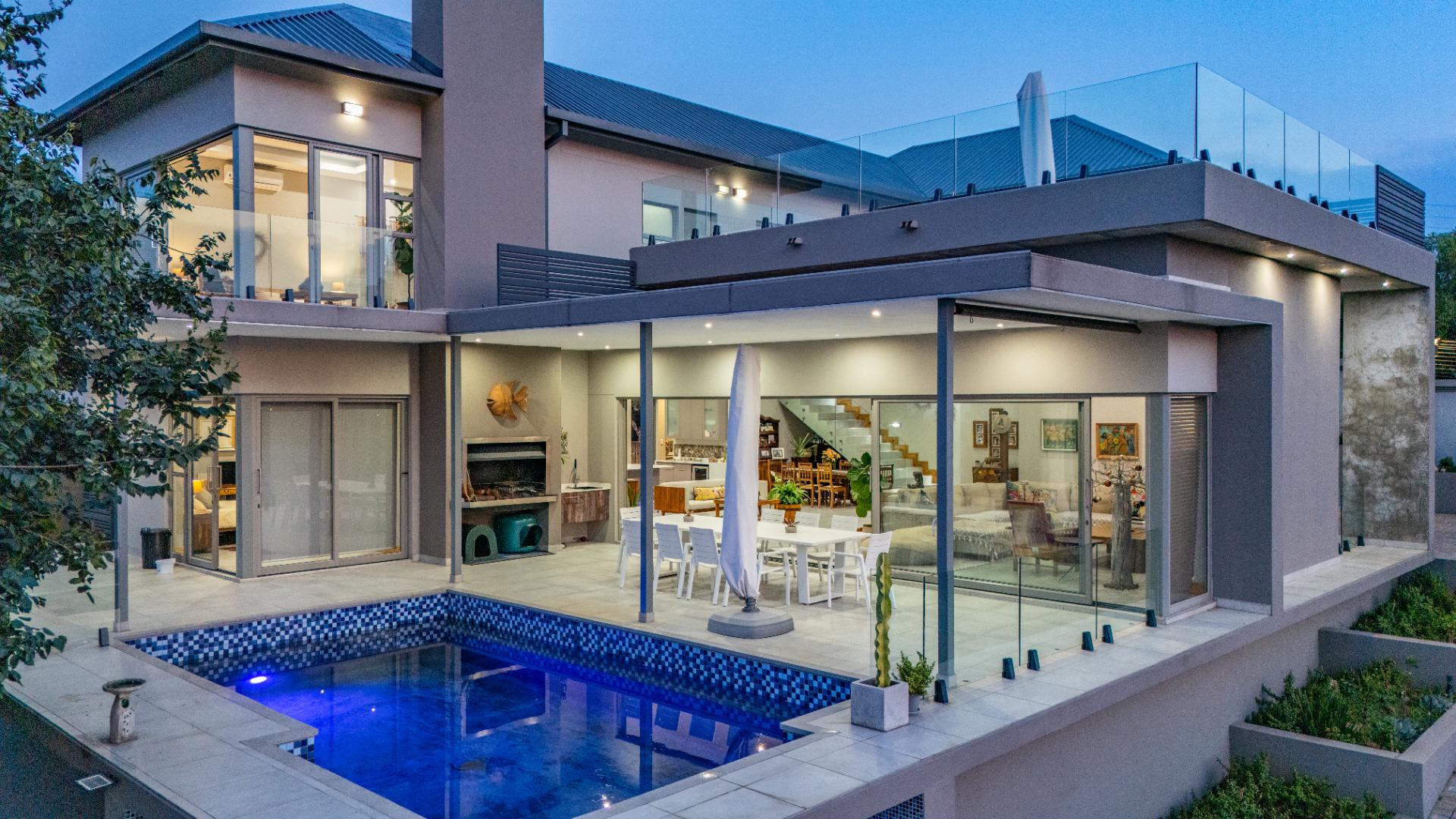 High ceilings, exclusive modern finishes, and disappearing stacking doors flood the home with natural light while drawing your eye toward the sublime rim-flow pool, covered entertainers’ patio, and landscaped surrounds. Whether hosting vibrant gatherings or enjoying quiet sundowners, this home adapts beautifully to every season and occasion.