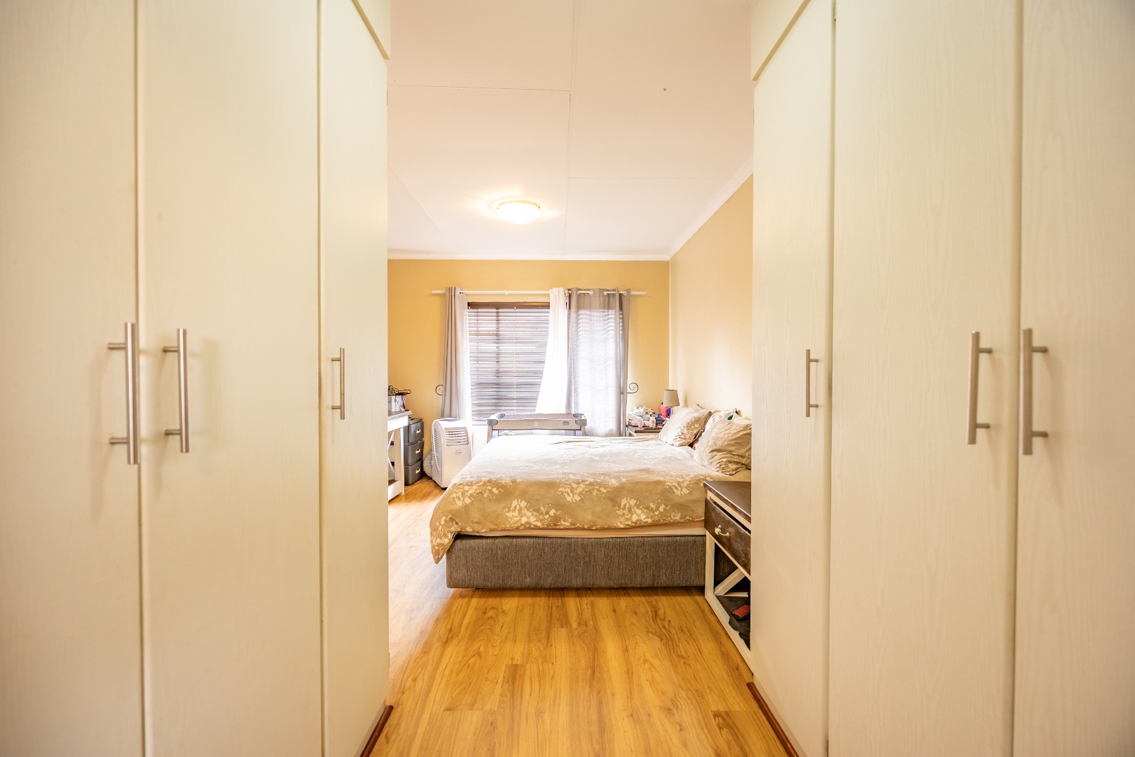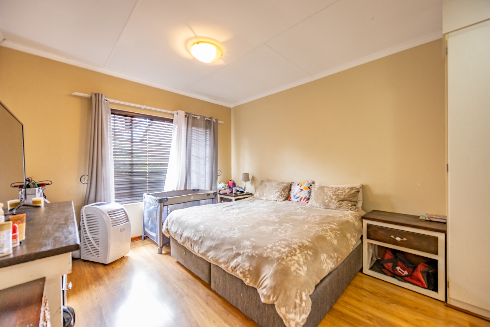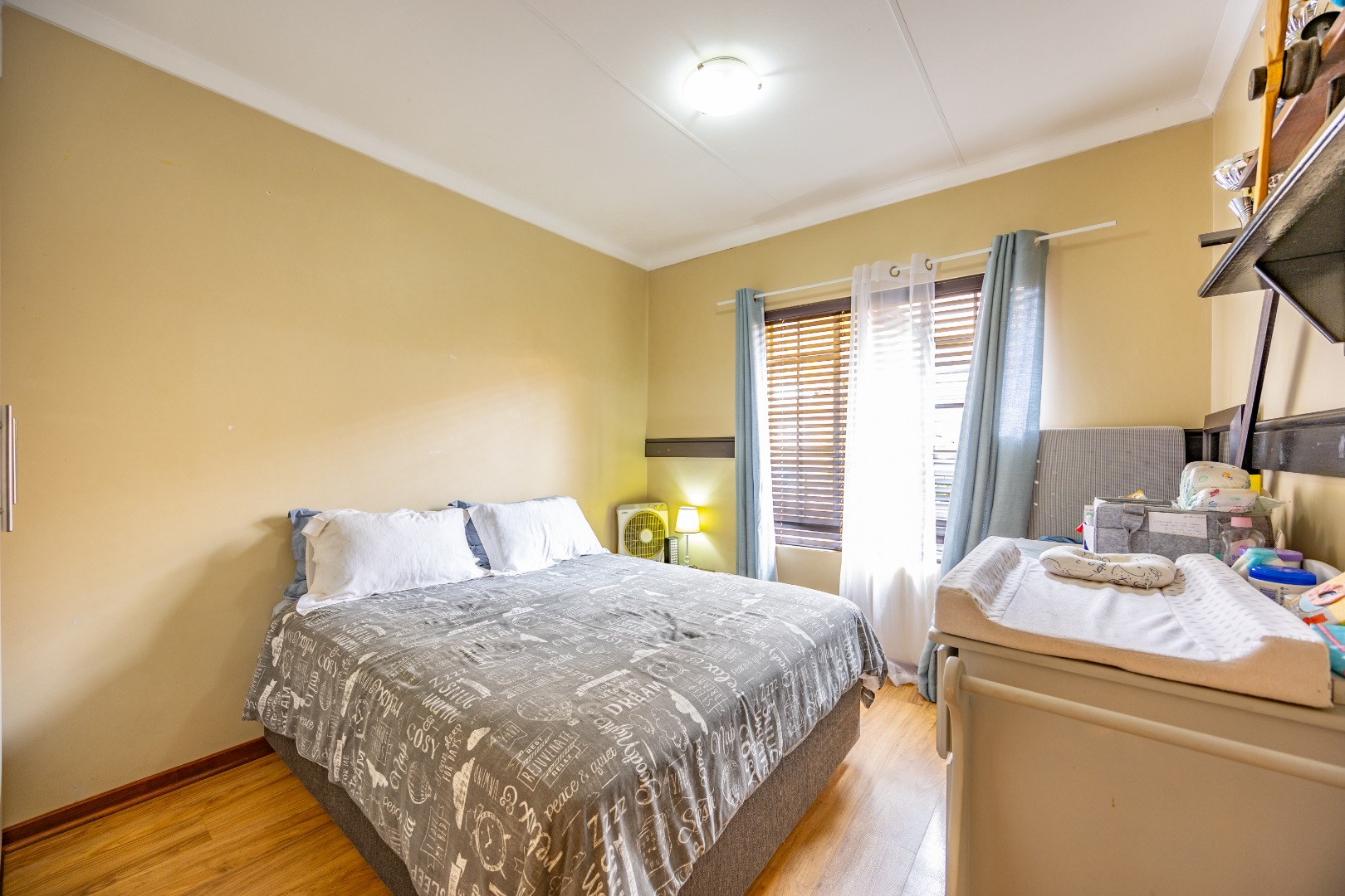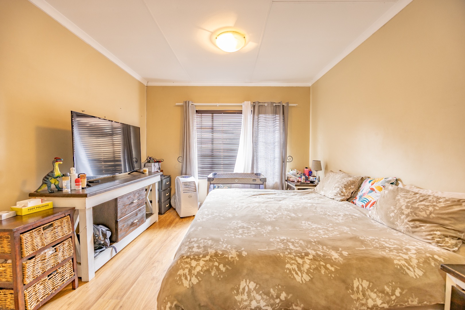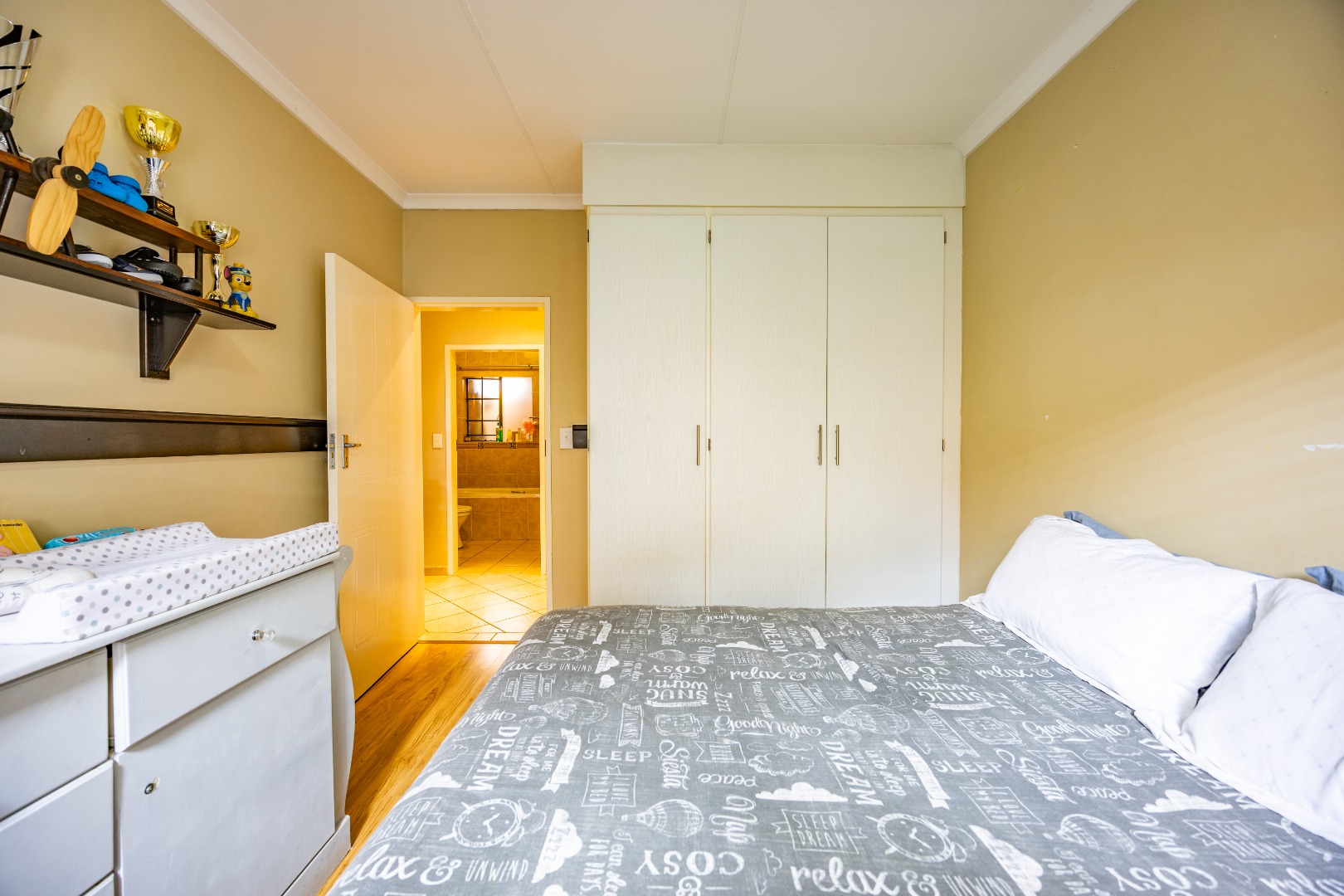 Additional features include linen cupboards, blinds in both bedrooms, a built-in braai on the patio, garden irrigation, and a double automated garage for secure parking.