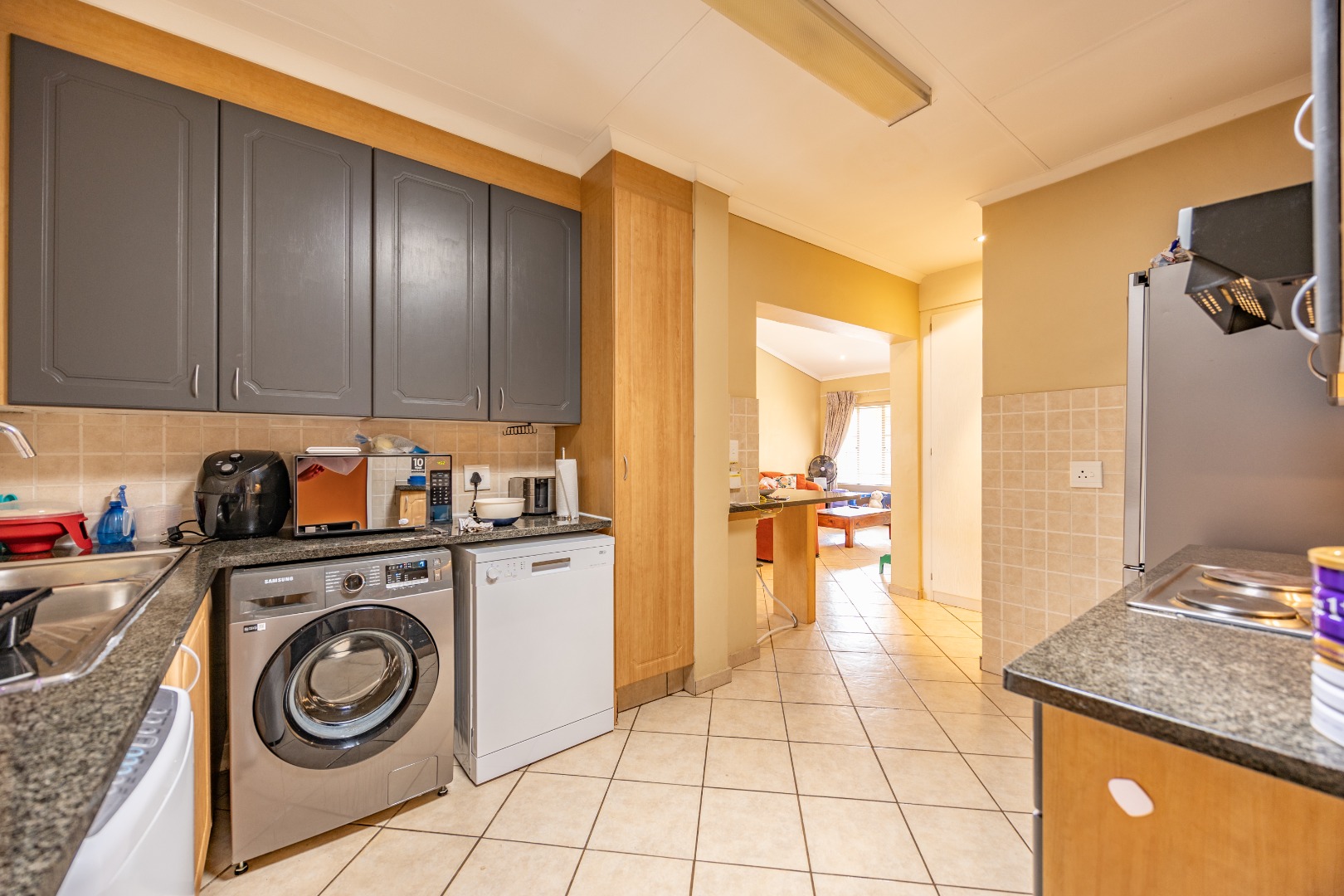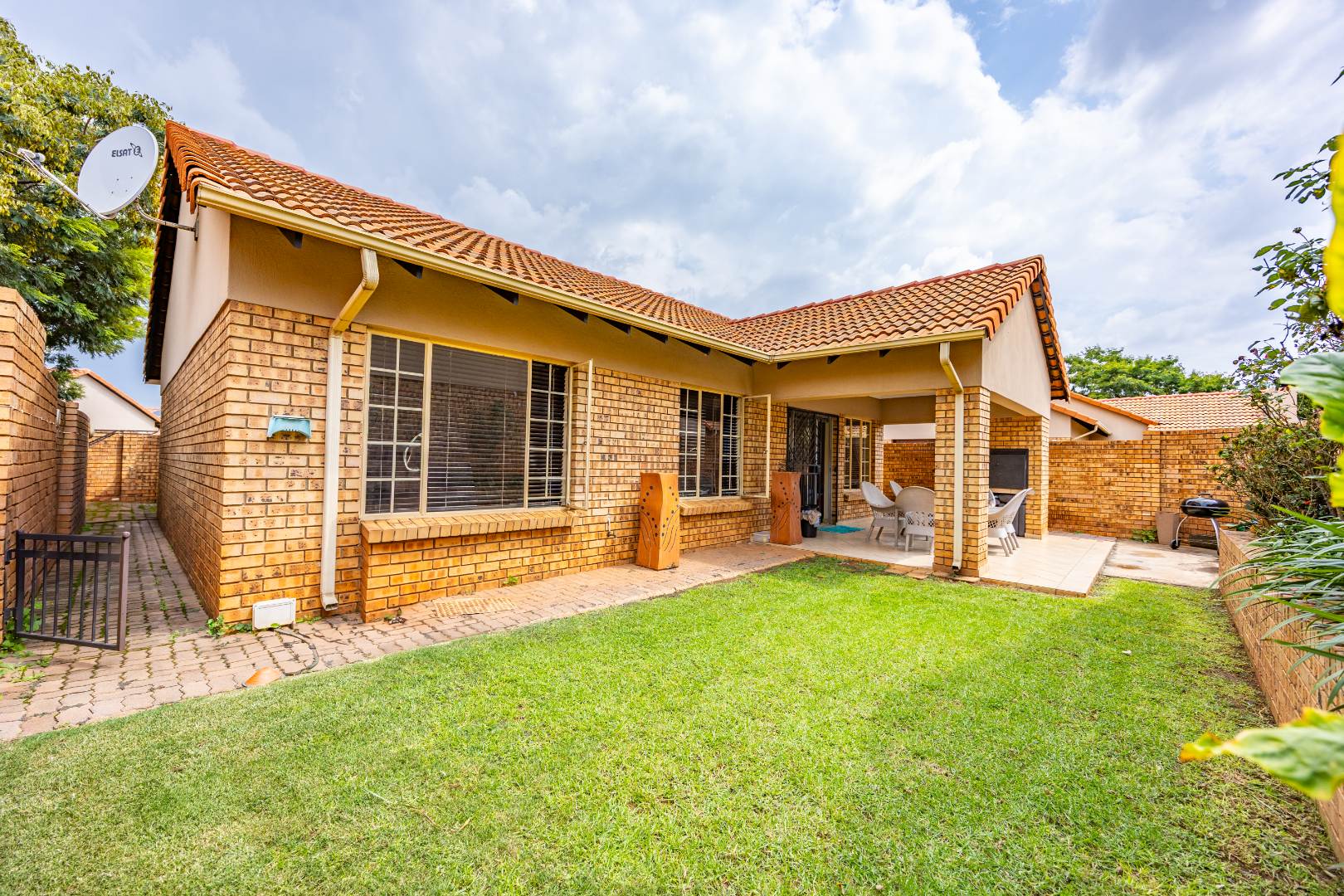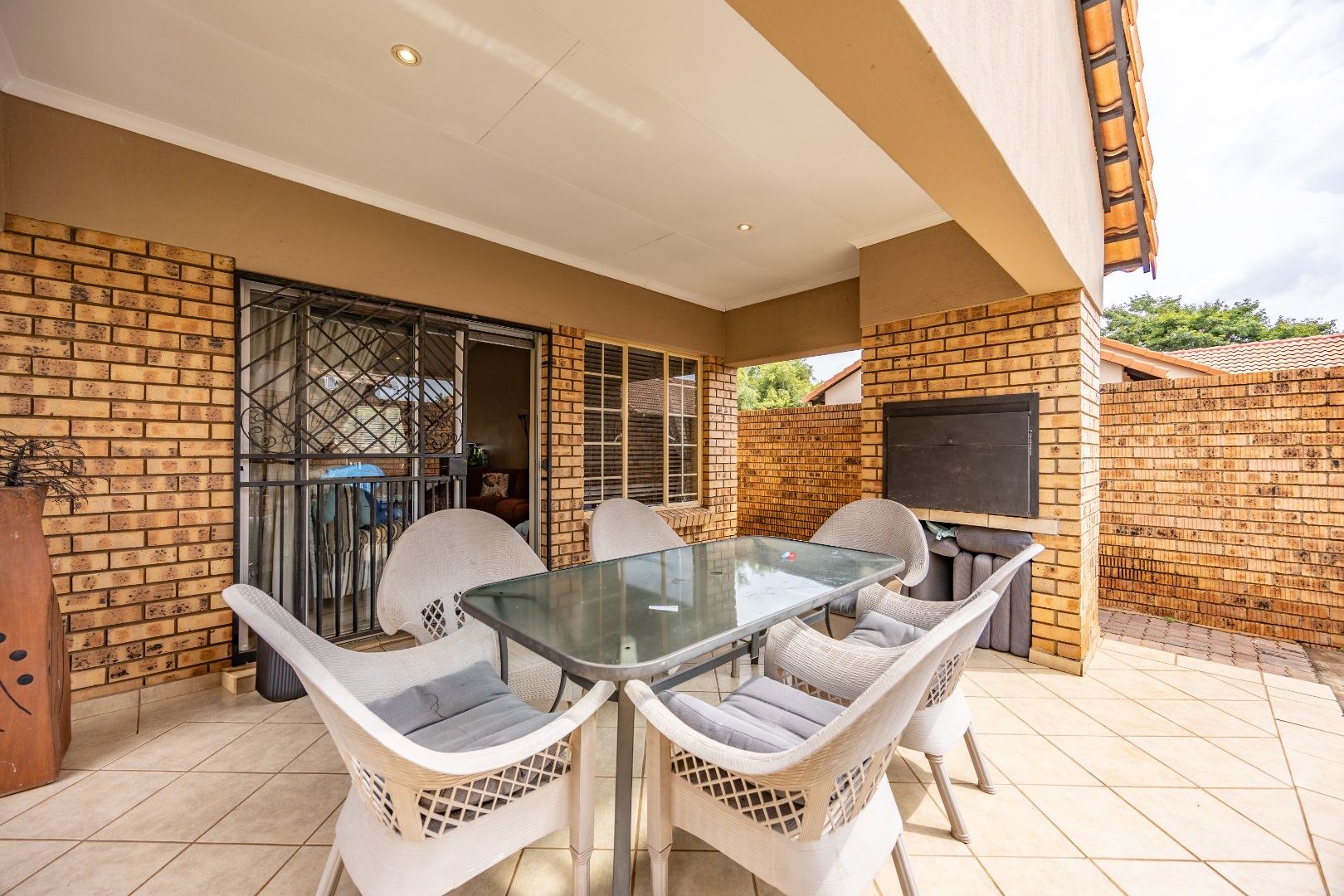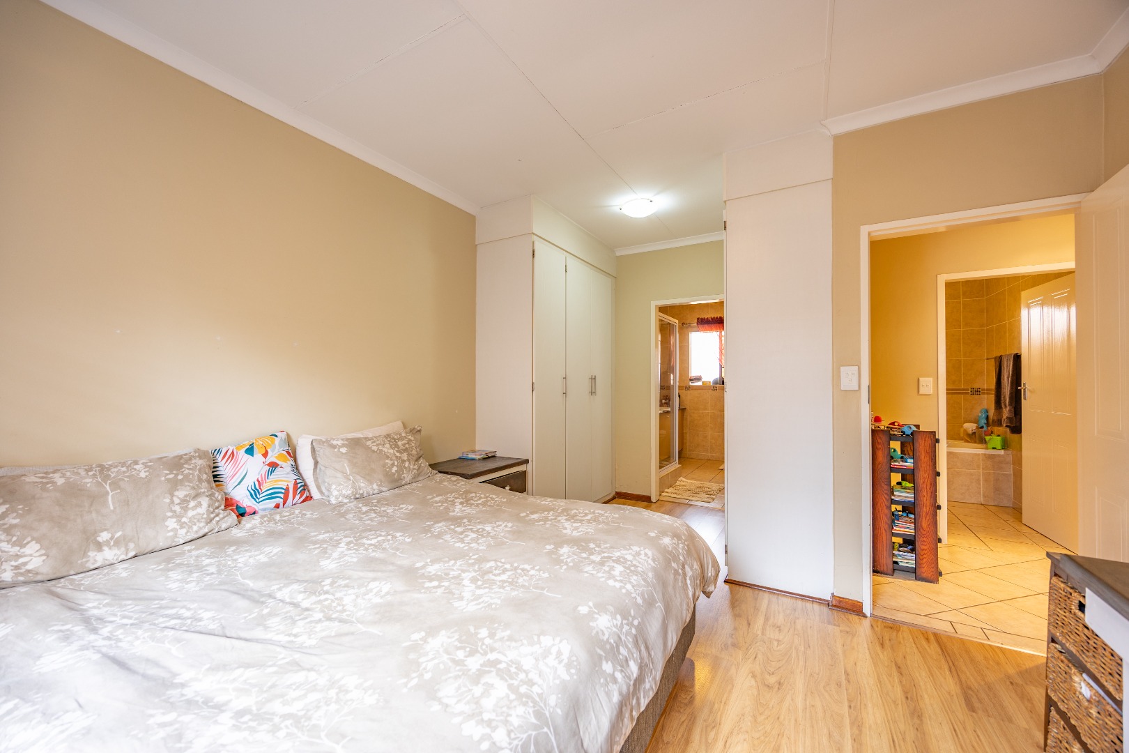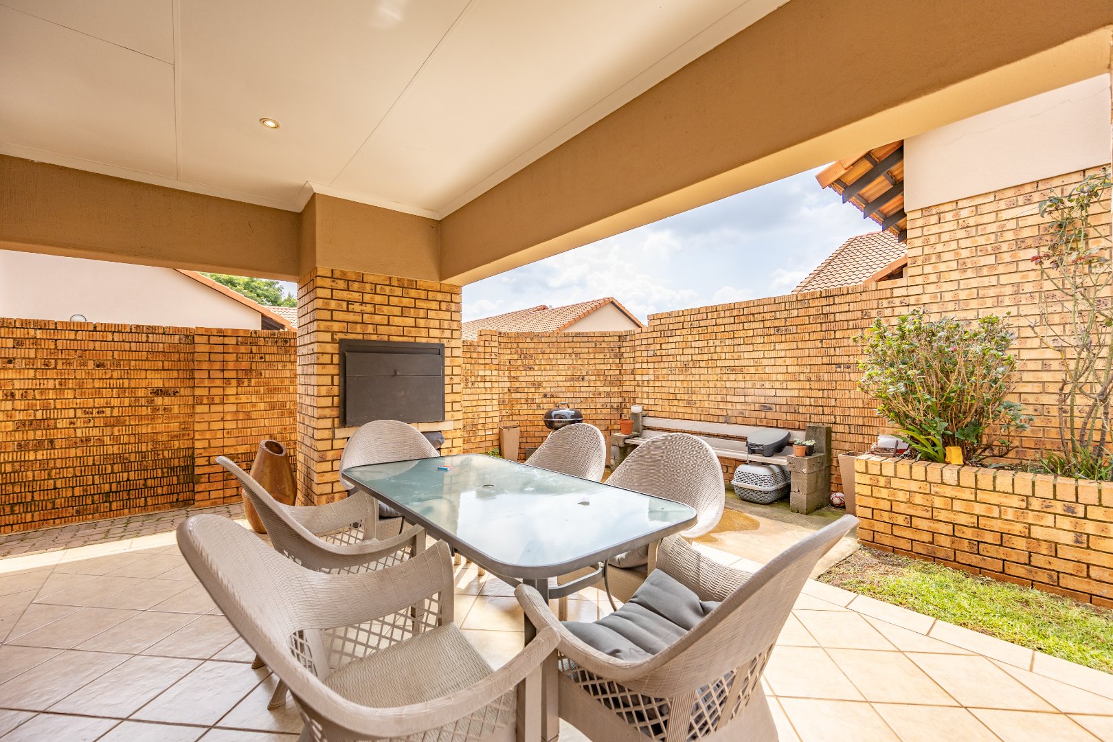 Additional features include linen cupboards, blinds in both bedrooms, a built-in braai on the patio, garden irrigation, and a double automated garage for secure parking.