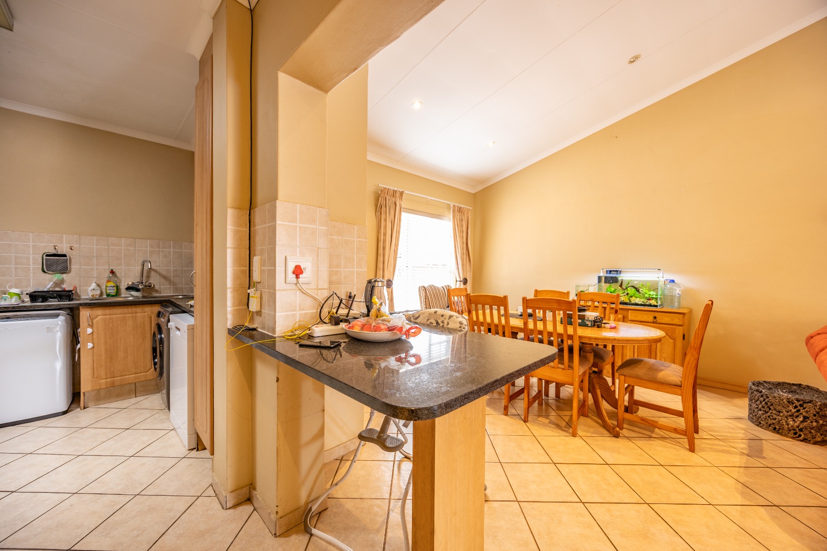 The open-plan kitchen is thoughtfully designed with space for three appliances, a single-door fridge, and direct access to a private courtyard. Flowing seamlessly into the living and dining area, this space creates an inviting atmosphere for both relaxation and entertainment. The living area extends to a covered patio, perfect for outdoor gatherings. The home features two well-appointed bedrooms with laminate flooring and built-in cupboards. The main bedroom boasts a stylish en-suite bathroom with a double vanity and shower, while the second bathroom is fitted with a bath.