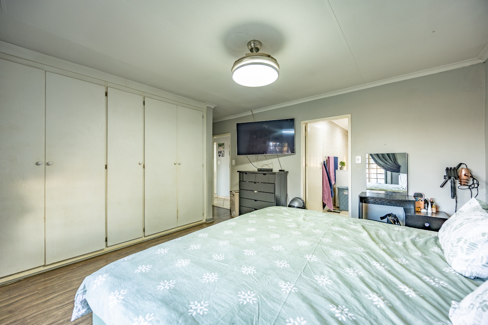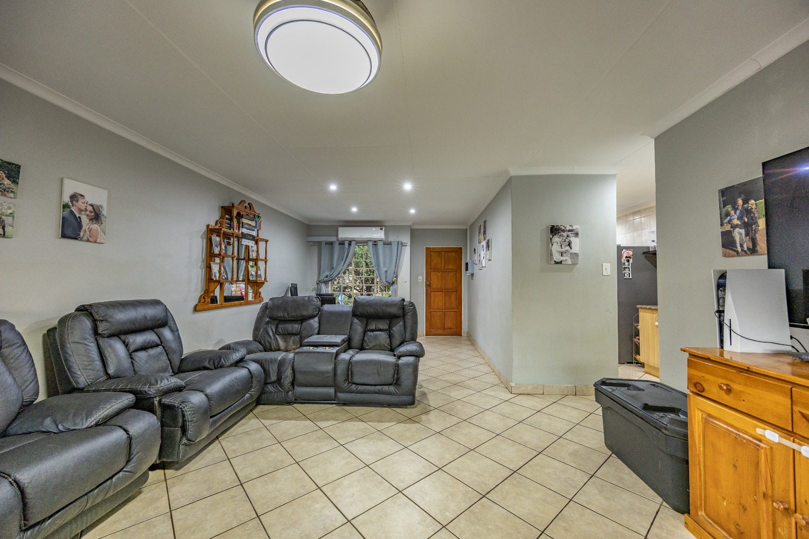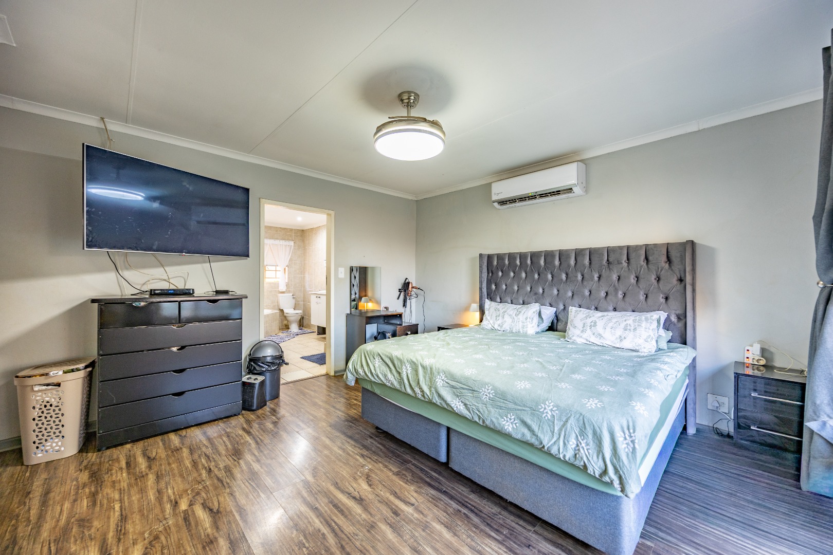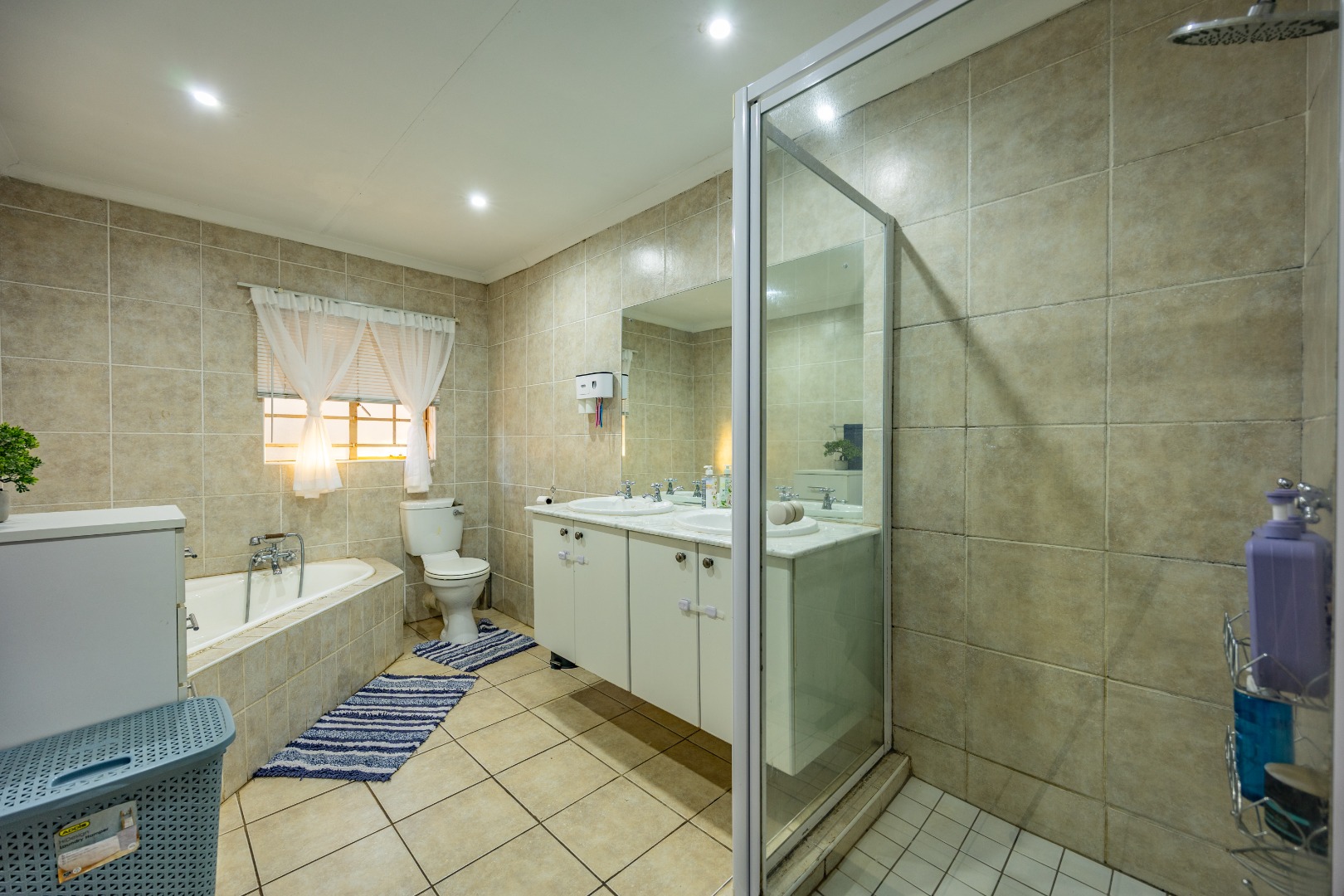 Accommodation includes three well-sized bedrooms, all fitted with built-in cupboards and laminate flooring for easy maintenance. The main bedroom boasts an air-conditioner and a full en suite bathroom with double sinks, creating a private retreat for the owners. The additional bedrooms share a neat bathroom, while a linen cupboard provides extra storage to keep the home organized and functional.