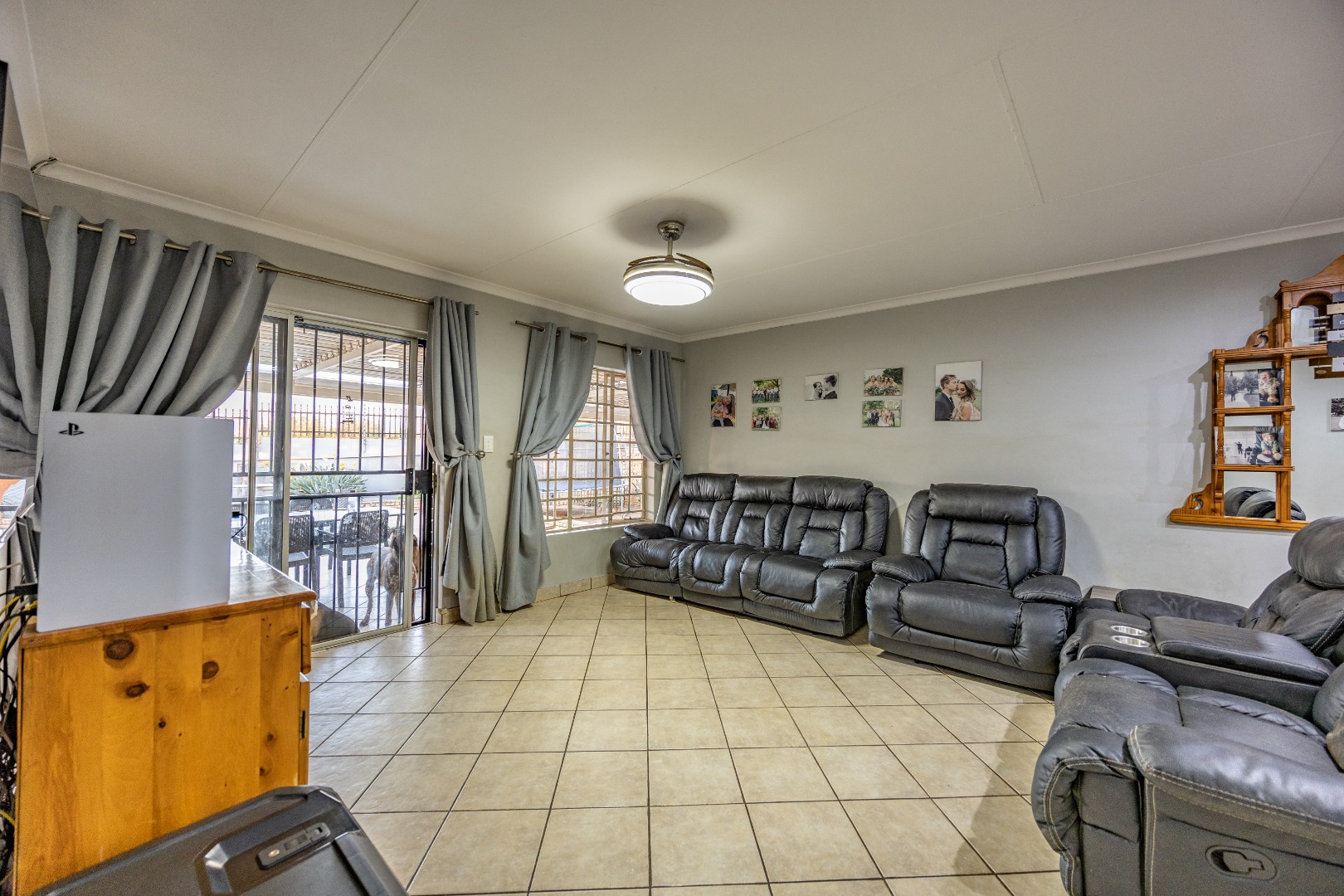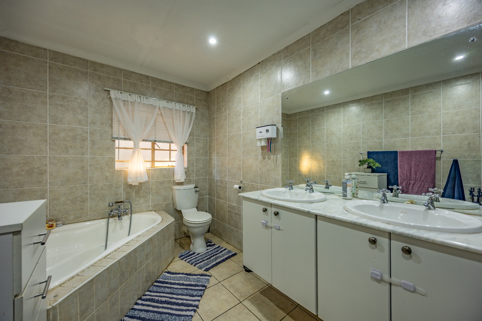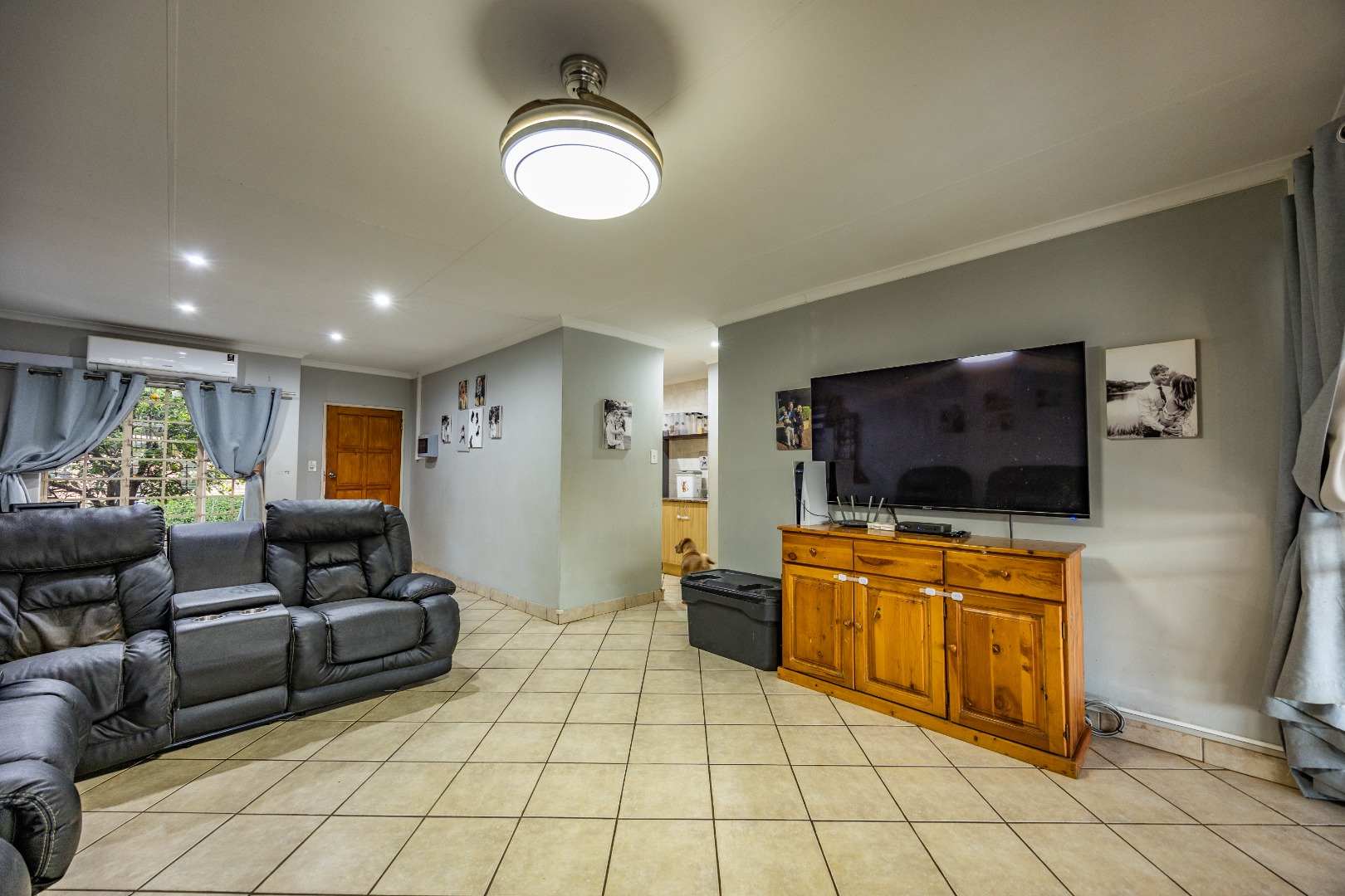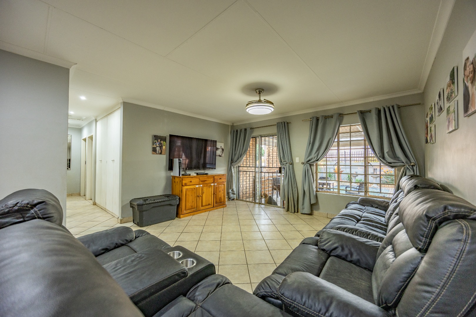 Accommodation includes three well-sized bedrooms, all fitted with built-in cupboards and laminate flooring for easy maintenance. The main bedroom boasts an air-conditioner and a full en suite bathroom with double sinks, creating a private retreat for the owners. The additional bedrooms share a neat bathroom, while a linen cupboard provides extra storage to keep the home organized and functional.