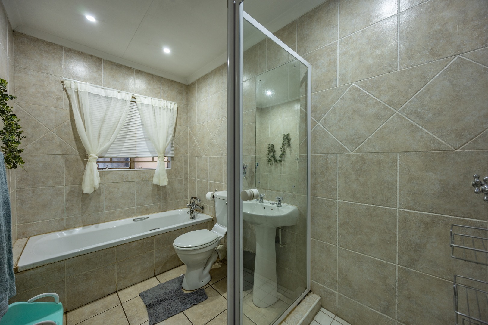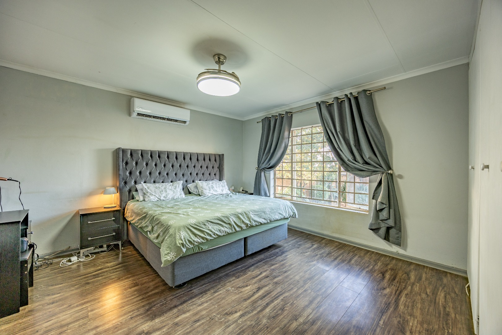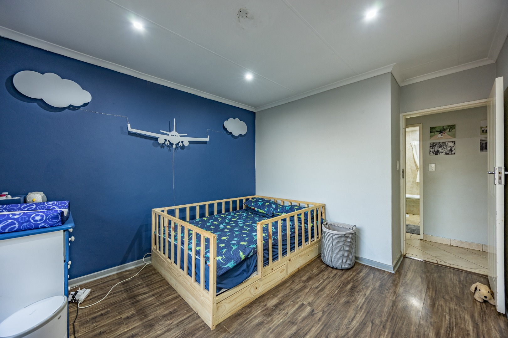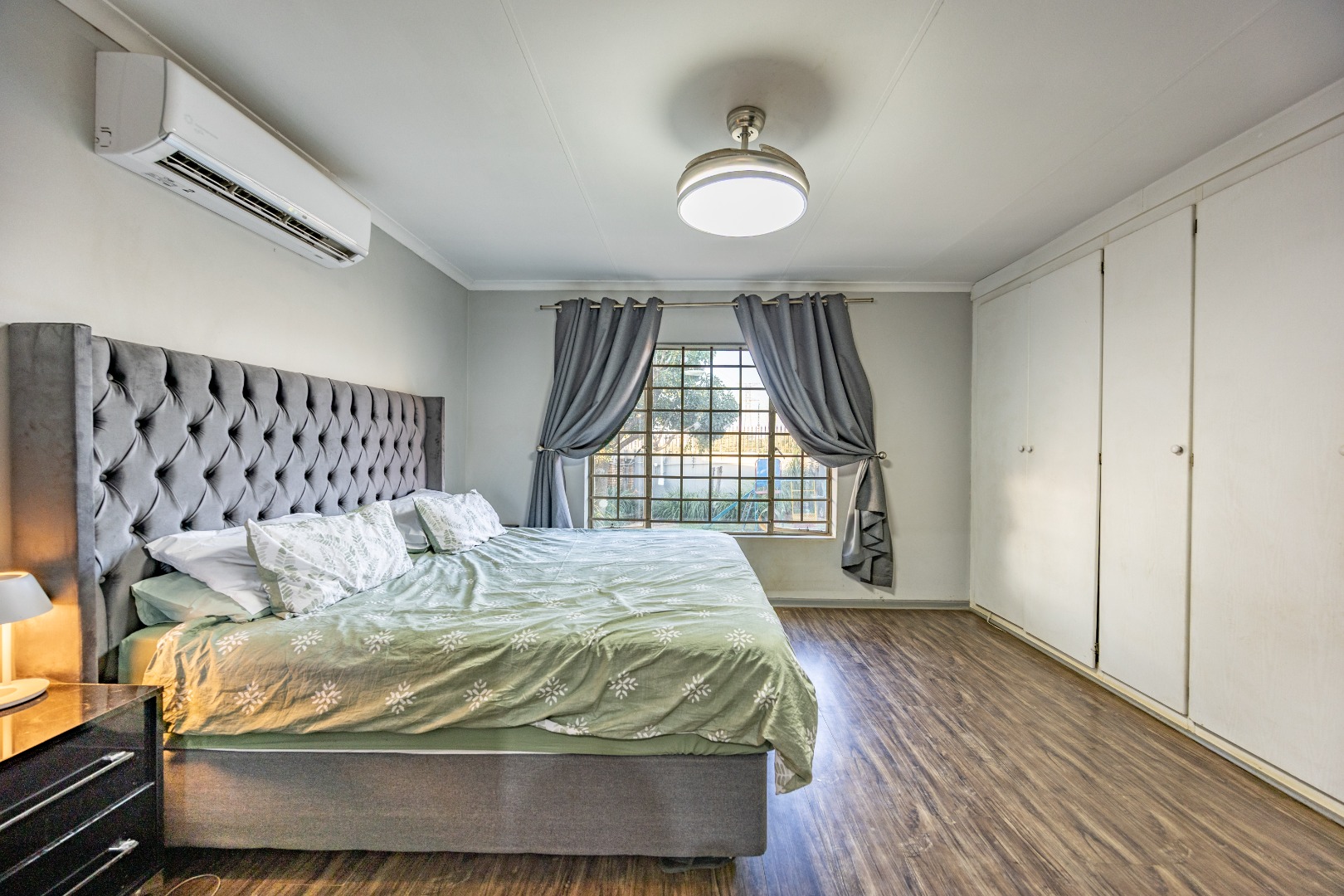Accommodation includes three well-sized bedrooms, all fitted with built-in cupboards and laminate flooring for easy maintenance. The main bedroom boasts an air-conditioner and a full en suite bathroom with double sinks, creating a private retreat for the owners. The additional bedrooms share a neat bathroom, while a linen cupboard provides extra storage to keep the home organized and functional.