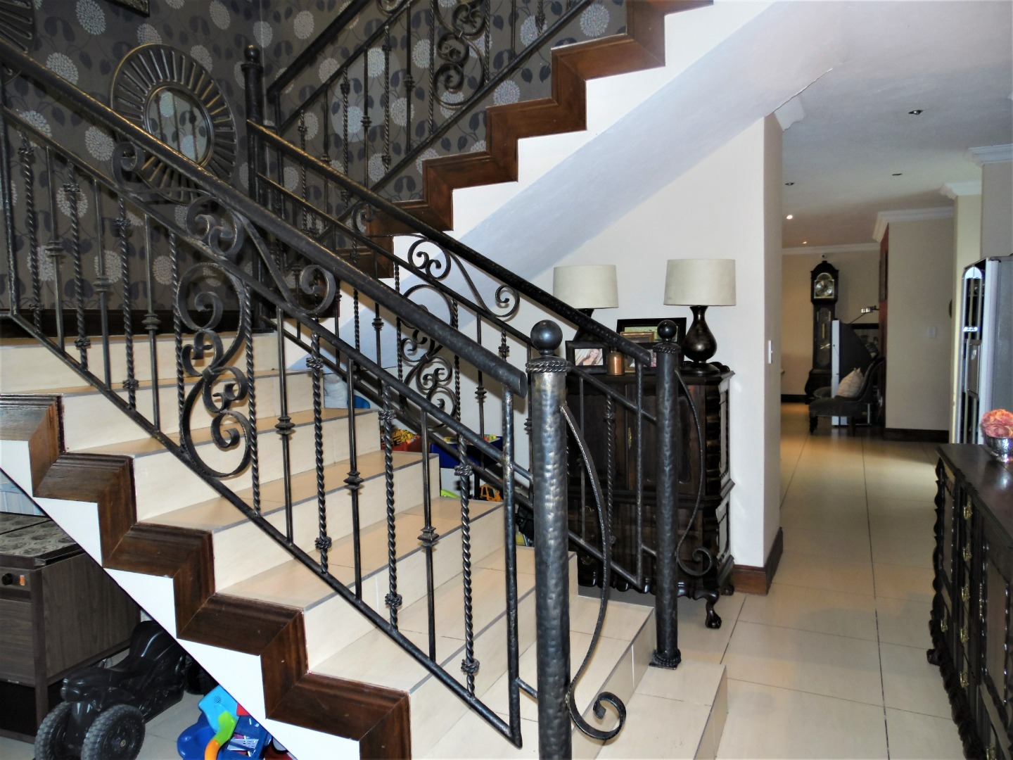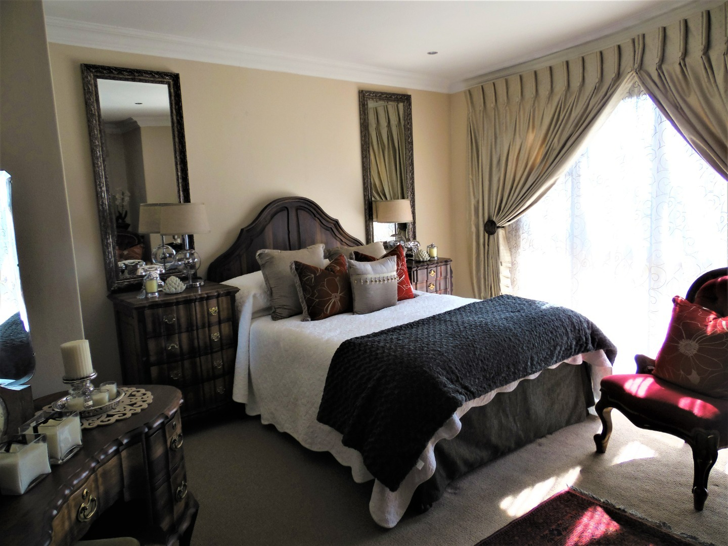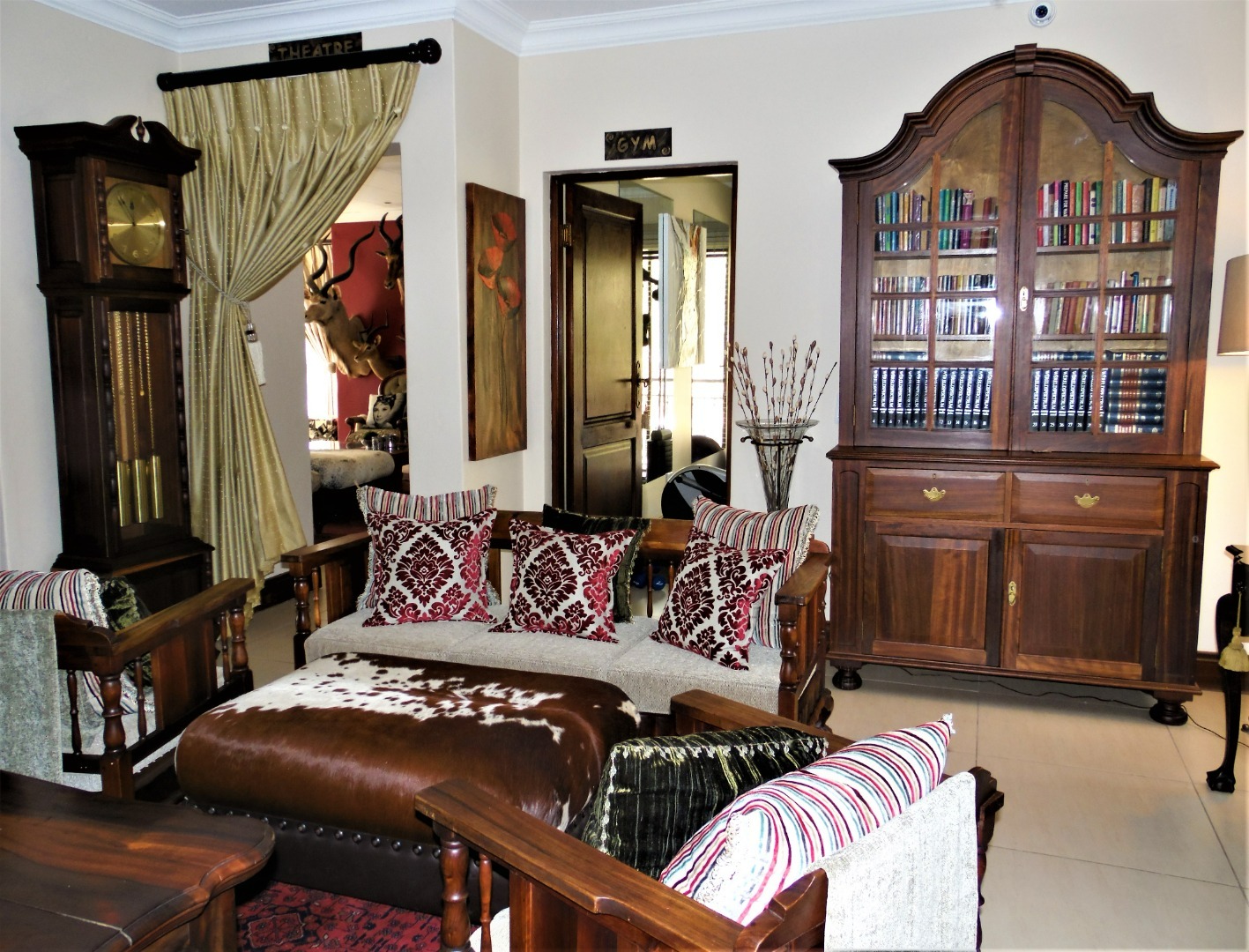 The multiple doors and expansive windows not only provide natural light and ventilation but also offer breathtaking views of the beautifully manicured garden. Four en-suite bedrooms, four reception areas, library/study, gym, kitchen with scullery, four garages extra length with storage space, staff accommodation, and a storeroom. This residence was designed for a family who appreciate luxury and style in a security estate