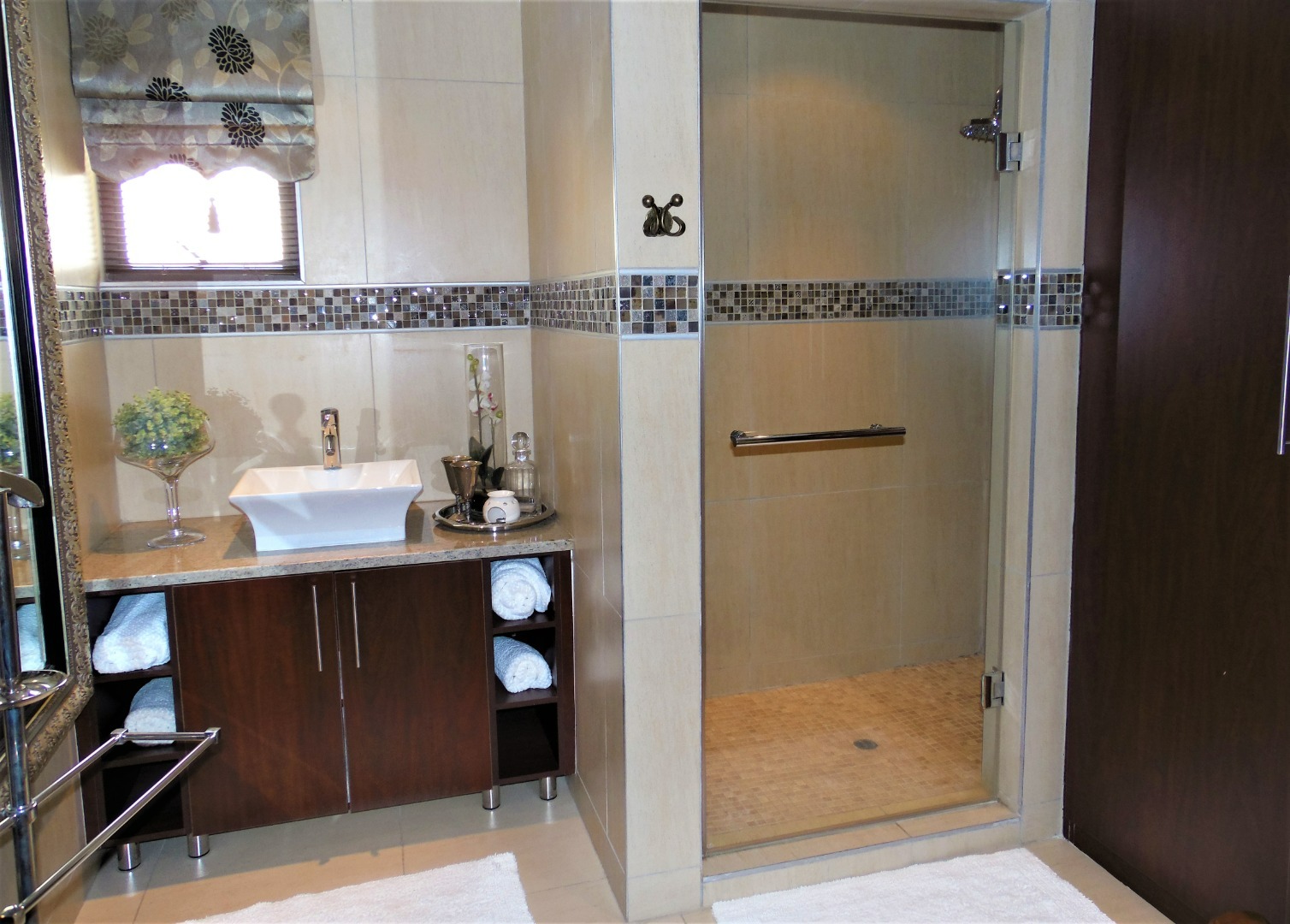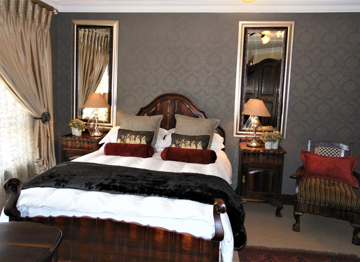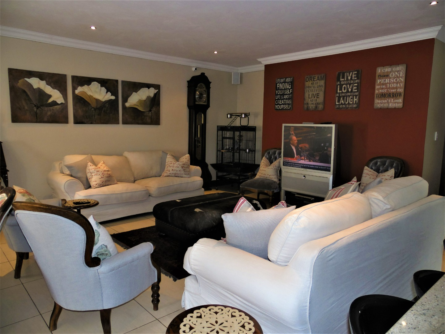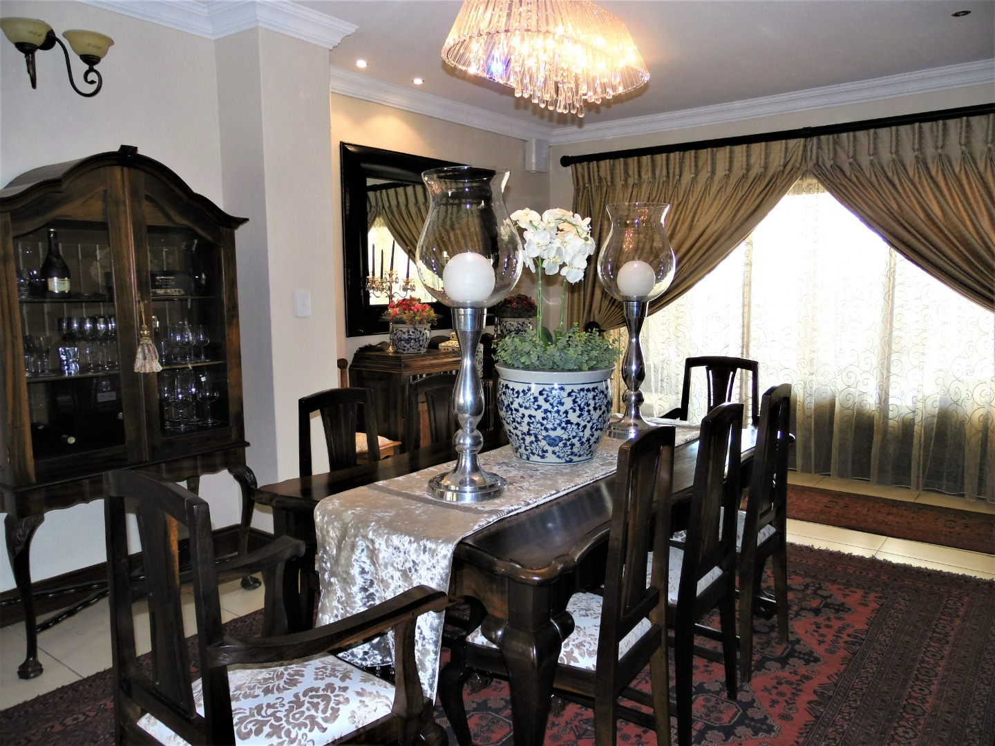 You are welcomed by a grand entrance hall, where the red Persian carpet is literally rolled out on the stairs. The open-plan, tiled, living areas include the formal lounge, the family lounge with a fireplace, and a spacious dining room. The dining room and family room open out to an under-covered patio with a built-in braai and a bar area, making this home ideal for the family that enjoys entertaining family and friends. This area also overlooks the heated swimming pool and luscious garden.