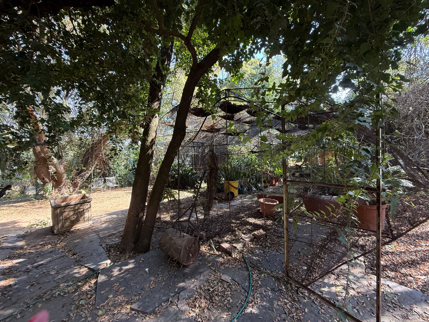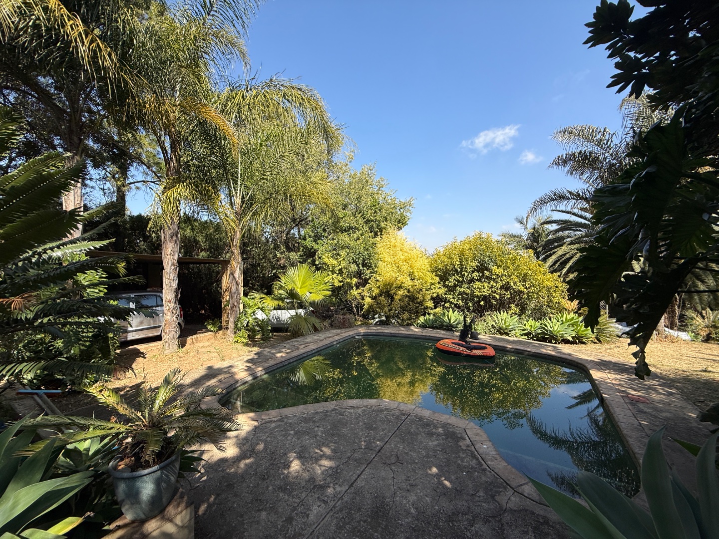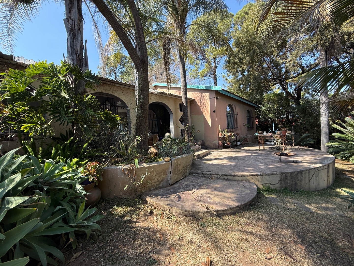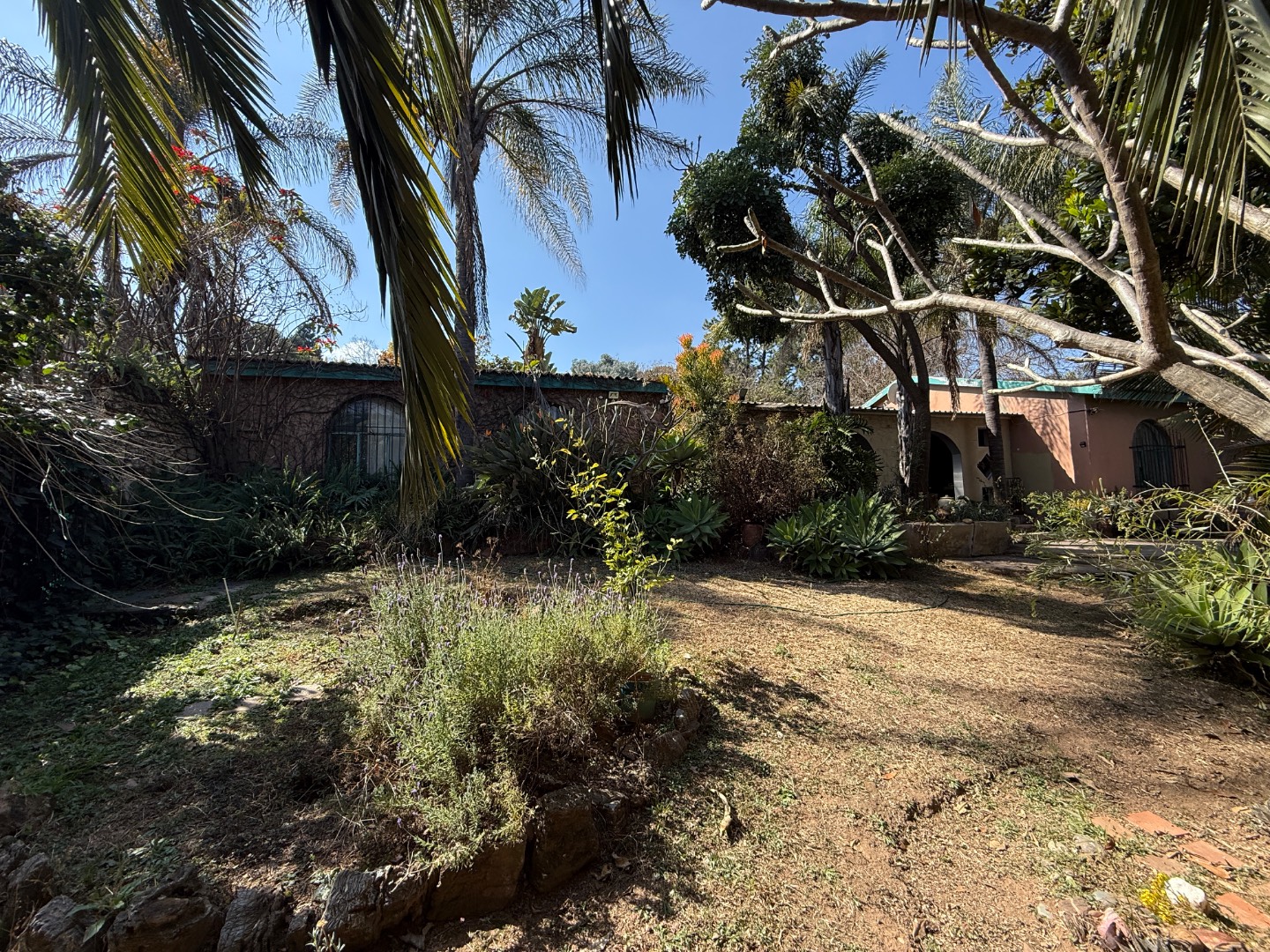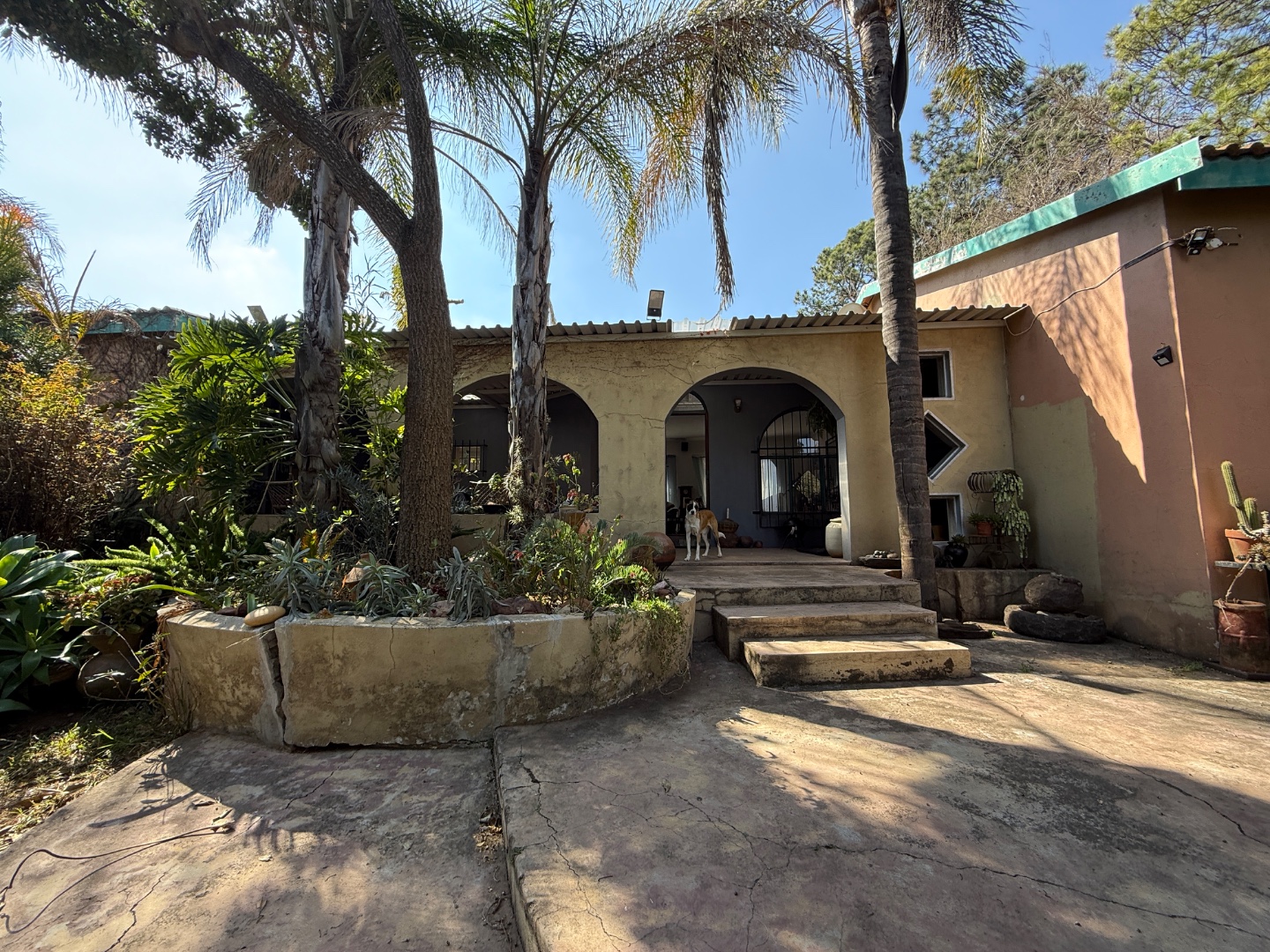 The property currently hosts two separate houses, offering rental income potential or accommodation during development. A large swimming pool and established garden enhance the appeal for both short-term use and long-term vision.