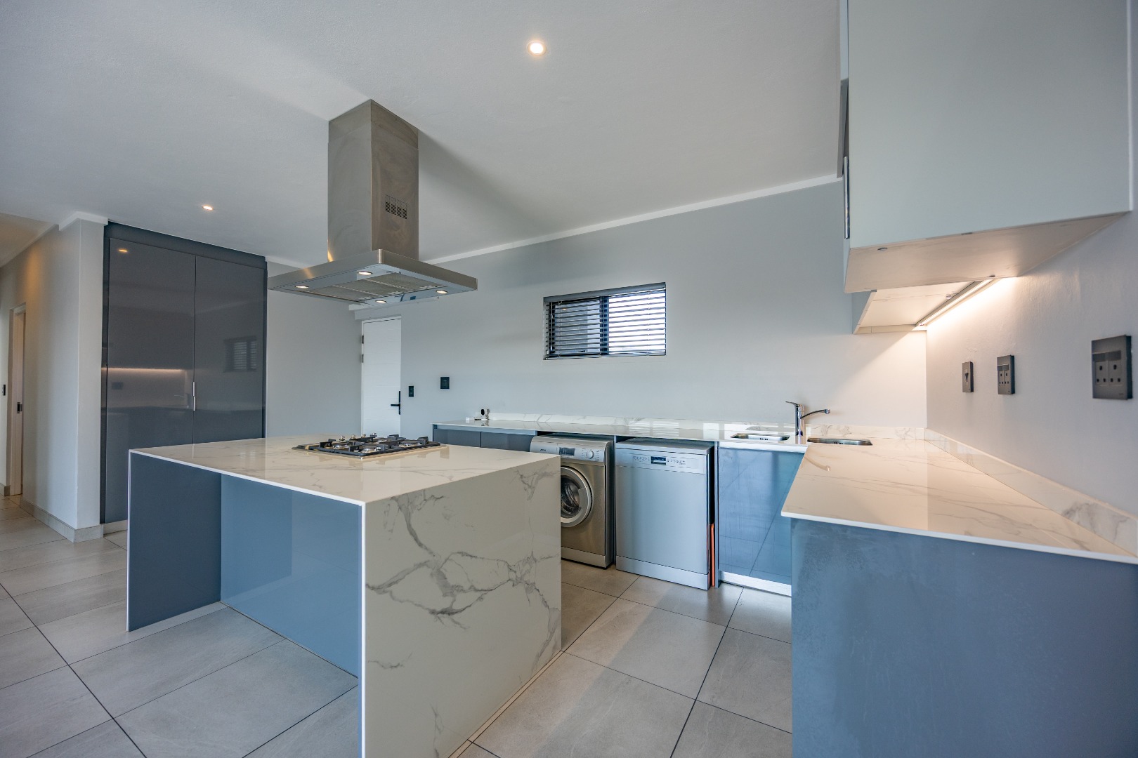 Contemporary kitchen with high-end finishes and washer and dryer included.