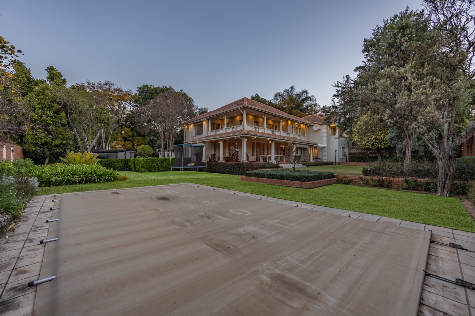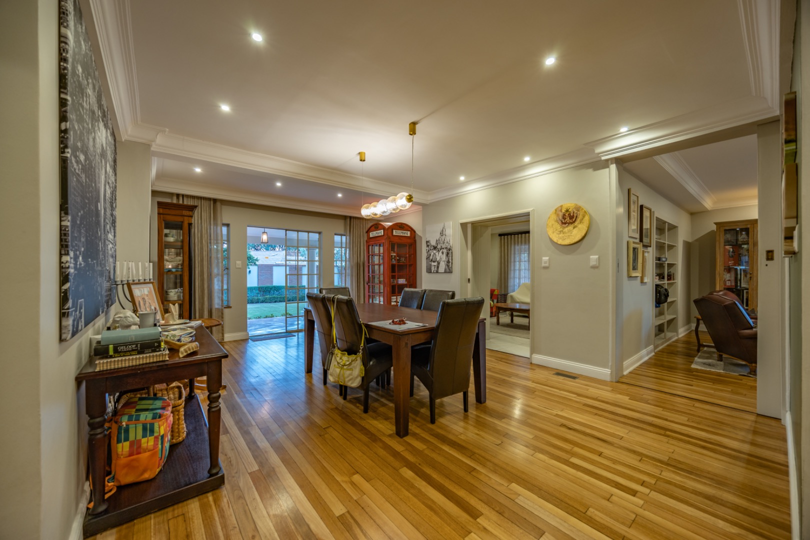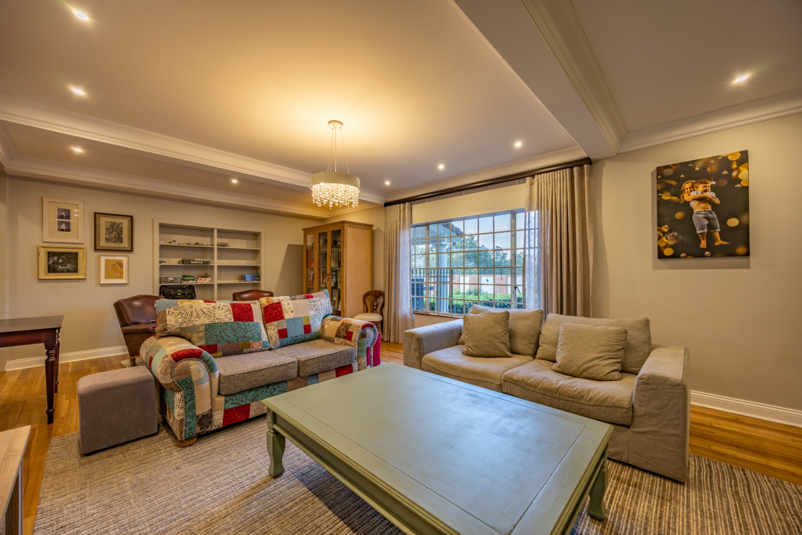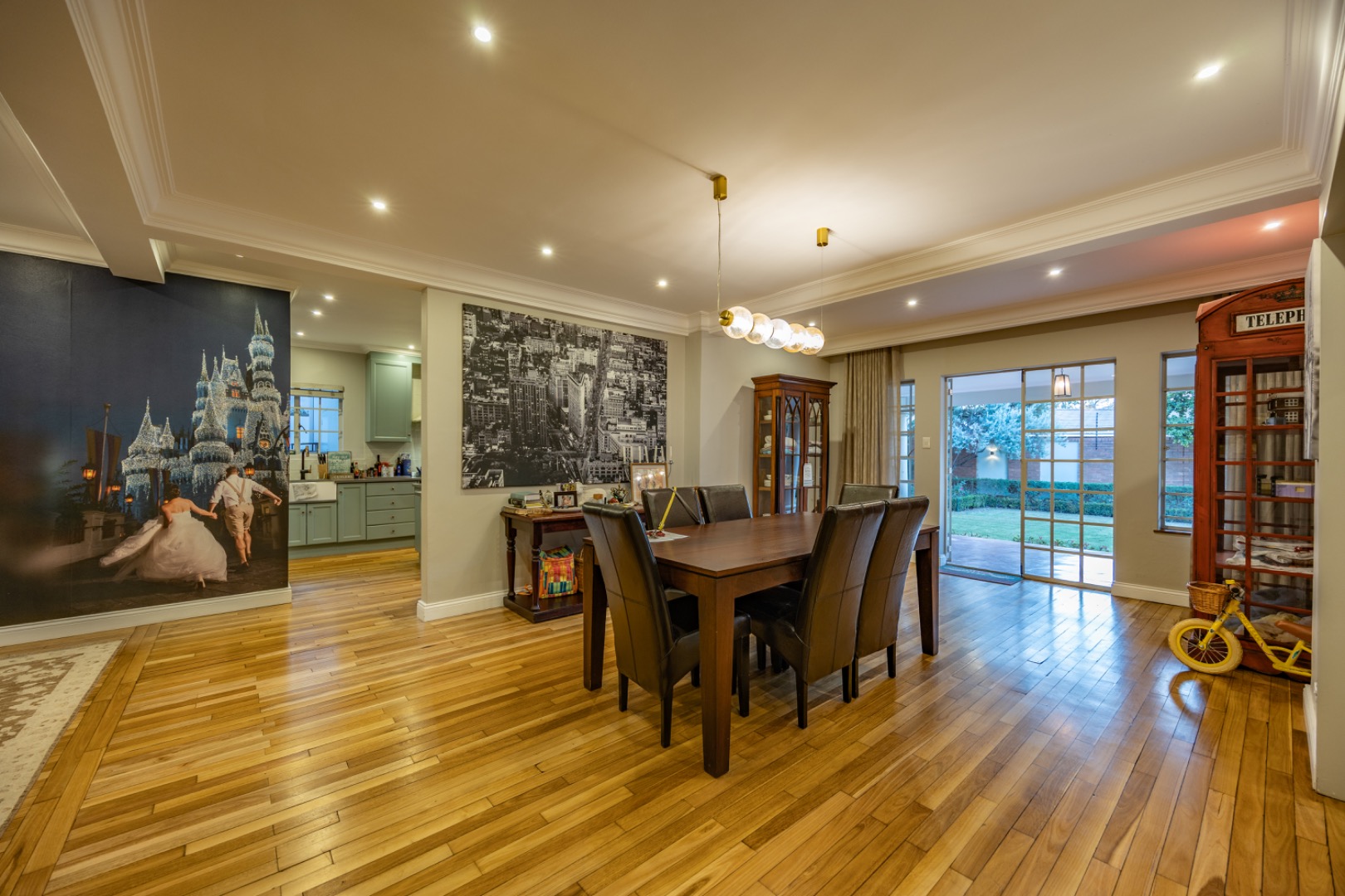 This beautiful residence offers the perfect balance of elegance, comfort, and functionality. Upon entering, you are welcomed by a spacious entrance hall that immediately sets the tone for the home’s warm yet sophisticated atmosphere. To the left, a generously sized TV lounge with a gas fireplace creates a cozy space for family gatherings, while a private lounge with a built-in bookshelf provides a quieter retreat, ideal for reading or intimate conversations. The formal dining room is designed for effortless entertaining, flowing seamlessly onto a wraparound patio that overlooks a landscaped garden and sparkling swimming pool. The layout is perfect for hosting both indoor and outdoor occasions, with a guest toilet conveniently located for visitors.