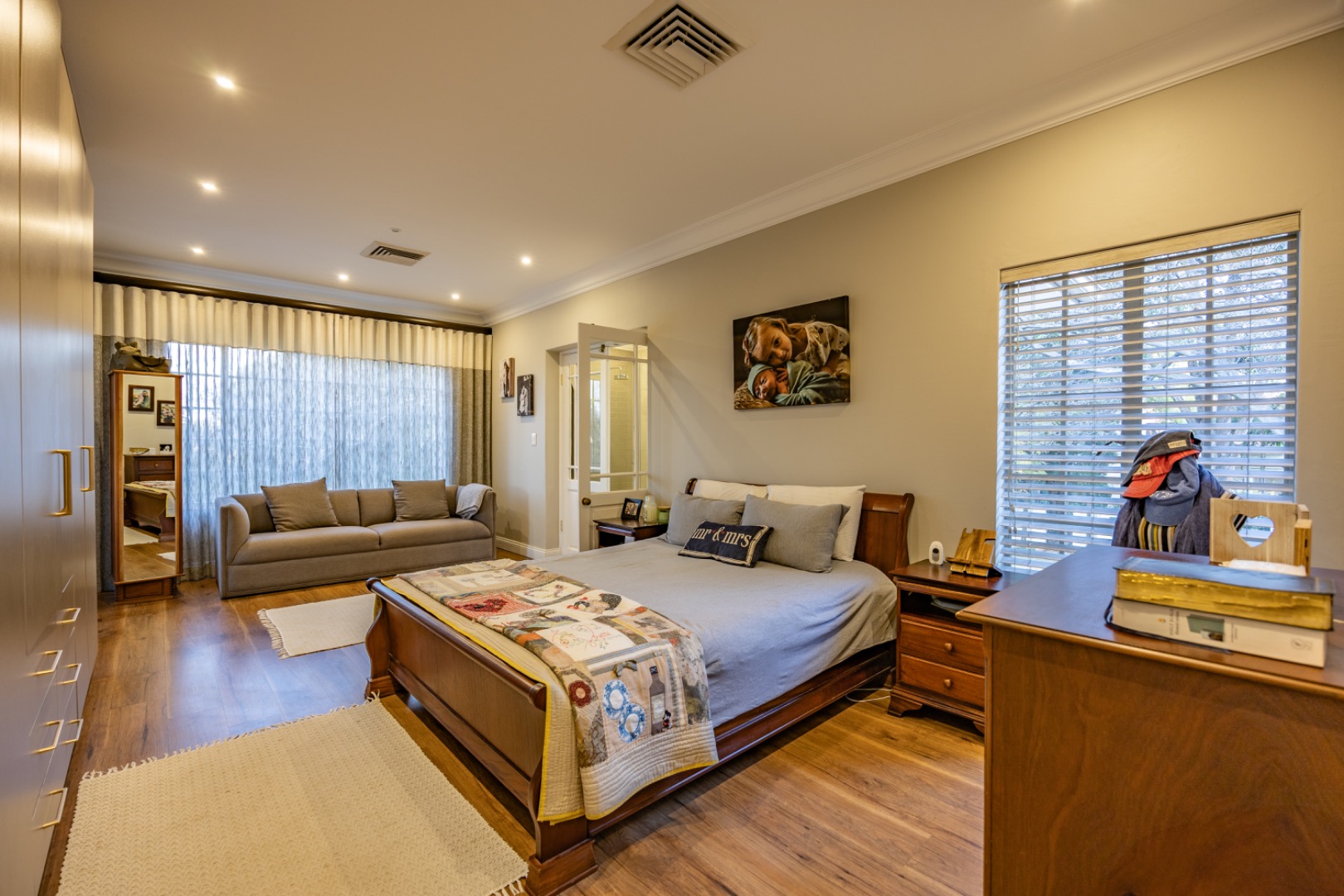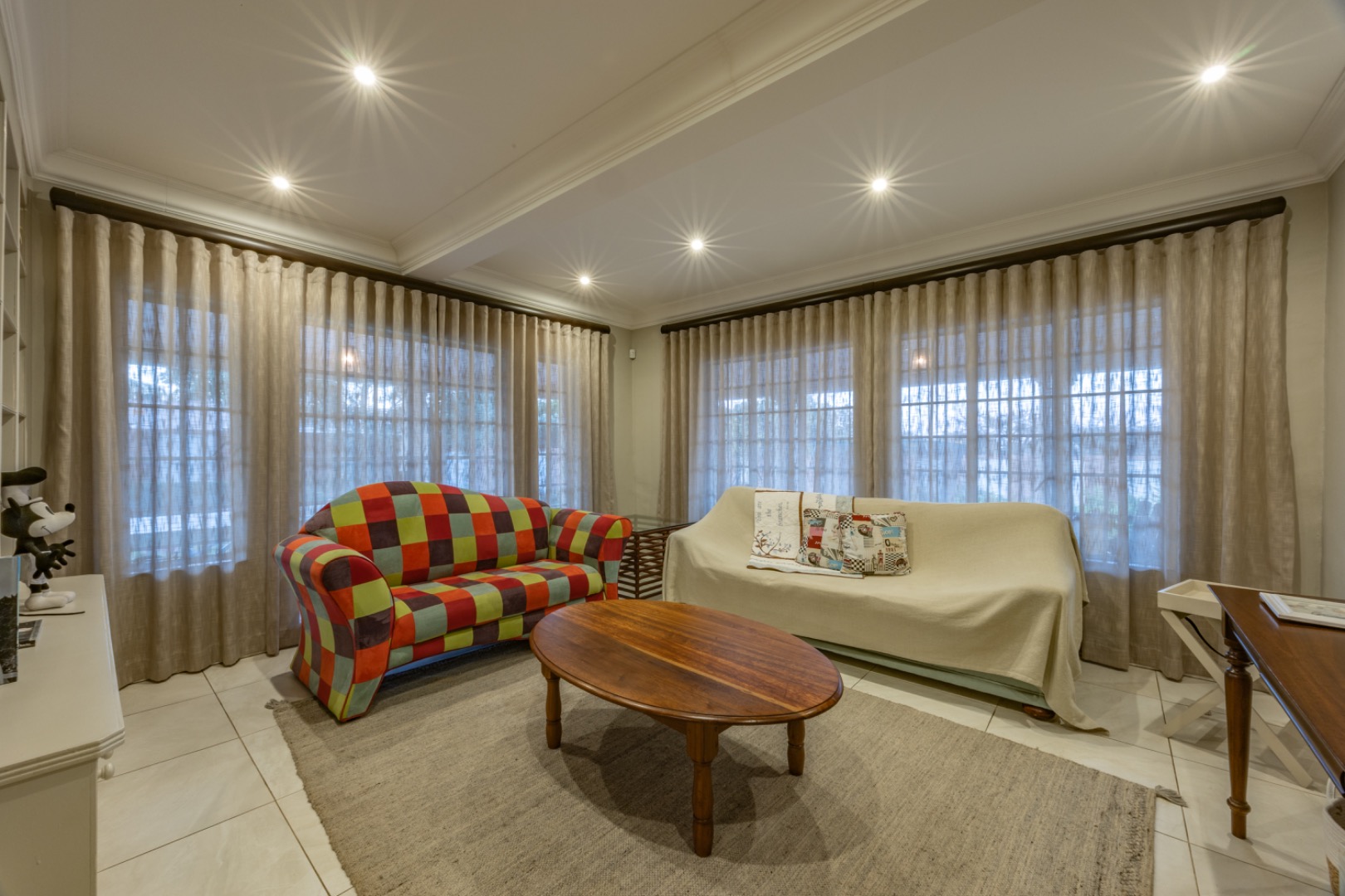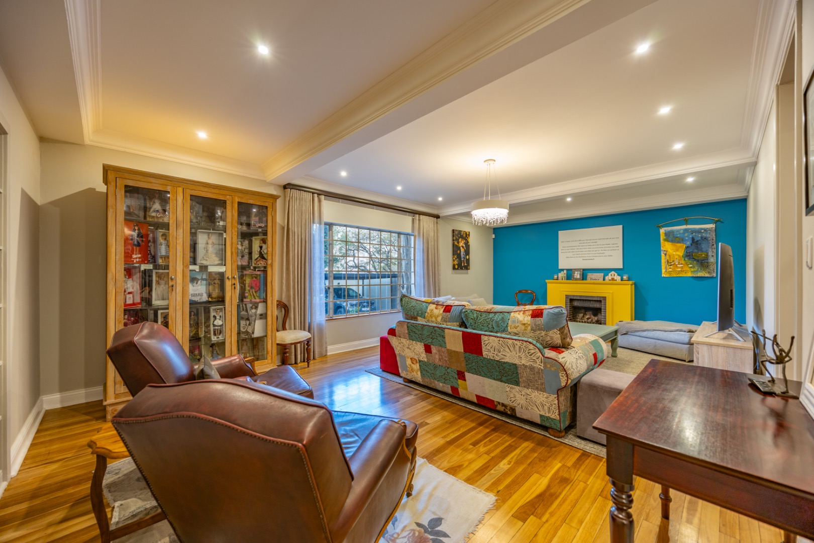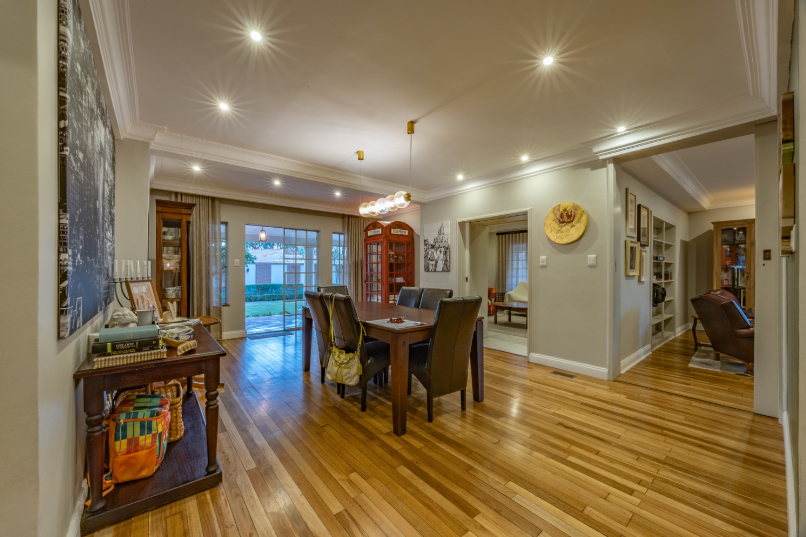 This beautiful residence offers the perfect balance of elegance, comfort, and functionality. Upon entering, you are welcomed by a spacious entrance hall that immediately sets the tone for the home’s warm yet sophisticated atmosphere. To the left, a generously sized TV lounge with a gas fireplace creates a cozy space for family gatherings, while a private lounge with a built-in bookshelf provides a quieter retreat, ideal for reading or intimate conversations. The formal dining room is designed for effortless entertaining, flowing seamlessly onto a wraparound patio that overlooks a landscaped garden and sparkling swimming pool. The layout is perfect for hosting both indoor and outdoor occasions, with a guest toilet conveniently located for visitors.