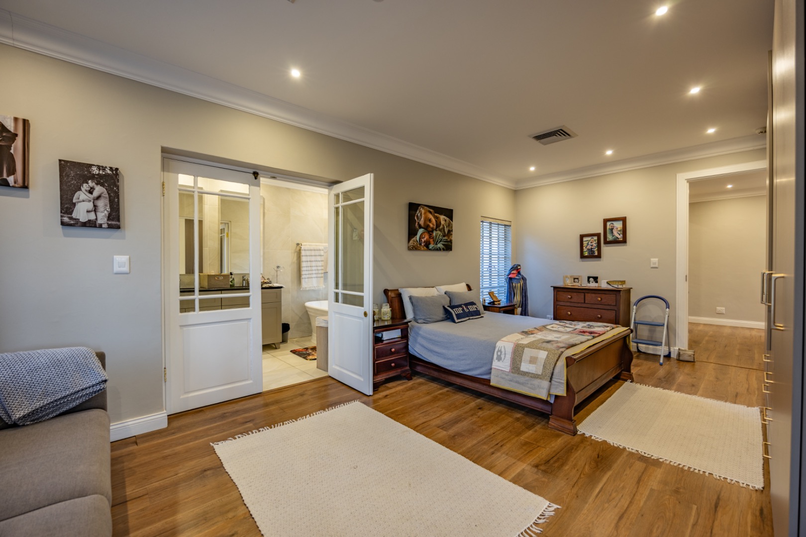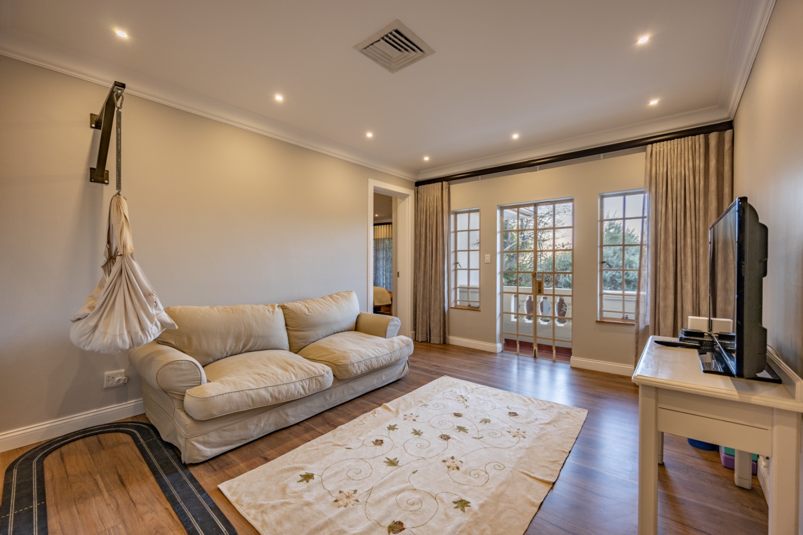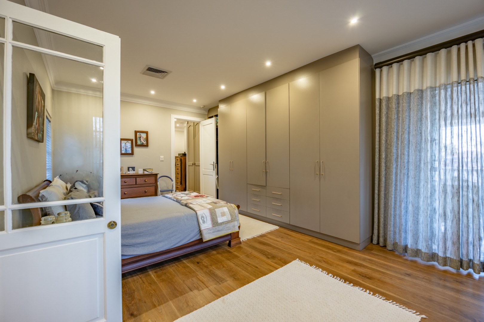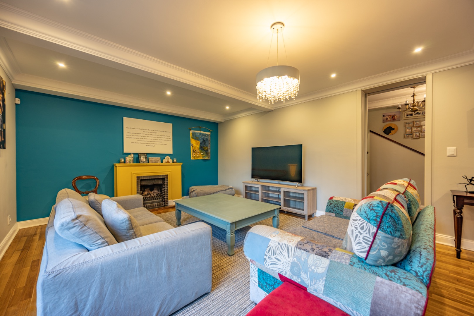 This beautiful residence offers the perfect balance of elegance, comfort, and functionality. Upon entering, you are welcomed by a spacious entrance hall that immediately sets the tone for the home’s warm yet sophisticated atmosphere. To the left, a generously sized TV lounge with a gas fireplace creates a cozy space for family gatherings, while a private lounge with a built-in bookshelf provides a quieter retreat, ideal for reading or intimate conversations. The formal dining room is designed for effortless entertaining, flowing seamlessly onto a wraparound patio that overlooks a landscaped garden and sparkling swimming pool. The layout is perfect for hosting both indoor and outdoor occasions, with a guest toilet conveniently located for visitors.