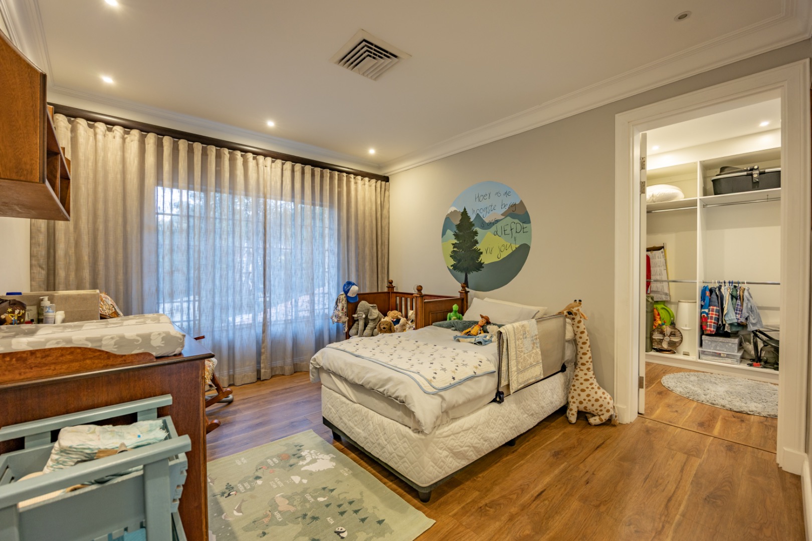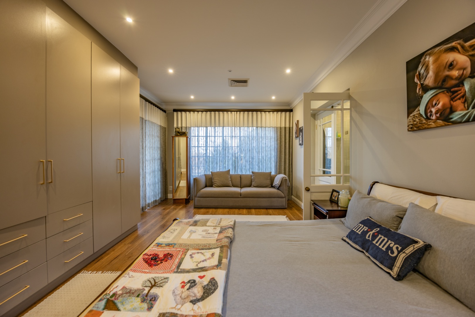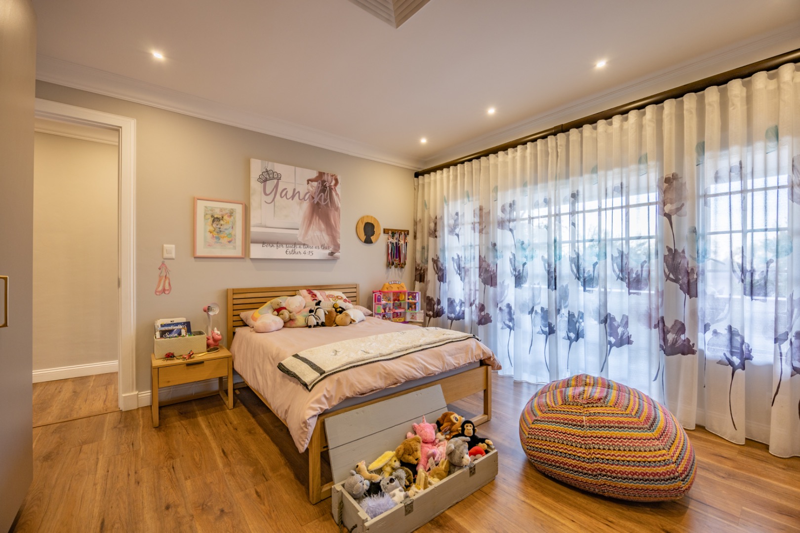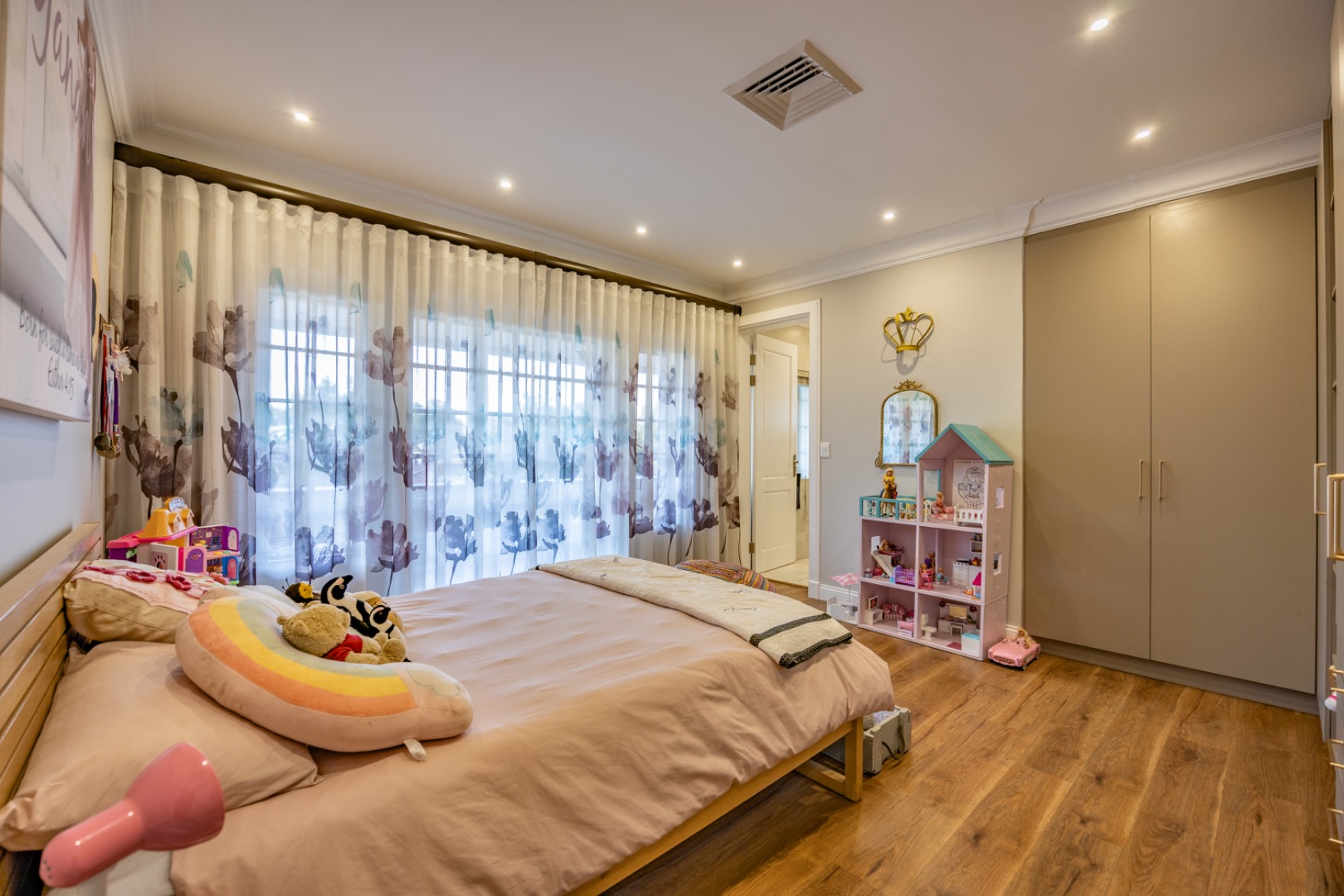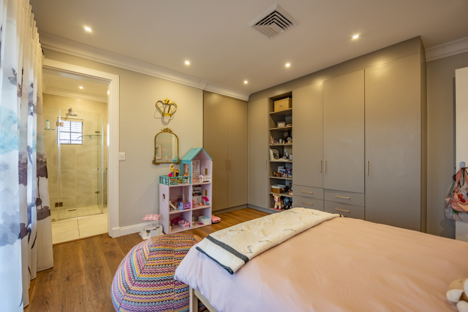 A striking wooden staircase leads you to the upper level, where a pajama lounge with its own balcony creates a relaxed living space for family downtime. Four bedrooms are positioned upstairs, all ensuite for ultimate comfort. The main bedroom is a true sanctuary, featuring a luxurious full bathroom, ample built-in cupboards, and a wraparound balcony with sweeping views. The additional bedrooms are equally well-appointed, each offering full bathrooms and generous cupboard space. One of the bedrooms also boasts a private dressing room and vanity, creating a boutique-style retreat.