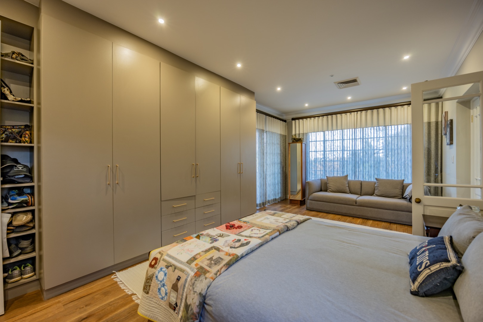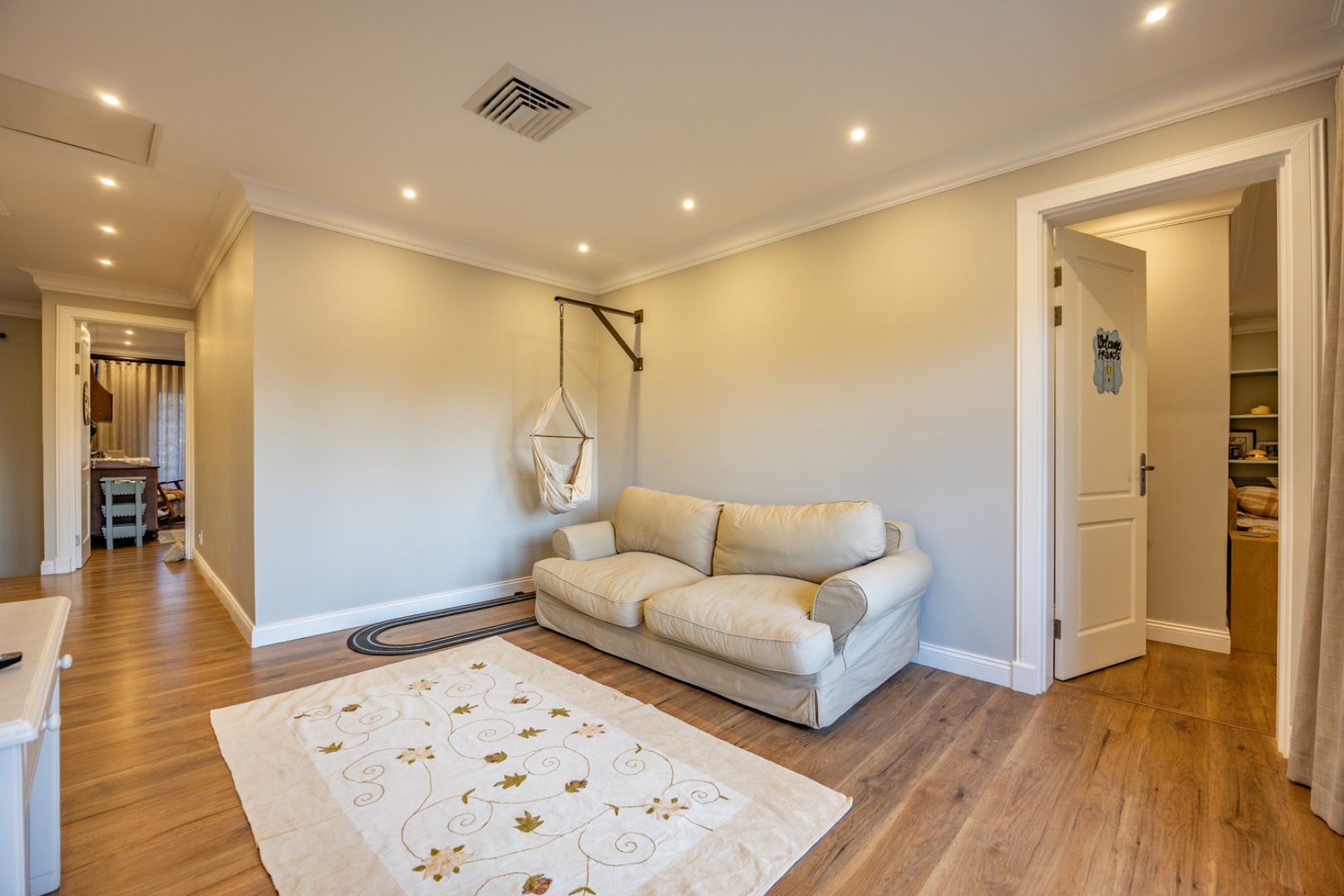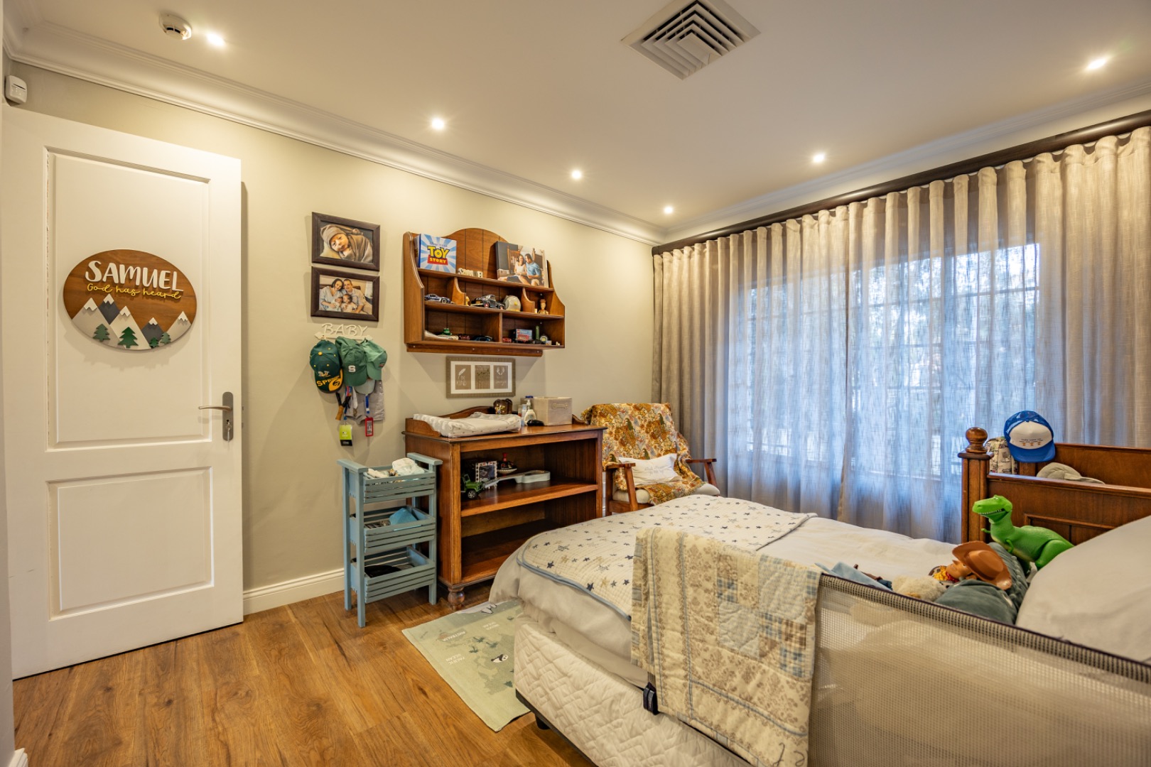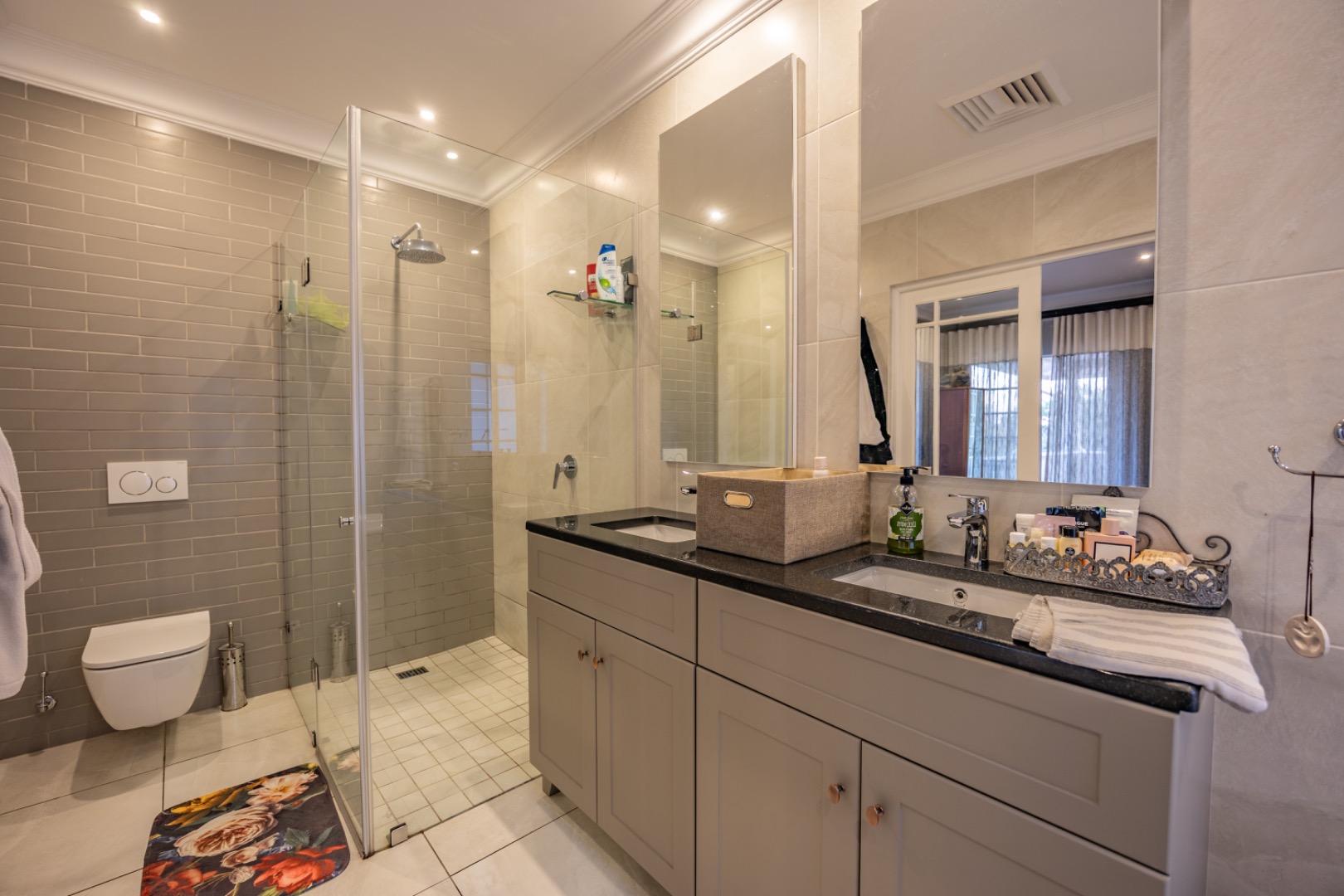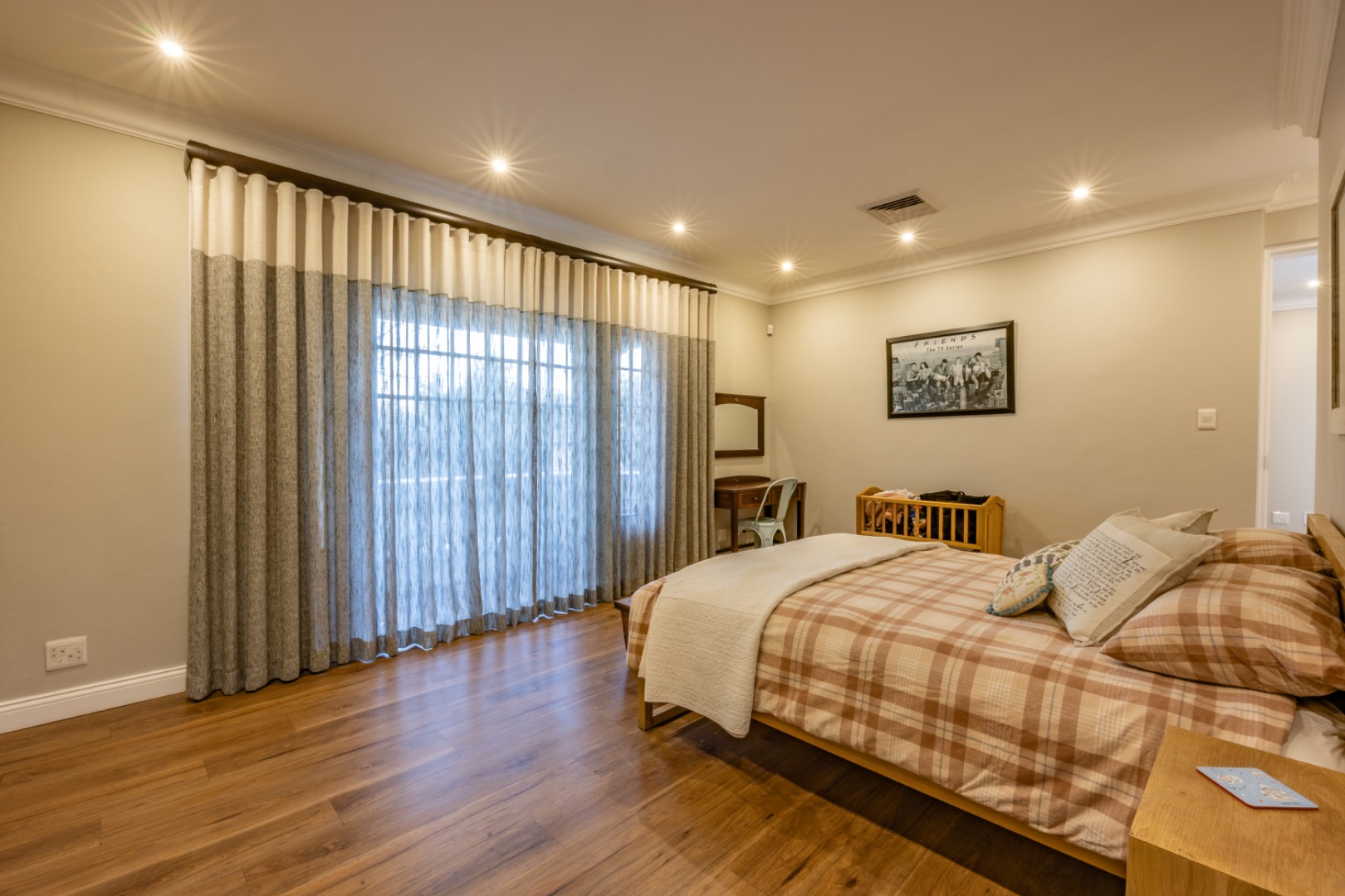 A striking wooden staircase leads you to the upper level, where a pajama lounge with its own balcony creates a relaxed living space for family downtime. Four bedrooms are positioned upstairs, all ensuite for ultimate comfort. The main bedroom is a true sanctuary, featuring a luxurious full bathroom, ample built-in cupboards, and a wraparound balcony with sweeping views. The additional bedrooms are equally well-appointed, each offering full bathrooms and generous cupboard space. One of the bedrooms also boasts a private dressing room and vanity, creating a boutique-style retreat.