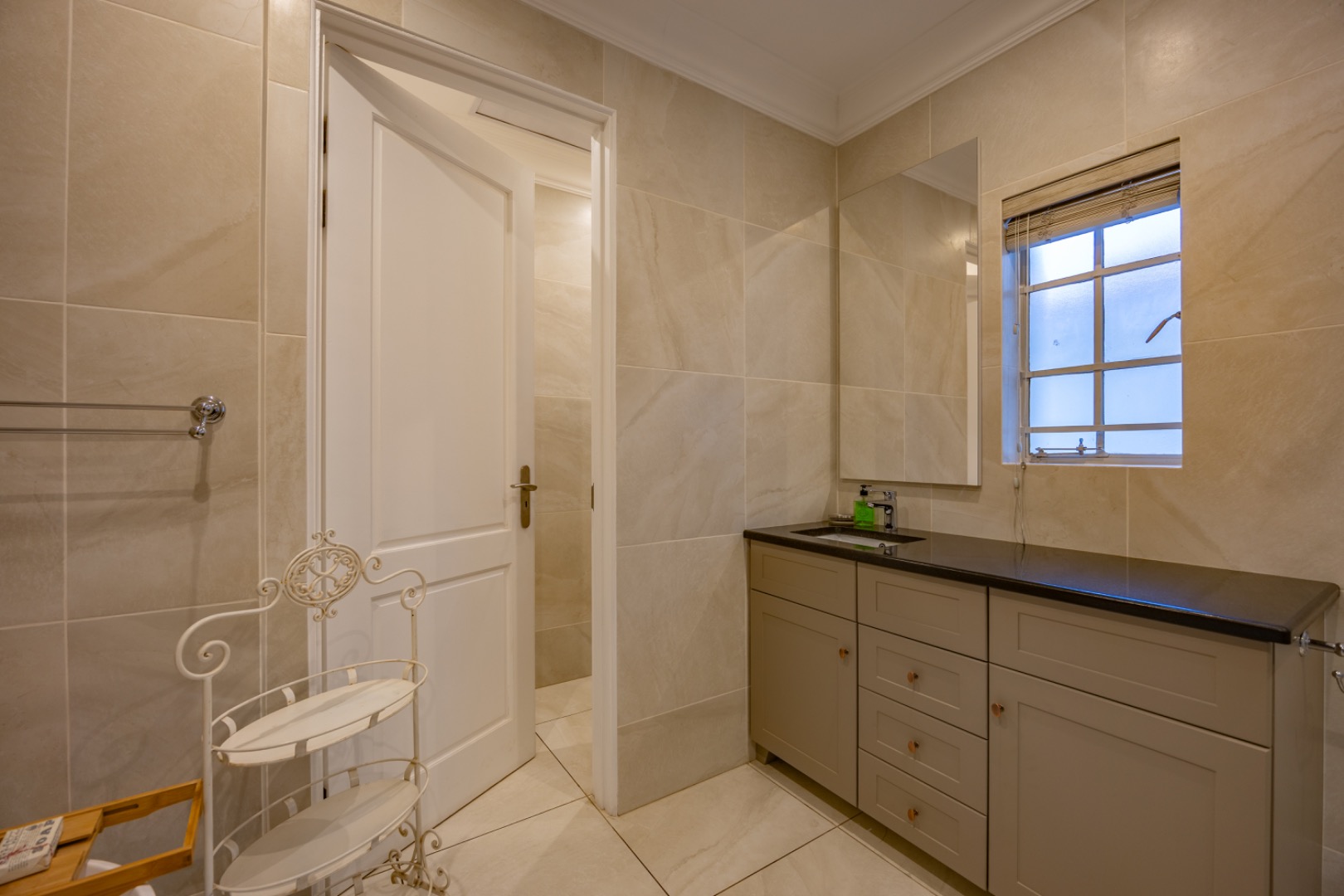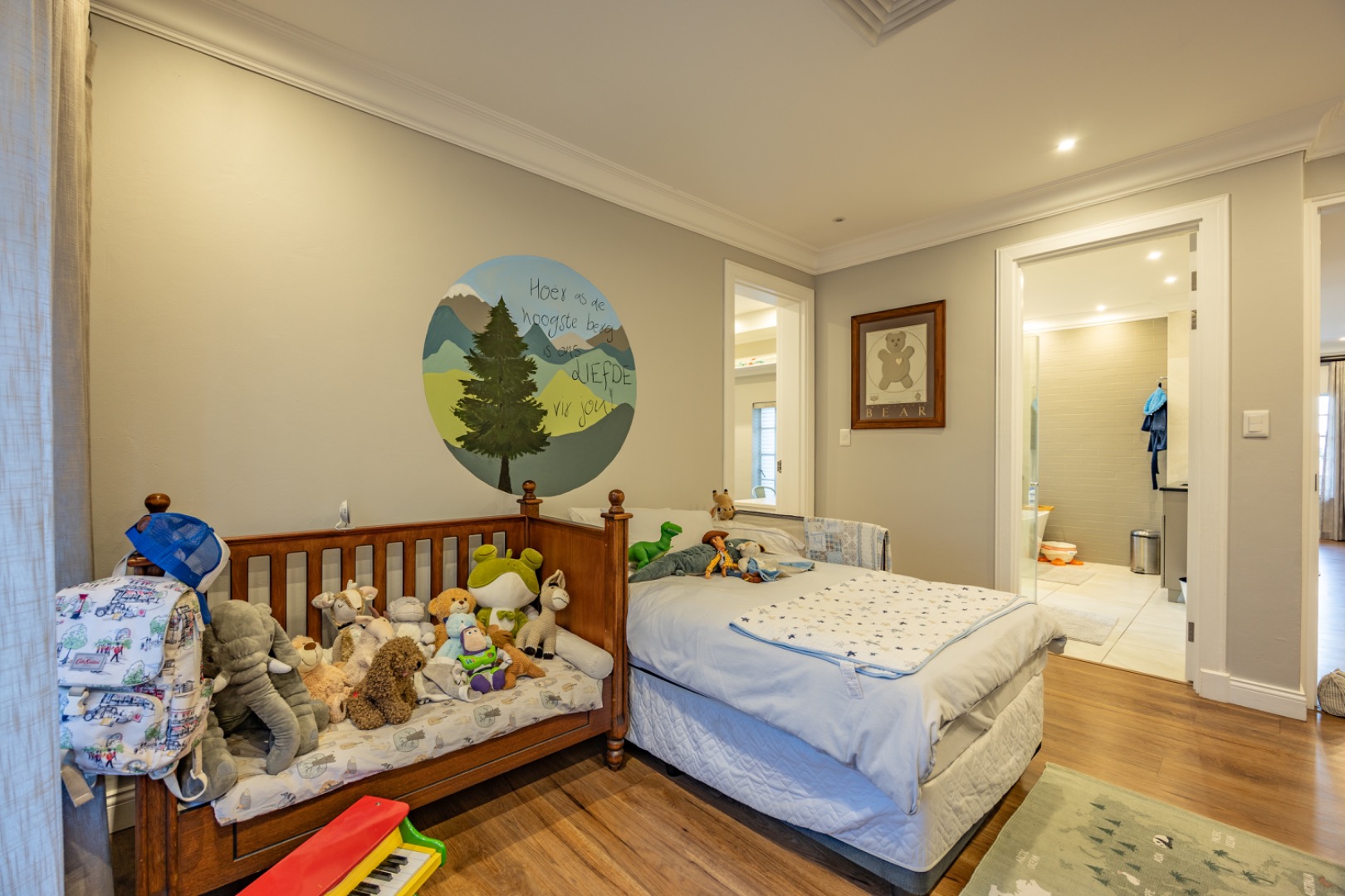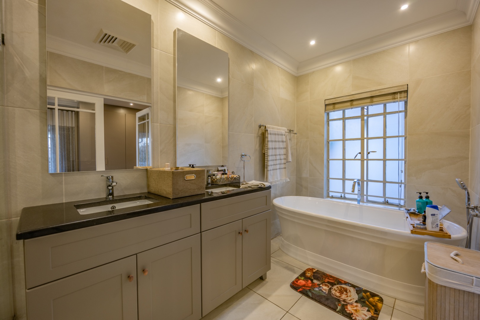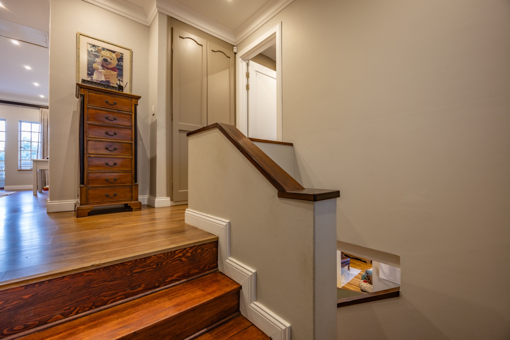 A striking wooden staircase leads you to the upper level, where a pajama lounge with its own balcony creates a relaxed living space for family downtime. Four bedrooms are positioned upstairs, all ensuite for ultimate comfort. The main bedroom is a true sanctuary, featuring a luxurious full bathroom, ample built-in cupboards, and a wraparound balcony with sweeping views. The additional bedrooms are equally well-appointed, each offering full bathrooms and generous cupboard space. One of the bedrooms also boasts a private dressing room and vanity, creating a boutique-style retreat.