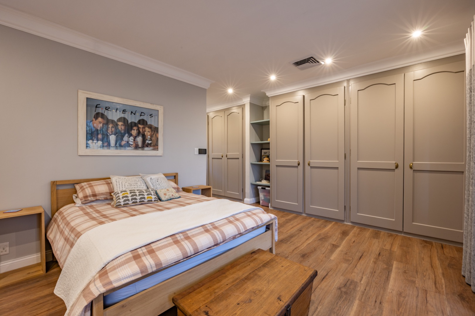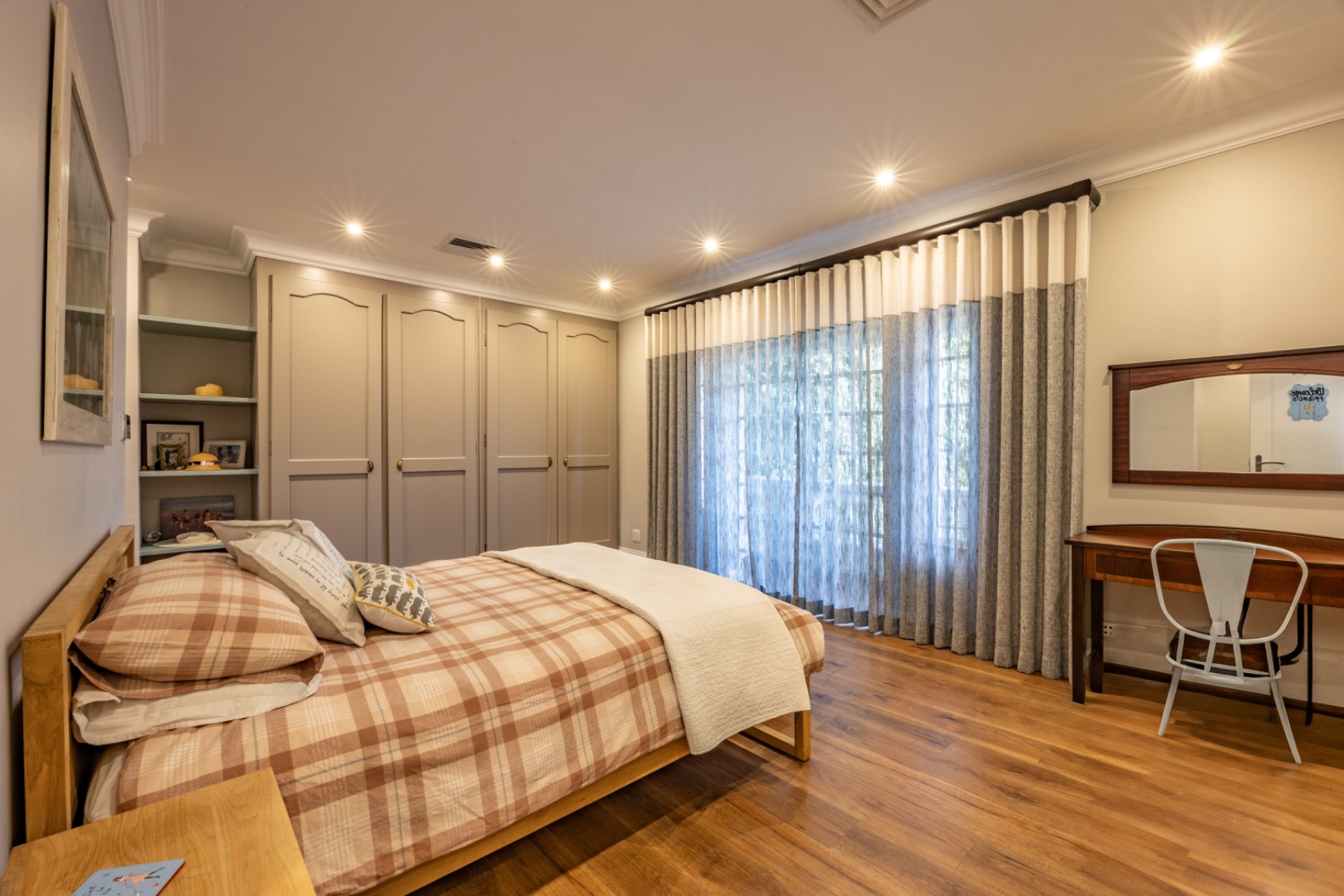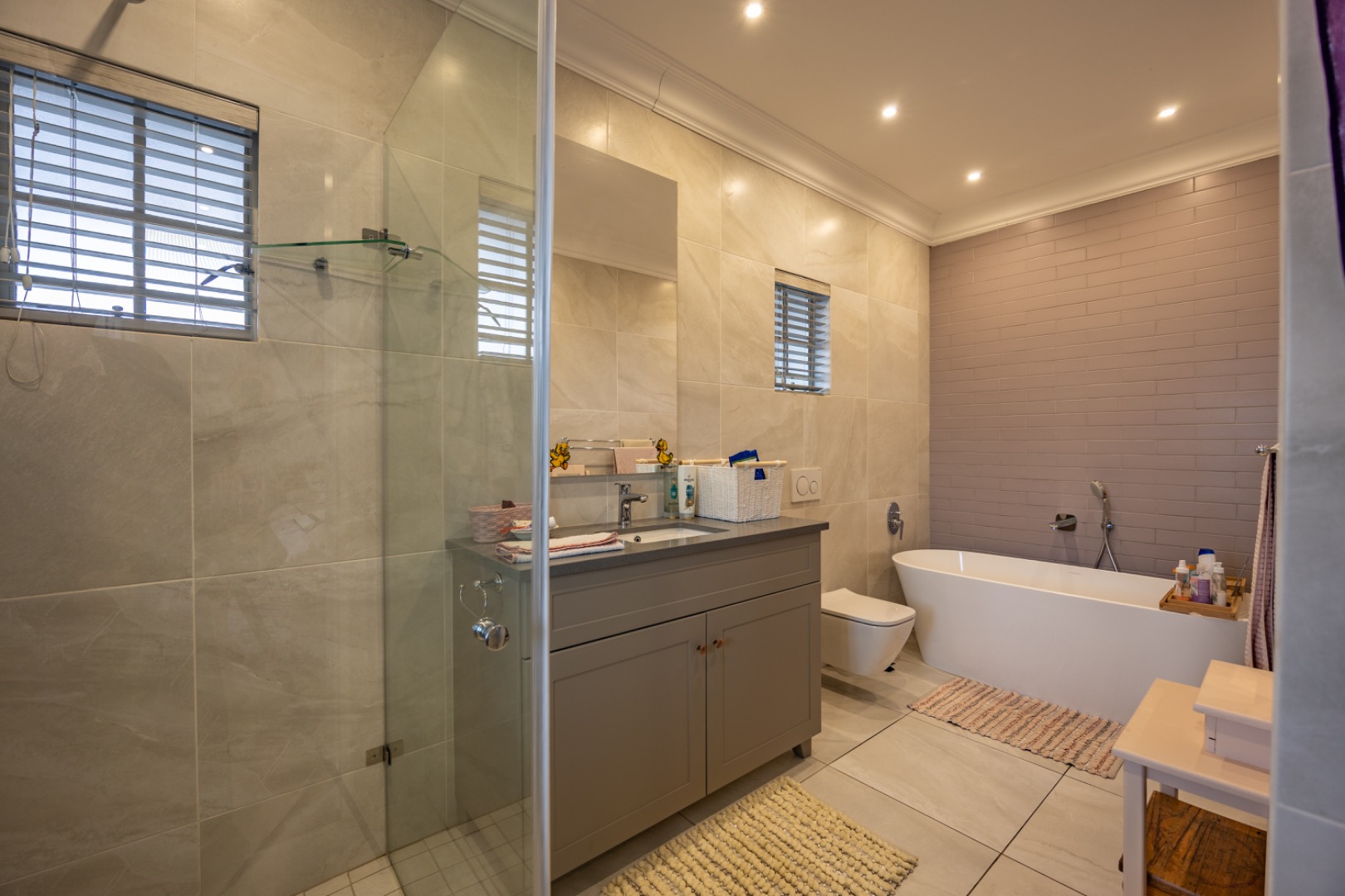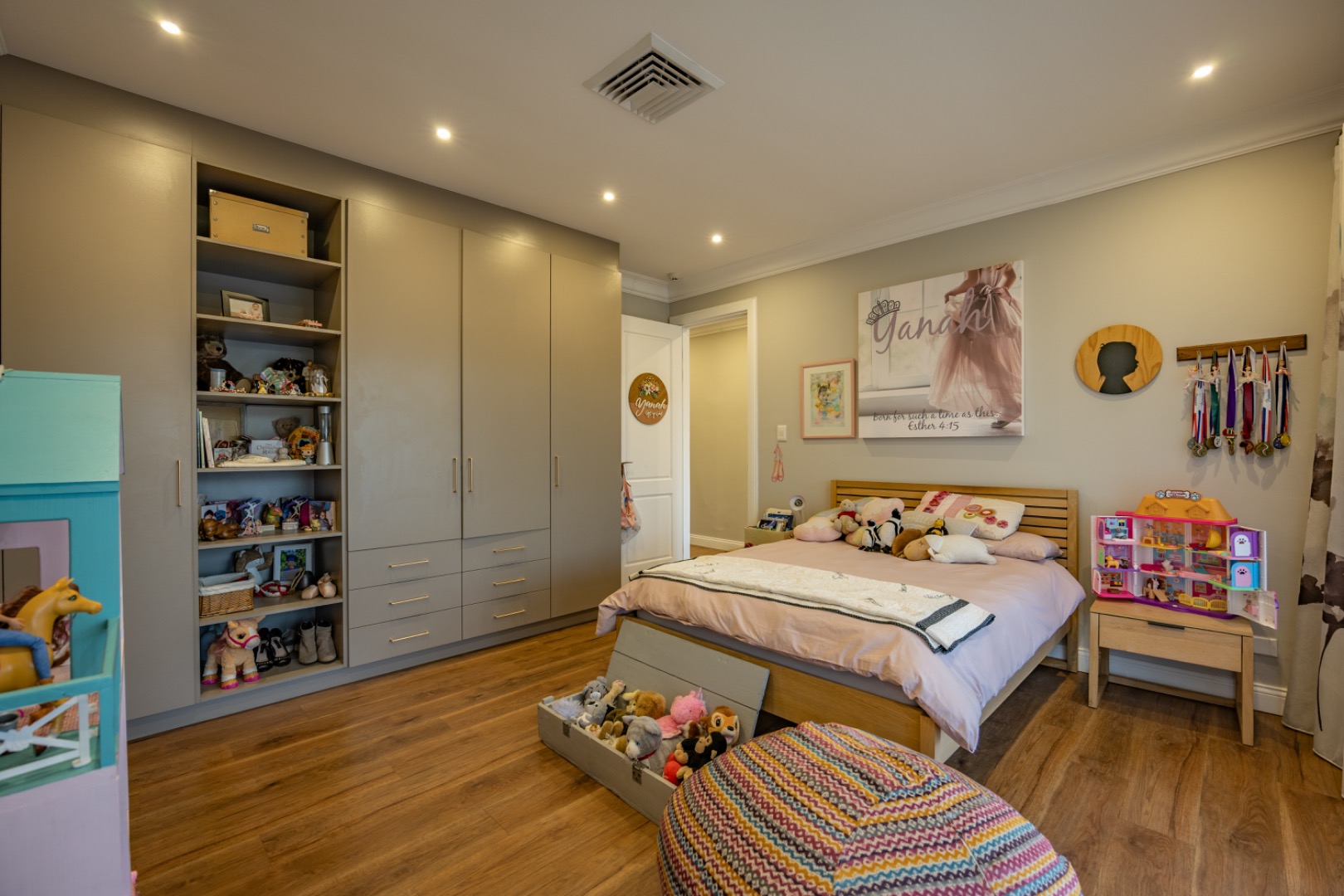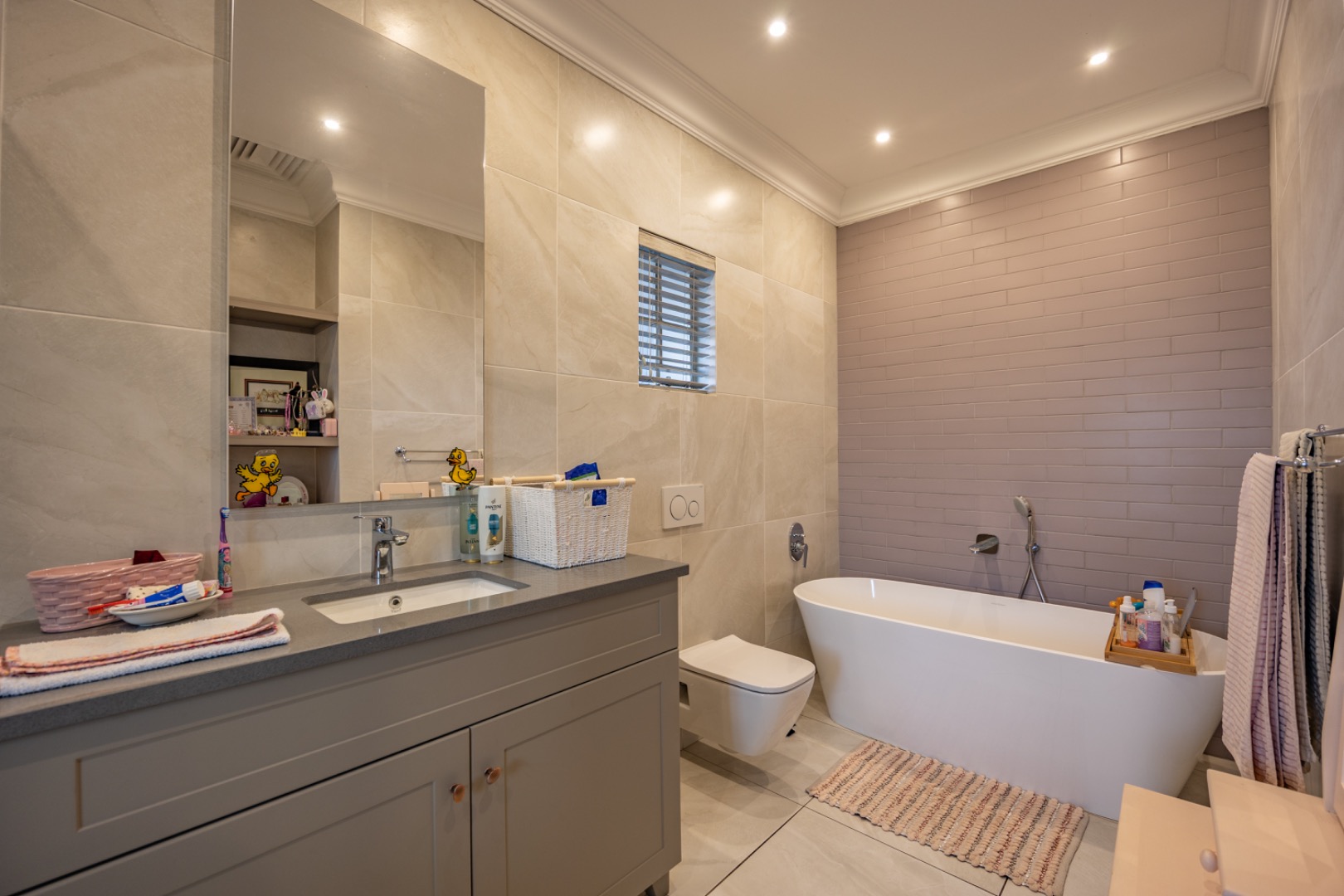 A striking wooden staircase leads you to the upper level, where a pajama lounge with its own balcony creates a relaxed living space for family downtime. Four bedrooms are positioned upstairs, all ensuite for ultimate comfort. The main bedroom is a true sanctuary, featuring a luxurious full bathroom, ample built-in cupboards, and a wraparound balcony with sweeping views. The additional bedrooms are equally well-appointed, each offering full bathrooms and generous cupboard space. One of the bedrooms also boasts a private dressing room and vanity, creating a boutique-style retreat.