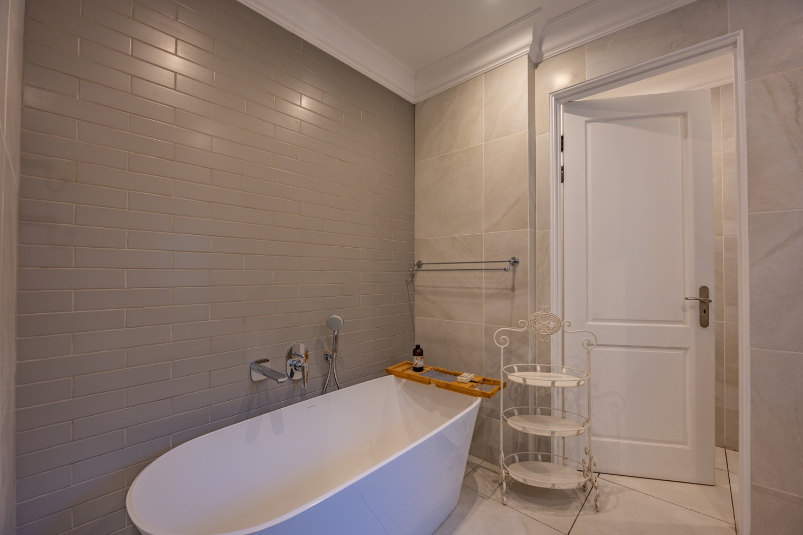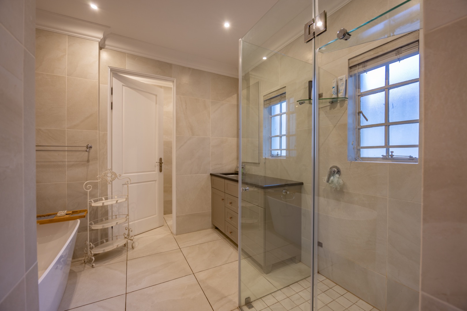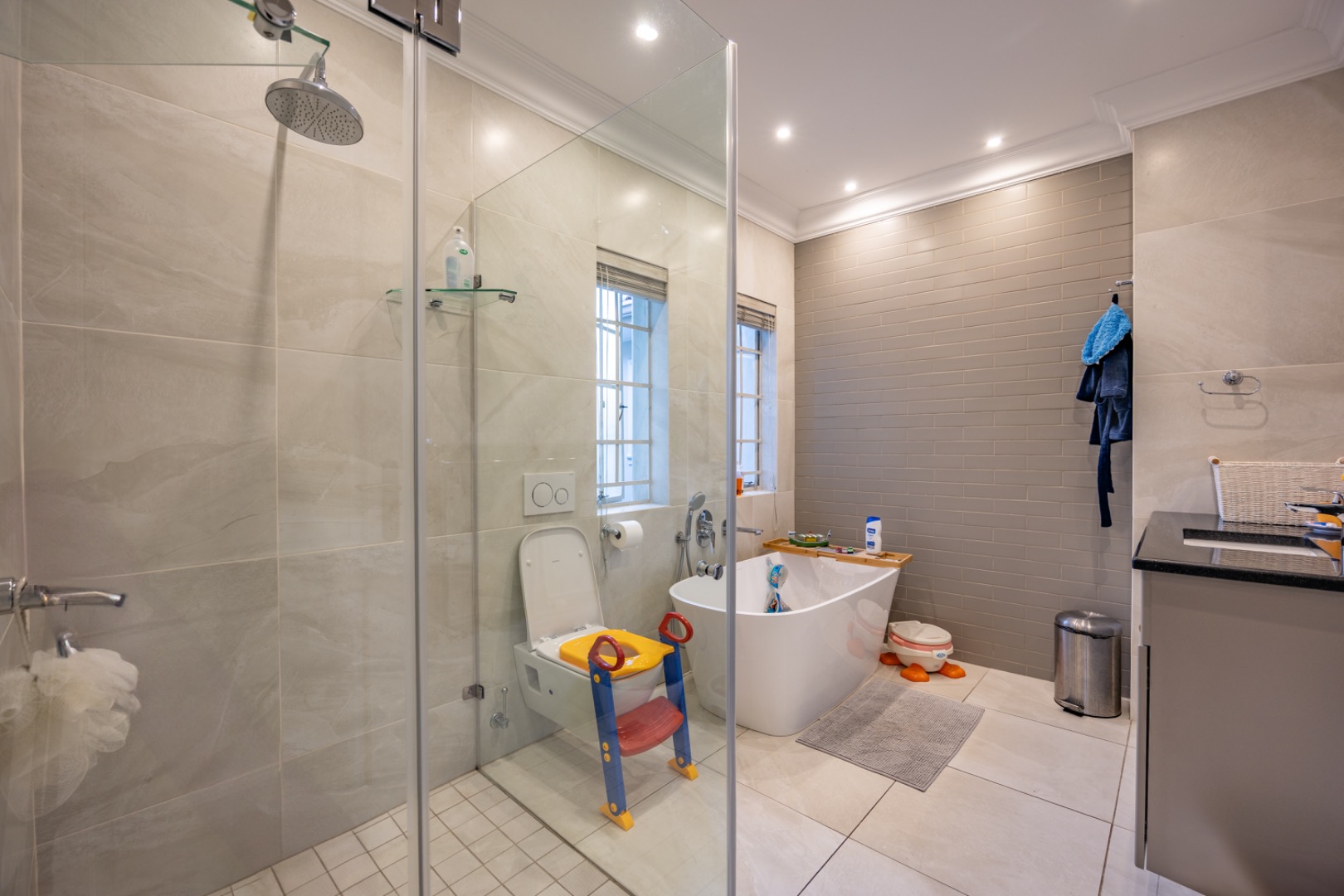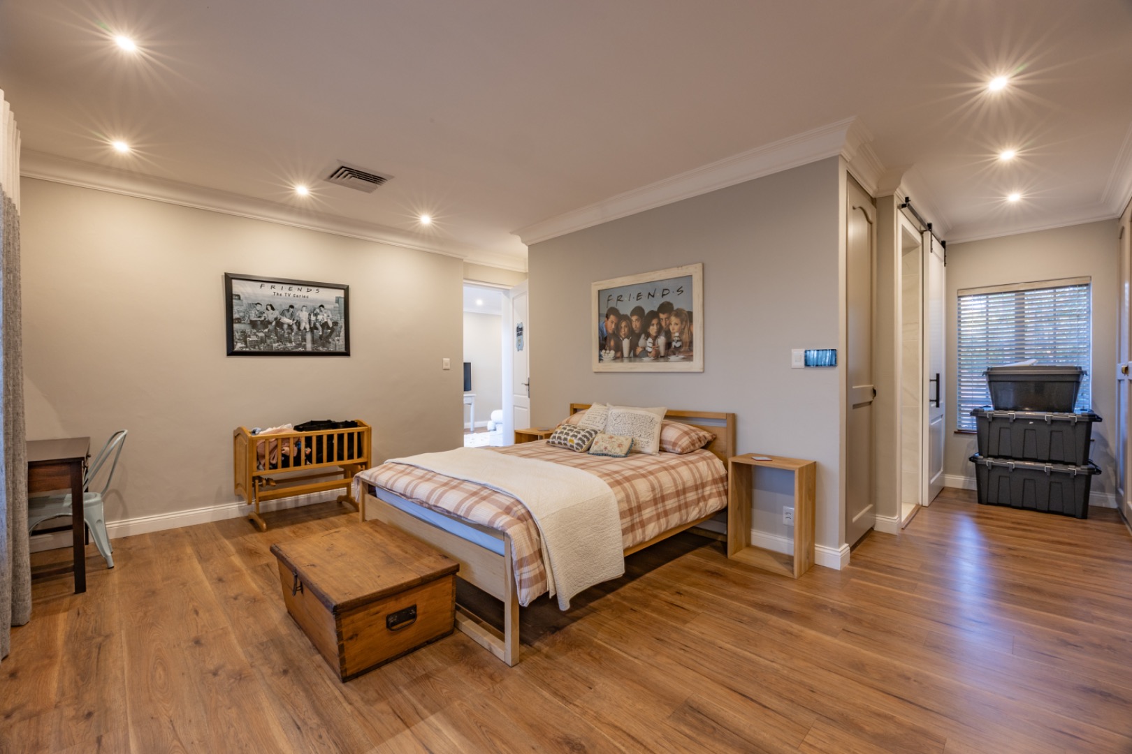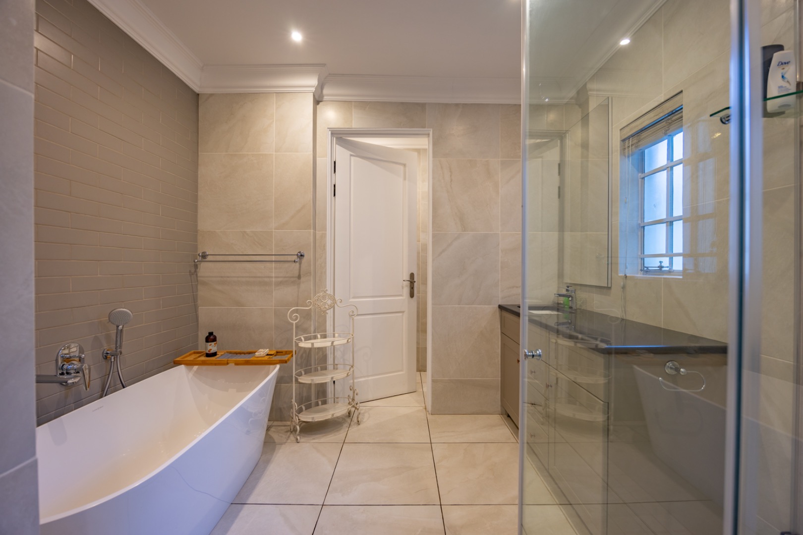 A striking wooden staircase leads you to the upper level, where a pajama lounge with its own balcony creates a relaxed living space for family downtime. Four bedrooms are positioned upstairs, all ensuite for ultimate comfort. The main bedroom is a true sanctuary, featuring a luxurious full bathroom, ample built-in cupboards, and a wraparound balcony with sweeping views. The additional bedrooms are equally well-appointed, each offering full bathrooms and generous cupboard space. One of the bedrooms also boasts a private dressing room and vanity, creating a boutique-style retreat.