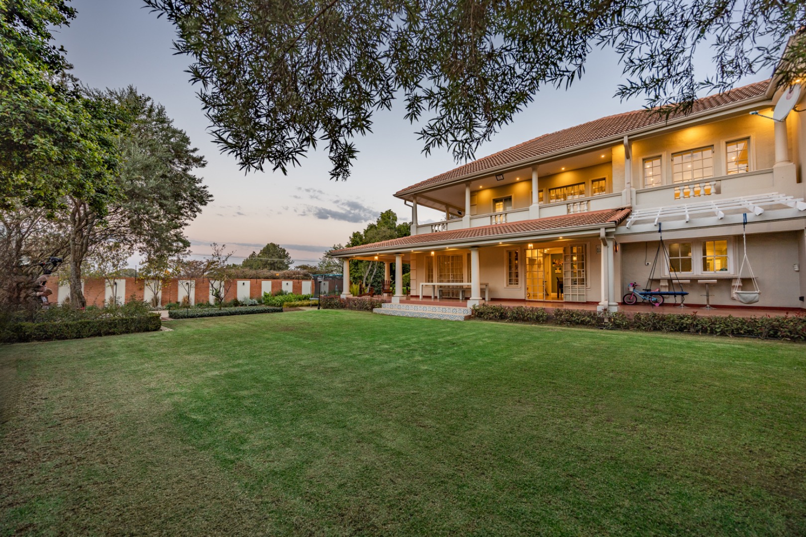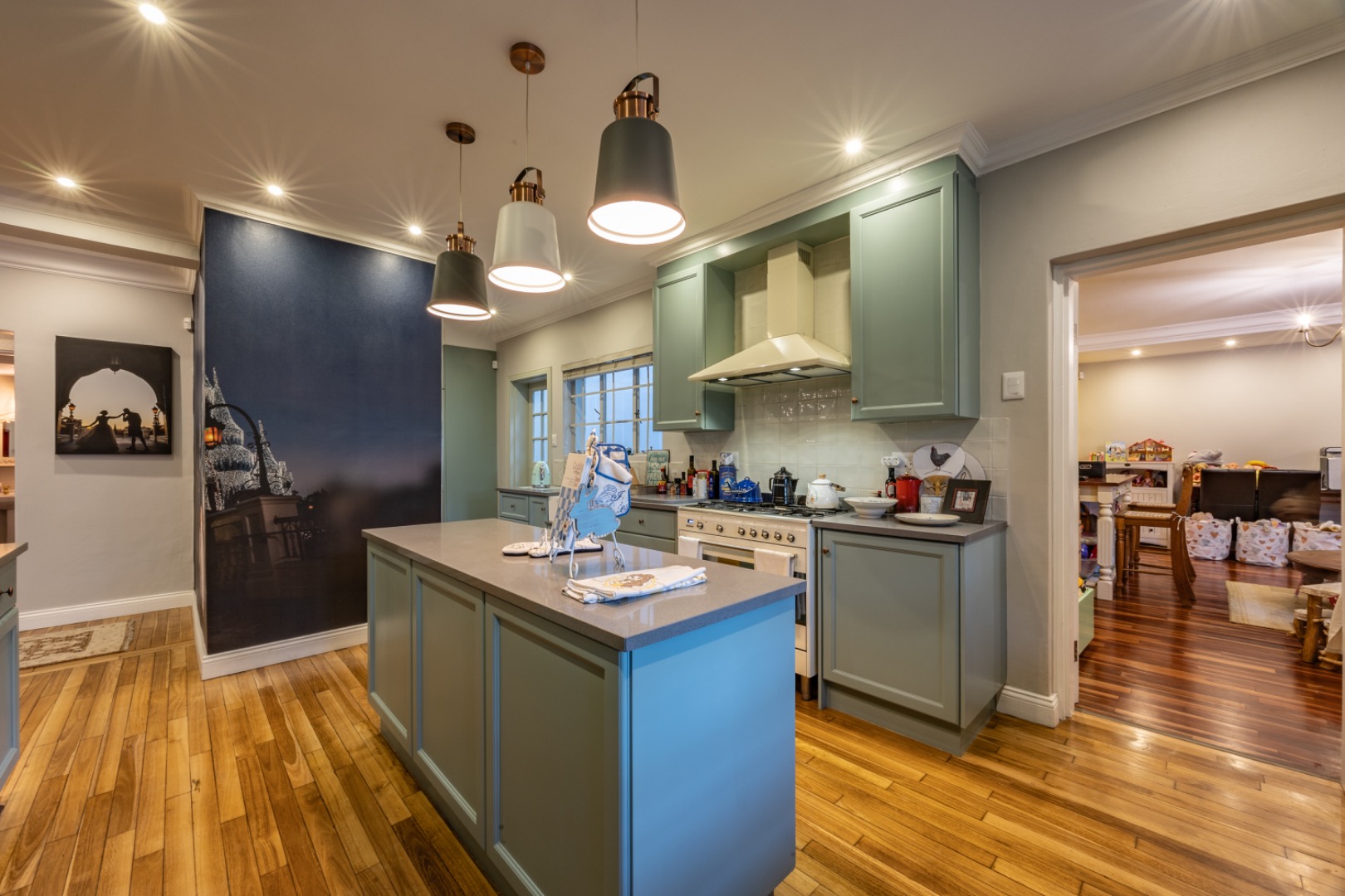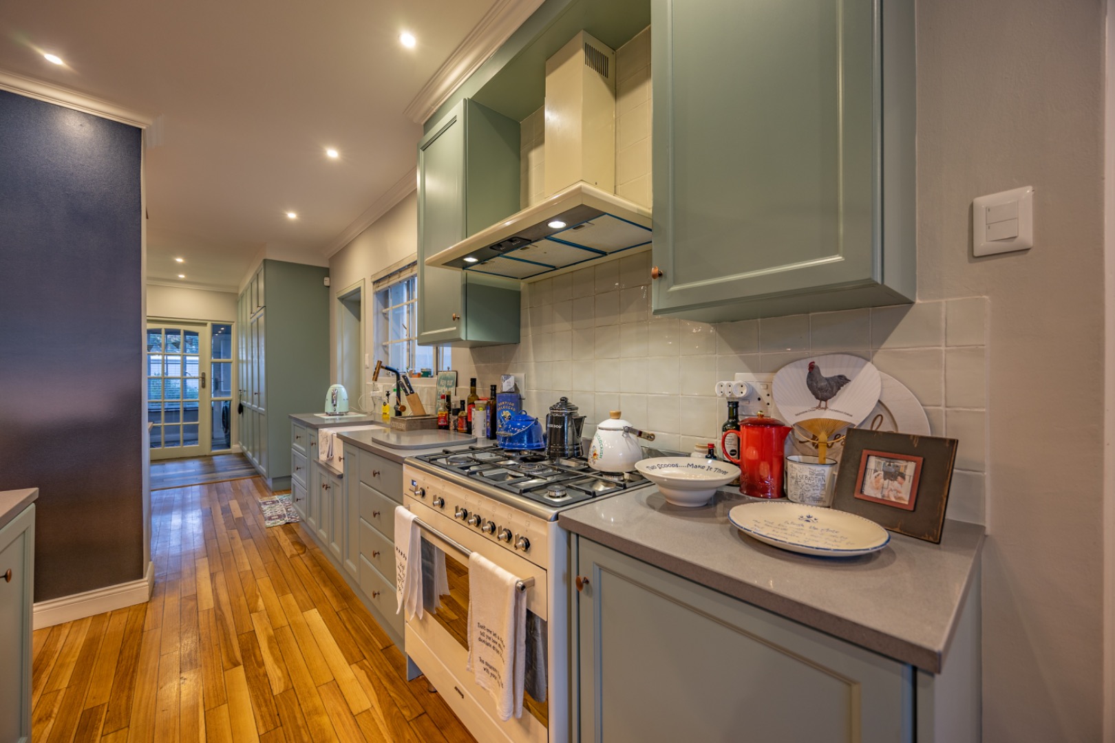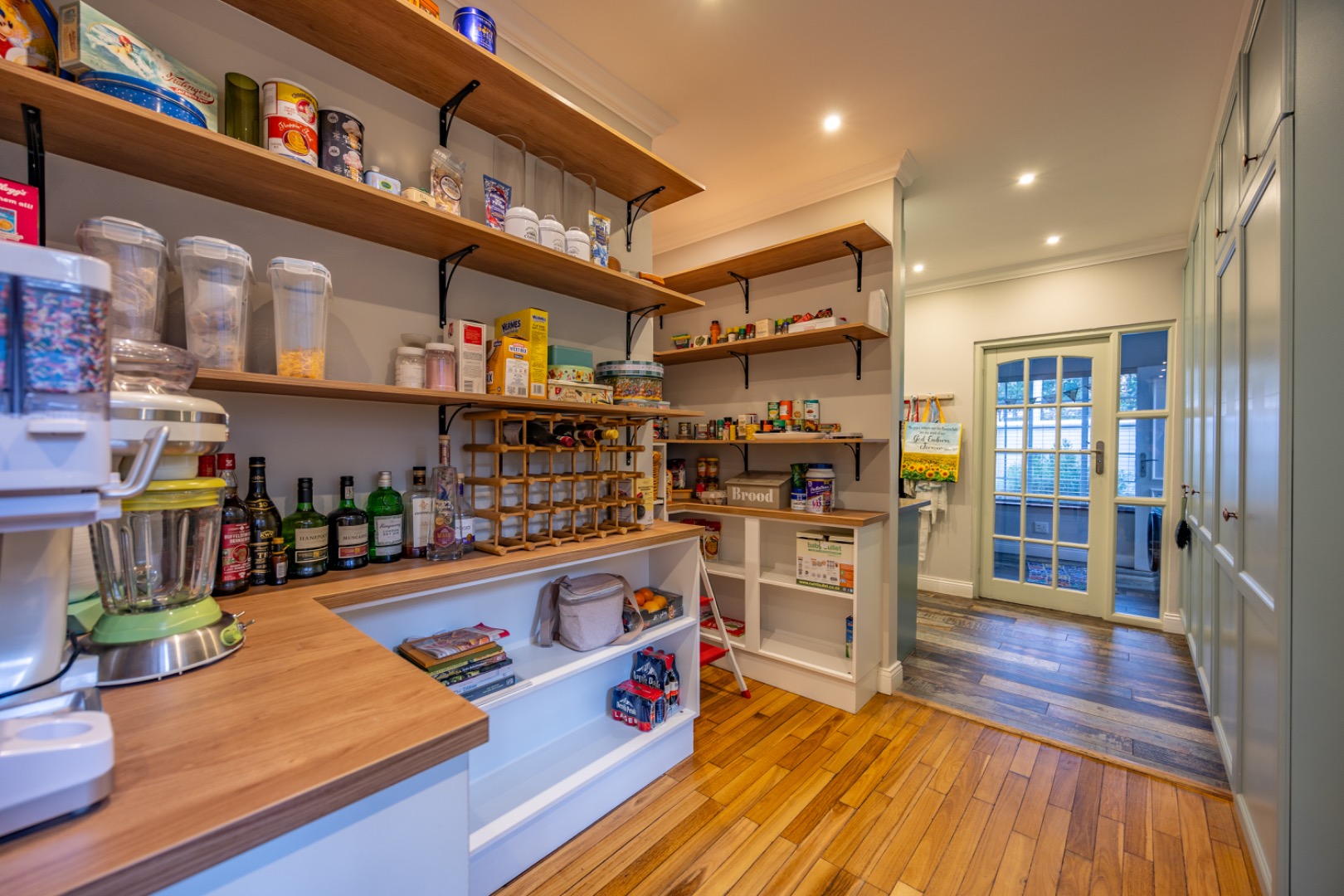 The kitchen is a chef’s delight, fitted with both a Smeg gas oven and an electric oven, offering versatility for all culinary needs. It is further enhanced by a spacious scullery, a walk-in pantry, and a separate laundry room, ensuring that every practical requirement of family living is met with ease.