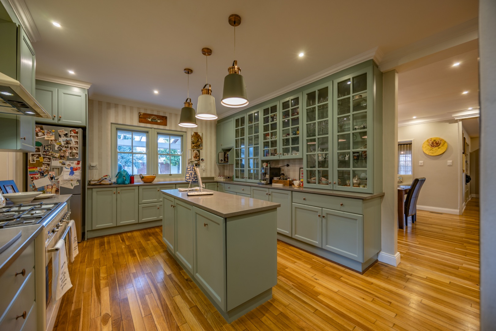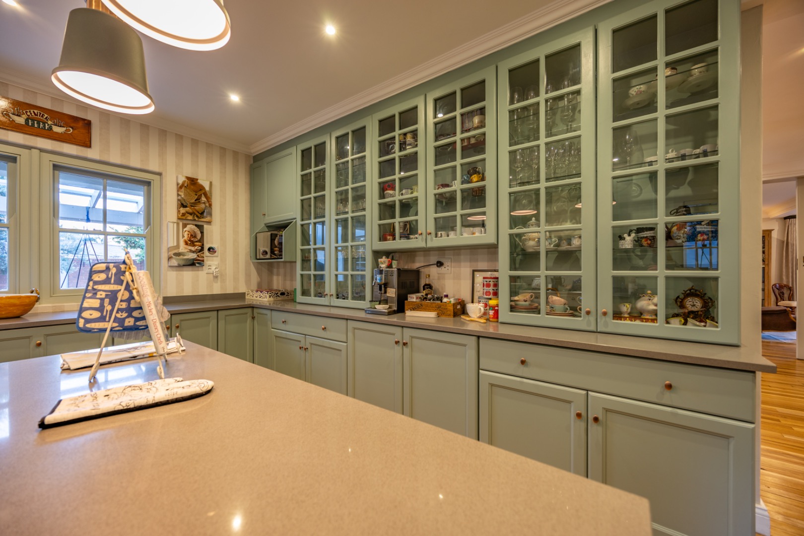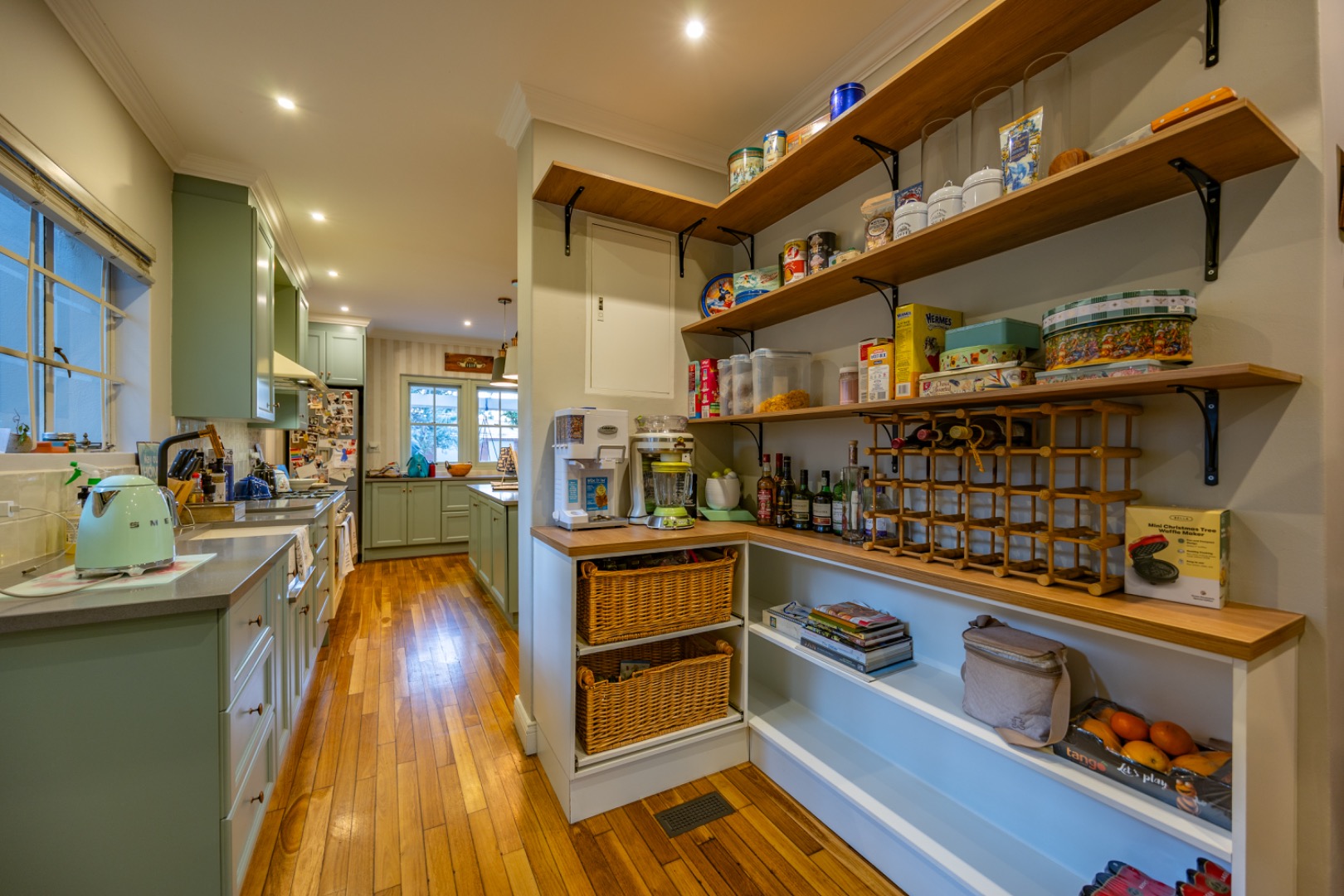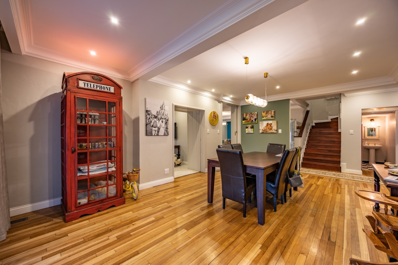 The kitchen is a chef’s delight, fitted with both a Smeg gas oven and an electric oven, offering versatility for all culinary needs. It is further enhanced by a spacious scullery, a walk-in pantry, and a separate laundry room, ensuring that every practical requirement of family living is met with ease.