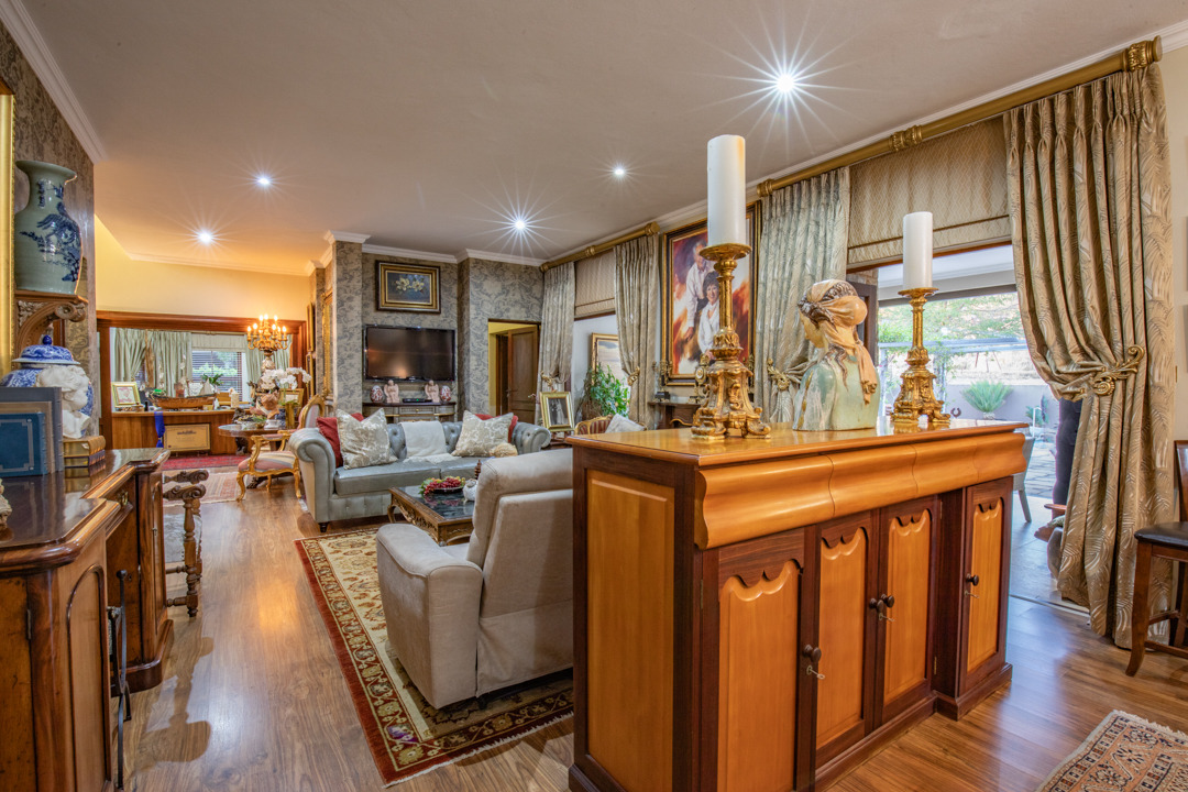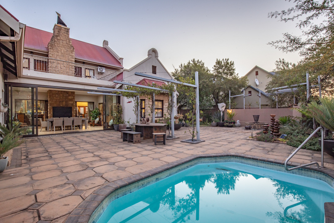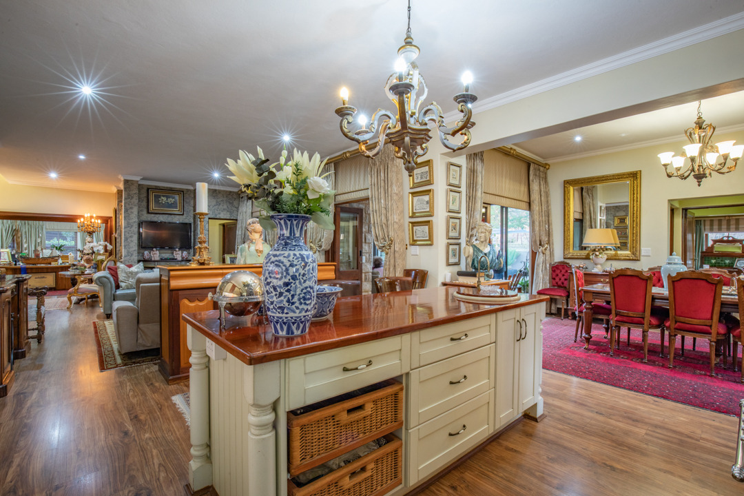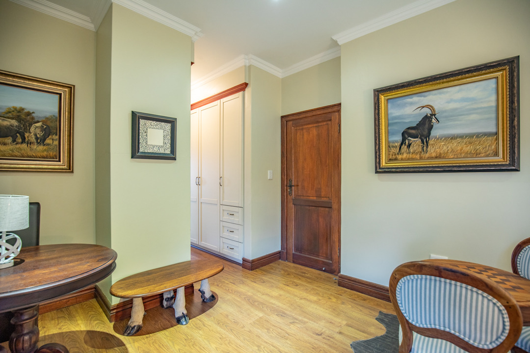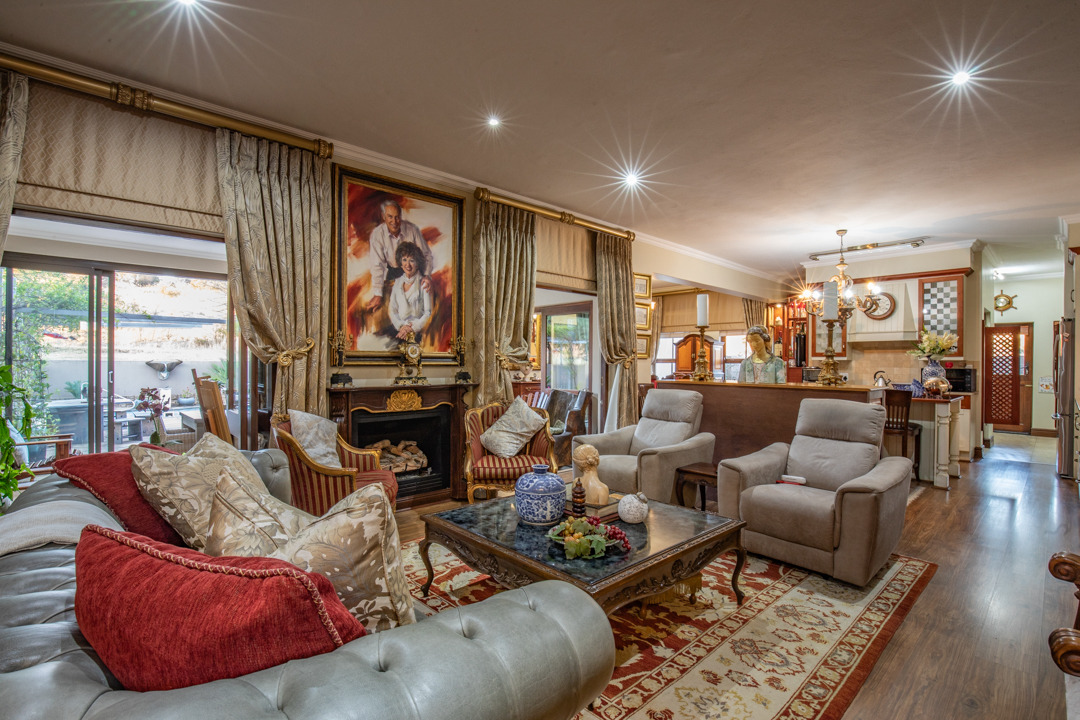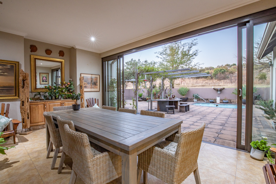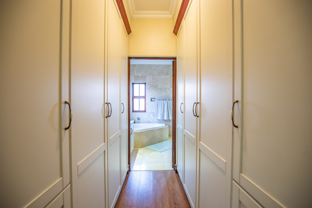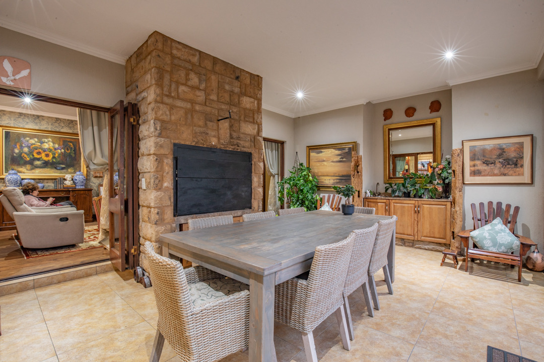 Nestled in the prestigious Waterlake Farm Estate, this beautiful 4-bedroom home perfectly balances modern luxury with serene natural surroundings. The ground floor features a spacious study with built-in shelves, laminate floors, sliding wooden doors, and air conditioning, as well as a stylish guest room with built-in cupboards, double-volume ceilings, and its own full bathroom. The open-plan living area is ideal for gatherings, with a gas fireplace and seamless flow into the kitchen, which boasts rosewood countertops, a gas stove, electric oven, prep bowl with a filter, and space for a double fridge. A separate scullery with pantry, granite countertops, and space for three appliances leads to the courtyard, while the dining area, enhanced by a built-in rosewood bar, adds warmth and charm.
