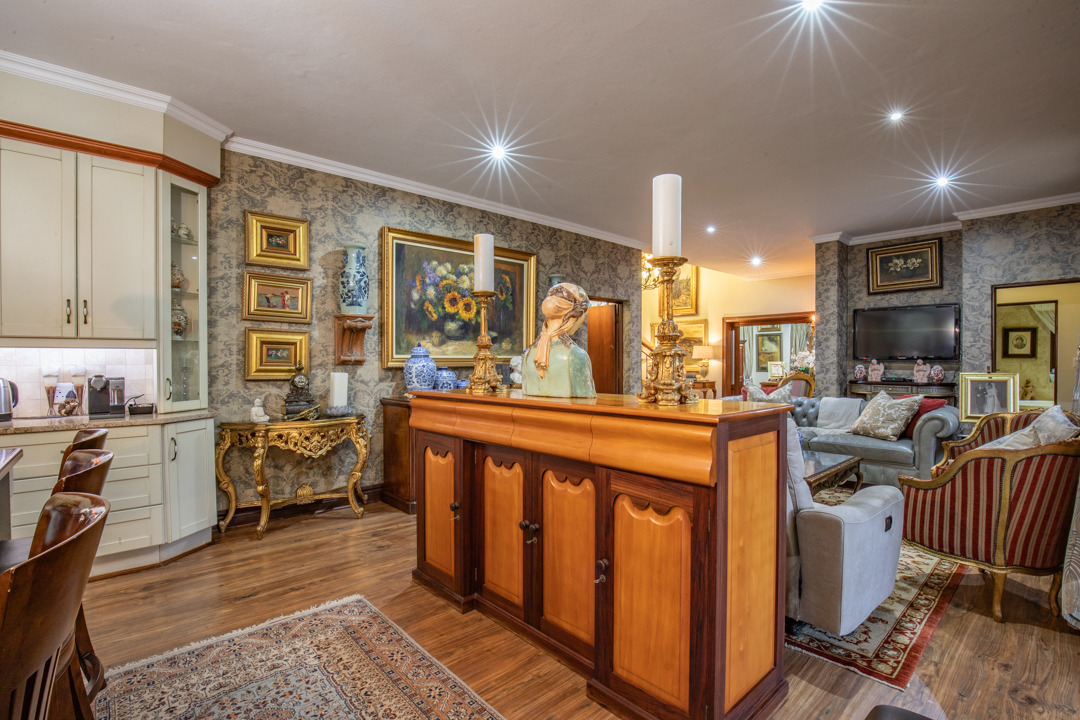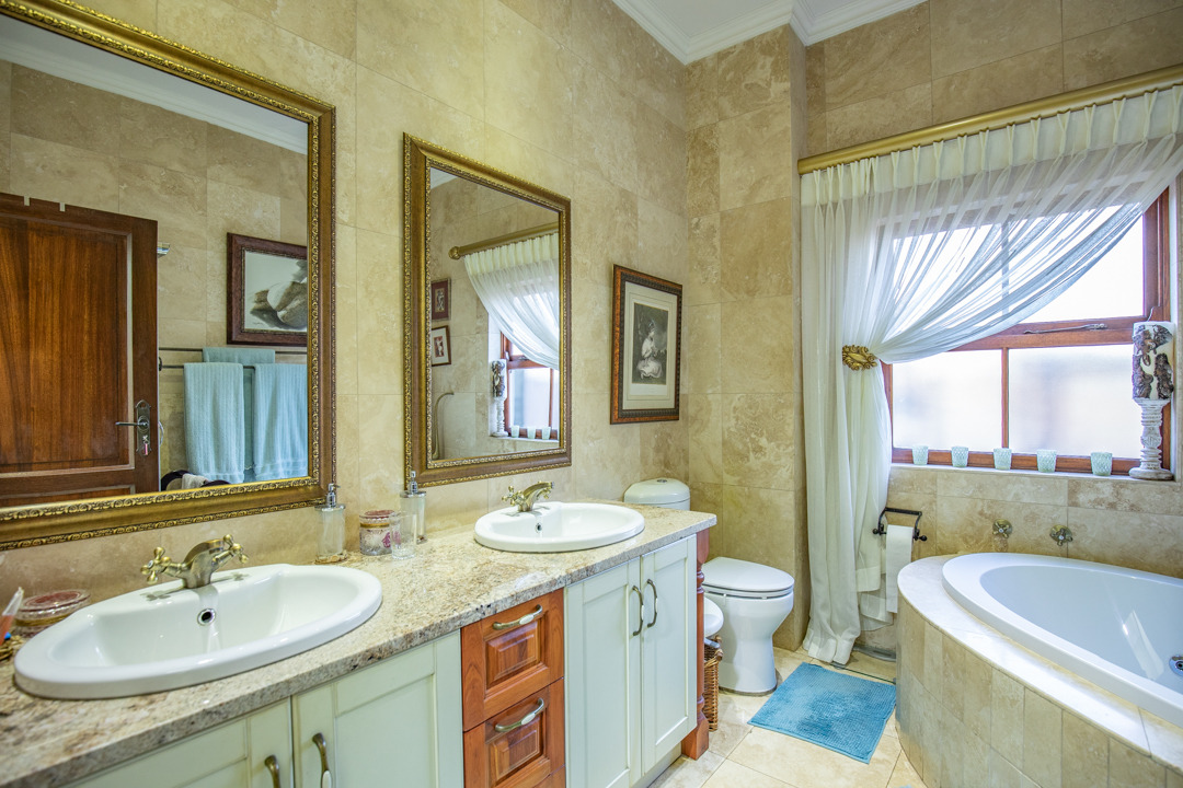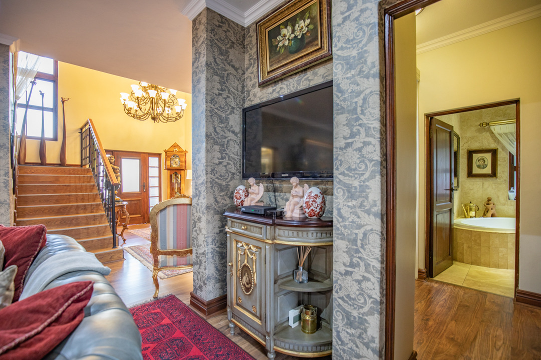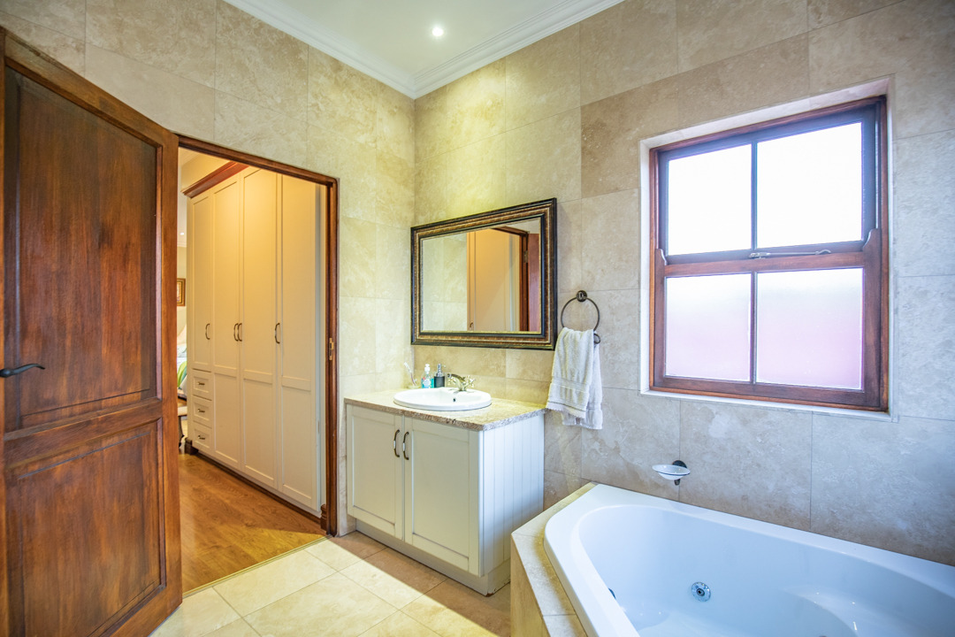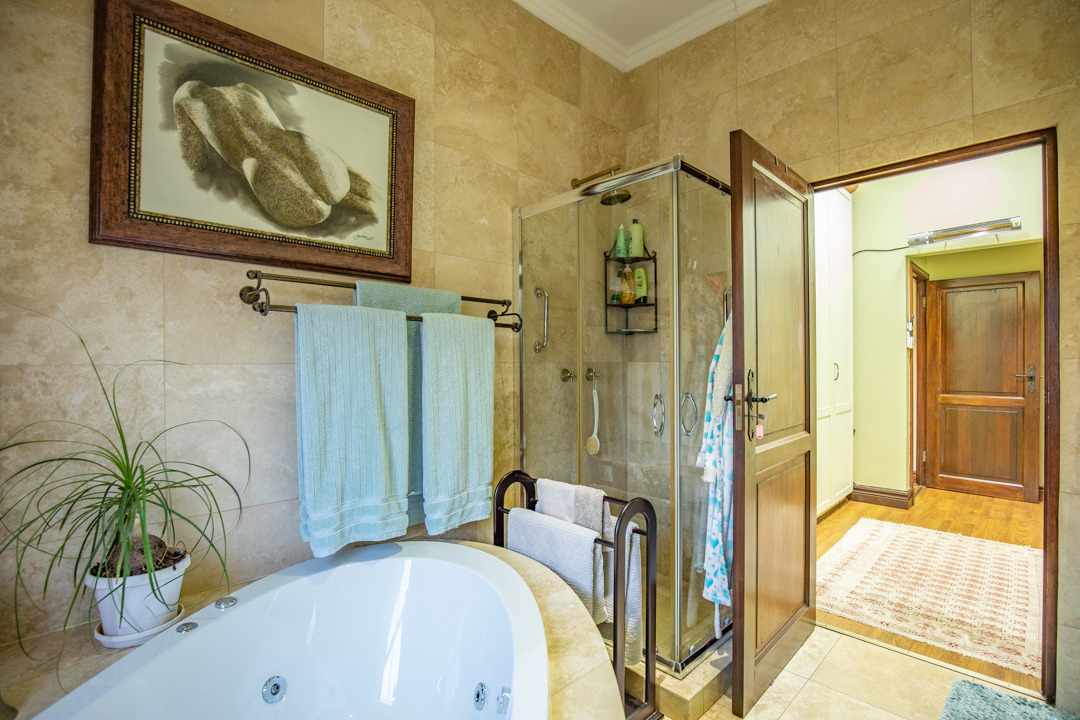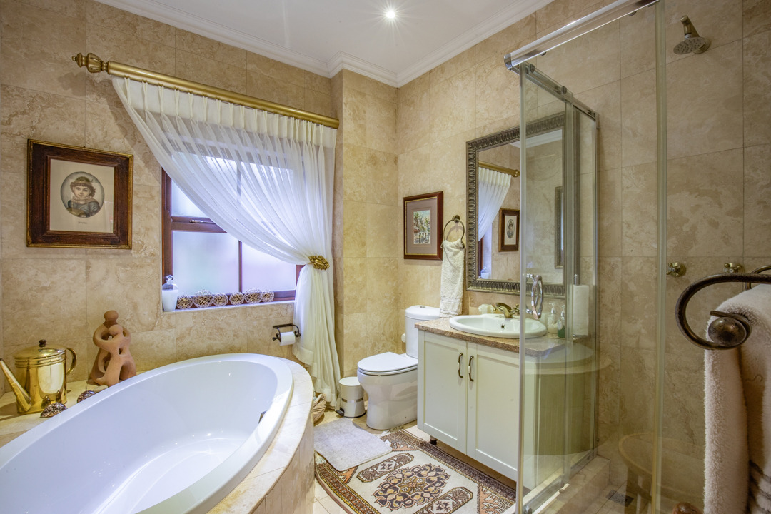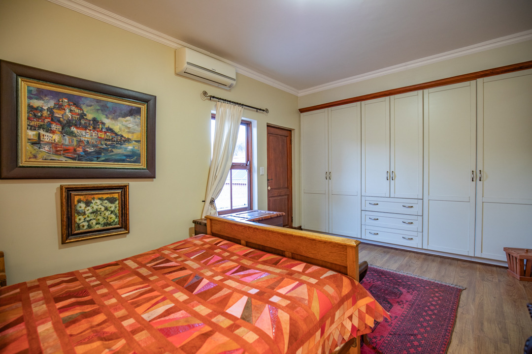 Nestled in the prestigious Waterlake Farm Estate, this beautiful 4-bedroom home perfectly balances modern luxury with serene natural surroundings. The ground floor features a spacious study with built-in shelves, laminate floors, sliding wooden doors, and air conditioning, as well as a stylish guest room with built-in cupboards, double-volume ceilings, and its own full bathroom. The open-plan living area is ideal for gatherings, with a gas fireplace and seamless flow into the kitchen, which boasts rosewood countertops, a gas stove, electric oven, prep bowl with a filter, and space for a double fridge. A separate scullery with pantry, granite countertops, and space for three appliances leads to the courtyard, while the dining area, enhanced by a built-in rosewood bar, adds warmth and charm.