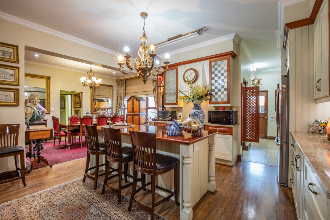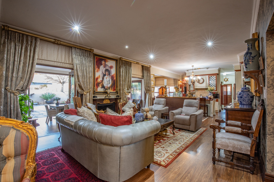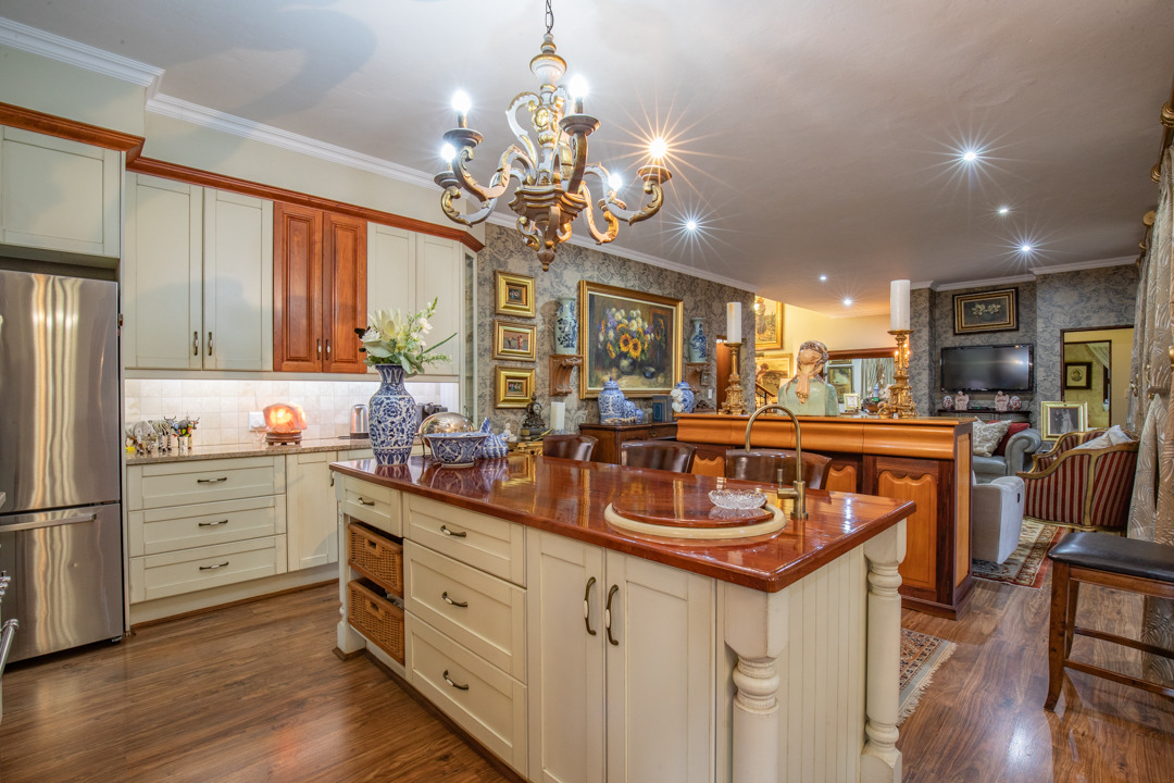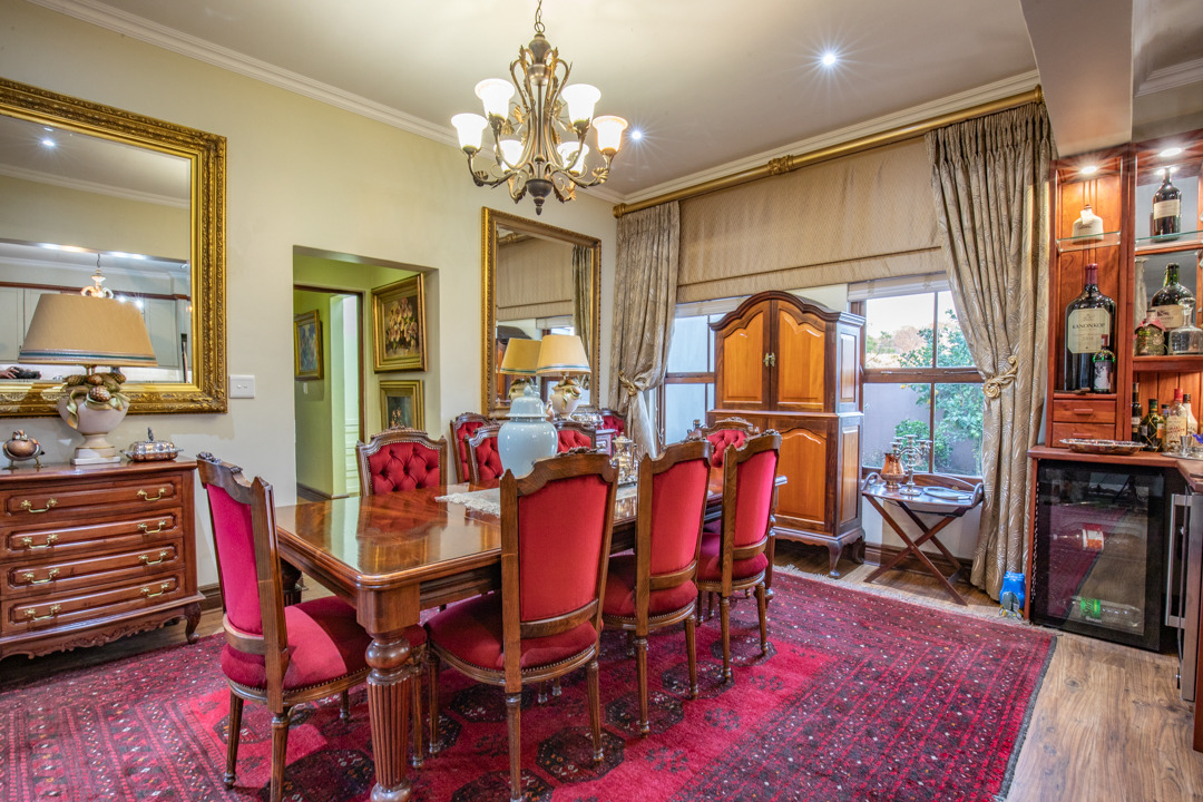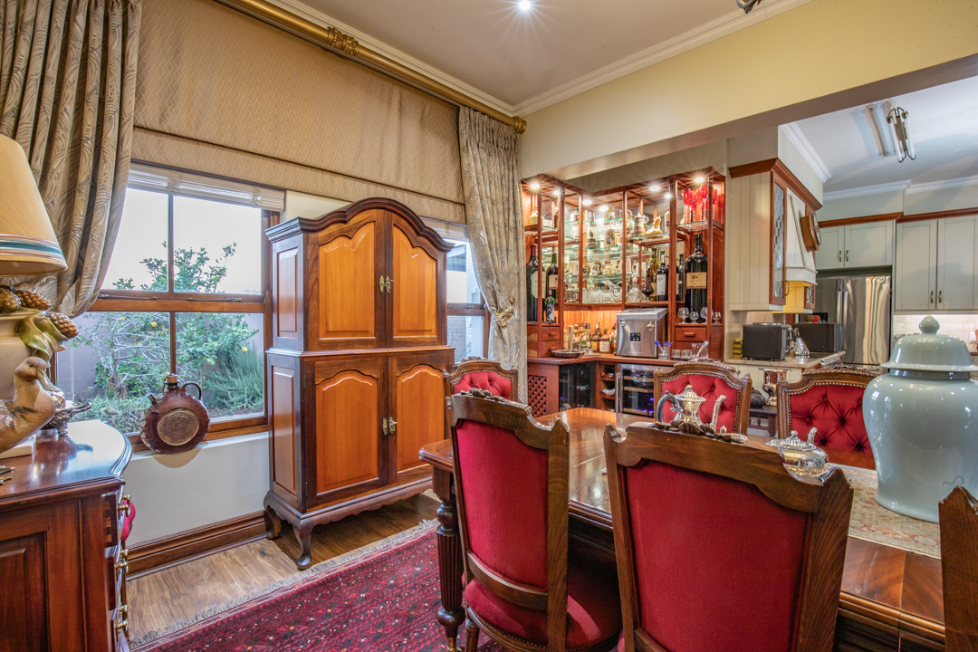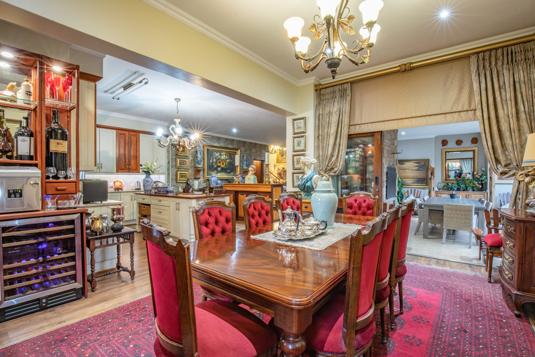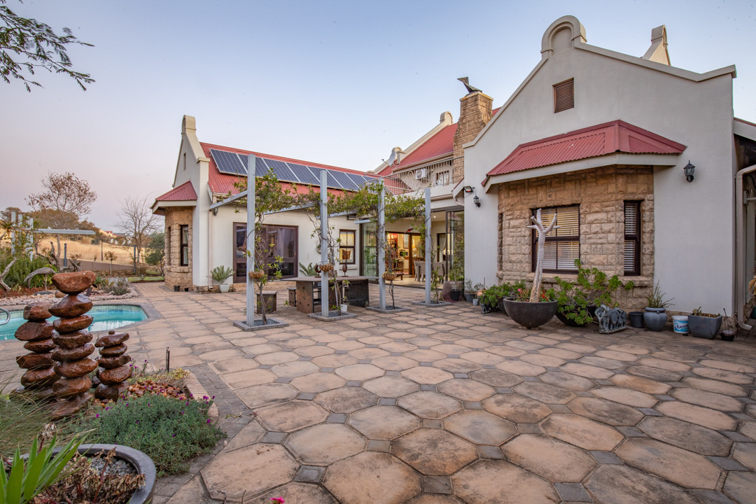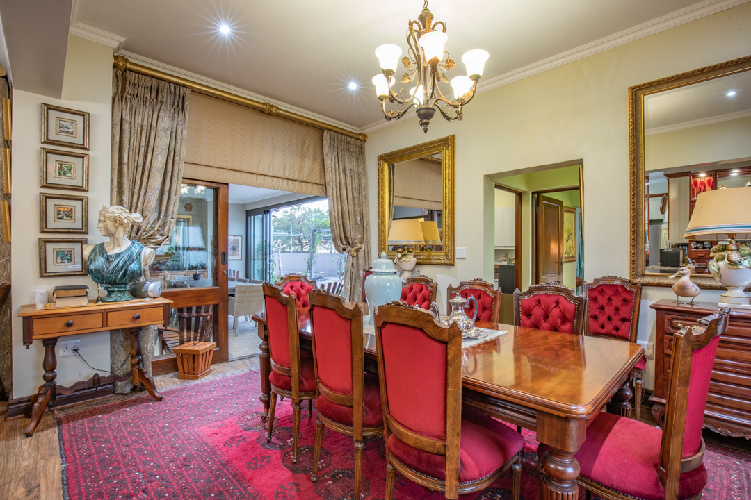 Nestled in the prestigious Waterlake Farm Estate, this beautiful 4-bedroom home perfectly balances modern luxury with serene natural surroundings. The ground floor features a spacious study with built-in shelves, laminate floors, sliding wooden doors, and air conditioning, as well as a stylish guest room with built-in cupboards, double-volume ceilings, and its own full bathroom. The open-plan living area is ideal for gatherings, with a gas fireplace and seamless flow into the kitchen, which boasts rosewood countertops, a gas stove, electric oven, prep bowl with a filter, and space for a double fridge. A separate scullery with pantry, granite countertops, and space for three appliances leads to the courtyard, while the dining area, enhanced by a built-in rosewood bar, adds warmth and charm.
