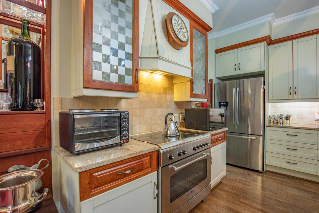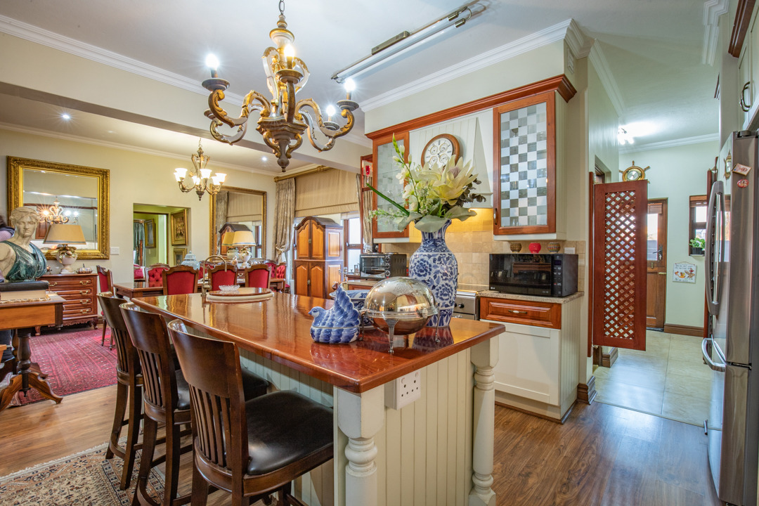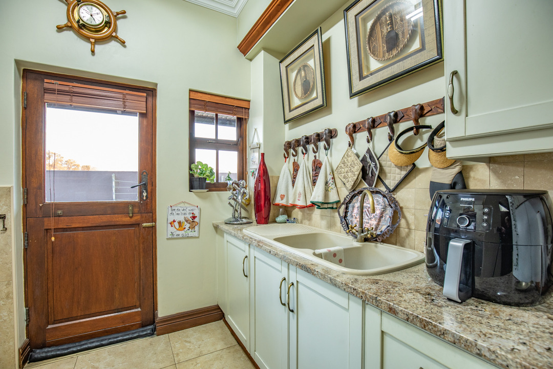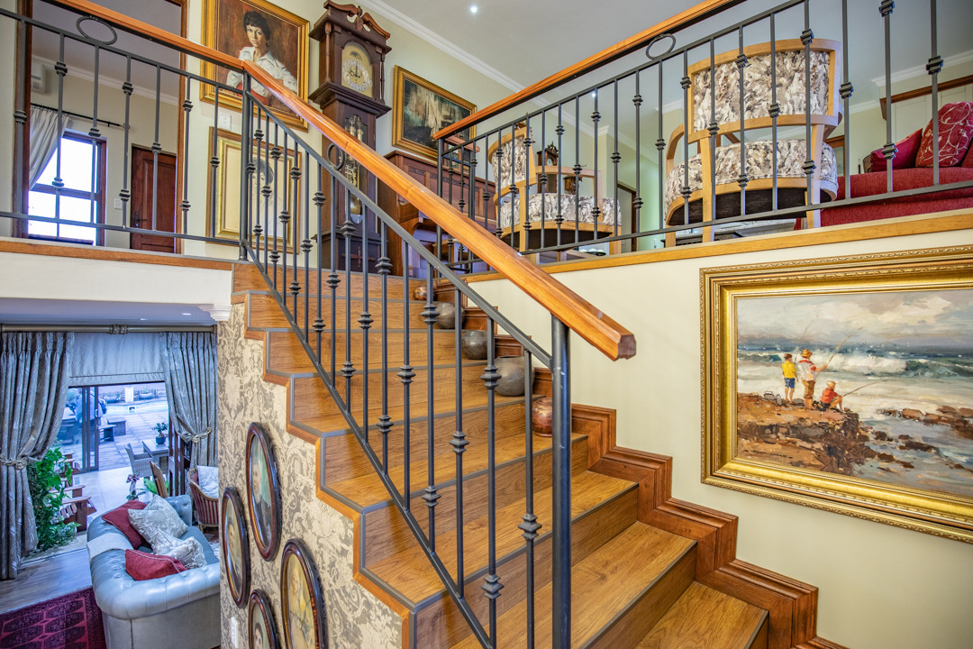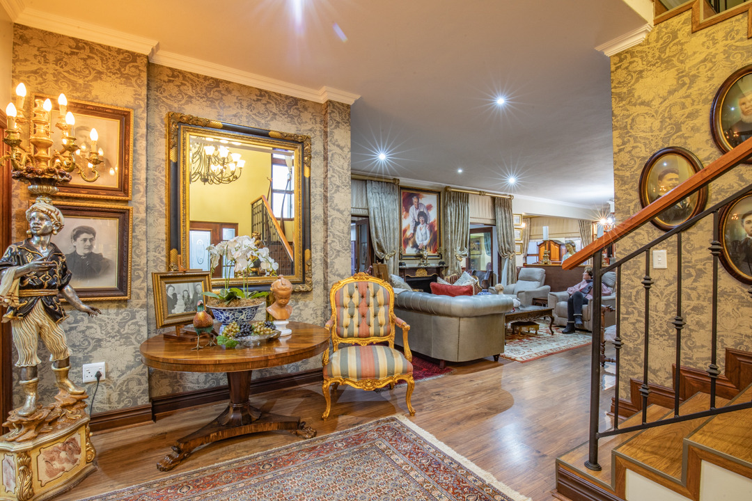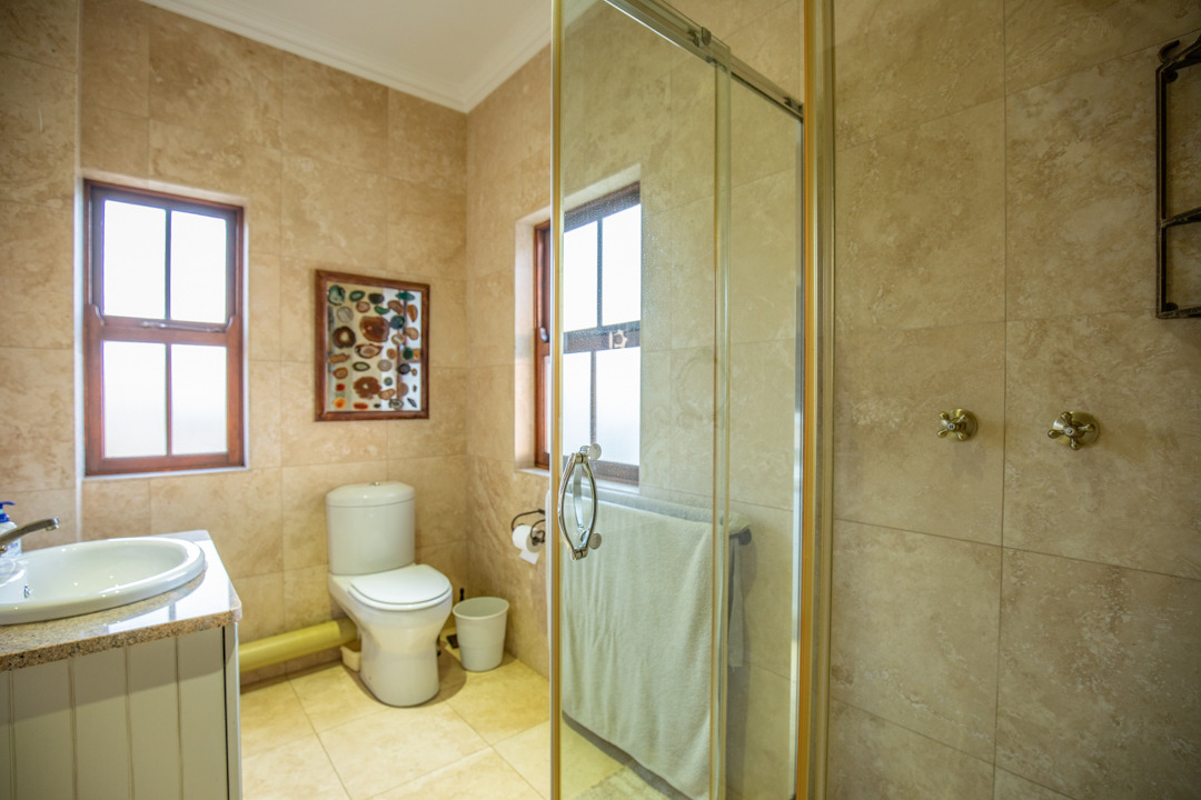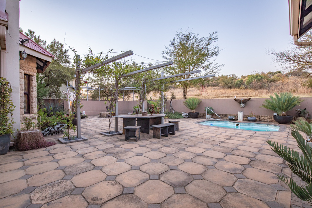 Nestled in the prestigious Waterlake Farm Estate, this beautiful 4-bedroom home perfectly balances modern luxury with serene natural surroundings. The ground floor features a spacious study with built-in shelves, laminate floors, sliding wooden doors, and air conditioning, as well as a stylish guest room with built-in cupboards, double-volume ceilings, and its own full bathroom. The open-plan living area is ideal for gatherings, with a gas fireplace and seamless flow into the kitchen, which boasts rosewood countertops, a gas stove, electric oven, prep bowl with a filter, and space for a double fridge. A separate scullery with pantry, granite countertops, and space for three appliances leads to the courtyard, while the dining area, enhanced by a built-in rosewood bar, adds warmth and charm.