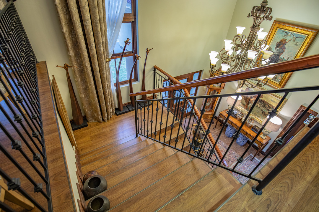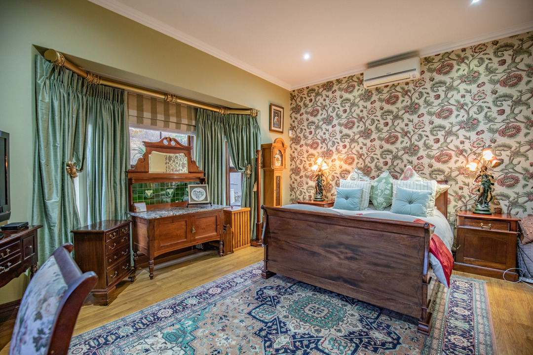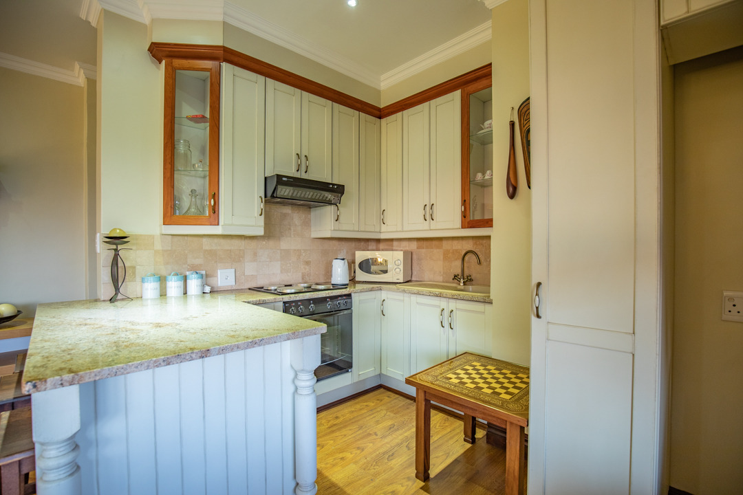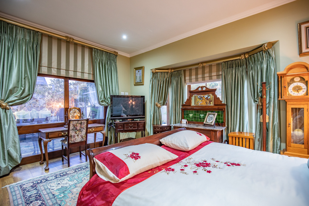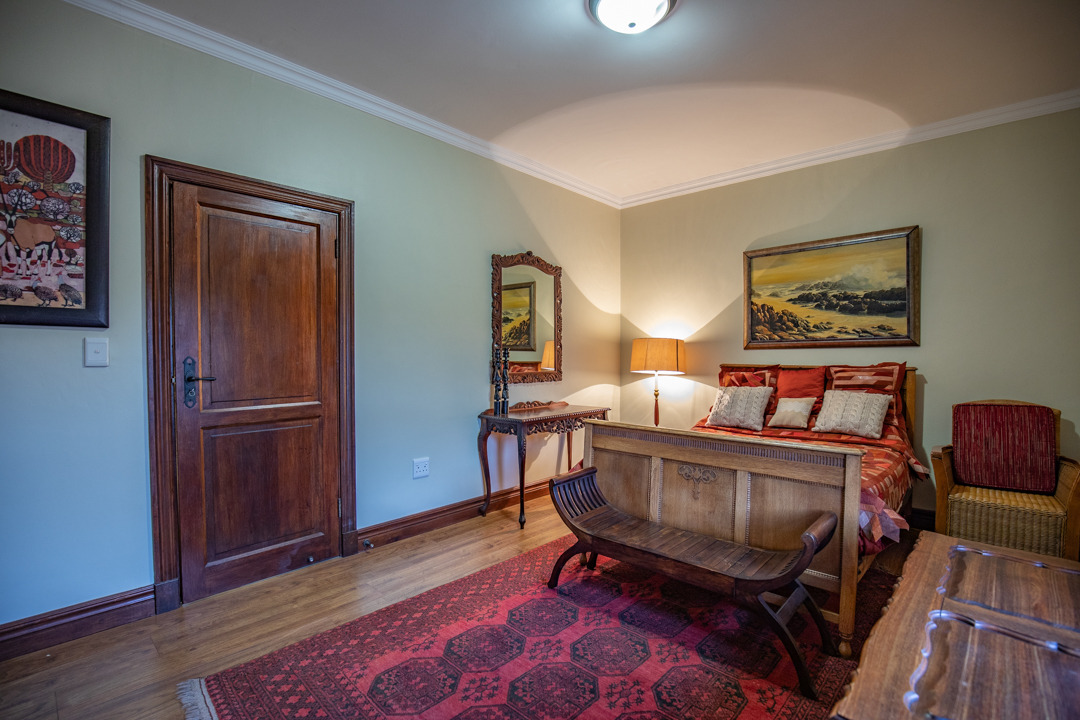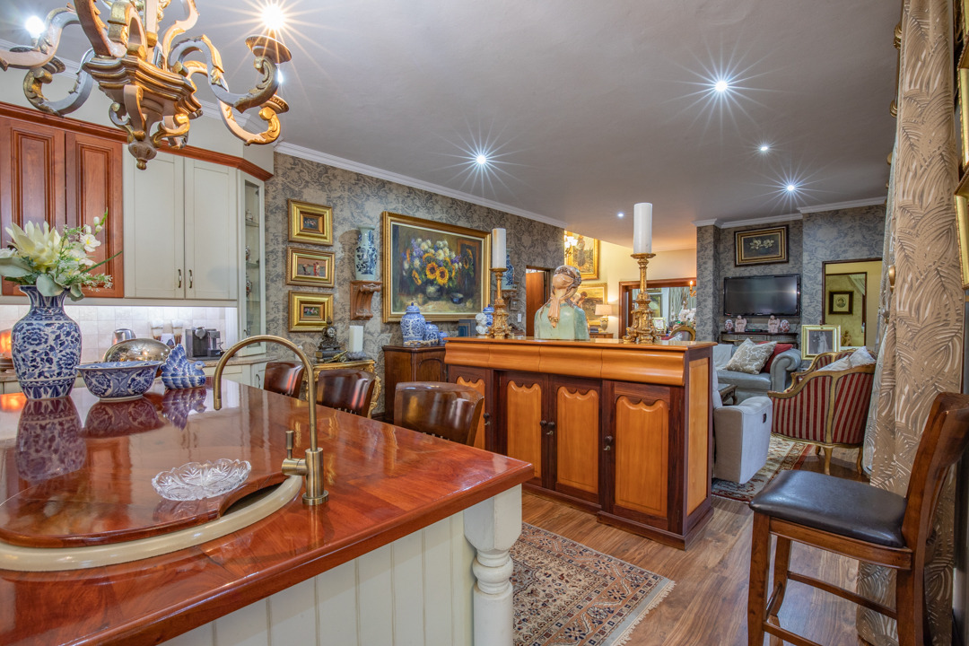 Nestled in the prestigious Waterlake Farm Estate, this beautiful 4-bedroom home perfectly balances modern luxury with serene natural surroundings. The ground floor features a spacious study with built-in shelves, laminate floors, sliding wooden doors, and air conditioning, as well as a stylish guest room with built-in cupboards, double-volume ceilings, and its own full bathroom. The open-plan living area is ideal for gatherings, with a gas fireplace and seamless flow into the kitchen, which boasts rosewood countertops, a gas stove, electric oven, prep bowl with a filter, and space for a double fridge. A separate scullery with pantry, granite countertops, and space for three appliances leads to the courtyard, while the dining area, enhanced by a built-in rosewood bar, adds warmth and charm.