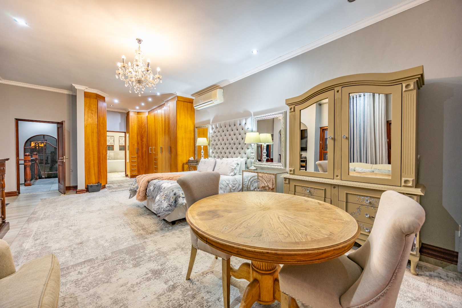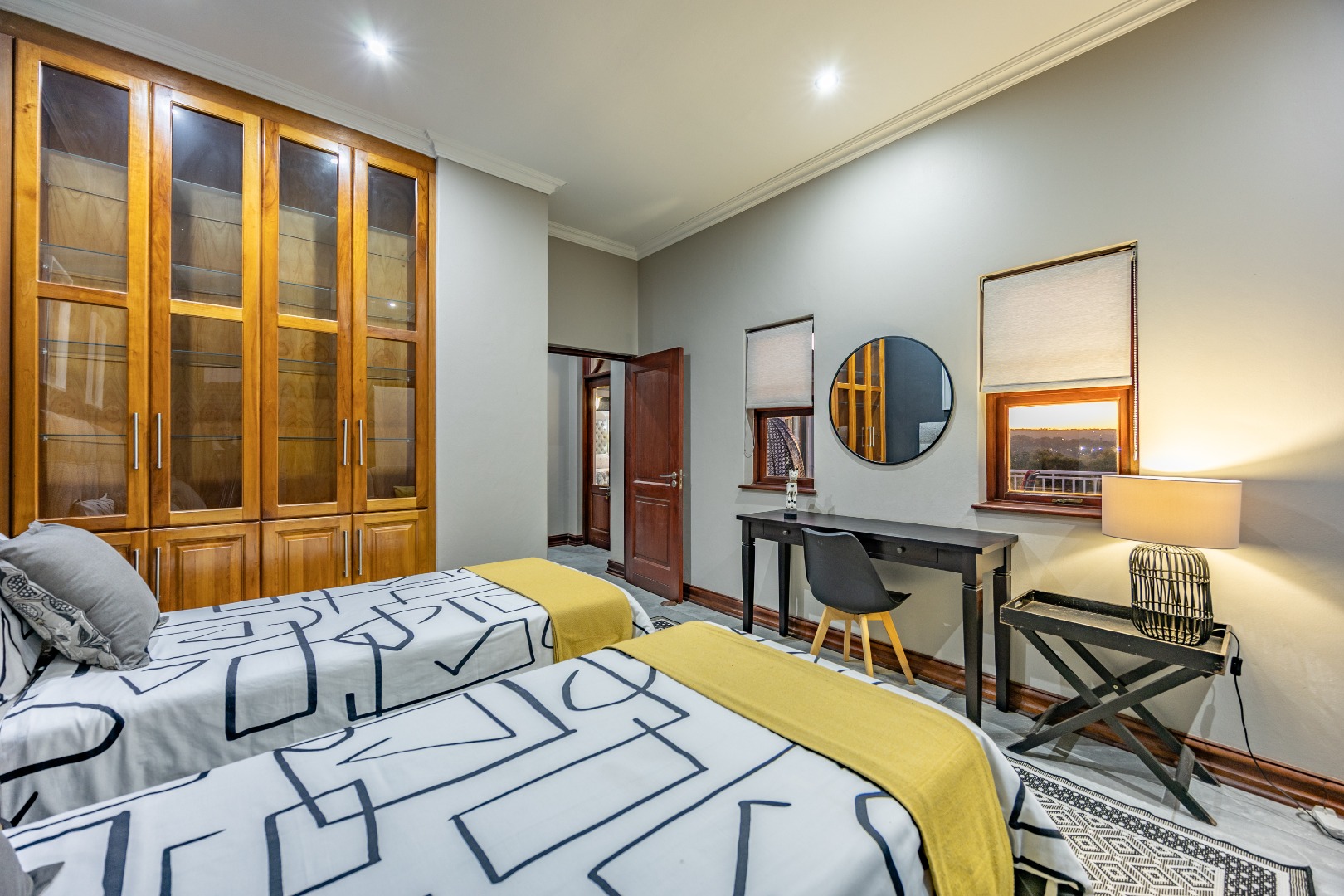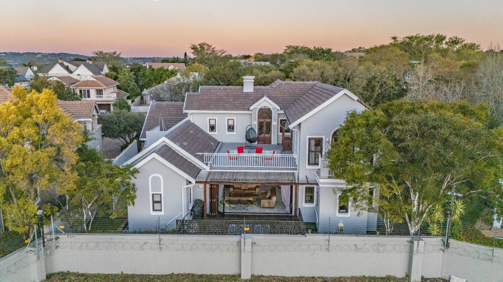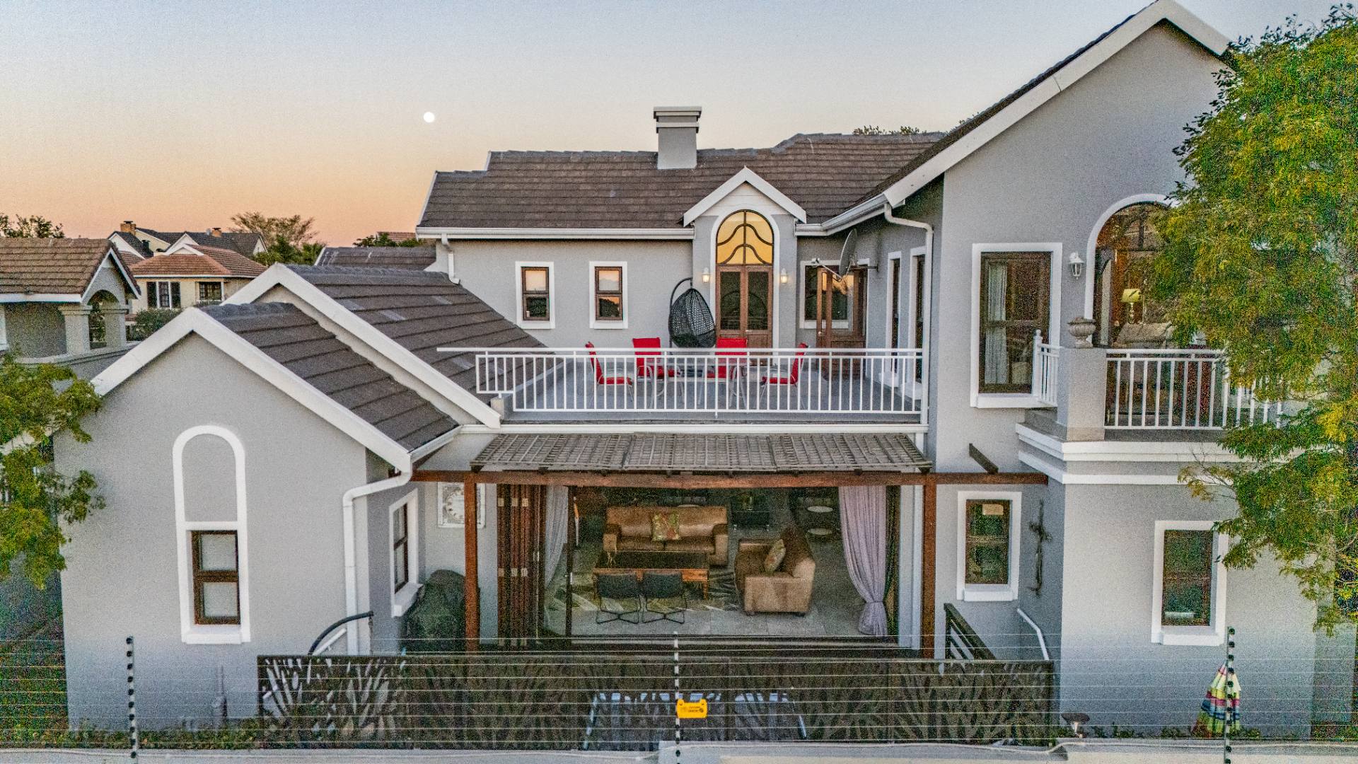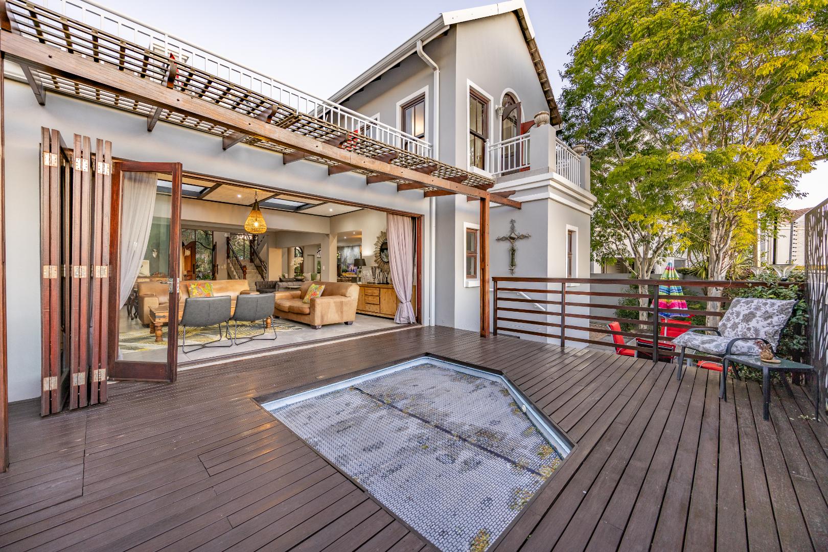 Upstairs, the luxurious main suite features a full en suite bathroom, built-in cupboards with a hidden kitchenette, and two balconies—one offering spectacular views. A fourth bedroom or private study also enjoys its own balcony, making it ideal for remote work or guest accommodation. This home blends privacy, luxury, and premium estate amenities, making it a standout opportunity in one of Pretoria East’s most desirable estates.