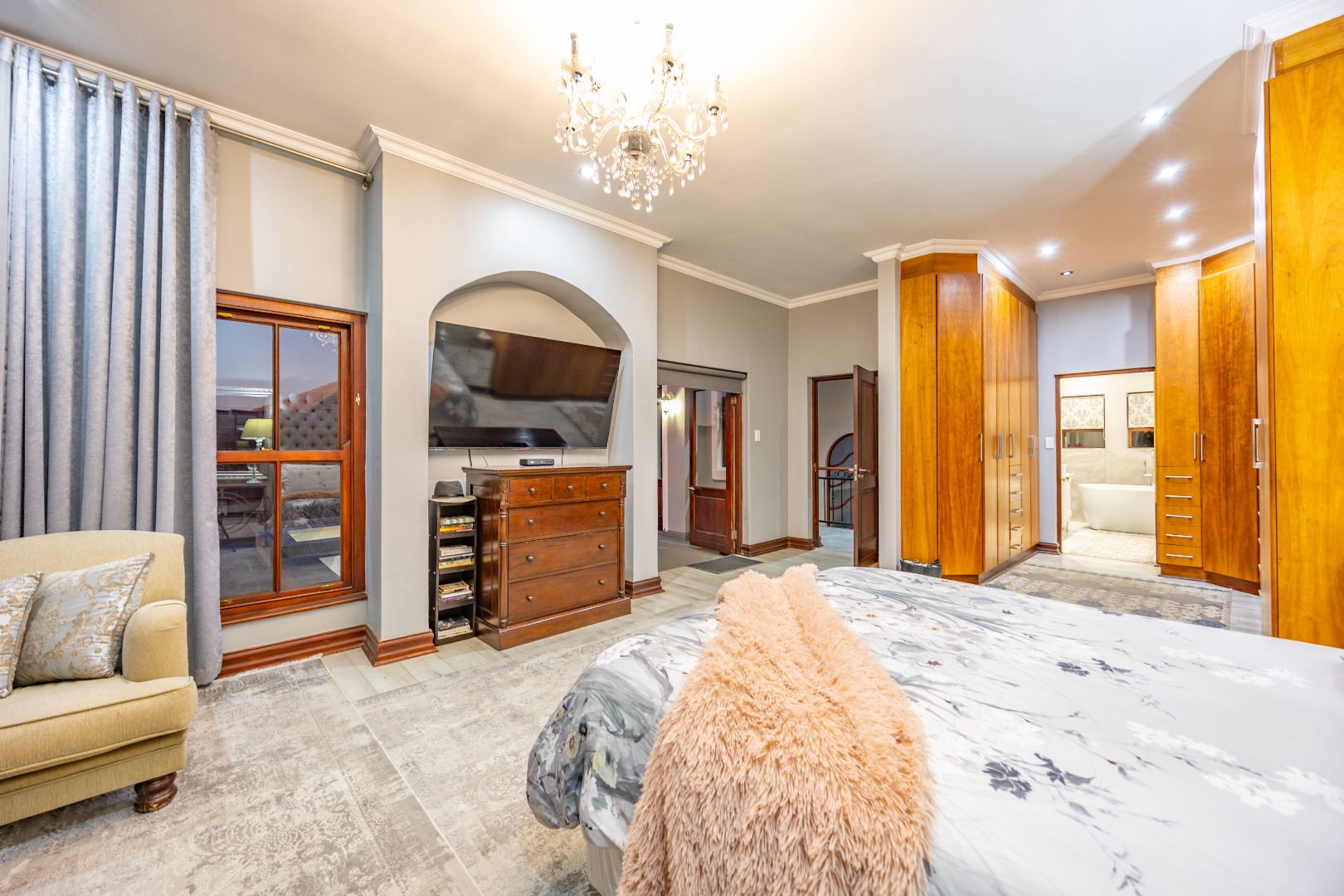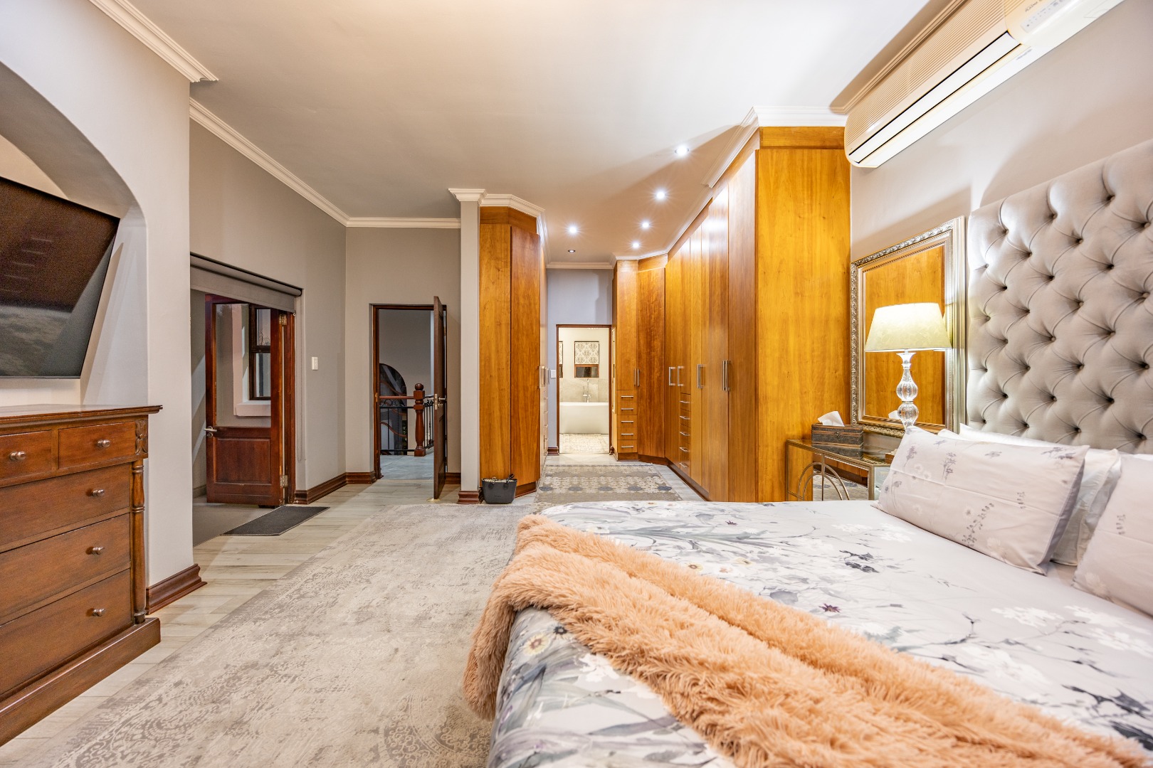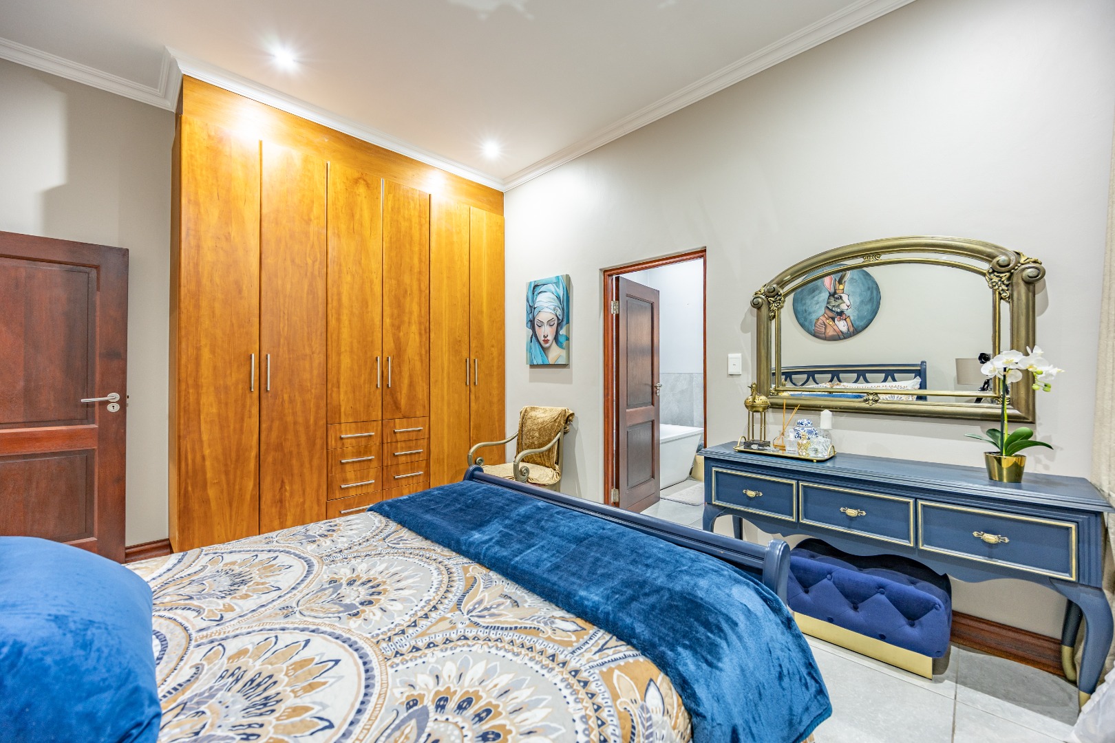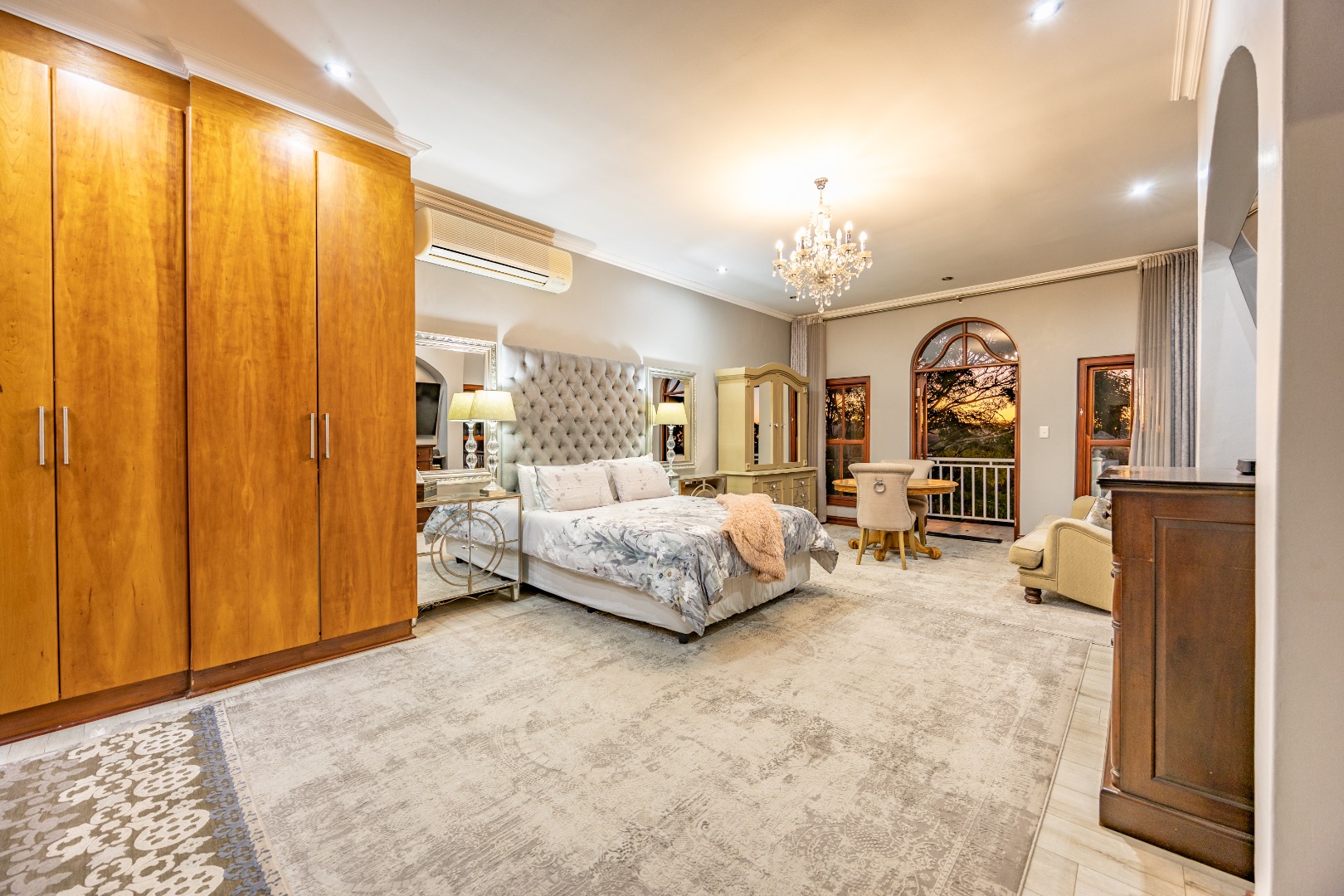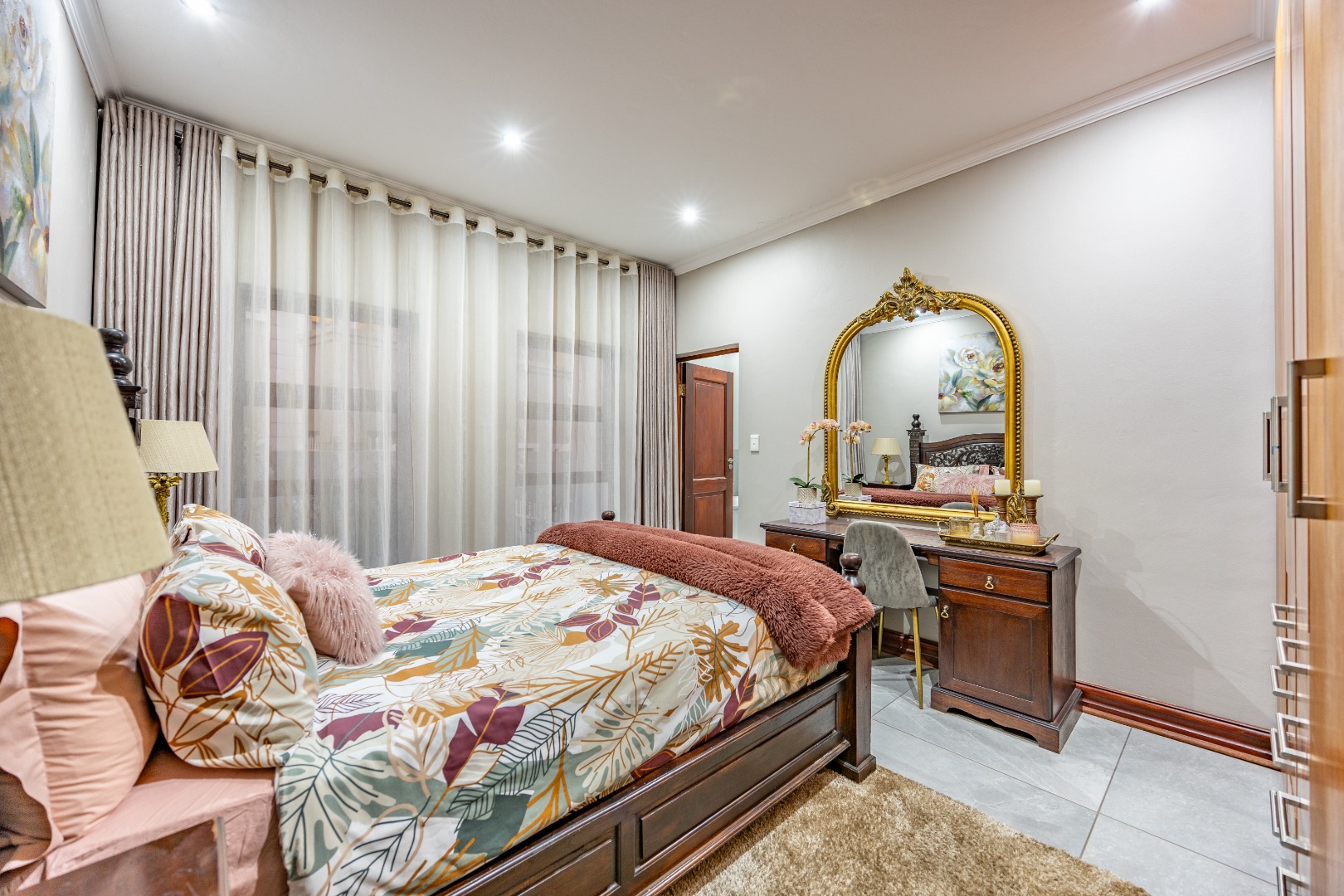 Upstairs, the luxurious main suite features a full en suite bathroom, built-in cupboards with a hidden kitchenette, and two balconies—one offering spectacular views. A fourth bedroom or private study also enjoys its own balcony, making it ideal for remote work or guest accommodation. This home blends privacy, luxury, and premium estate amenities, making it a standout opportunity in one of Pretoria East’s most desirable estates.