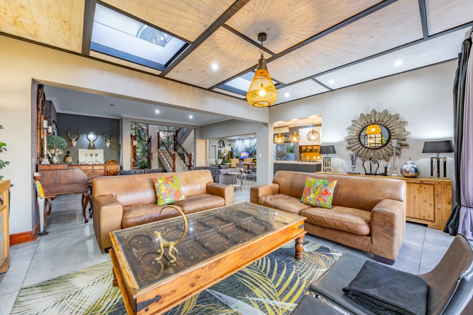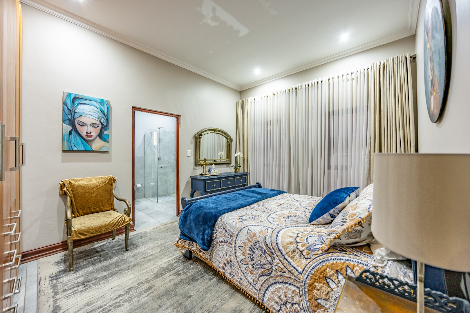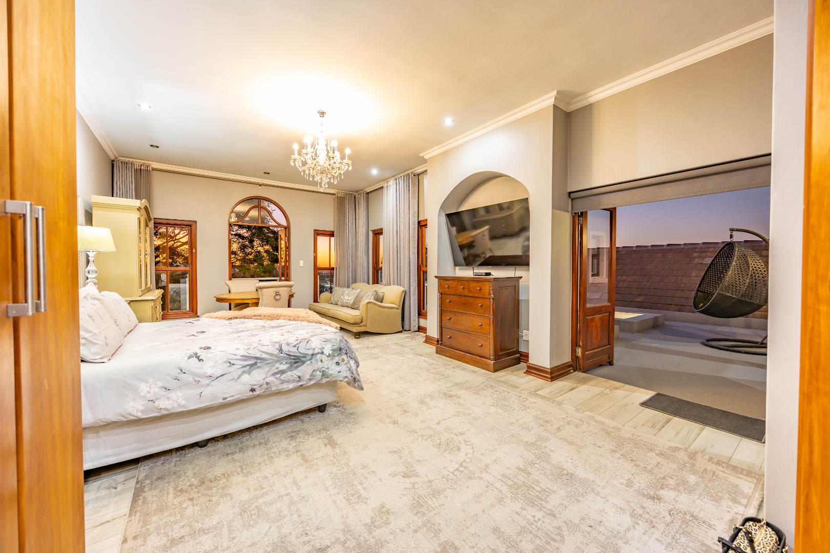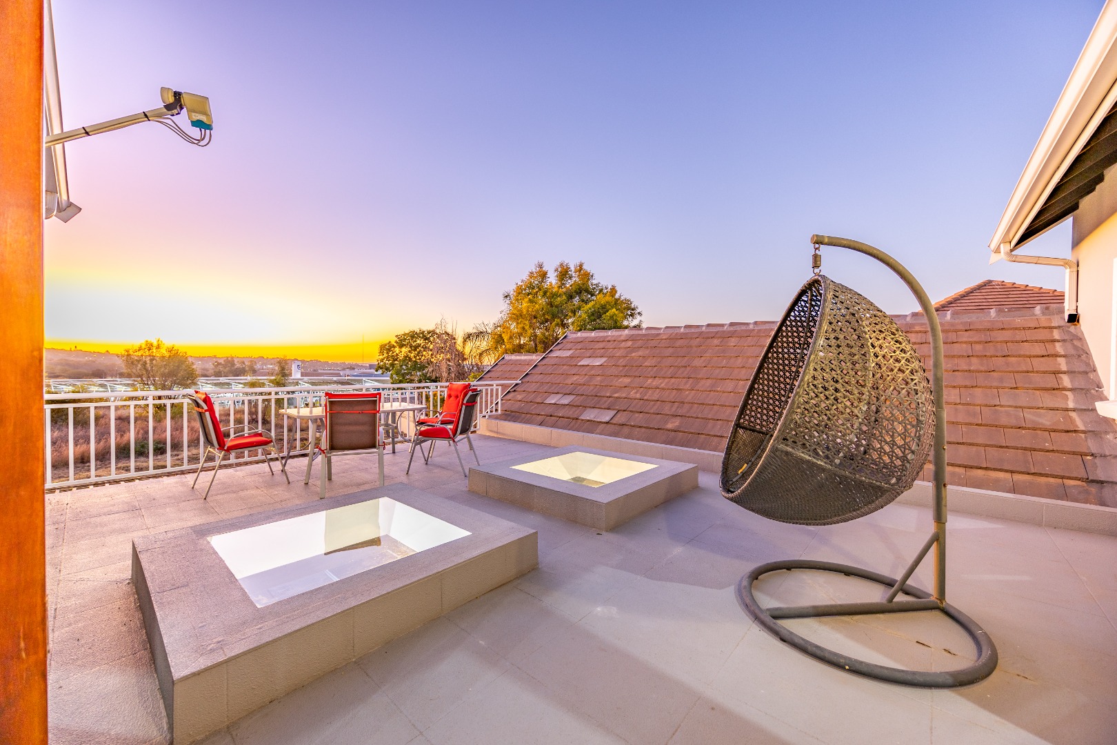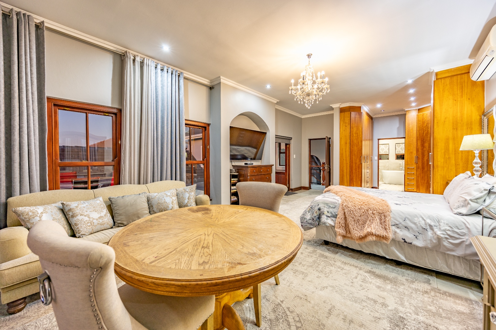 Upstairs, the luxurious main suite features a full en suite bathroom, built-in cupboards with a hidden kitchenette, and two balconies—one offering spectacular views. A fourth bedroom or private study also enjoys its own balcony, making it ideal for remote work or guest accommodation. This home blends privacy, luxury, and premium estate amenities, making it a standout opportunity in one of Pretoria East’s most desirable estates.