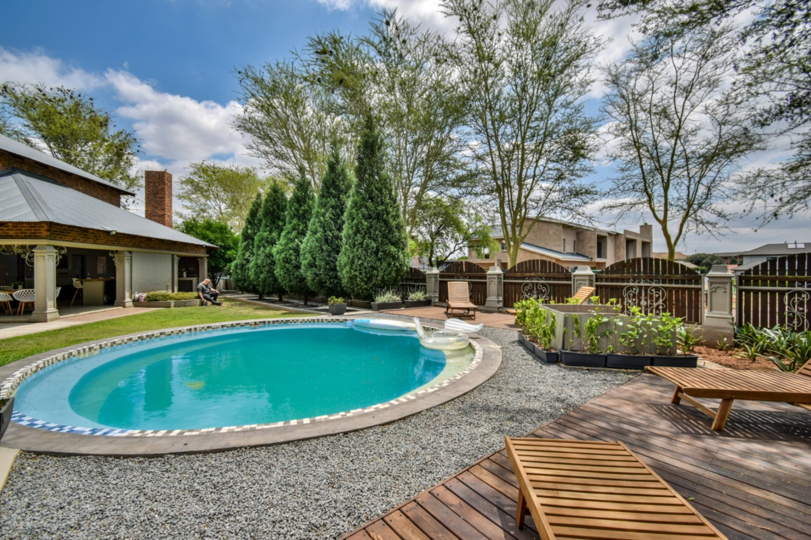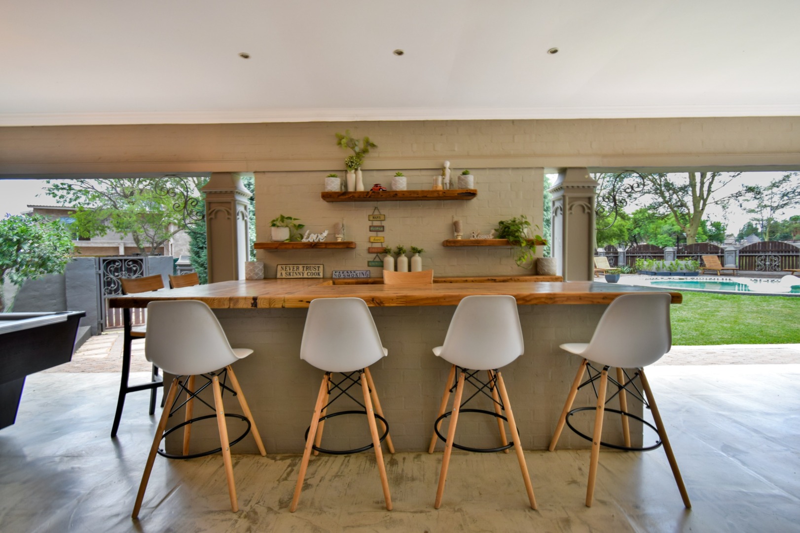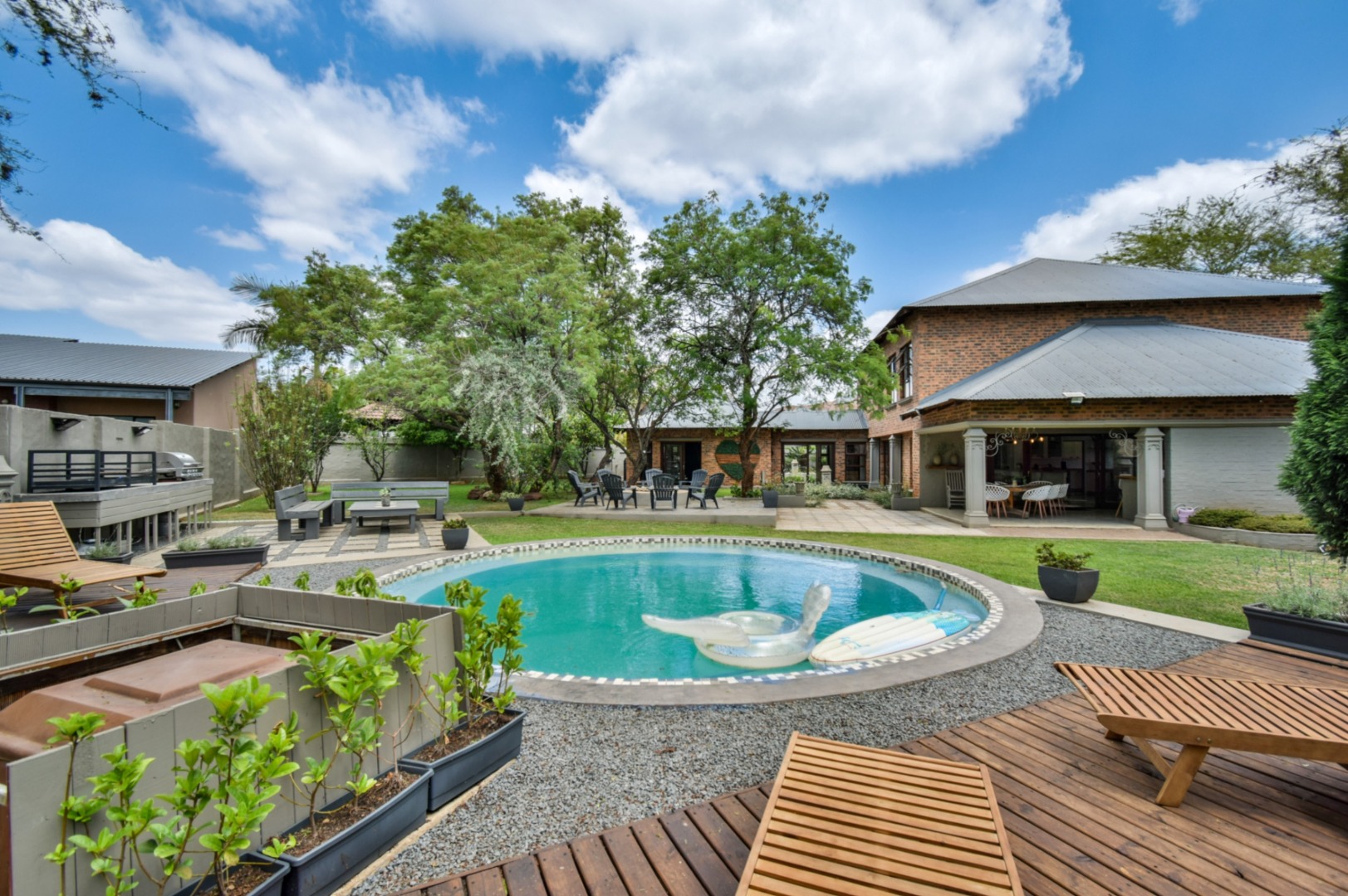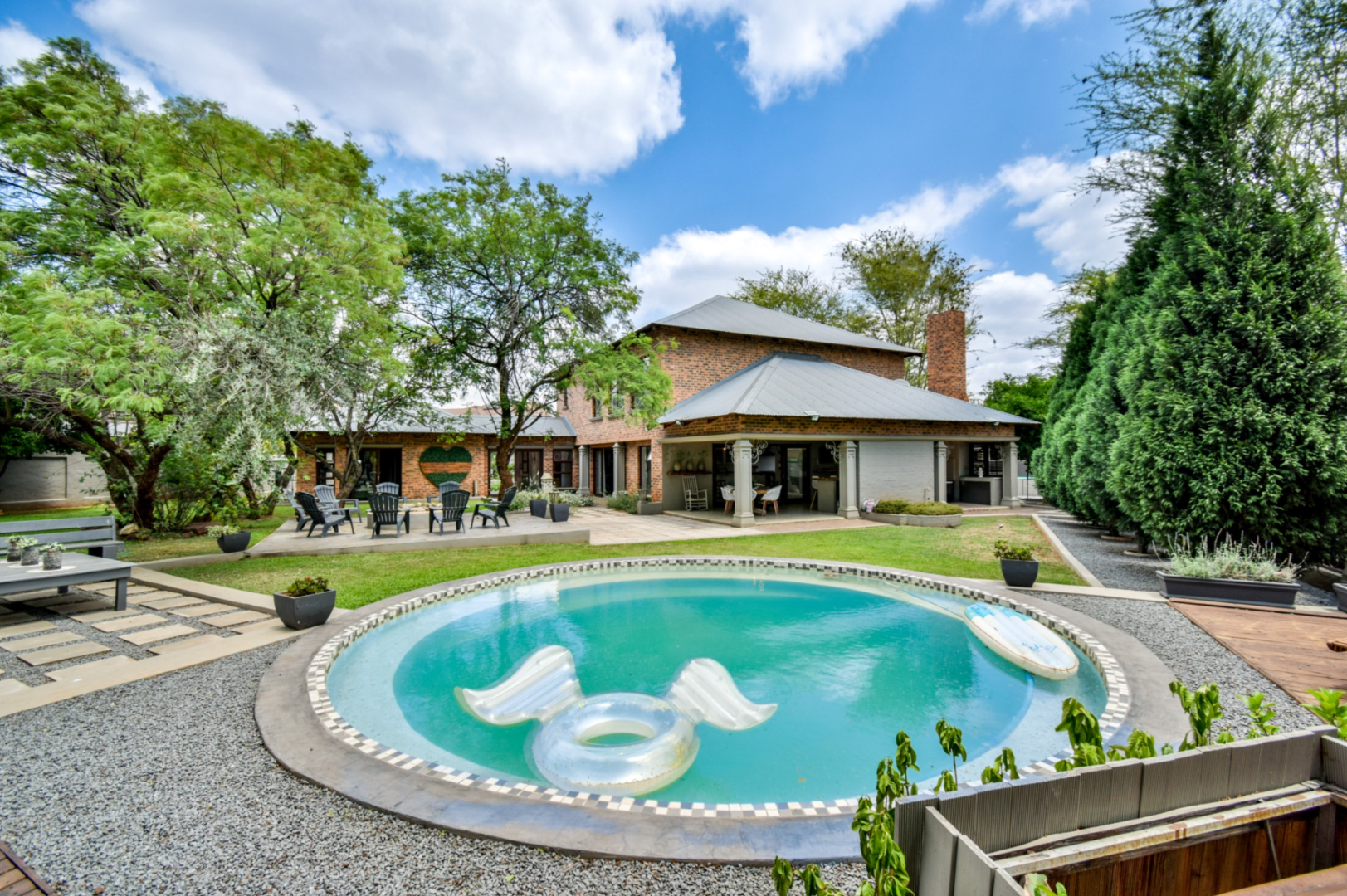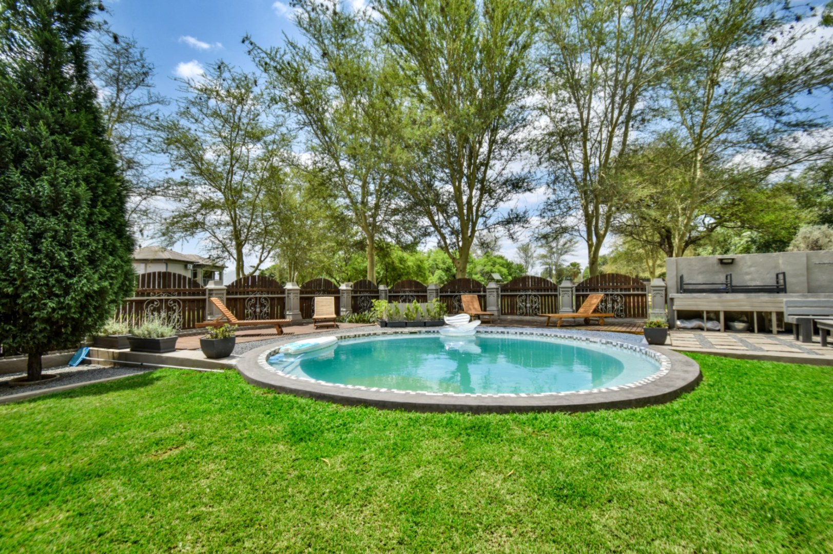 The outdoor areas are designed for relaxation and social gatherings, featuring a built-in braai, bar-style countertops, and seamless access to a serene garden oasis. Enjoy the sparkling round swimming pool and charming boma, creating the perfect backdrop for weekend leisure or evening entertaining. The ground floor also offers a well-appointed guest bedroom with a private bathroom, plus a separate external suite that can serve as staff quarters, a home office, or private accommodation for extended family.