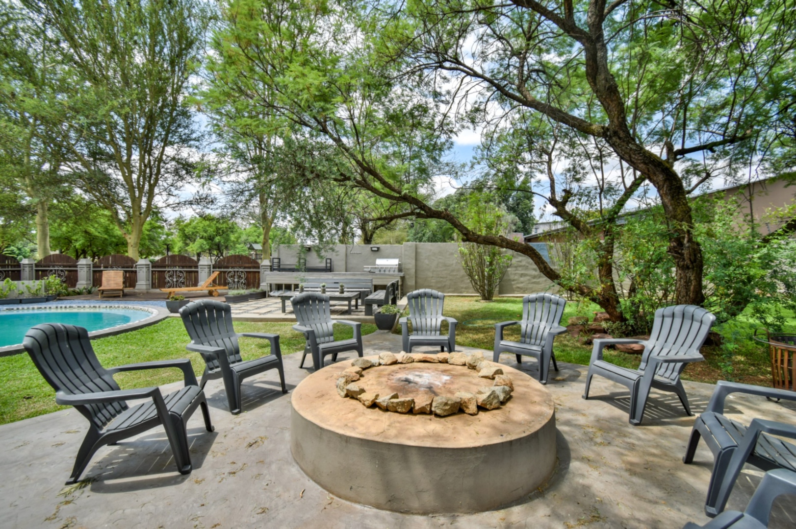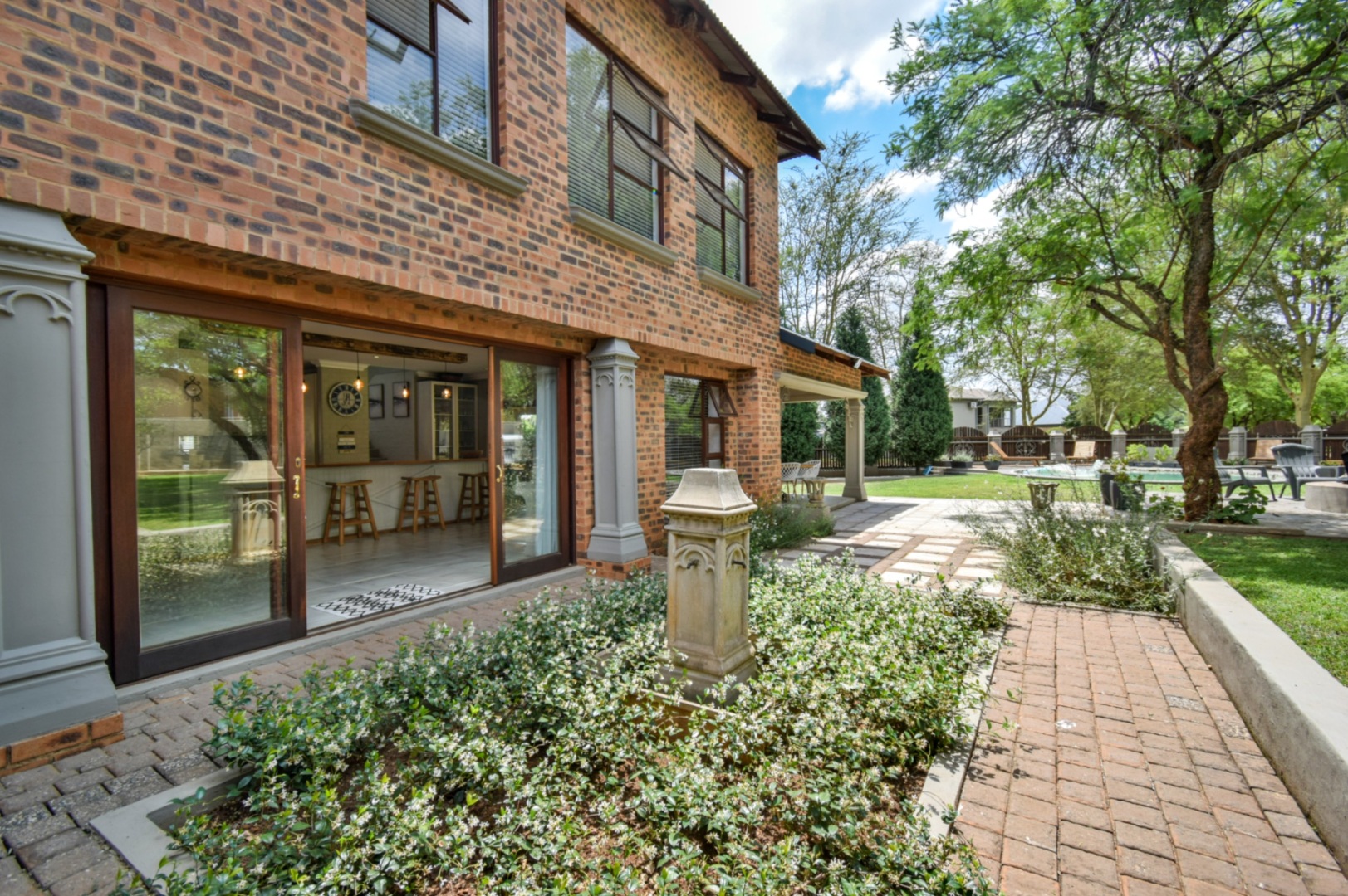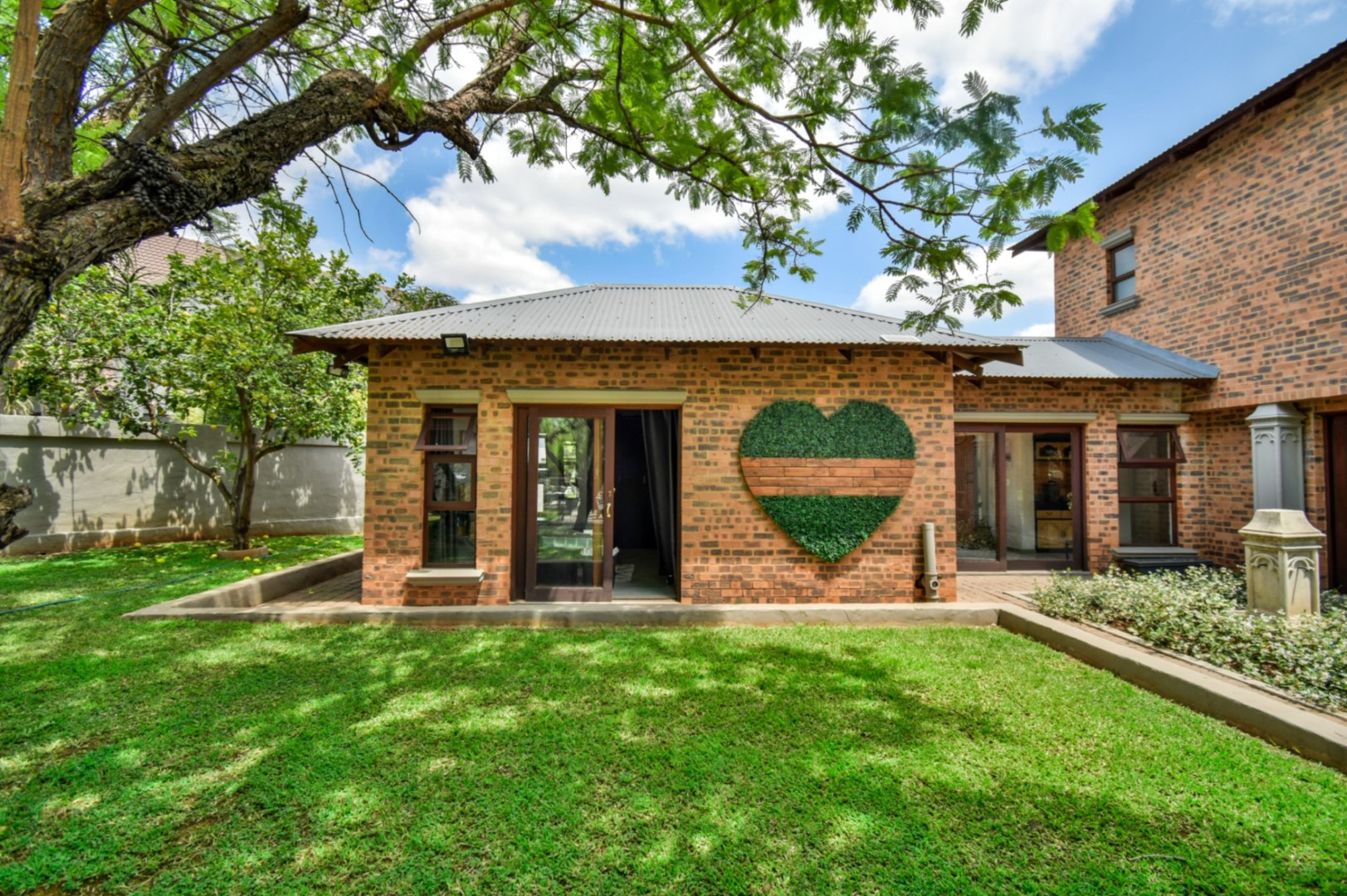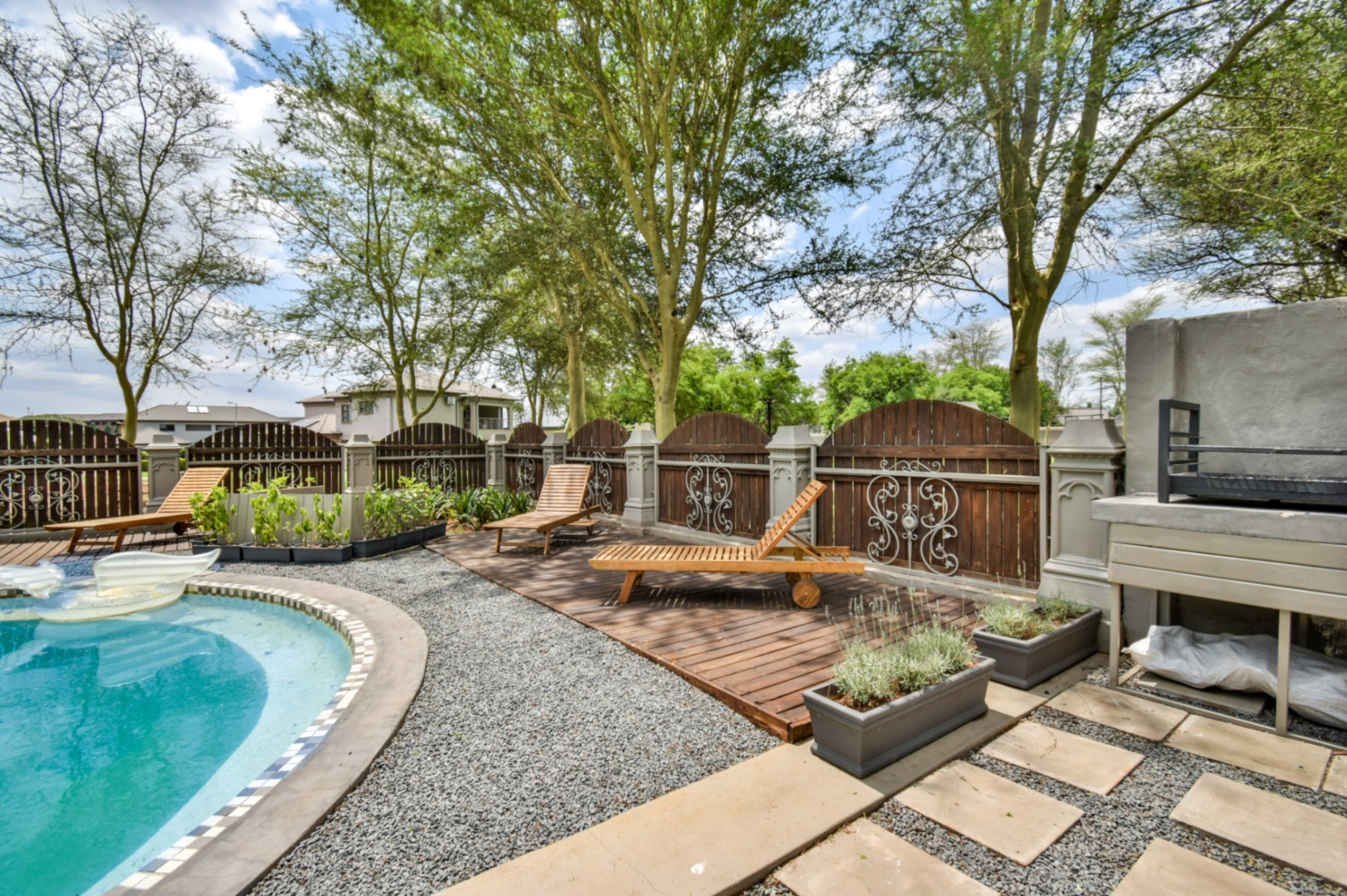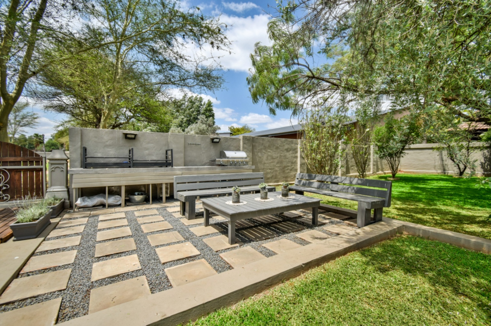 The outdoor areas are designed for relaxation and social gatherings, featuring a built-in braai, bar-style countertops, and seamless access to a serene garden oasis. Enjoy the sparkling round swimming pool and charming boma, creating the perfect backdrop for weekend leisure or evening entertaining. The ground floor also offers a well-appointed guest bedroom with a private bathroom, plus a separate external suite that can serve as staff quarters, a home office, or private accommodation for extended family.