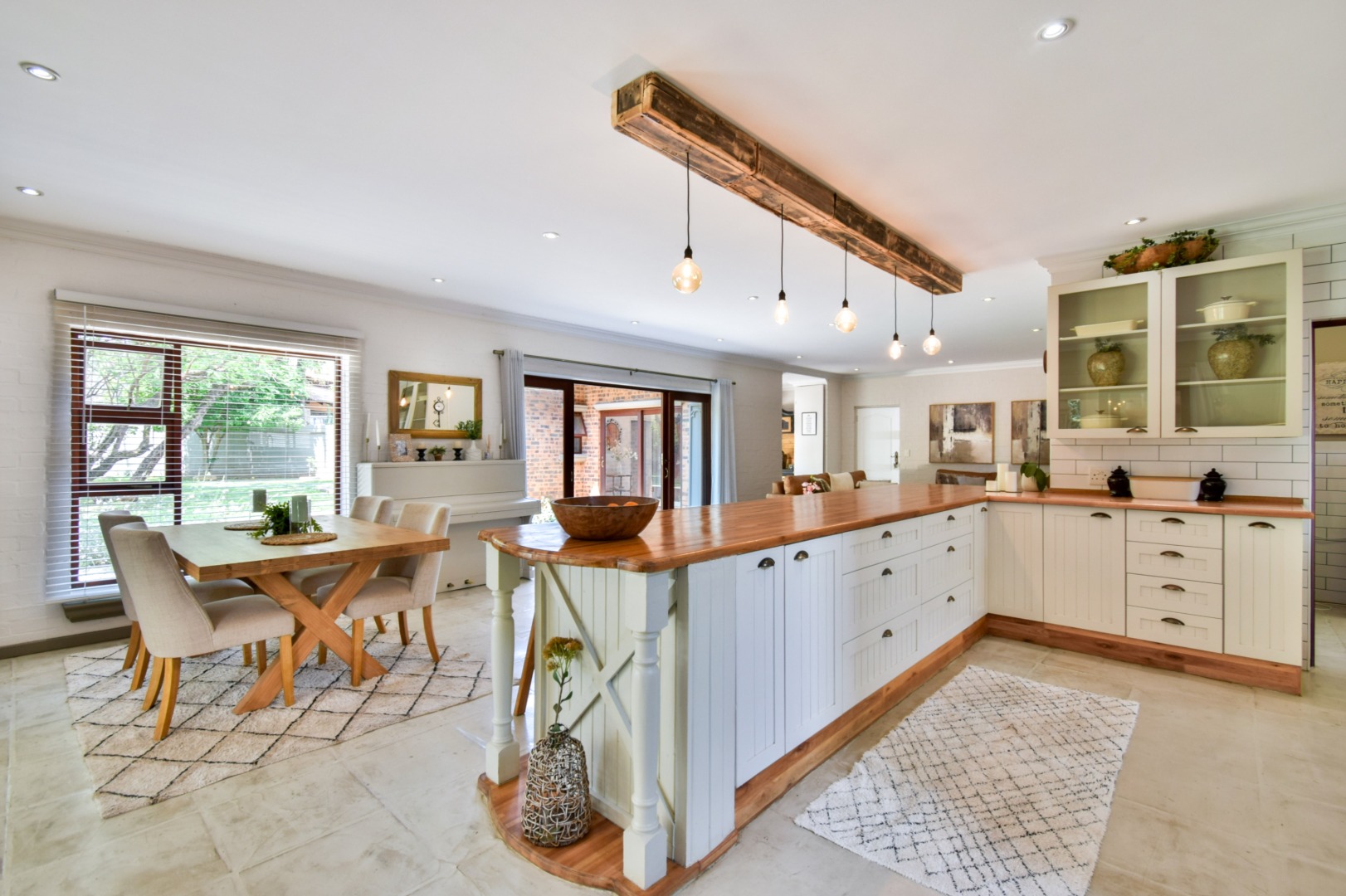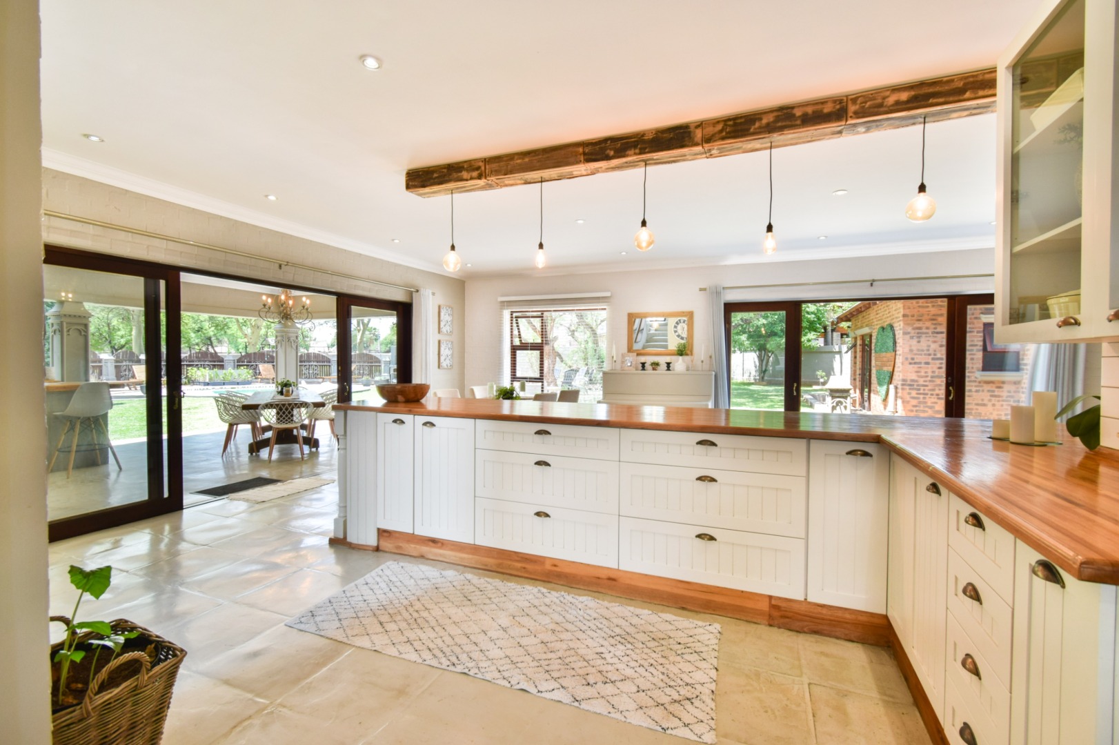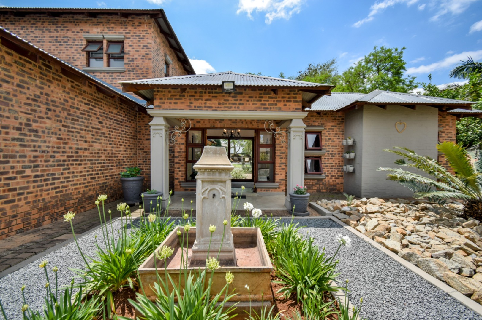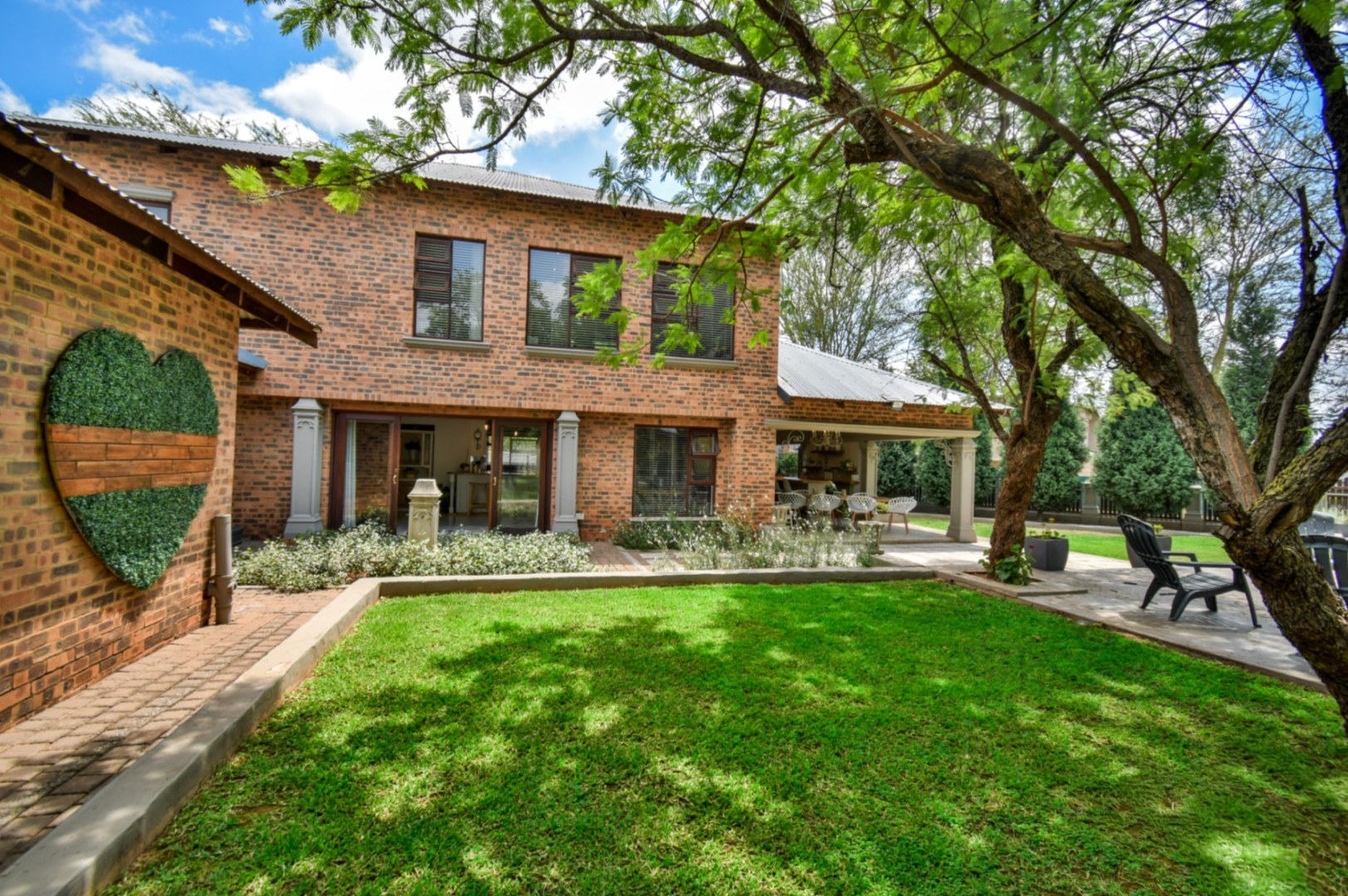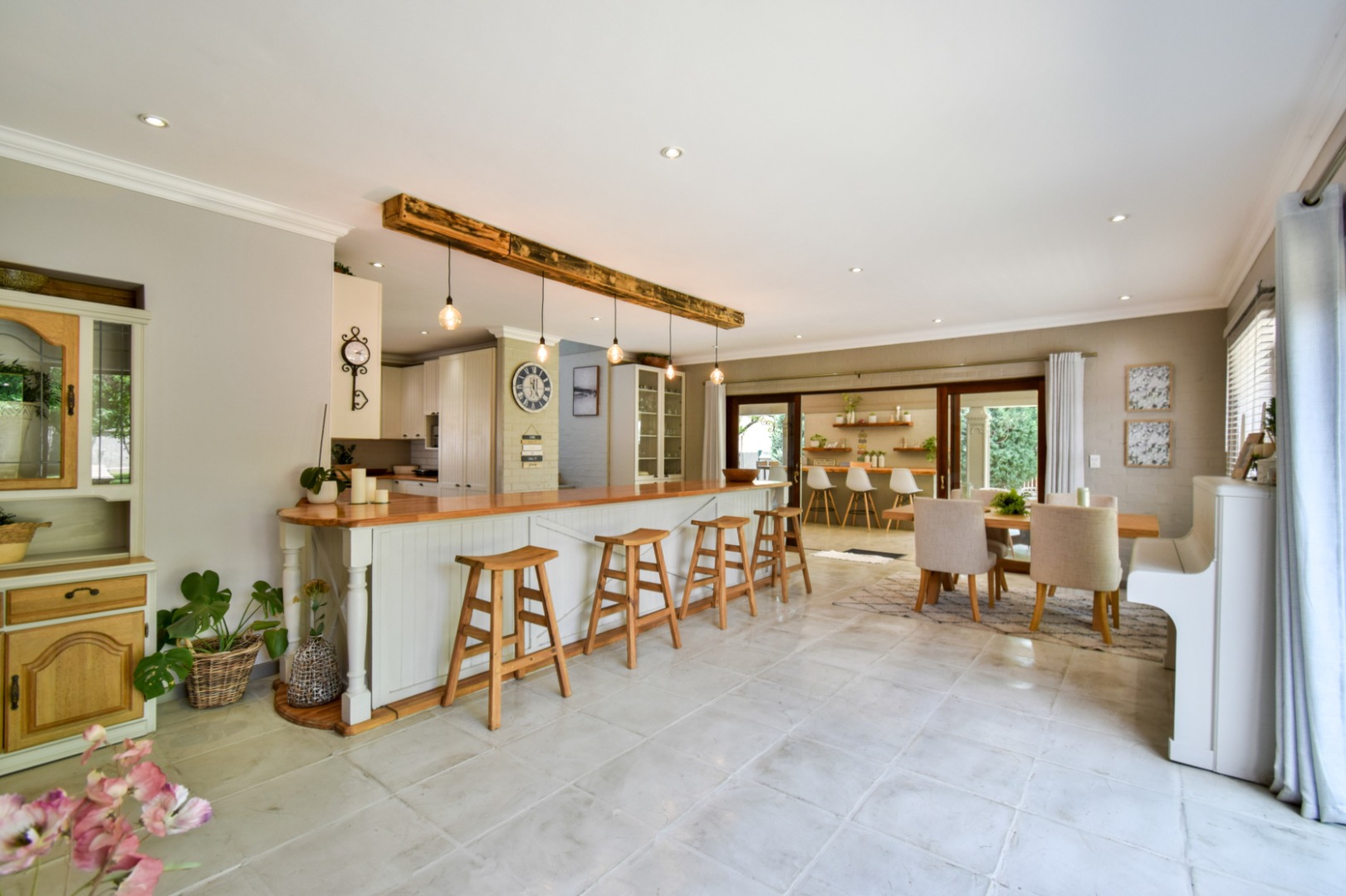 The outdoor areas are designed for relaxation and social gatherings, featuring a built-in braai, bar-style countertops, and seamless access to a serene garden oasis. Enjoy the sparkling round swimming pool and charming boma, creating the perfect backdrop for weekend leisure or evening entertaining. The ground floor also offers a well-appointed guest bedroom with a private bathroom, plus a separate external suite that can serve as staff quarters, a home office, or private accommodation for extended family.