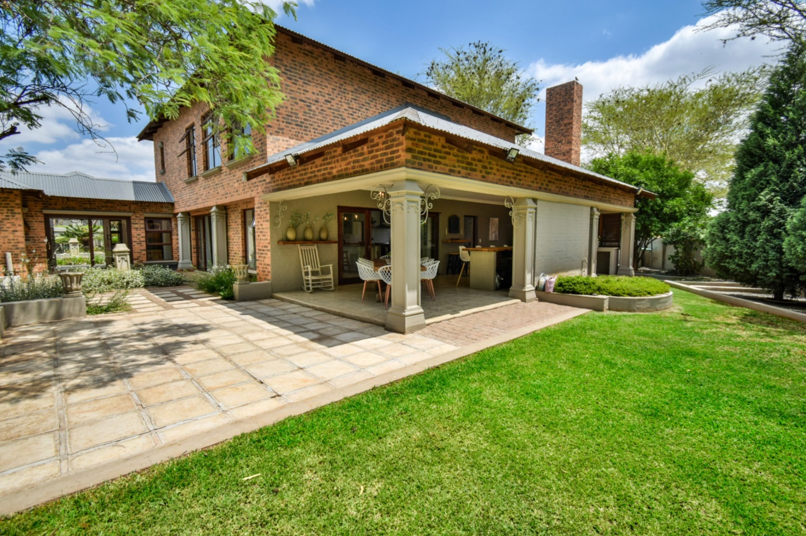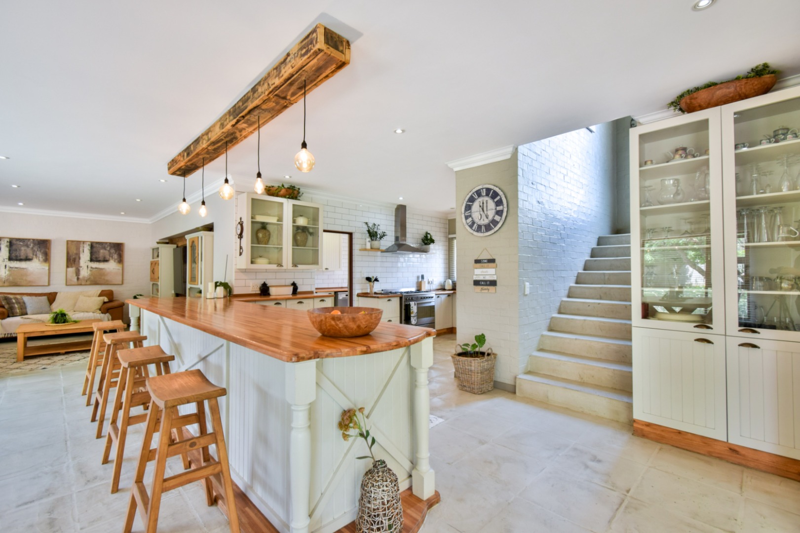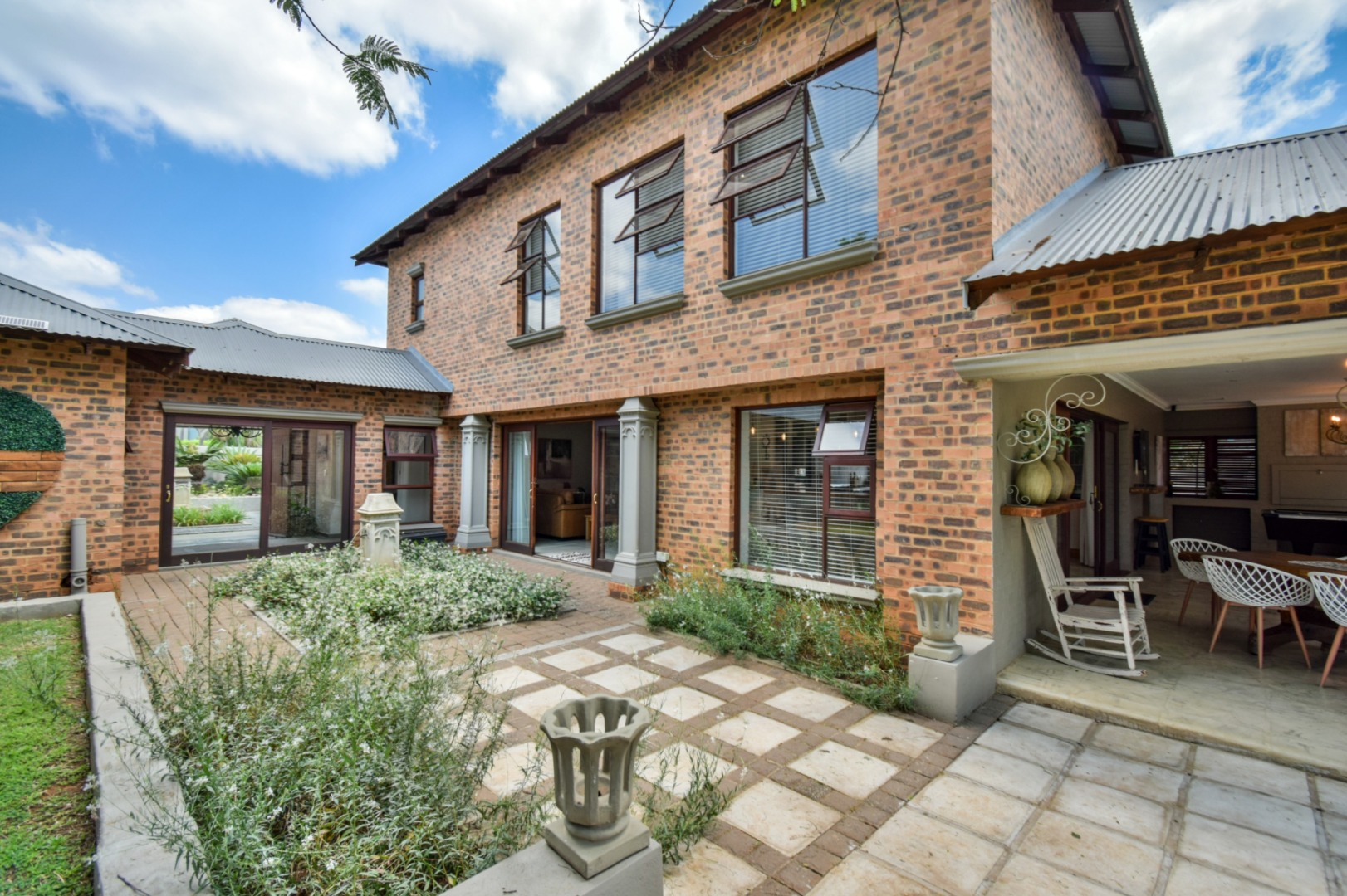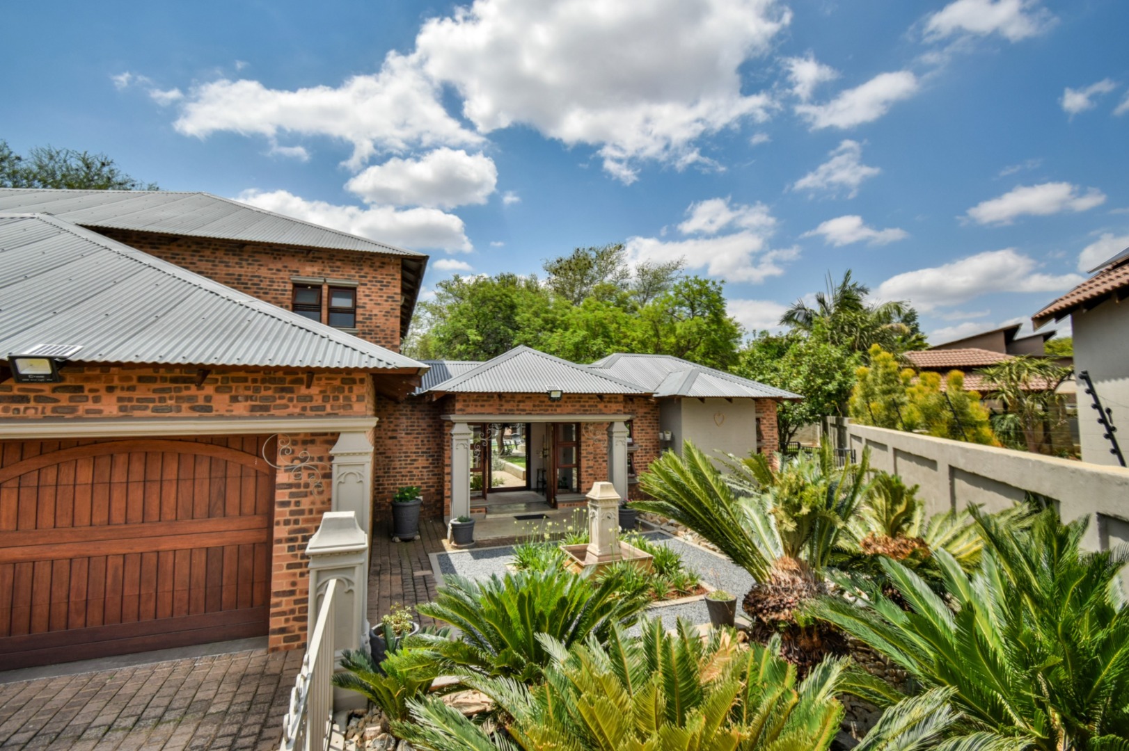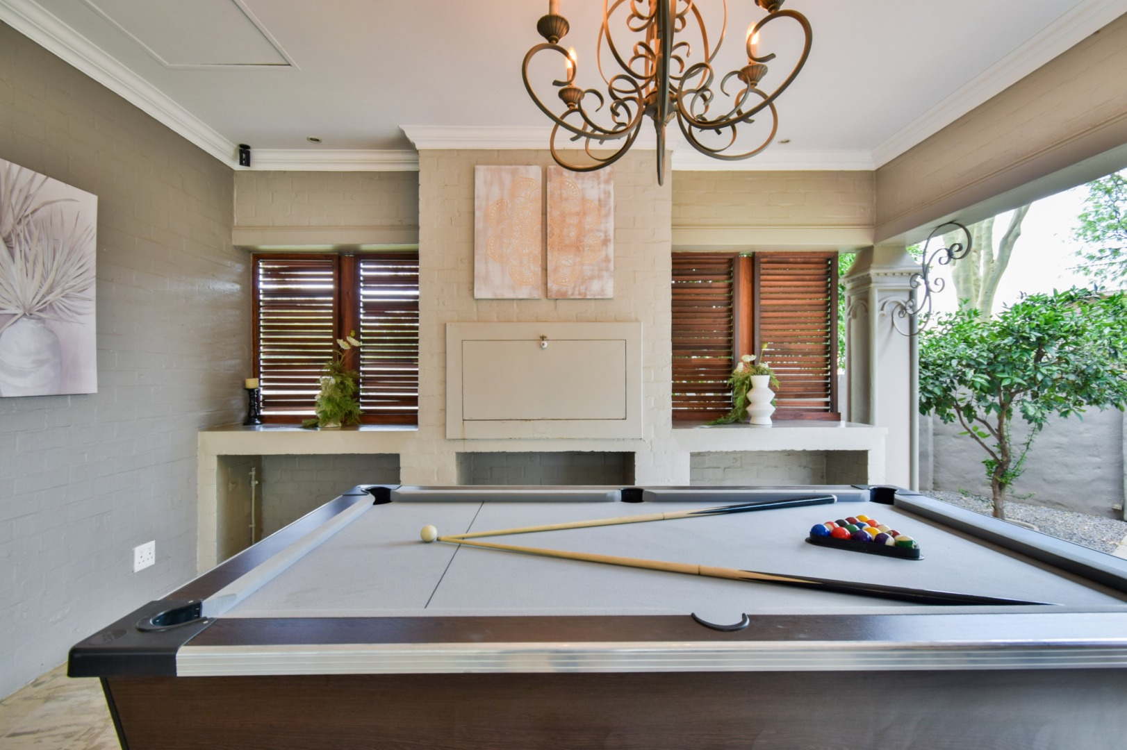 The outdoor areas are designed for relaxation and social gatherings, featuring a built-in braai, bar-style countertops, and seamless access to a serene garden oasis. Enjoy the sparkling round swimming pool and charming boma, creating the perfect backdrop for weekend leisure or evening entertaining. The ground floor also offers a well-appointed guest bedroom with a private bathroom, plus a separate external suite that can serve as staff quarters, a home office, or private accommodation for extended family.