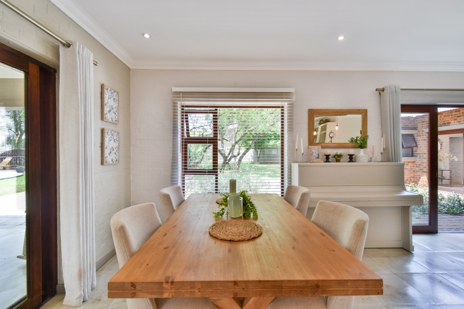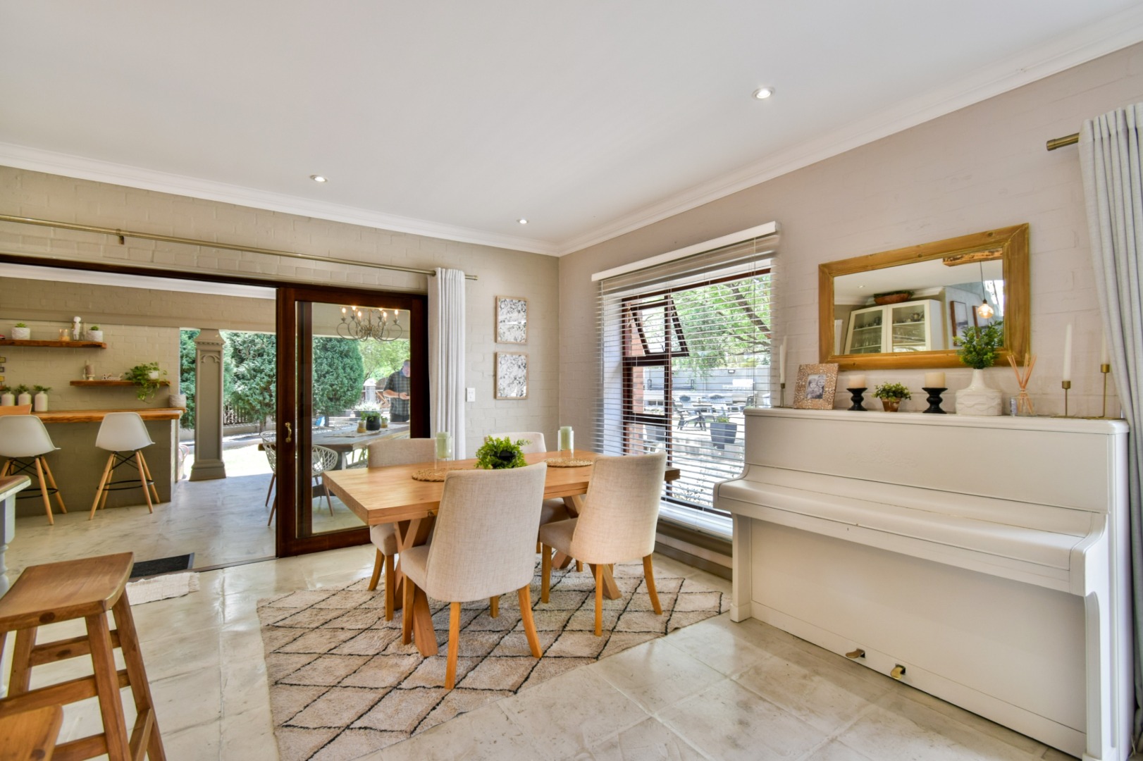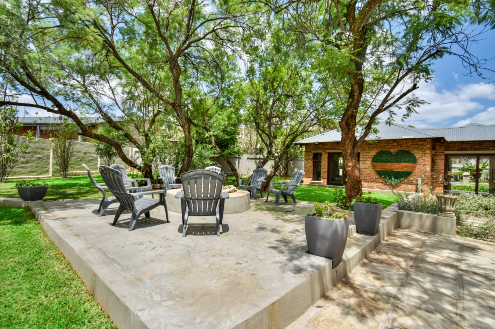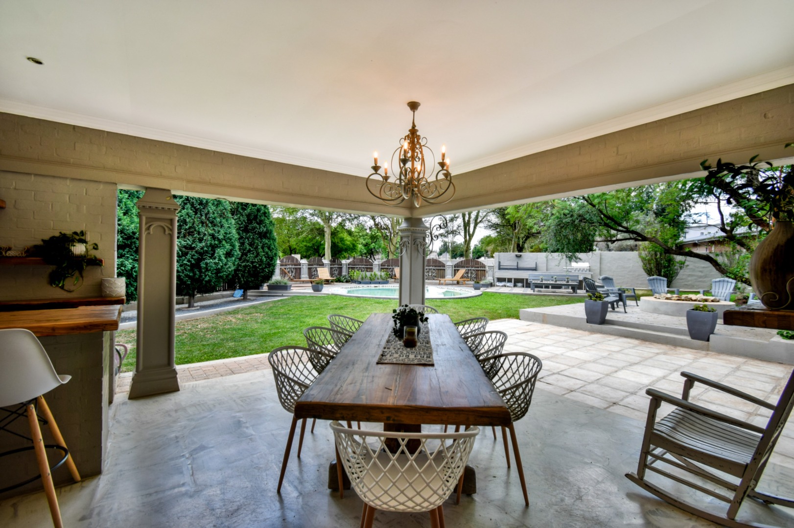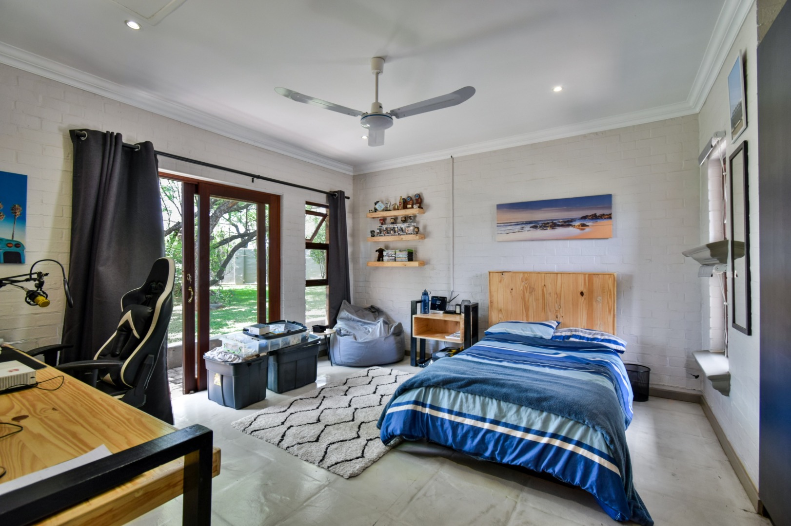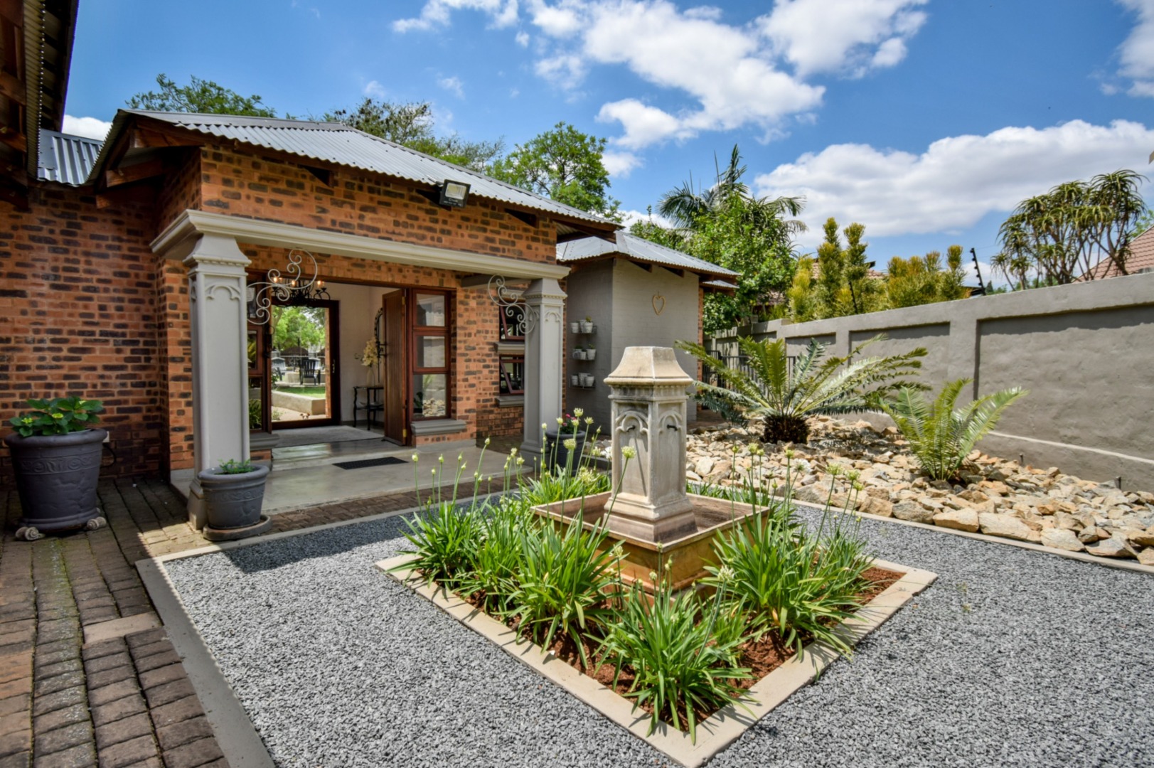 The outdoor areas are designed for relaxation and social gatherings, featuring a built-in braai, bar-style countertops, and seamless access to a serene garden oasis. Enjoy the sparkling round swimming pool and charming boma, creating the perfect backdrop for weekend leisure or evening entertaining. The ground floor also offers a well-appointed guest bedroom with a private bathroom, plus a separate external suite that can serve as staff quarters, a home office, or private accommodation for extended family.