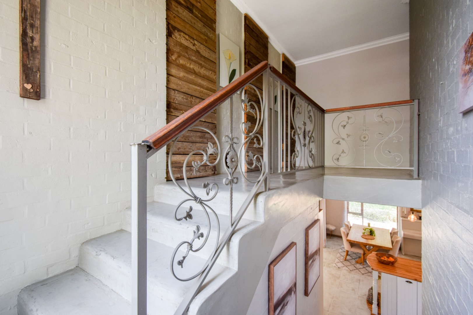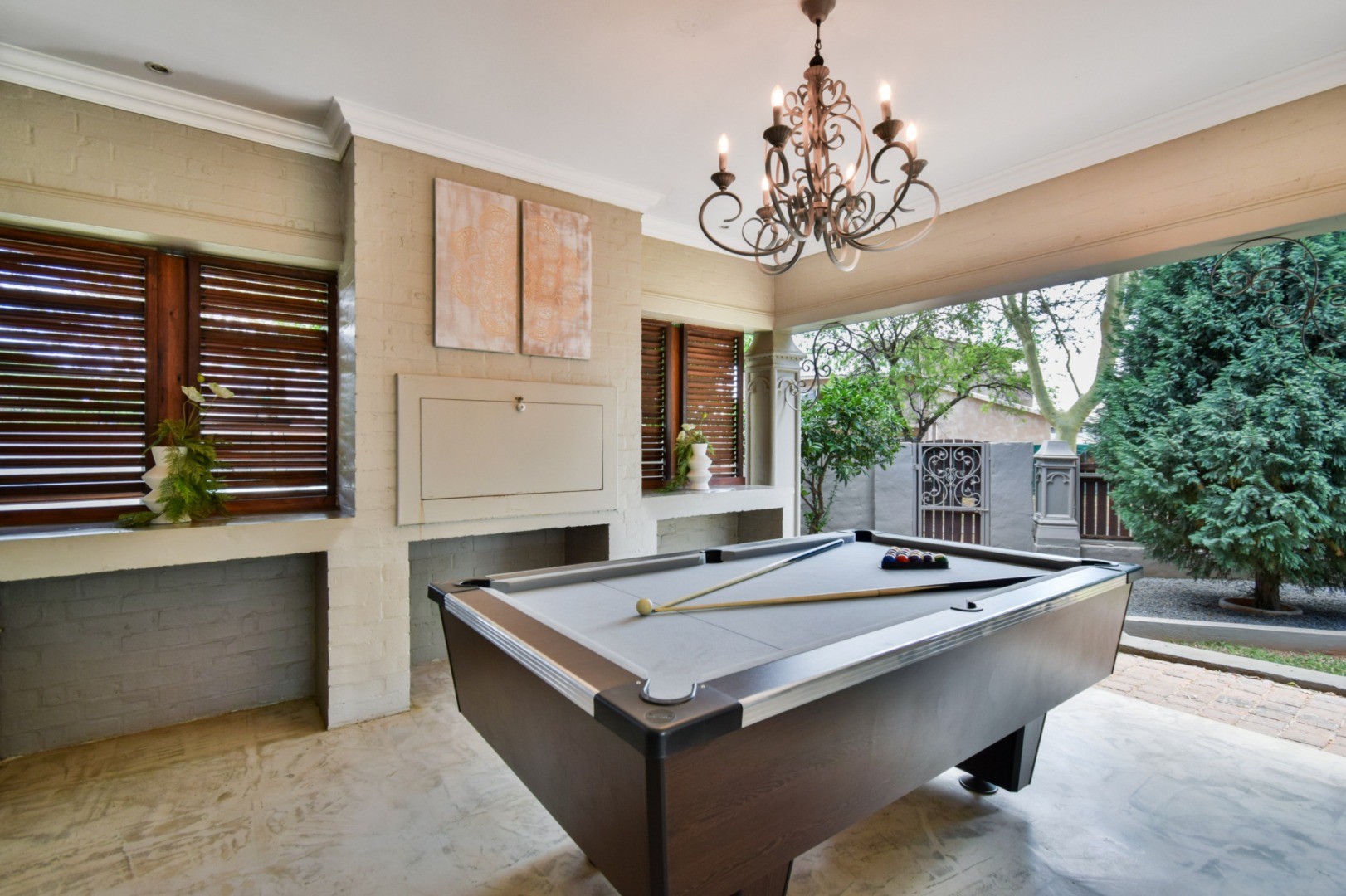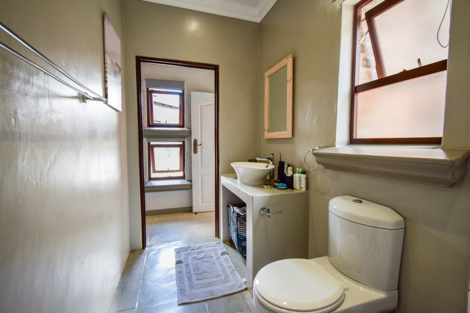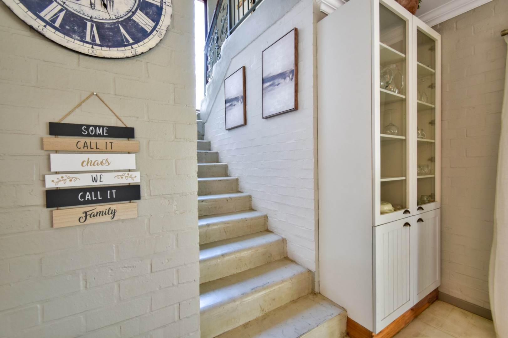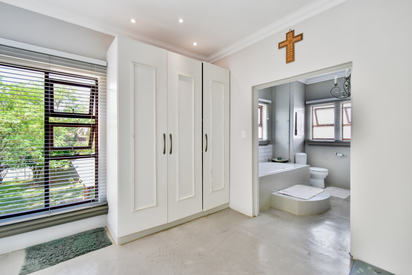 The outdoor areas are designed for relaxation and social gatherings, featuring a built-in braai, bar-style countertops, and seamless access to a serene garden oasis. Enjoy the sparkling round swimming pool and charming boma, creating the perfect backdrop for weekend leisure or evening entertaining. The ground floor also offers a well-appointed guest bedroom with a private bathroom, plus a separate external suite that can serve as staff quarters, a home office, or private accommodation for extended family.