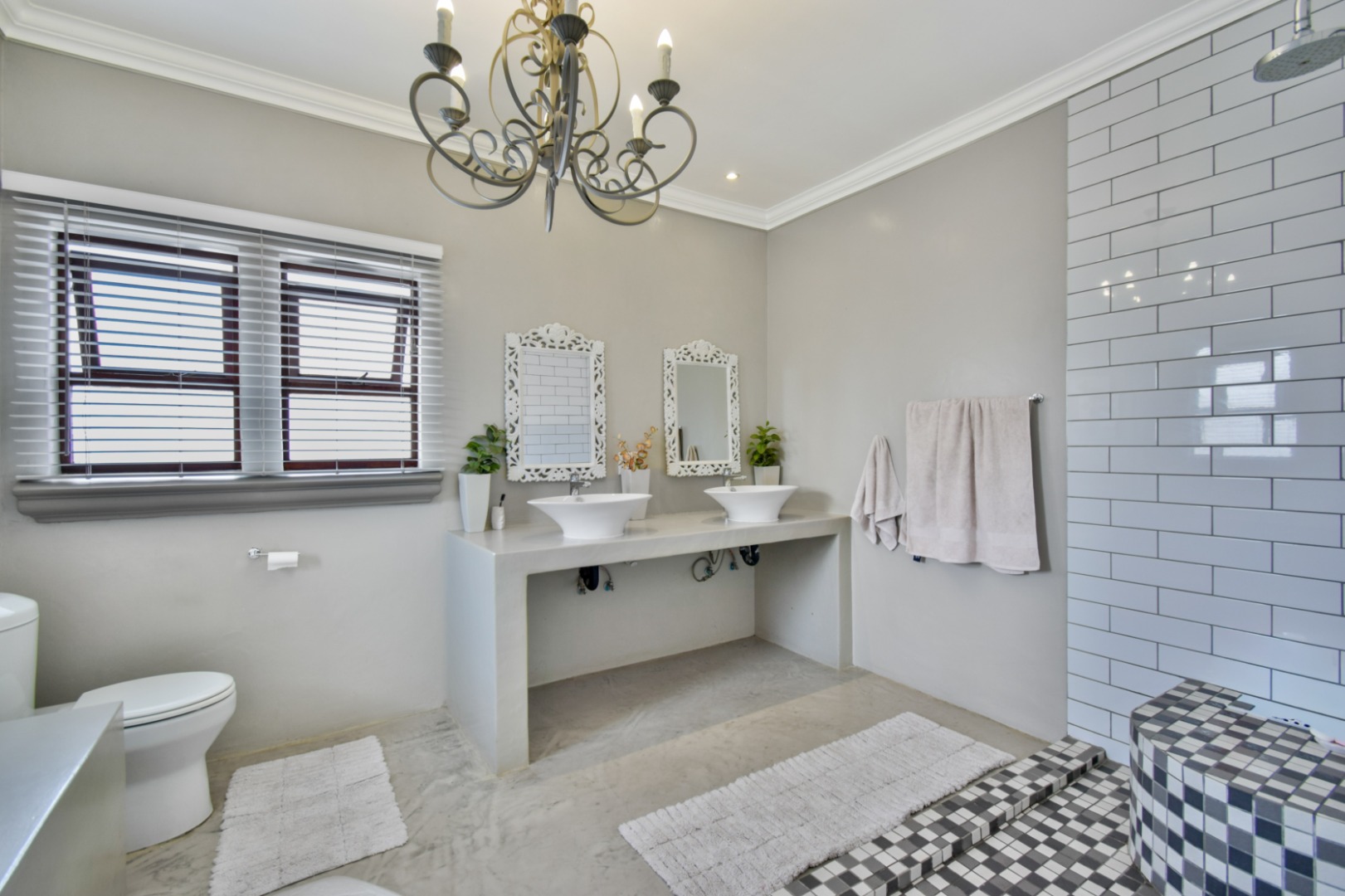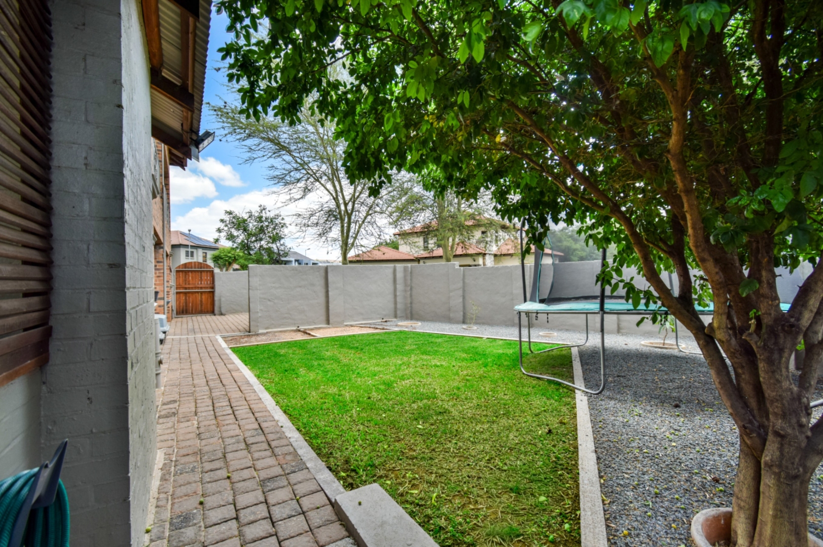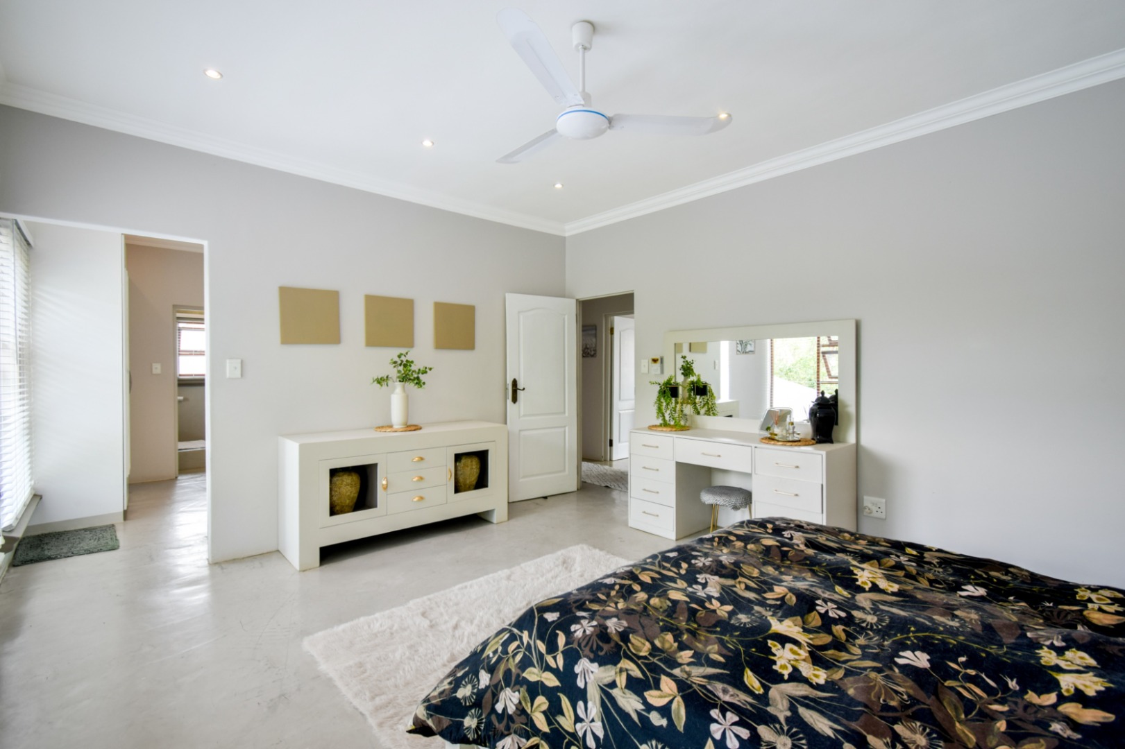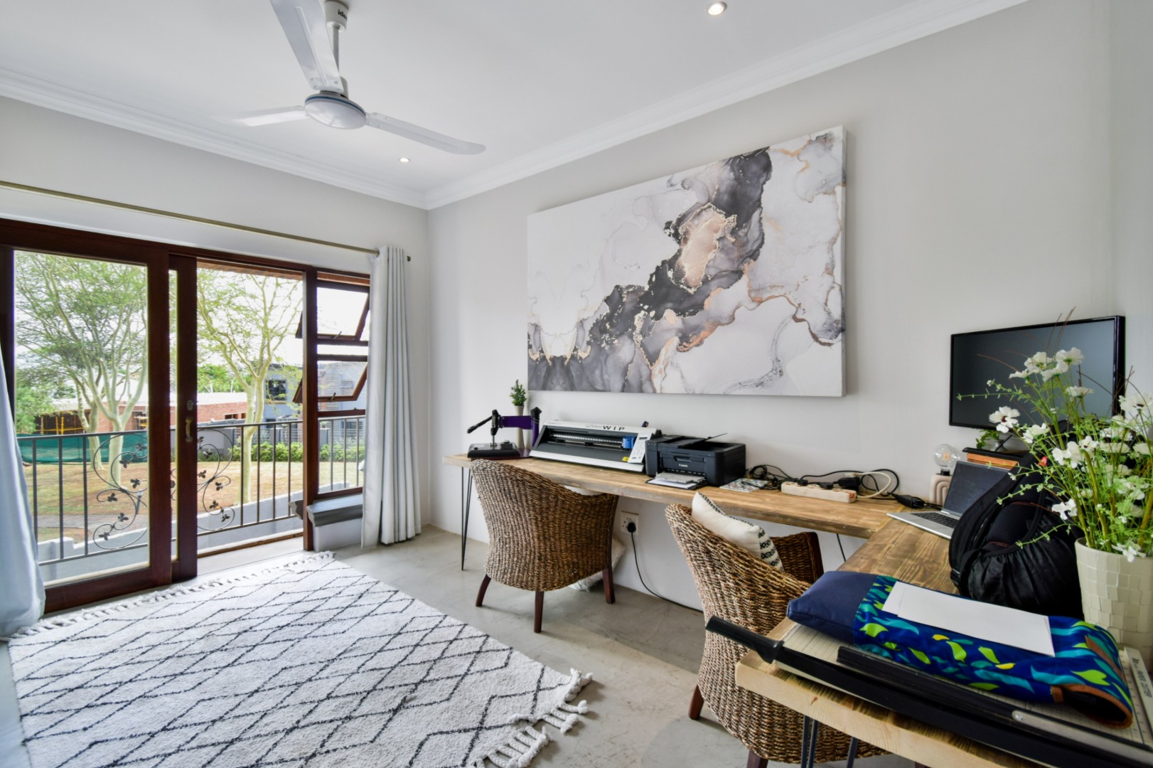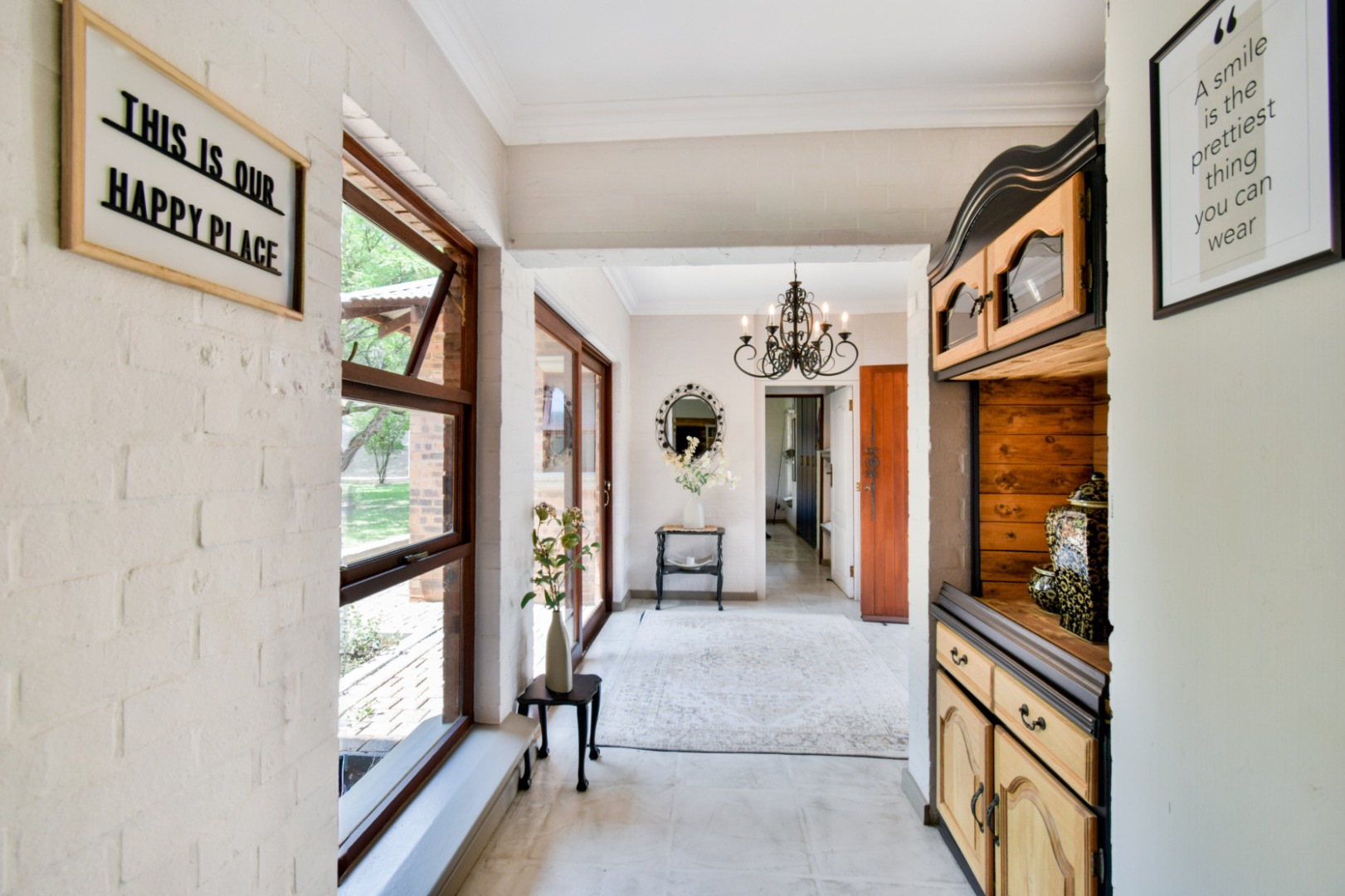 The outdoor areas are designed for relaxation and social gatherings, featuring a built-in braai, bar-style countertops, and seamless access to a serene garden oasis. Enjoy the sparkling round swimming pool and charming boma, creating the perfect backdrop for weekend leisure or evening entertaining. The ground floor also offers a well-appointed guest bedroom with a private bathroom, plus a separate external suite that can serve as staff quarters, a home office, or private accommodation for extended family.