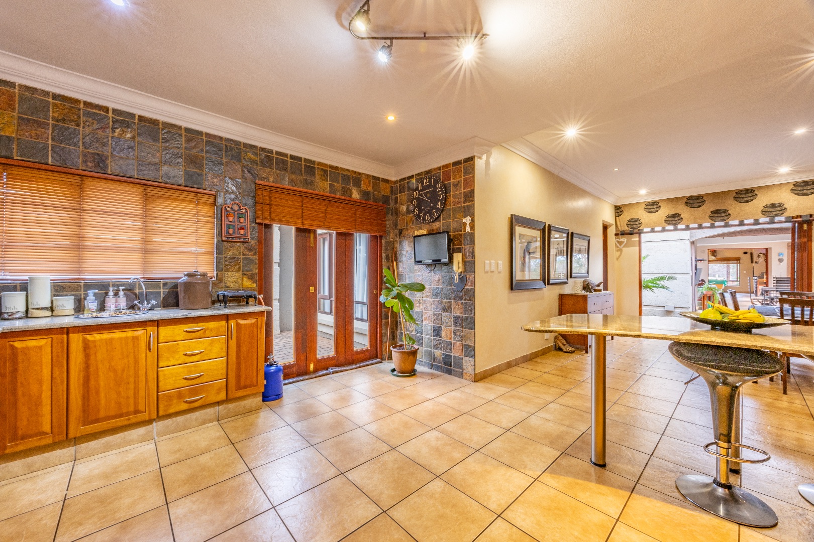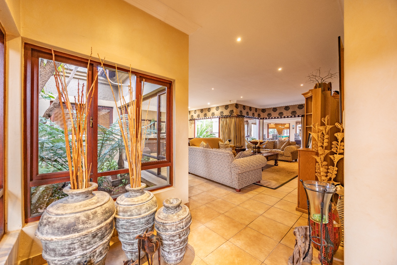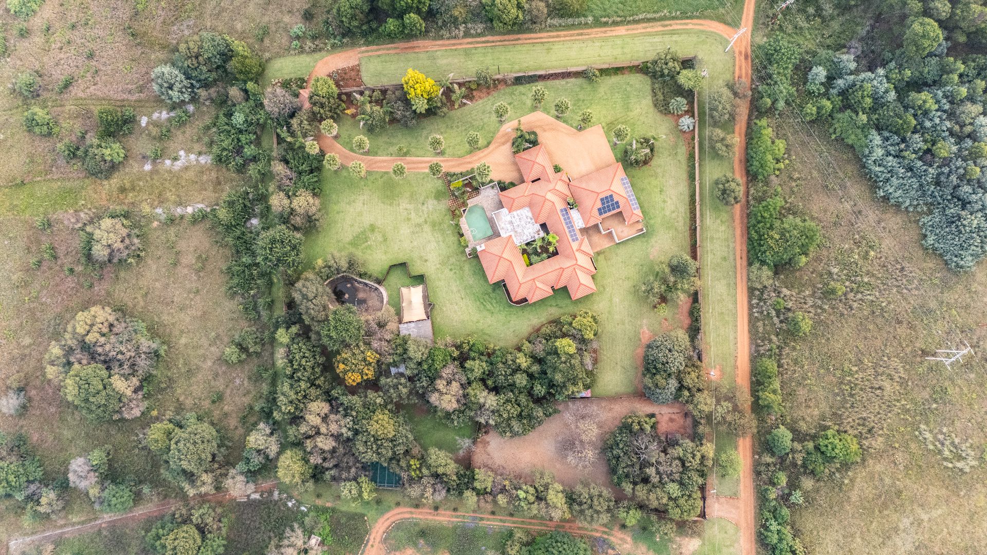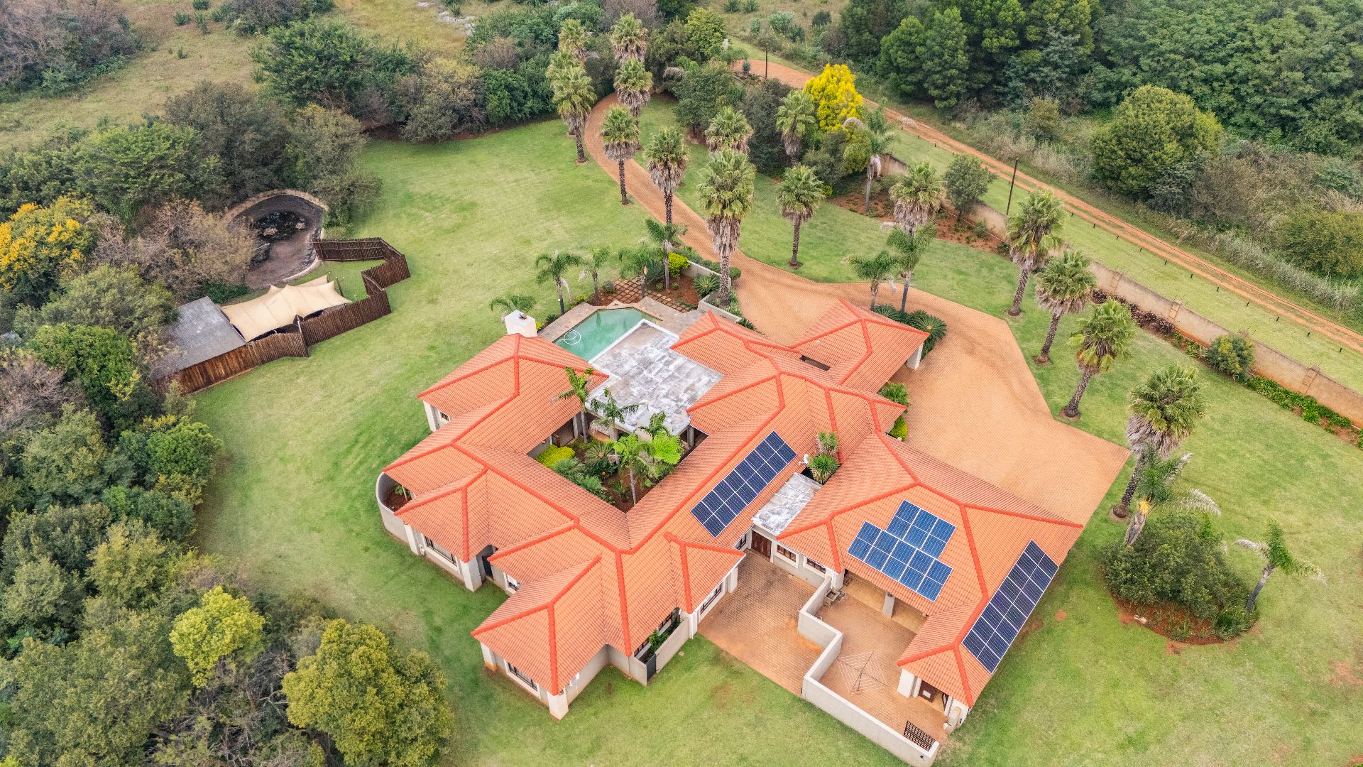 Modern sustainability features include a 16 kW solar inverter system paired with three 10 kW lithium batteries, a borehole with storage tanks, and a backup generator, ensuring uninterrupted comfort and efficiency.