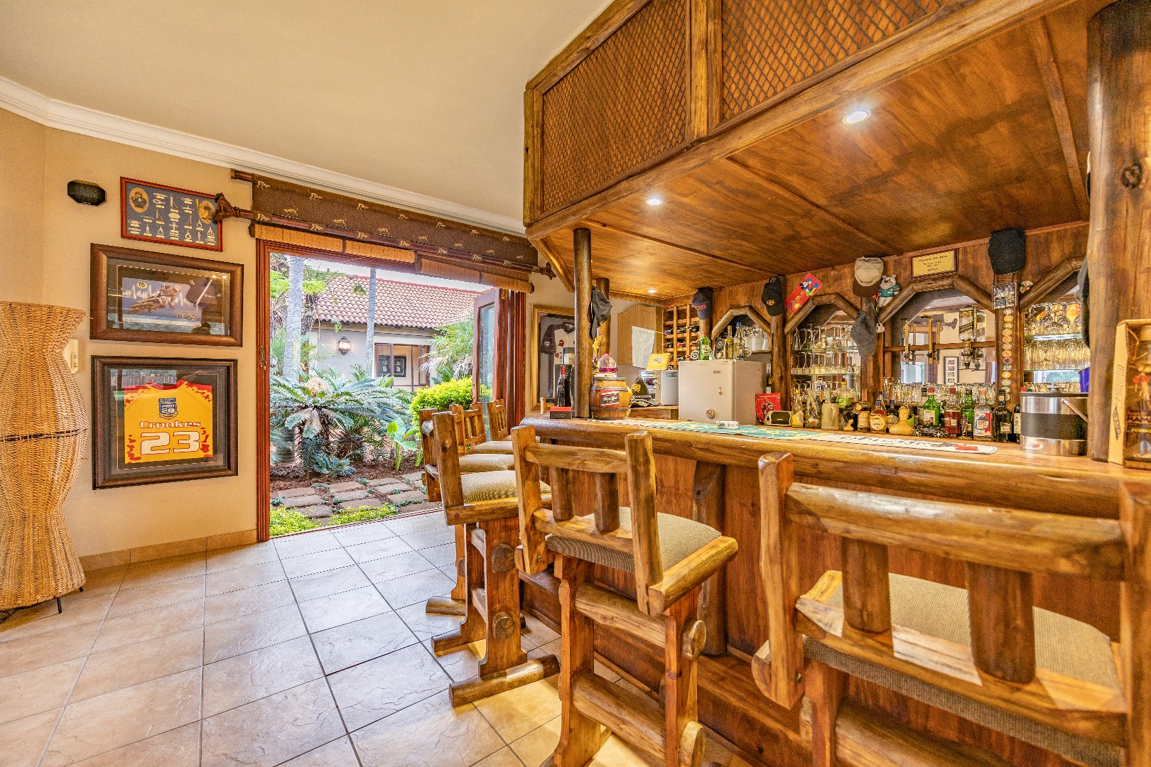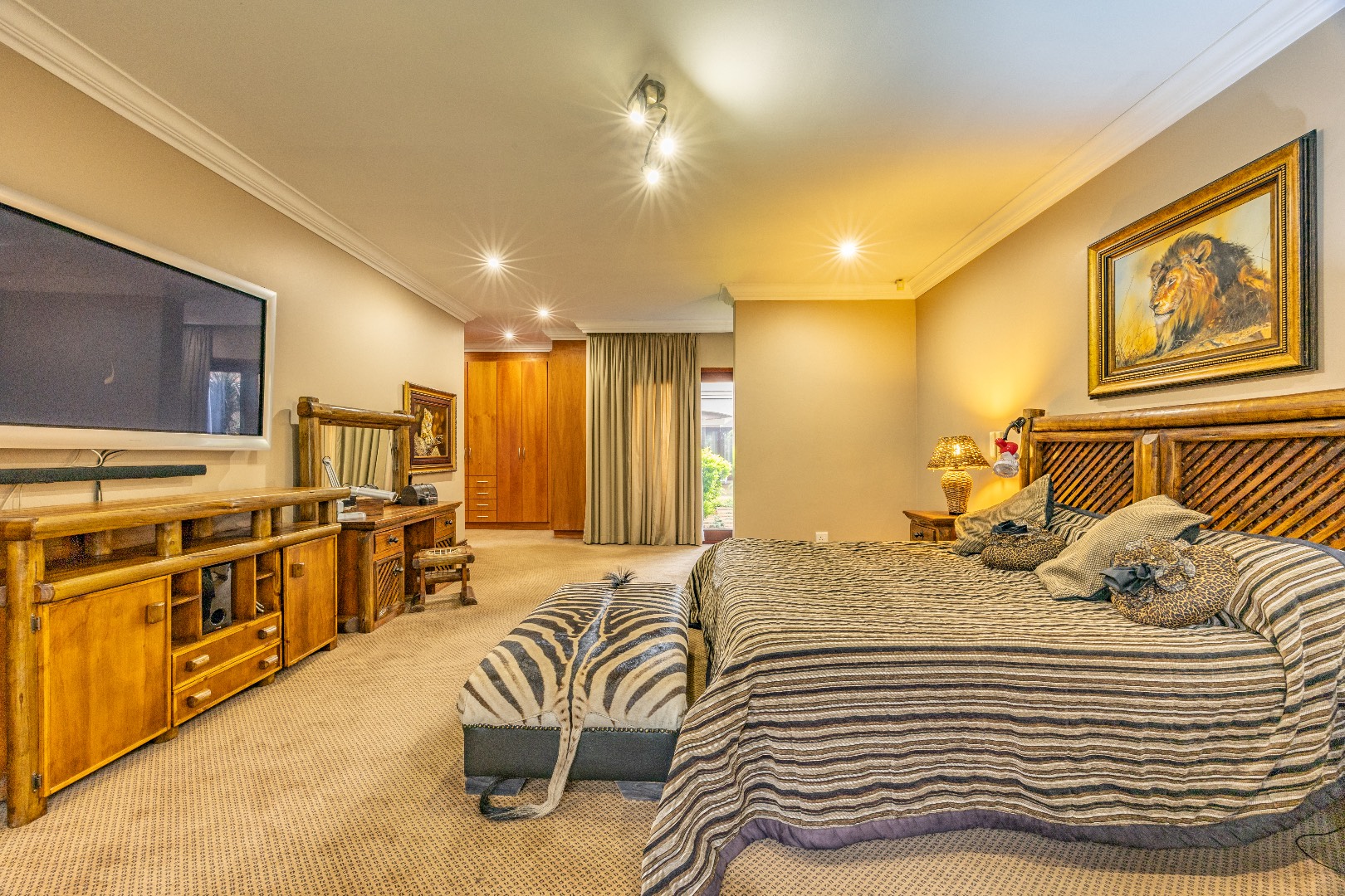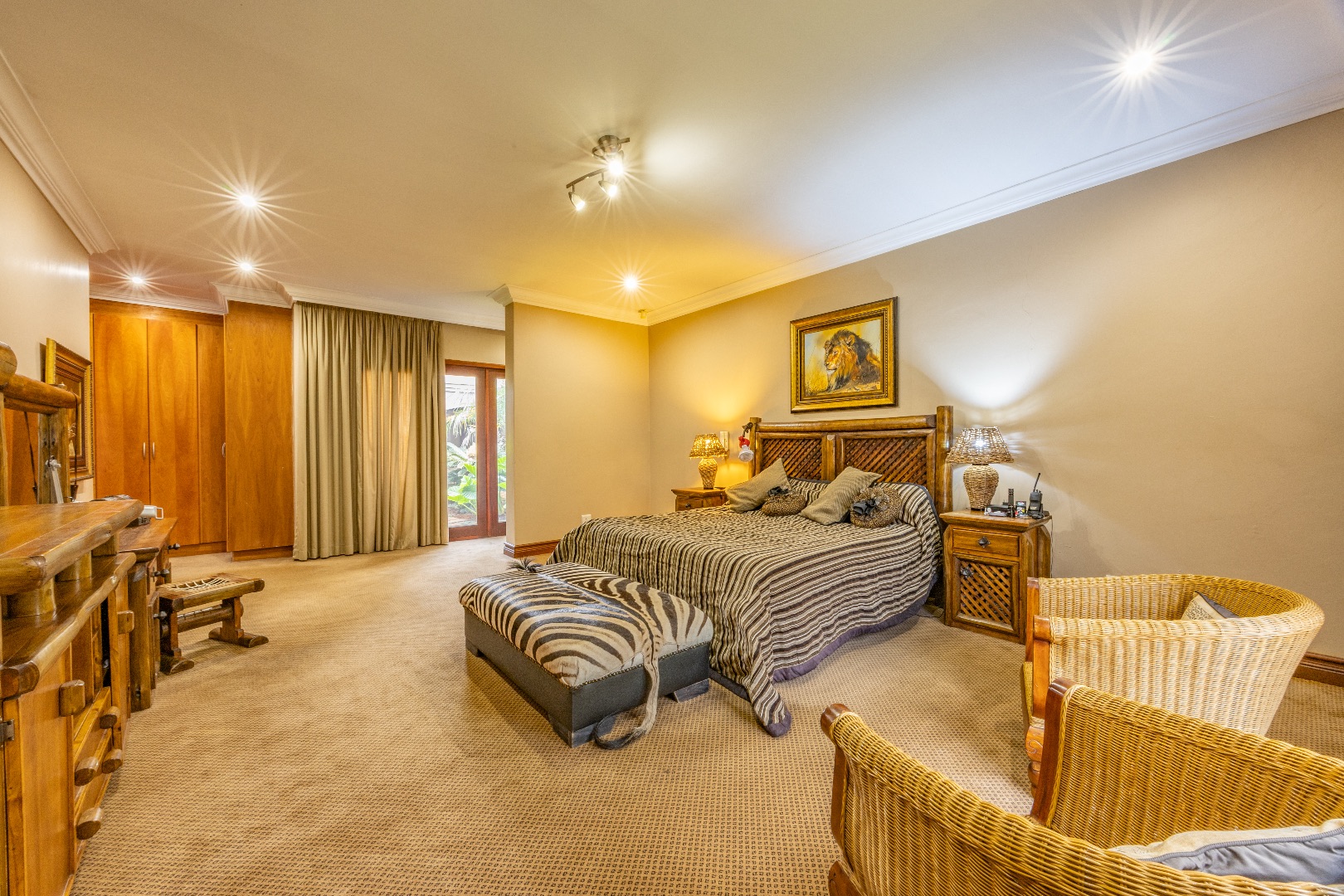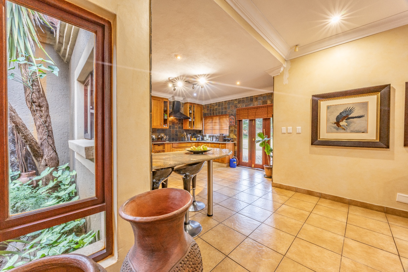 Modern sustainability features include a 16 kW solar inverter system paired with three 10 kW lithium batteries, a borehole with storage tanks, and a backup generator, ensuring uninterrupted comfort and efficiency.