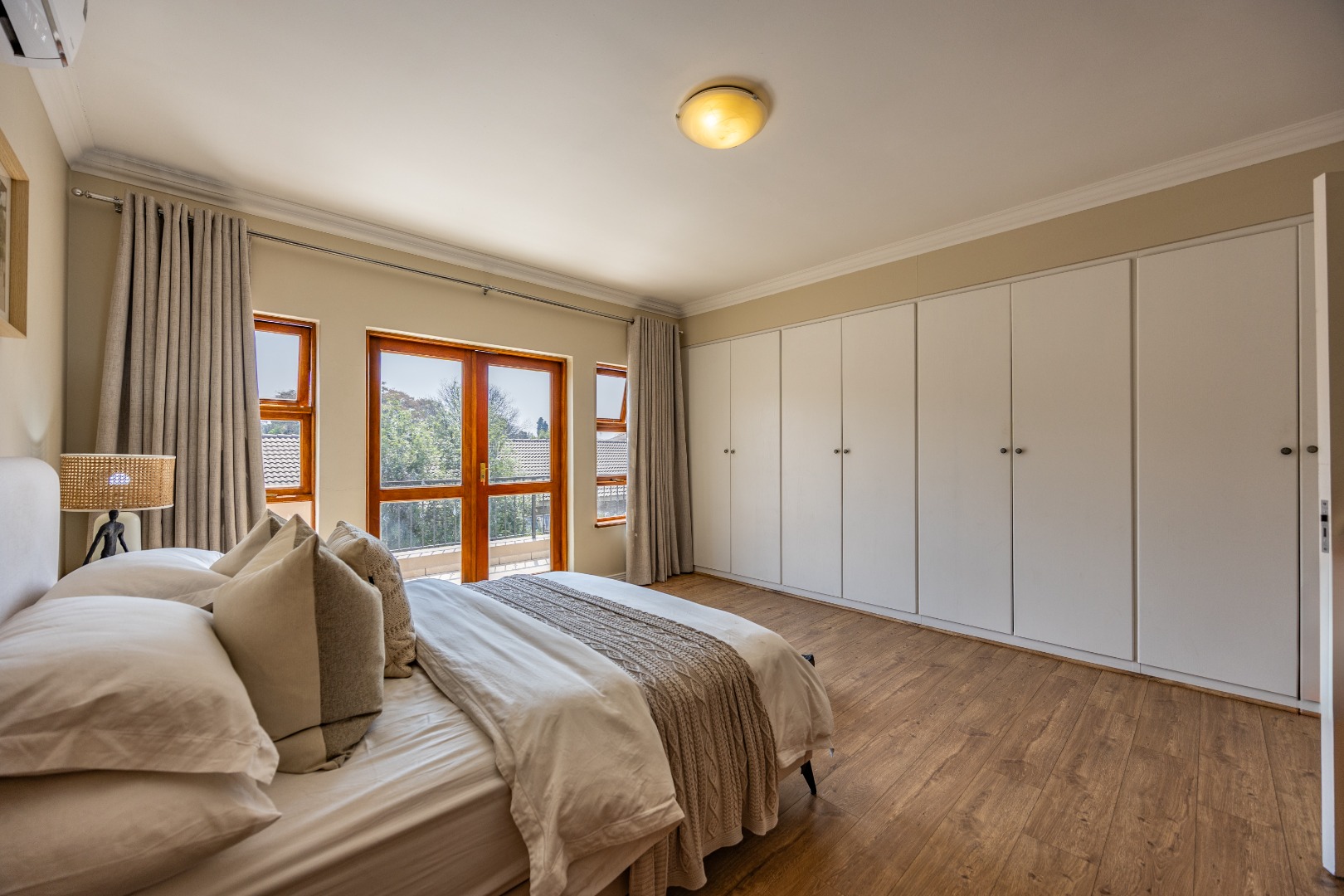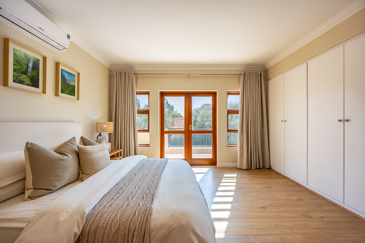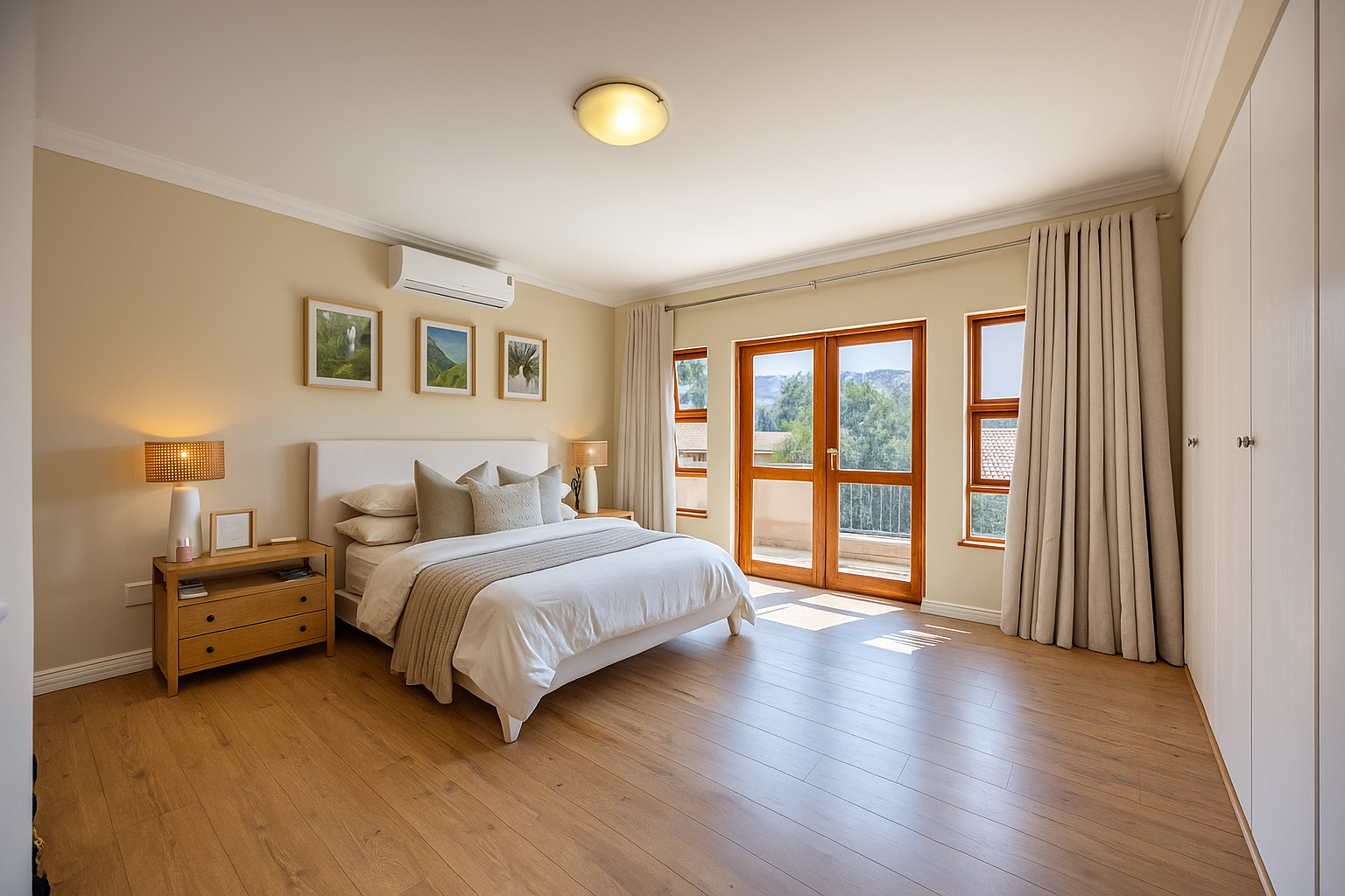 Step inside and enjoy 3 spacious bedrooms, all with balcony access and built-in cupboards. The main suite impresses with air-conditioning, loads of cupboard space, and a full en-suite bathroom with double basins and a large bath. A bonus extra room offers endless possibilities as a private office, gym, or hobby space.