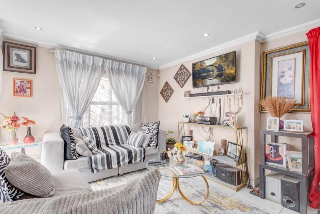 Inside, the home boasts a warm and inviting living area filled with natural light. The space is tastefully finished with modern lighting and neutral tones that create a relaxed atmosphere, perfect for both everyday living and entertaining guests. Large windows allow plenty of sunlight to flow through, making the living space feel bright and welcoming.