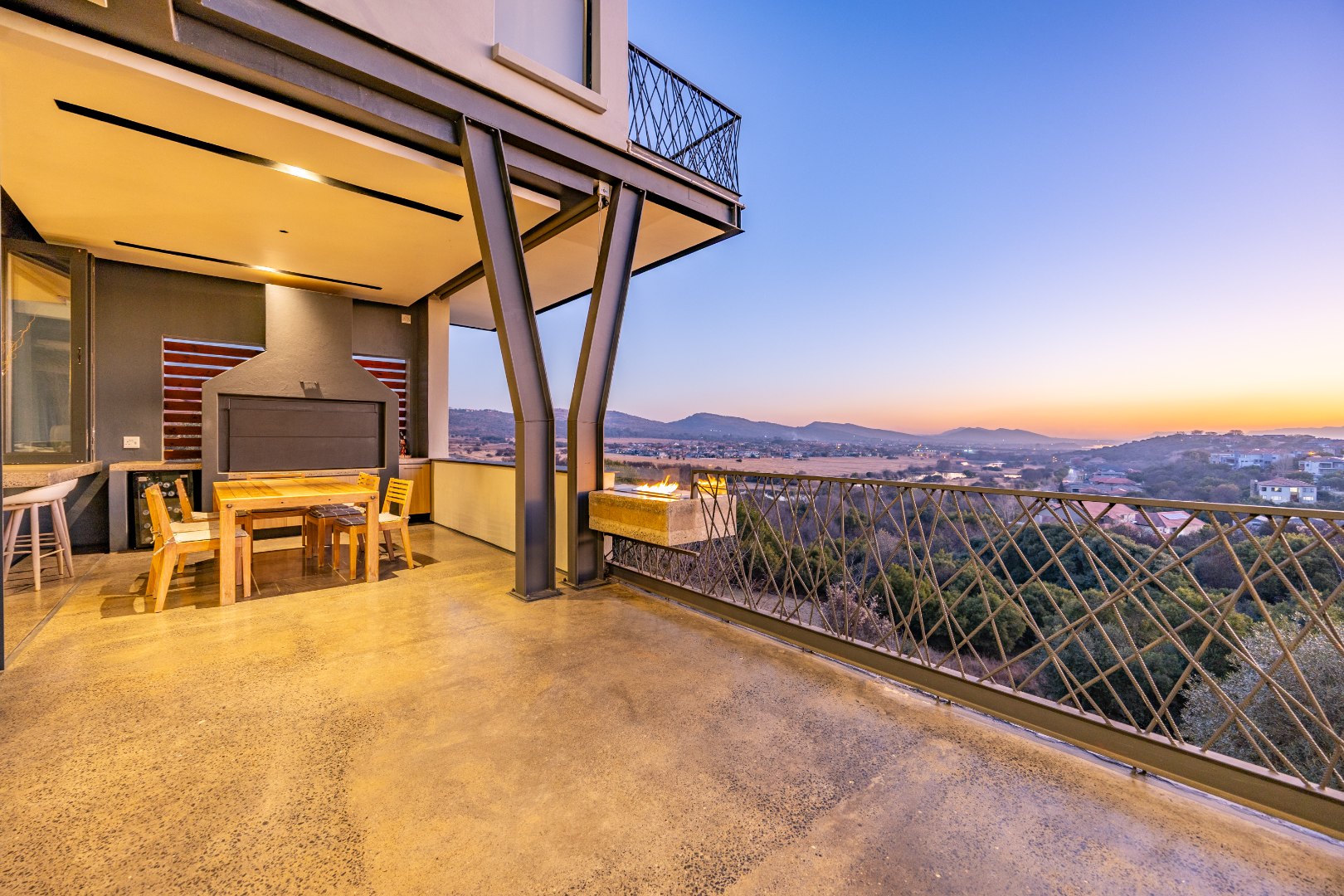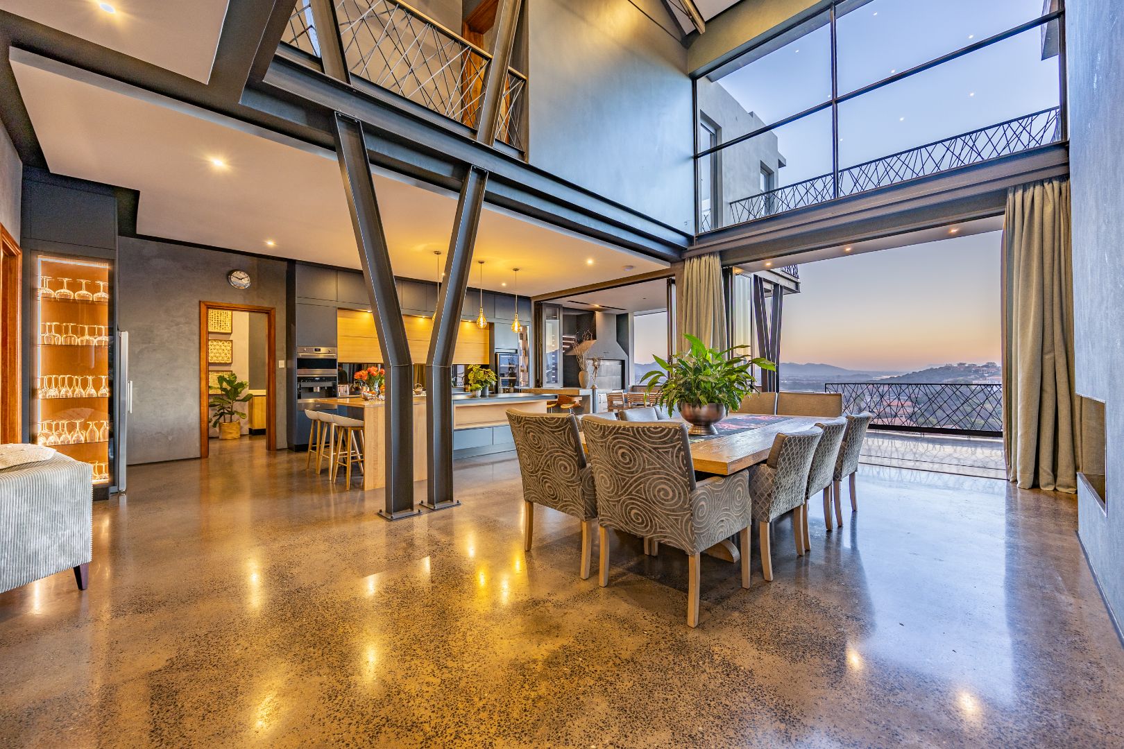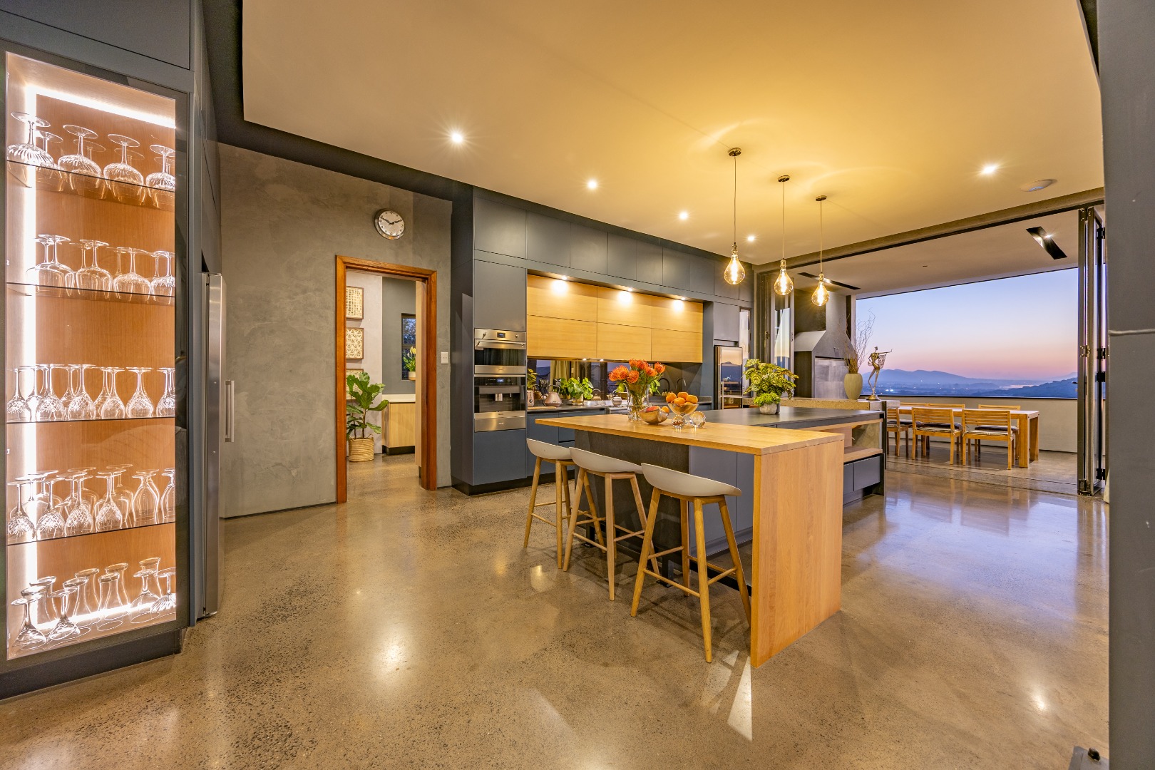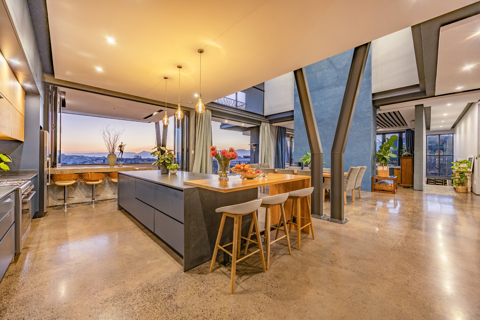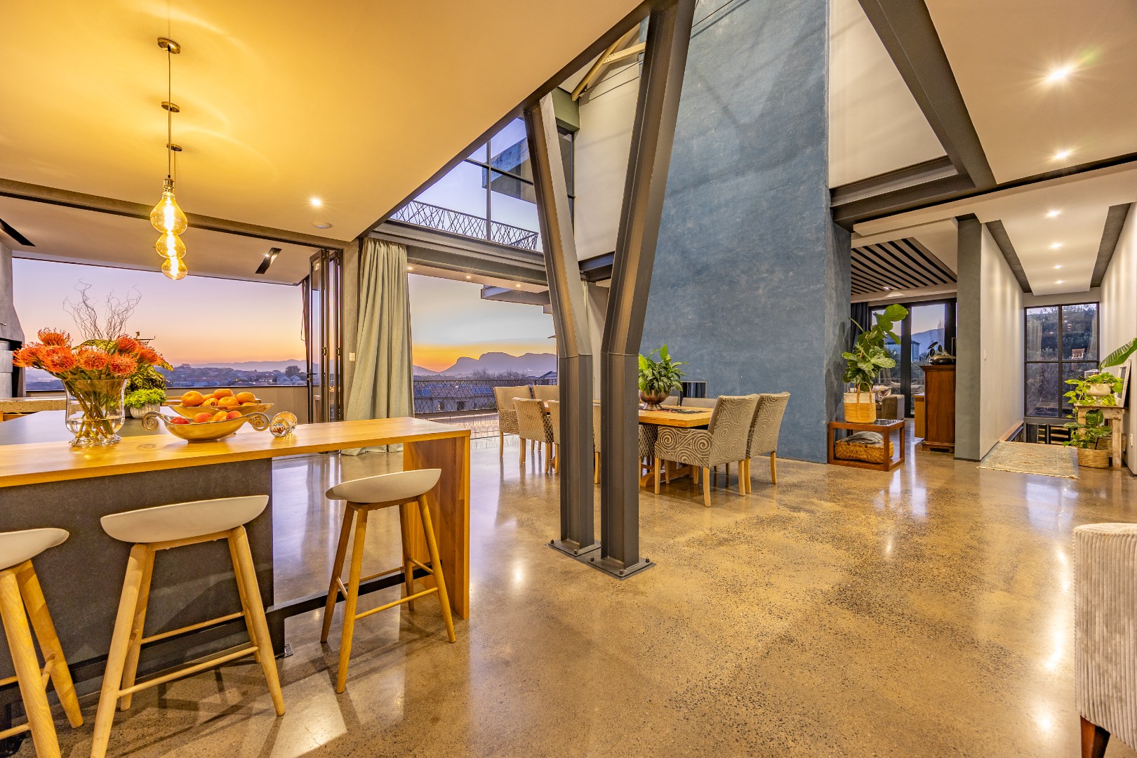 On the middle floor, you'll find the heart of the home: a modern open-plan kitchen with a central island and gas stove, overlooking a spacious dining area. A separate scullery and walk-in pantry ensure functionality without compromising on style. Large stacking doors connect the dining and kitchen space to a covered outdoor braai area — perfect for effortless entertaining, all while enjoying the stunning views.