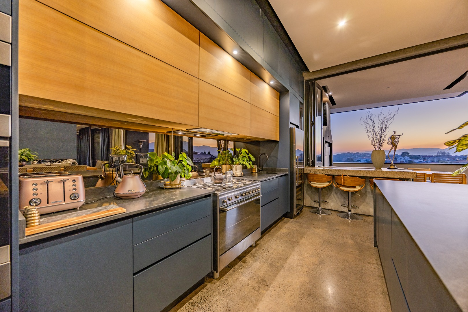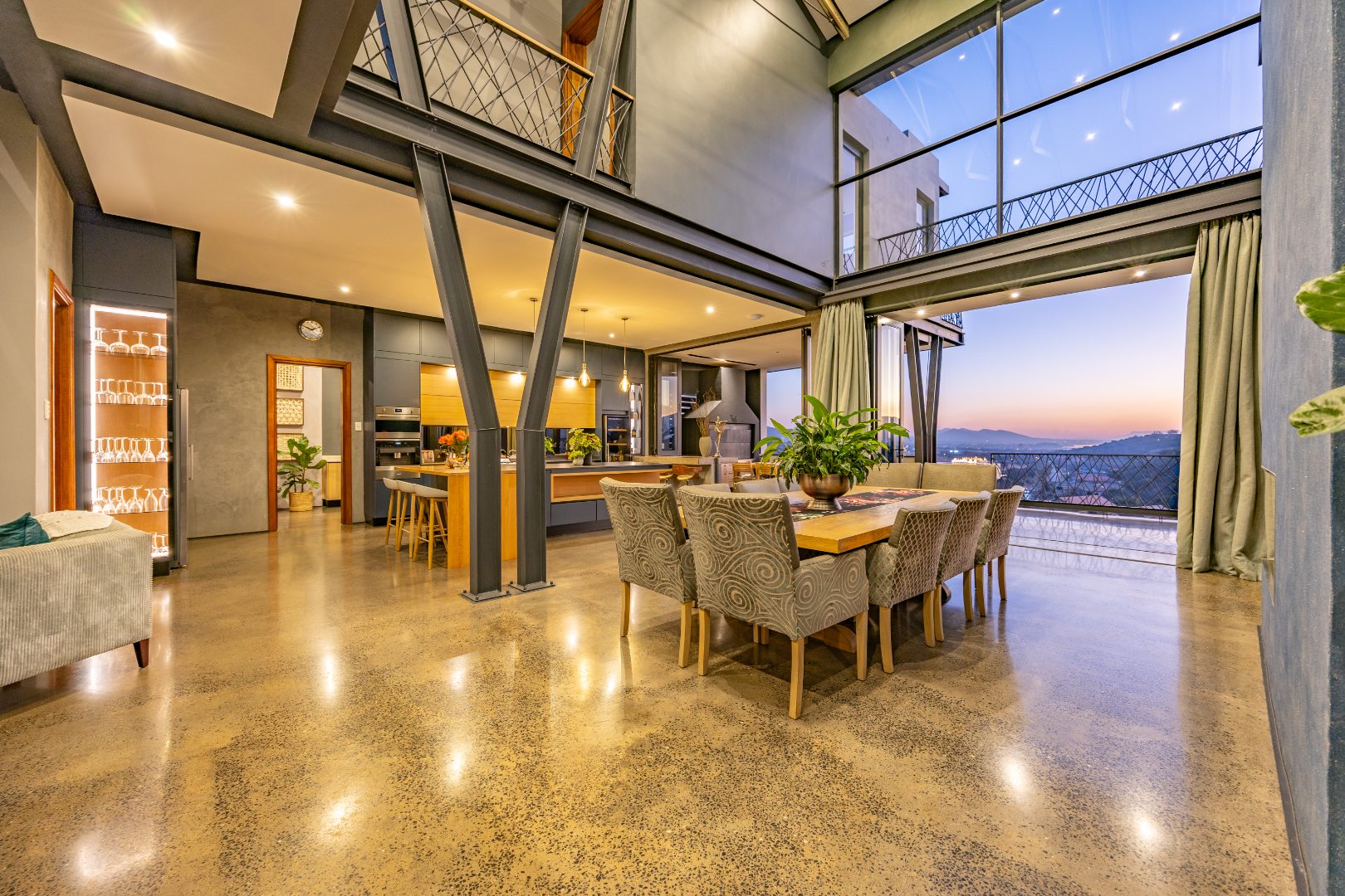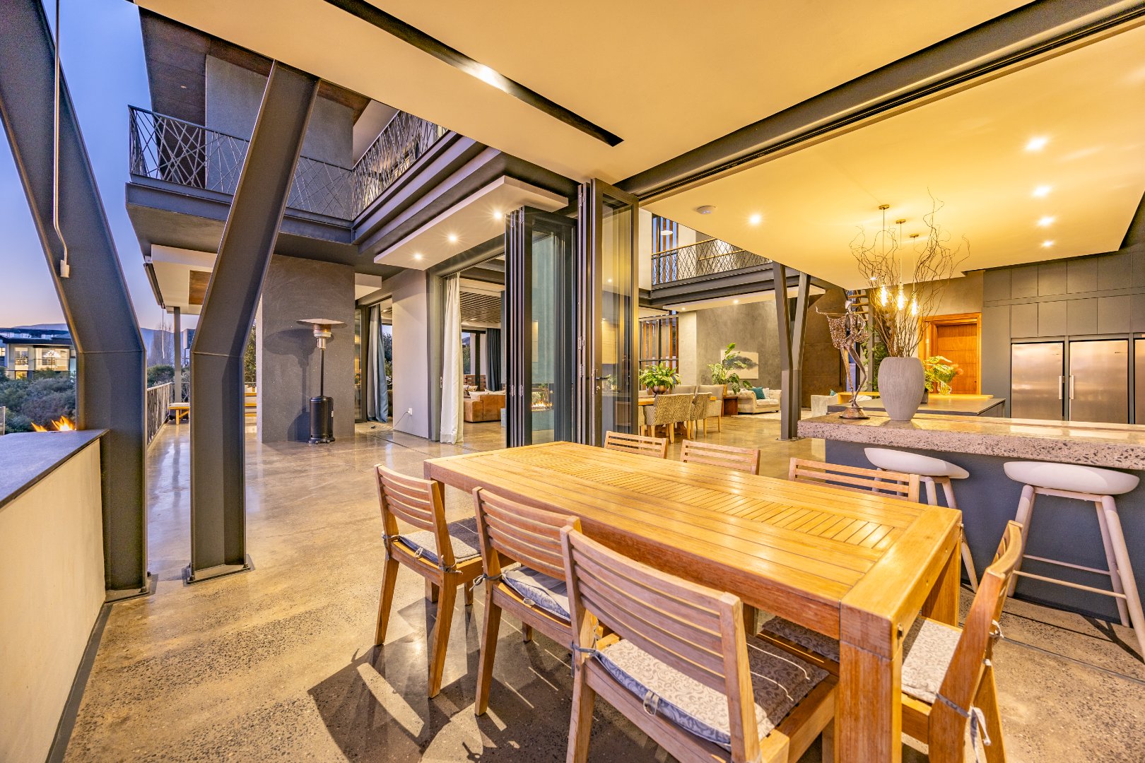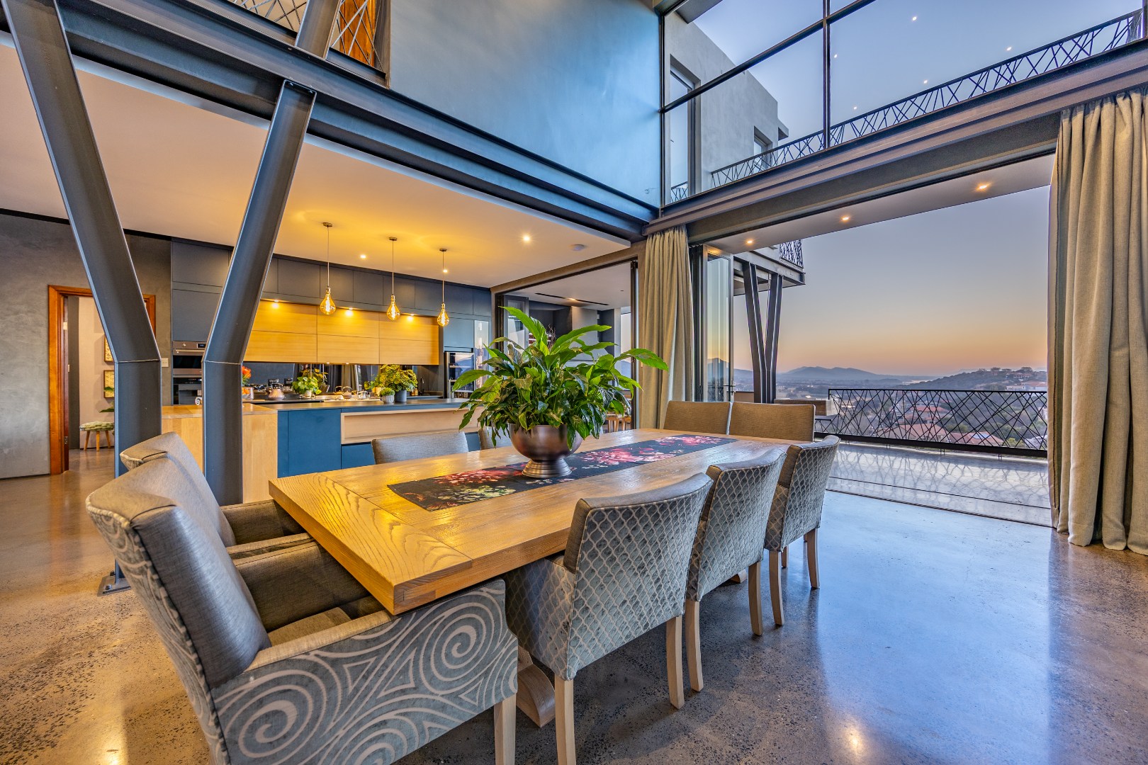 On the middle floor, you'll find the heart of the home: a modern open-plan kitchen with a central island and gas stove, overlooking a spacious dining area. A separate scullery and walk-in pantry ensure functionality without compromising on style. Large stacking doors connect the dining and kitchen space to a covered outdoor braai area — perfect for effortless entertaining, all while enjoying the stunning views.