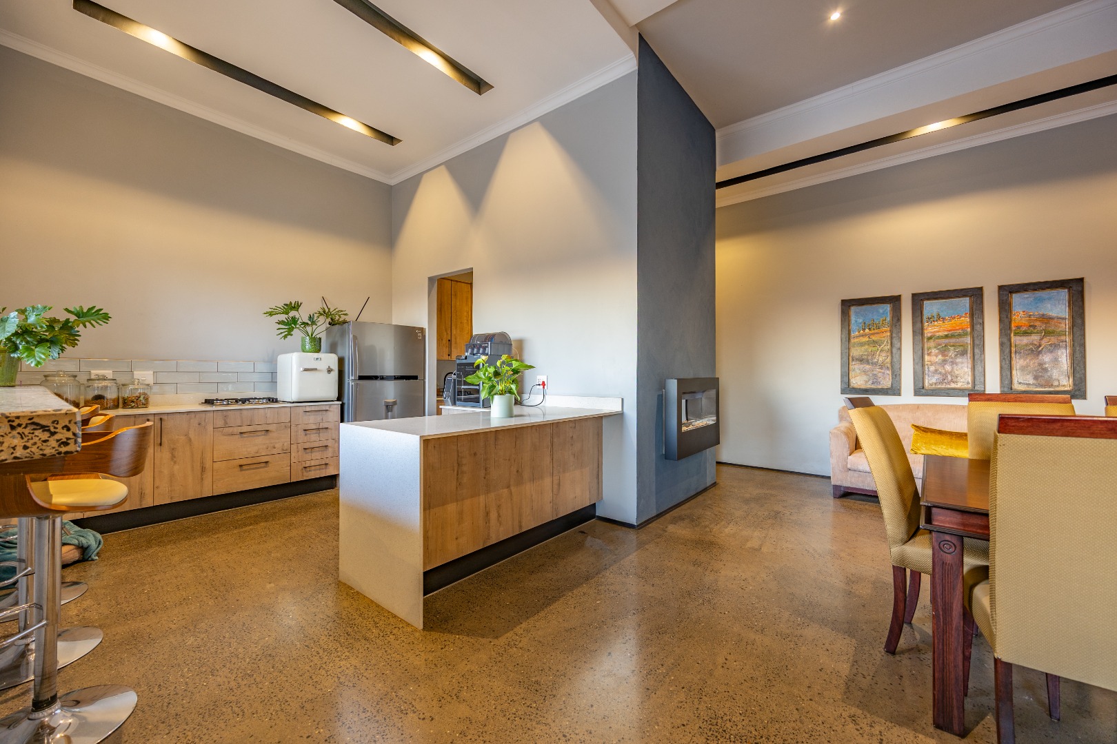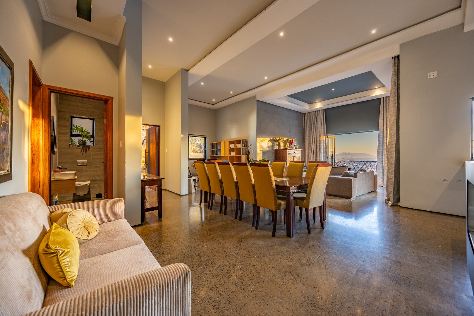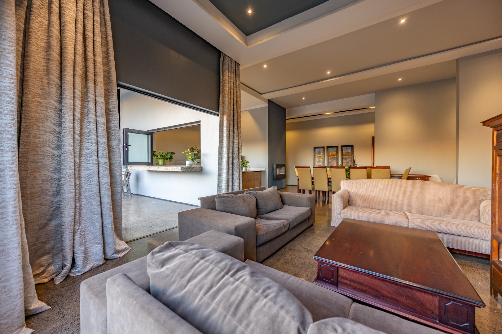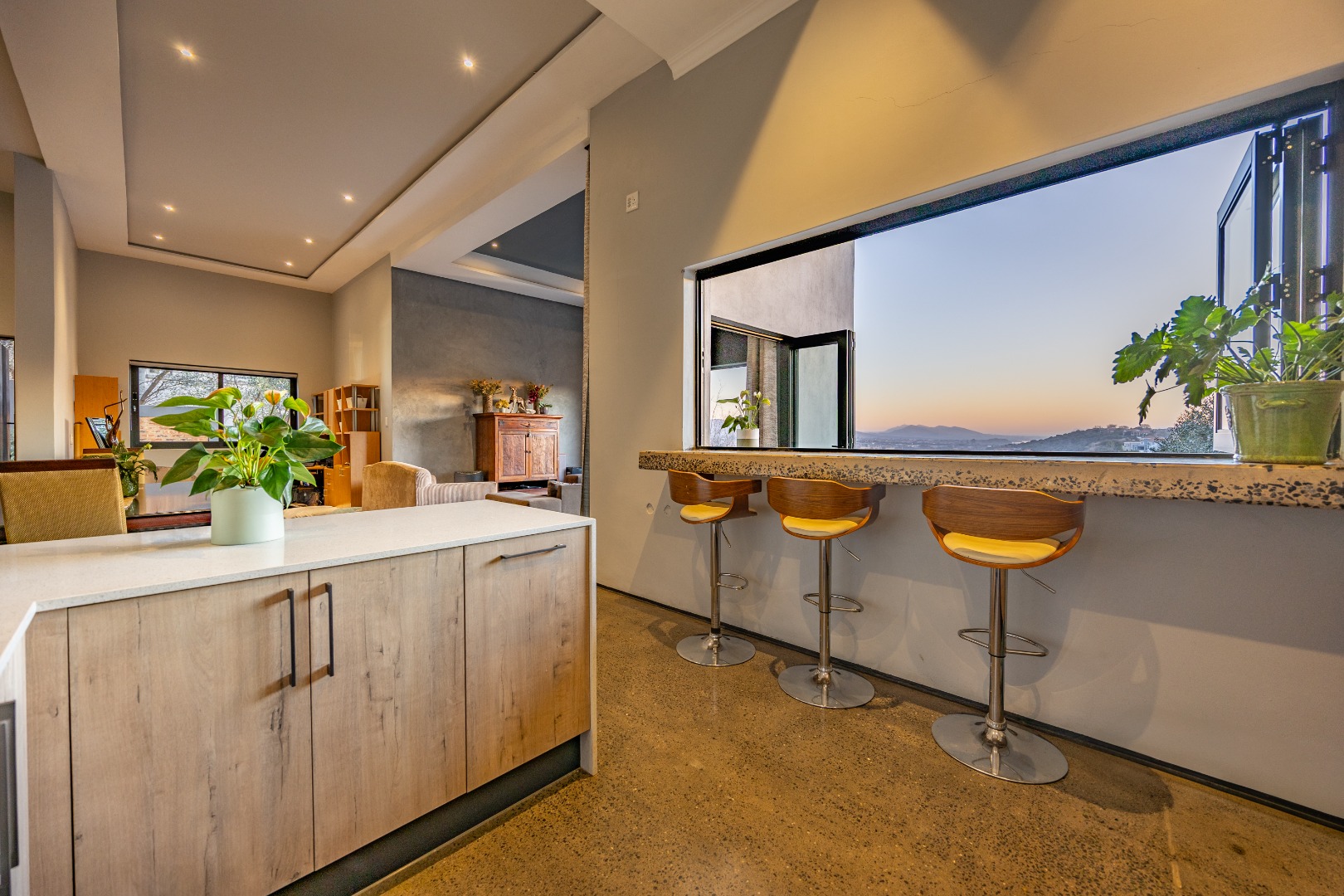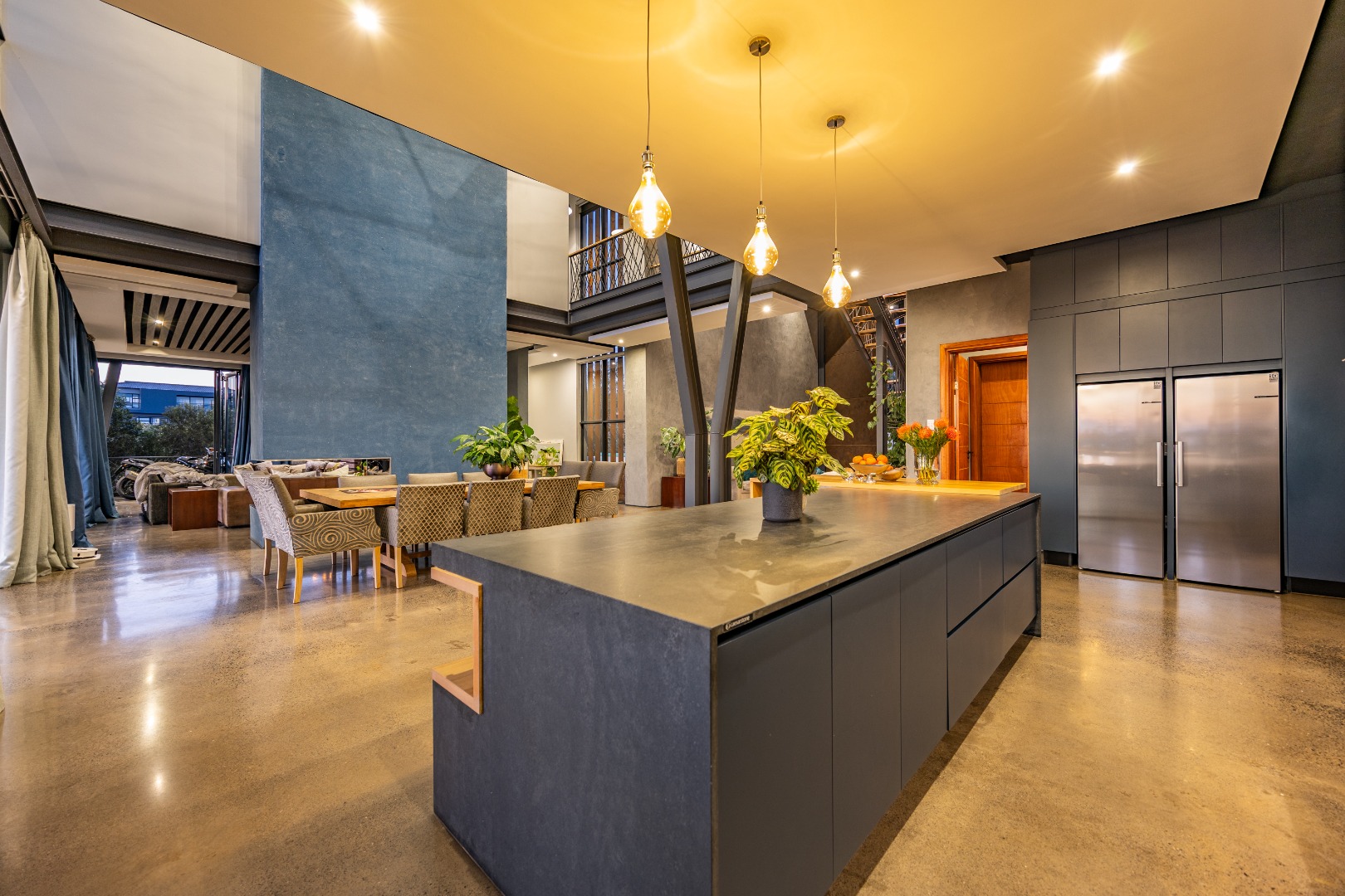 On the middle floor, you'll find the heart of the home: a modern open-plan kitchen with a central island and gas stove, overlooking a spacious dining area. A separate scullery and walk-in pantry ensure functionality without compromising on style. Large stacking doors connect the dining and kitchen space to a covered outdoor braai area — perfect for effortless entertaining, all while enjoying the stunning views.