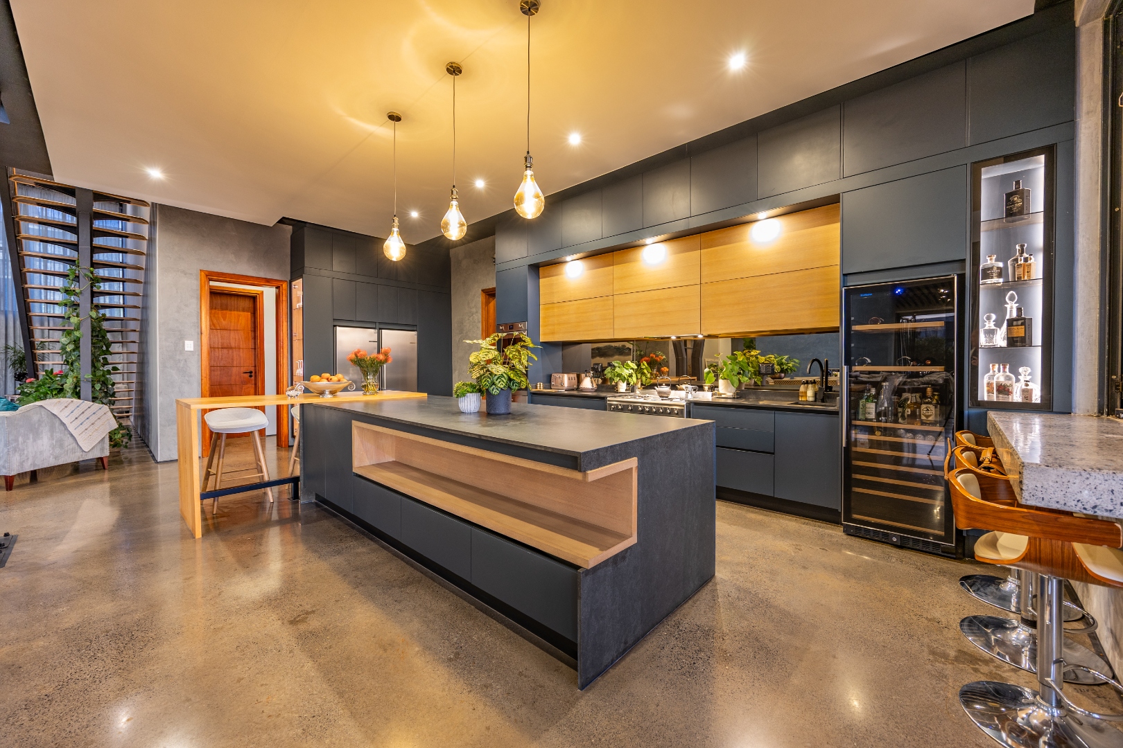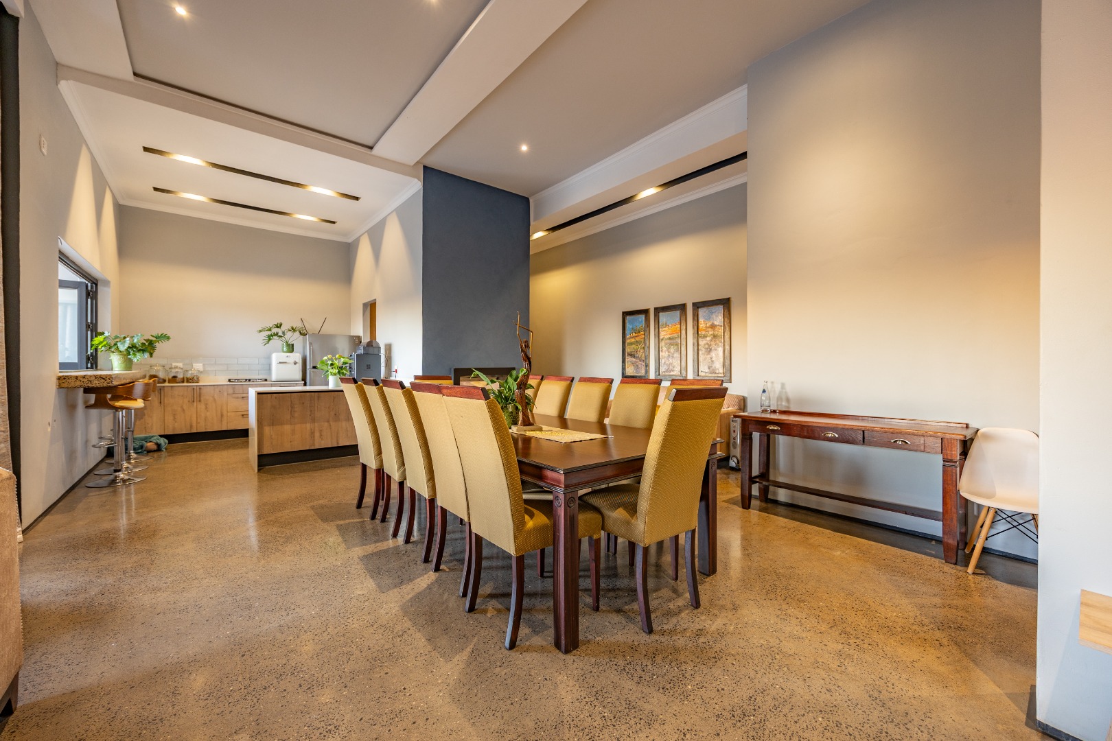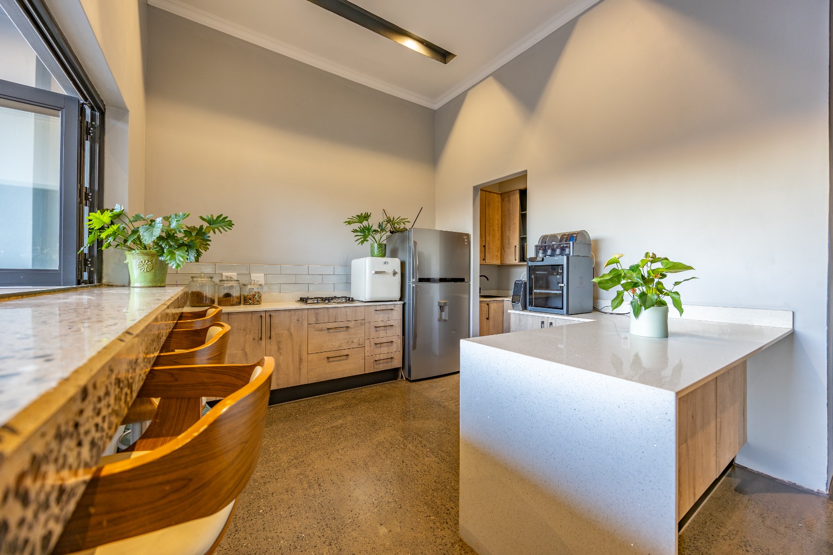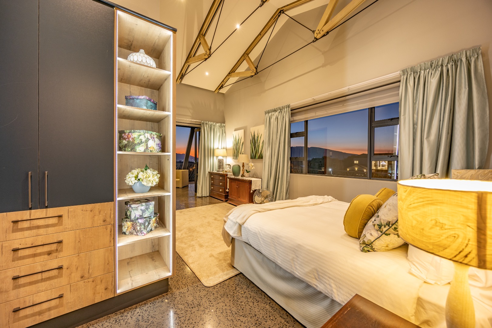 On the middle floor, you'll find the heart of the home: a modern open-plan kitchen with a central island and gas stove, overlooking a spacious dining area. A separate scullery and walk-in pantry ensure functionality without compromising on style. Large stacking doors connect the dining and kitchen space to a covered outdoor braai area — perfect for effortless entertaining, all while enjoying the stunning views.