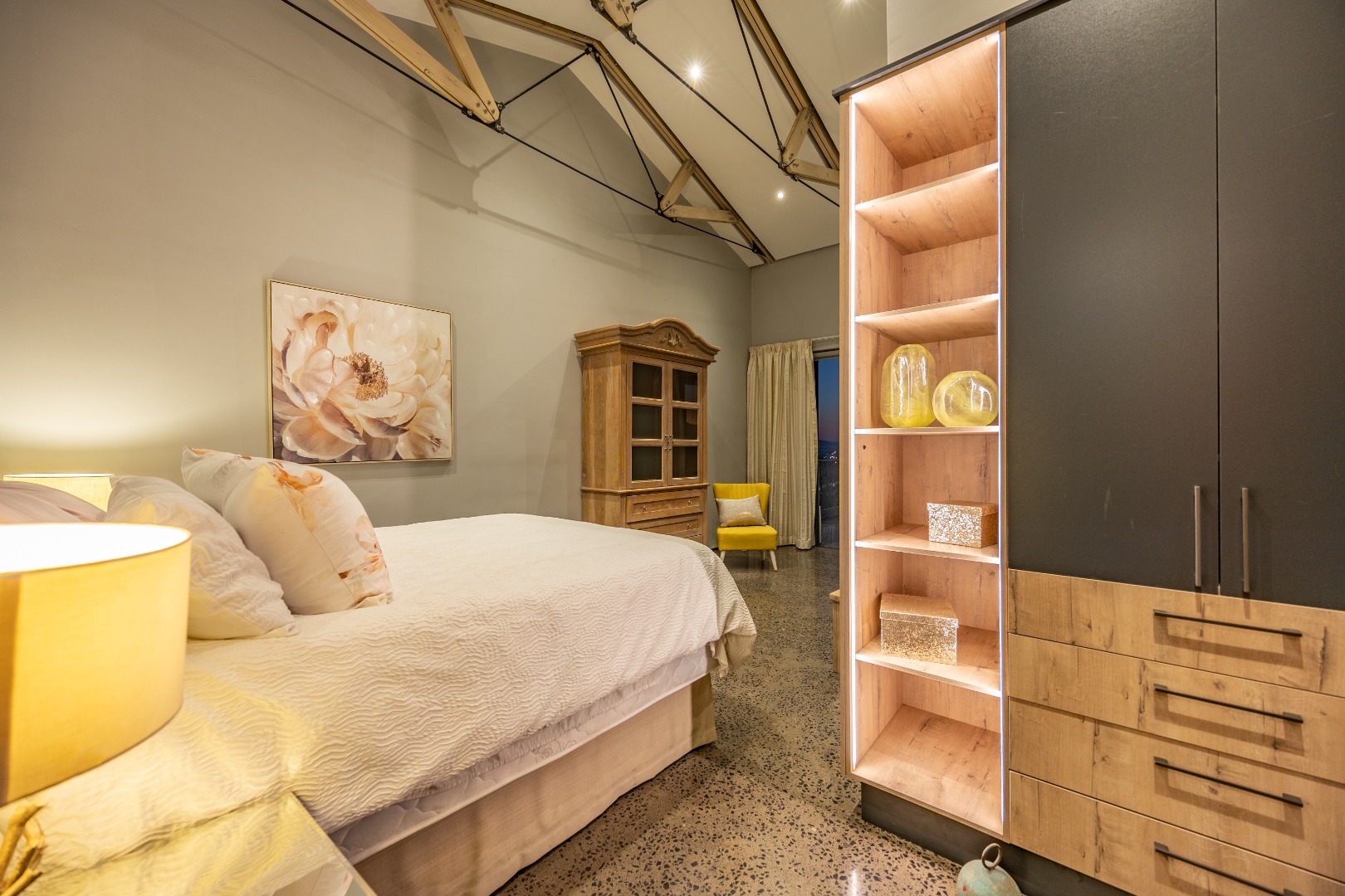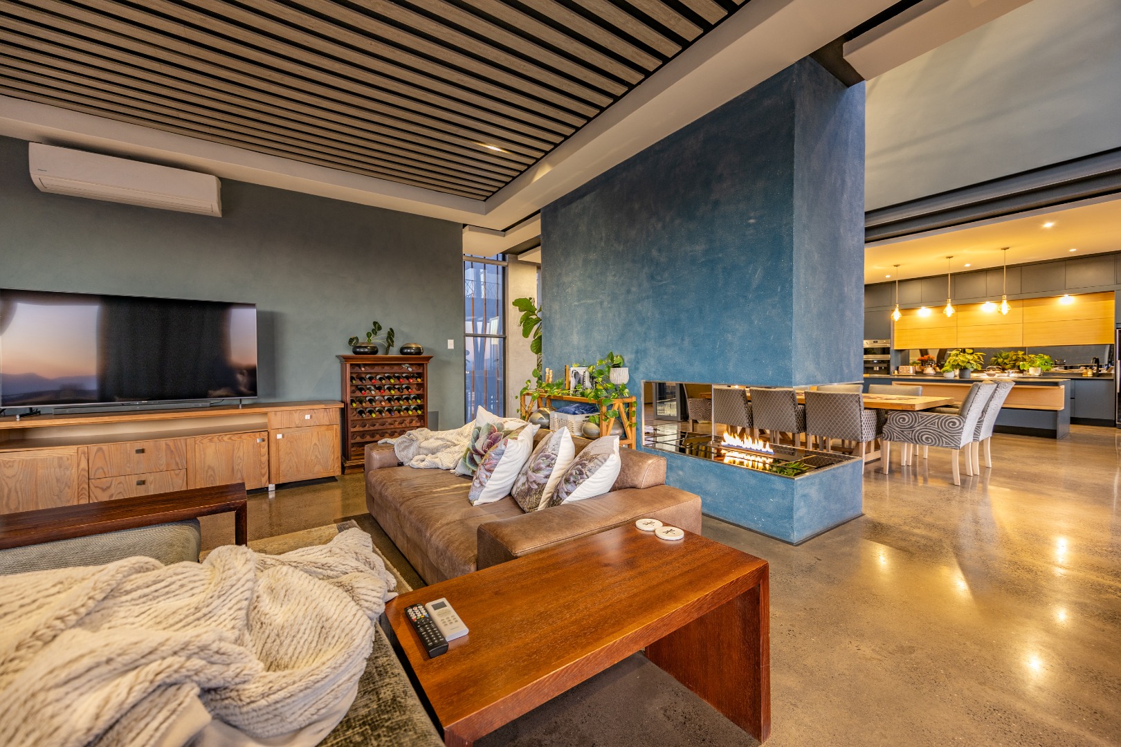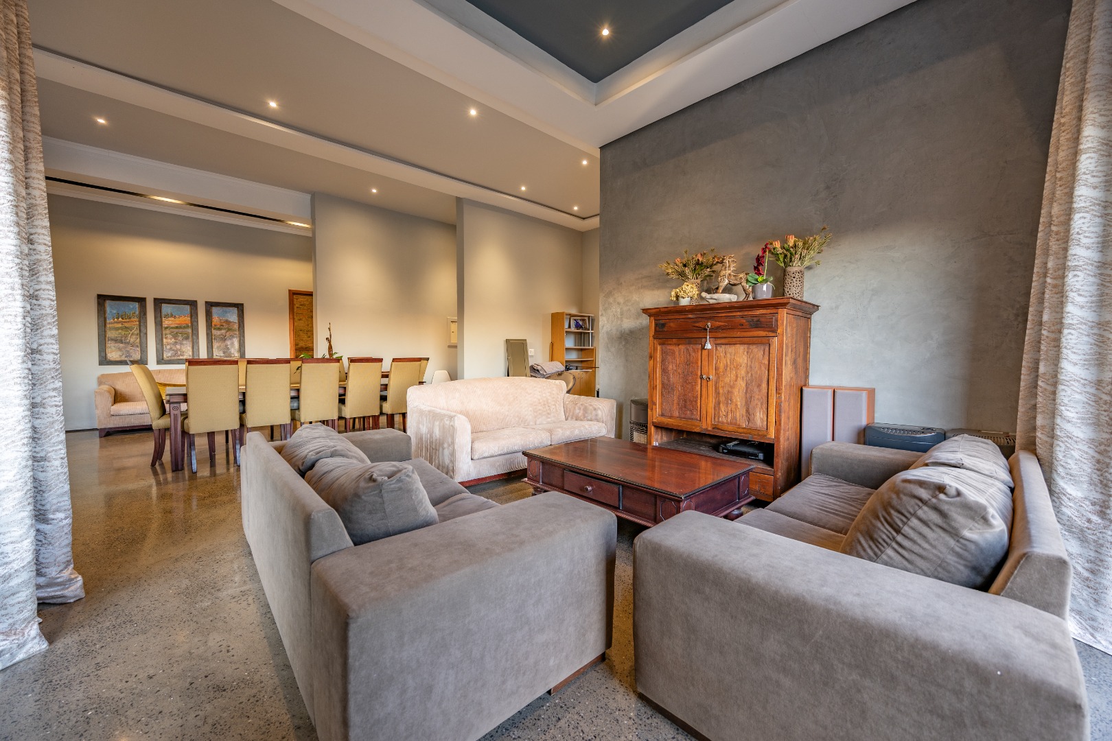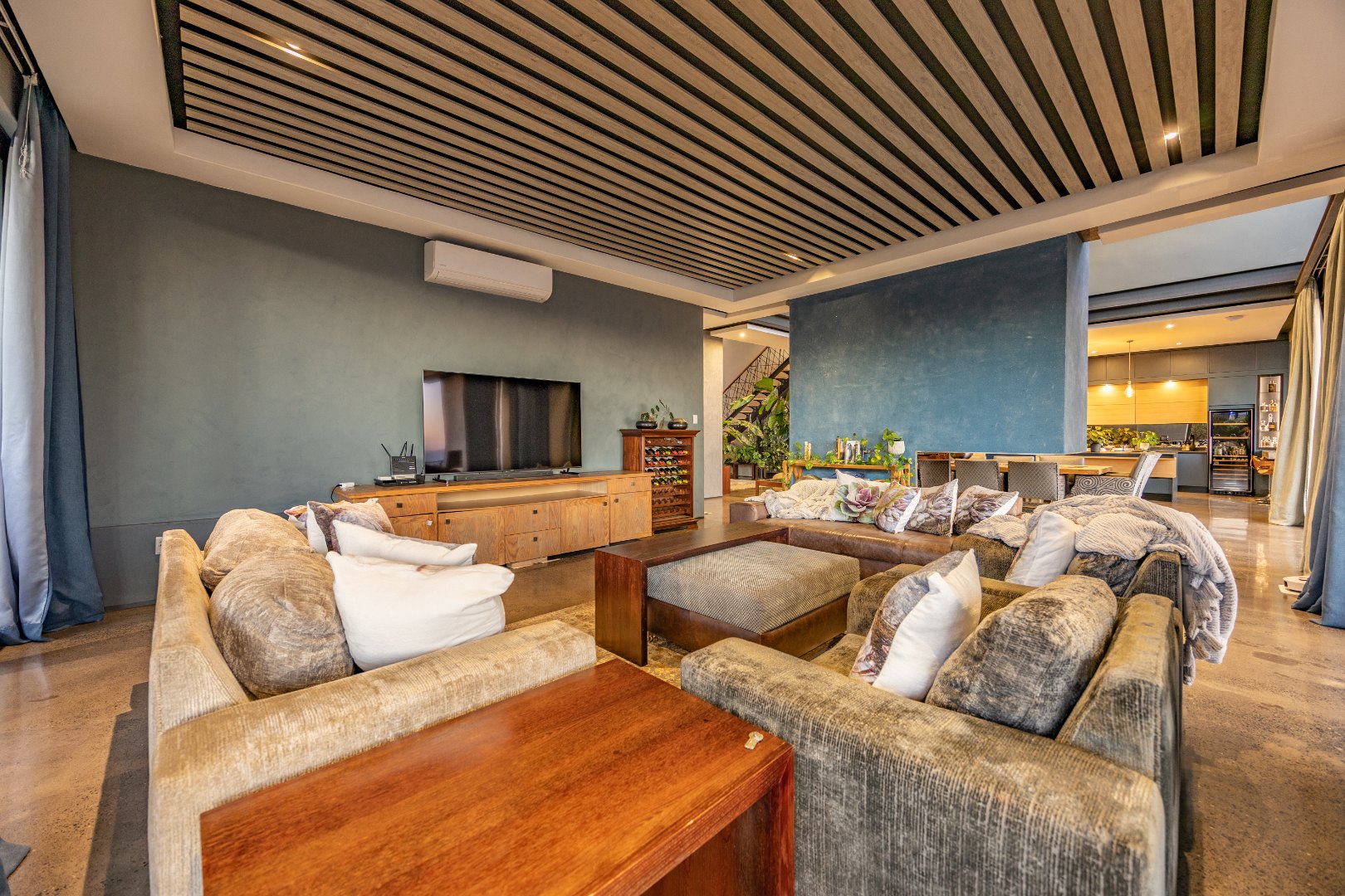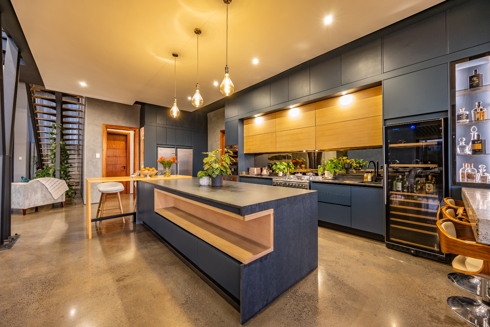 On the middle floor, you'll find the heart of the home: a modern open-plan kitchen with a central island and gas stove, overlooking a spacious dining area. A separate scullery and walk-in pantry ensure functionality without compromising on style. Large stacking doors connect the dining and kitchen space to a covered outdoor braai area — perfect for effortless entertaining, all while enjoying the stunning views.